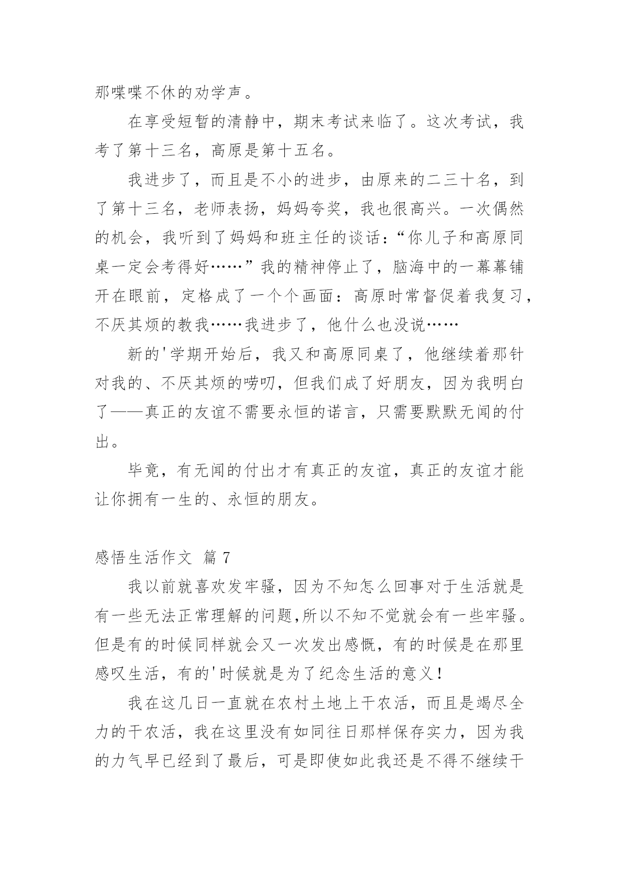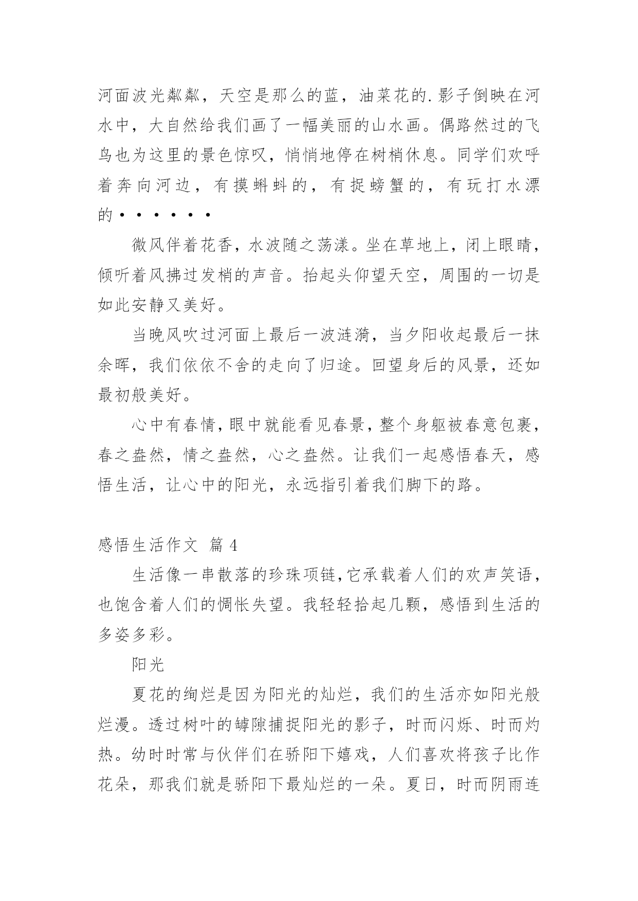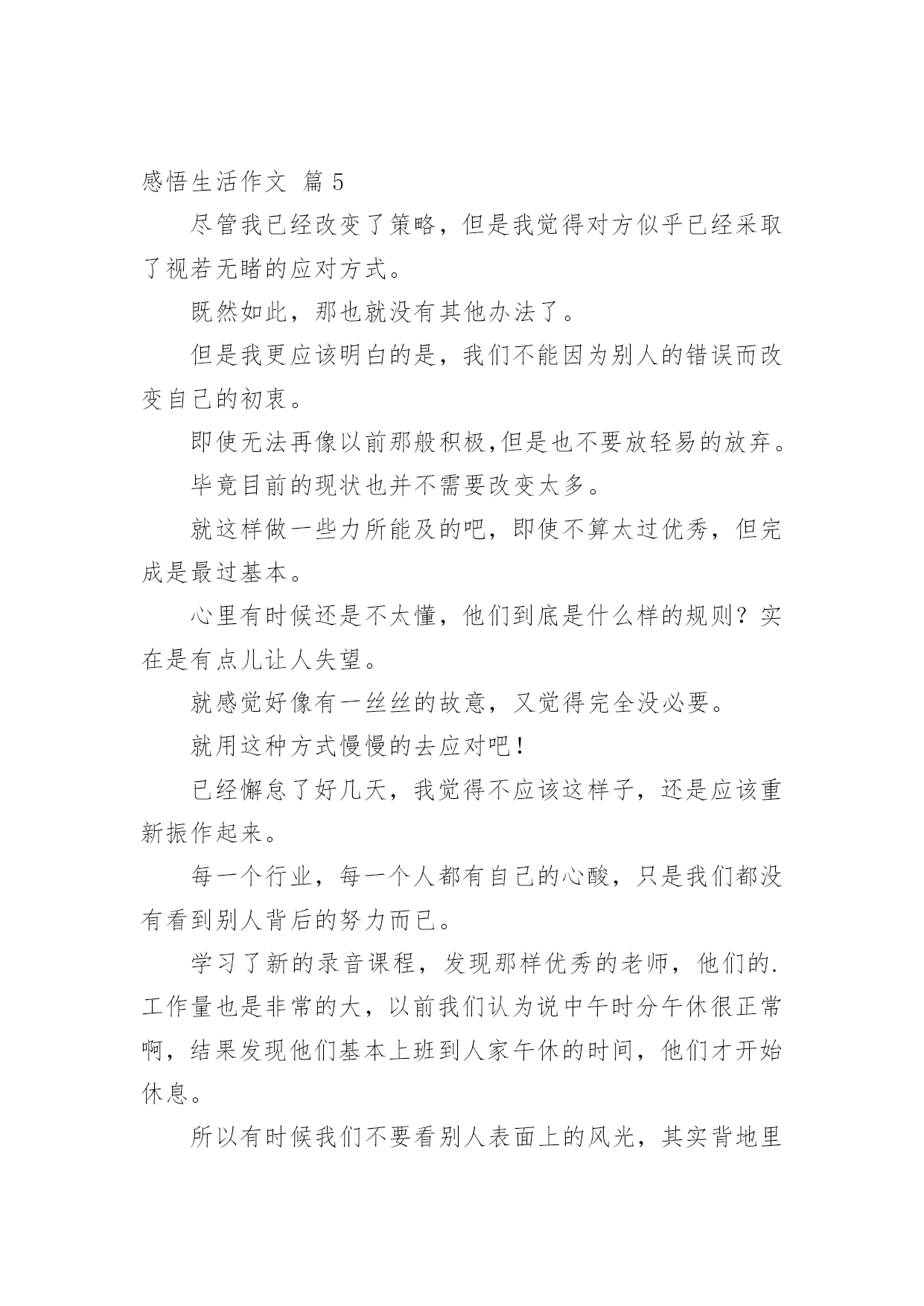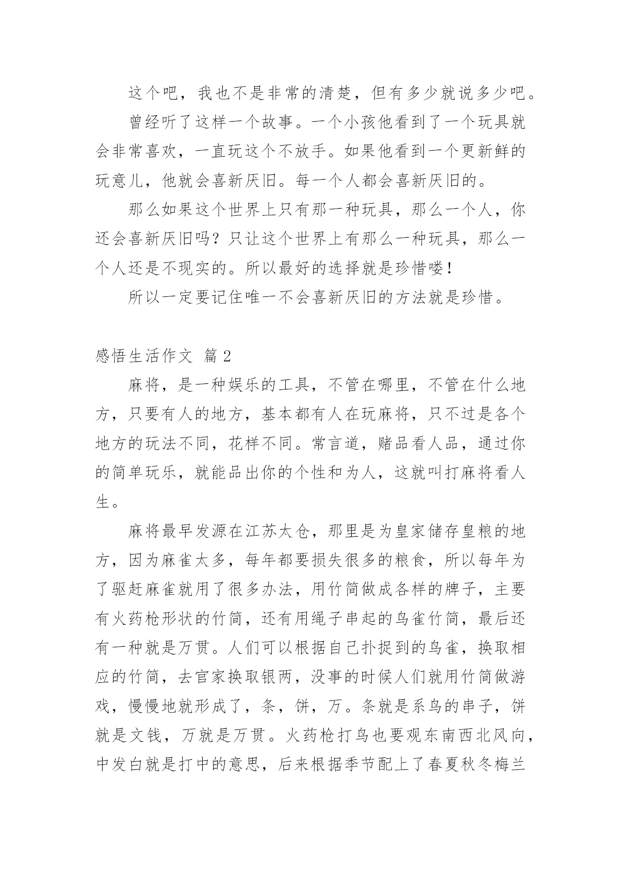 感悟生活作文【实用】感悟生活作文汇编十篇在日常生活或是工作学习中,许多人都写过作文吧,借助作文人们可以实现文化交流的目的。那么你有了解过作文吗?以下是小编为大家整理的感悟生活作文10篇,欢迎大家借鉴与参考,希望对大家有所帮助。感悟生活作文篇1这篇文章我主要想谈一谈我这么多年悟出来的一些道理。(一)为什么时间过得快或你有没有发现其实我们时间有时飞快,有时却极慢。这是为什么呢?给你们讲一个故事你们就知道了。从前吧,有两个人一个叫集中,一个叫分散。这一天,他们两人共同来到考场来考状元。开始考试了,起初两个人都很认真的写着答卷。过了十几分钟后分散开始东张西望,动来动去。他停止了答题竟然睡着了。而那个集中呢?他却认认真真的作答呢,无论出什么声音,他都一直认真的思考,毫不被周边的`事物所影响。通过这一故事你悟透了吗?对!没错!如果你认真的做一件事情,就会觉得时间过得飞快。反过来,如果你不认真对待一件事情,就会觉得时间过得很慢。(二)为什么人会喜新厌旧这个吧,我也不是非常的清楚,但有多少就说多少吧。曾经听了这样一个故事。一个小孩他看到了一个玩具就会非常喜欢,一直玩这个不放手。如果他看到一个更新鲜的玩意儿,他就会喜新厌旧。每一个人都会喜新厌旧的。那么如果这个世界上只有那一种玩具,那么一个人,你还会喜新厌旧吗?只让这个世界上有那么一种玩具,那么一个人还是不现实的。所以最好的选择就是珍惜喽!所以一定要记住唯一不会喜新厌旧的方法就是珍惜。感悟生活作文篇2麻将,是一种娱乐的工具,不管在哪里,不管在什么地方,只要有人的地方,基本都有人在玩麻将,只不过是各个地方的玩法不同,花样不同。常言道,赌品看人品,通过你的简单玩乐,就能品出你的个性和为人,这就叫打麻将看人生。麻将最早发源在江苏太仓,那里是为皇家储存皇粮的地方,因为麻雀太多,每年都要损失很多的粮食,所以每年为了驱赶麻雀就用了很多办法,用竹简做成各样的牌子,主要有火药枪形状的竹简,还有用绳子串起的鸟雀竹简,最后还有一种就是万贯。人们可以根据自己扑捉到的鸟雀,换取相应的竹简,去官家换取银两,没事的时候人们就用竹简做游戏,慢慢地就形成了,条,饼,万。条就是系鸟的串子,饼就是文钱,万就是万贯。火药枪打鸟也要观东南西北风向,中发白就是打中的意思,后来根据季节配上了春夏秋冬梅兰竹菊,大概在唐朝时期传入日本。国泰民安,家家过上了好日子,科学代替了生产力,很多人都闲下来了,没事就都聚在一起玩几圈,再下点小赌注,别提多快乐了。南方天气热,坐在哪里都可以随时凑上局,树荫下,屋檐下,最牛的麻将是在南方暴雨成灾时,人们都在躲避水灾,就在半米深的水中,还有几位瘾君子正在玩的兴起。从麻将中看到了我们百姓的生活态度,面对灾难后的心理,也可以从中感悟到那份面对灾难后的平和乐观。北方的冬天叫猫冬,男女老少吃完早饭,坐在火炕上,沏上茶水就开始用电话摇人,一边玩一边唠着天南地北的新鲜事,你家收成多他家收成少了,在说笑声里吃来碰去。有的人一玩起来,不说一句话,有的人是一边玩一边讲牌道,嘴都直冒沫子,有的人不管怎么胡牌都很平淡,有的人连续胡胡,乐的手舞足蹈,有的人总不胡,愁眉苦脸直皱眉头,真是赢钱通眼亮,输钱一码黑啊。麻将在人们的不断更新中,也有了很多技巧在里面,什么叫技巧呢,俗话就是耍鬼。首先讲究方位,麻将高手一般都懂点周易,什么日子座什么地方,在什么位置犯六冲,六和,有谁的生辰八字克你的运气。还要跟住上家,看住下家,盯住对家。也要讲究攻略,不但要观察三家的'表情,还要从他们的打牌中,分析出他手里的牌大概是什么。再就是手法,在码牌的时候就把你要的牌码在一起,当抓牌的时候,用手法把码好的牌换回来,要做到基本不要过两圈就有胡了,这叫码龙凤牌。在我的记忆里,麻将牌是说道最多的,技巧最多的,所以奉劝大家最好不要赌钱,你就是运气再好,也架不住人家用技巧啊,按术语说,人家是专业的,你是业余的,差距就是距离,不服不行啊。麻将虽小,却深受人们的喜爱,也从中感悟到了人生与麻将的很多关联和相似,有喜悦,有痛苦,有激动,有心跳,有意外,有曲折,那份突来的惊喜,那份高兴一半的失去,那份眼观六路的敏锐,那份耳听八方的细心,那份经历过无数对抗的从容,那份久经沙场的淡定,不到最后谁也决定不了结果,是输.是赢,每一步都是人生。感悟生活作文篇3春天,是一个充满希望的季节。春风和煦,春光明媚,大地变得多姿多彩。春风轻拂着大地,吹开了树的容颜,吹醒了沉睡的小草,吹的河水露出了笑颜,唤来了活泼机灵的小燕子。“一年之计在于春”。在这美好的季节里,全校师生一起去踏青。我们哼着歌,走在这条寻找春天的路上,路旁油菜花的清香夹杂着泥土的气息扑面而来,道路两旁的麦田随风荡漾,到处弥漫着春的气息,让人心旷神怡。清风拂来,疲倦一扫而空。整条路上都回荡着我们的笑声,伴随着花香,延伸向远方。眼前