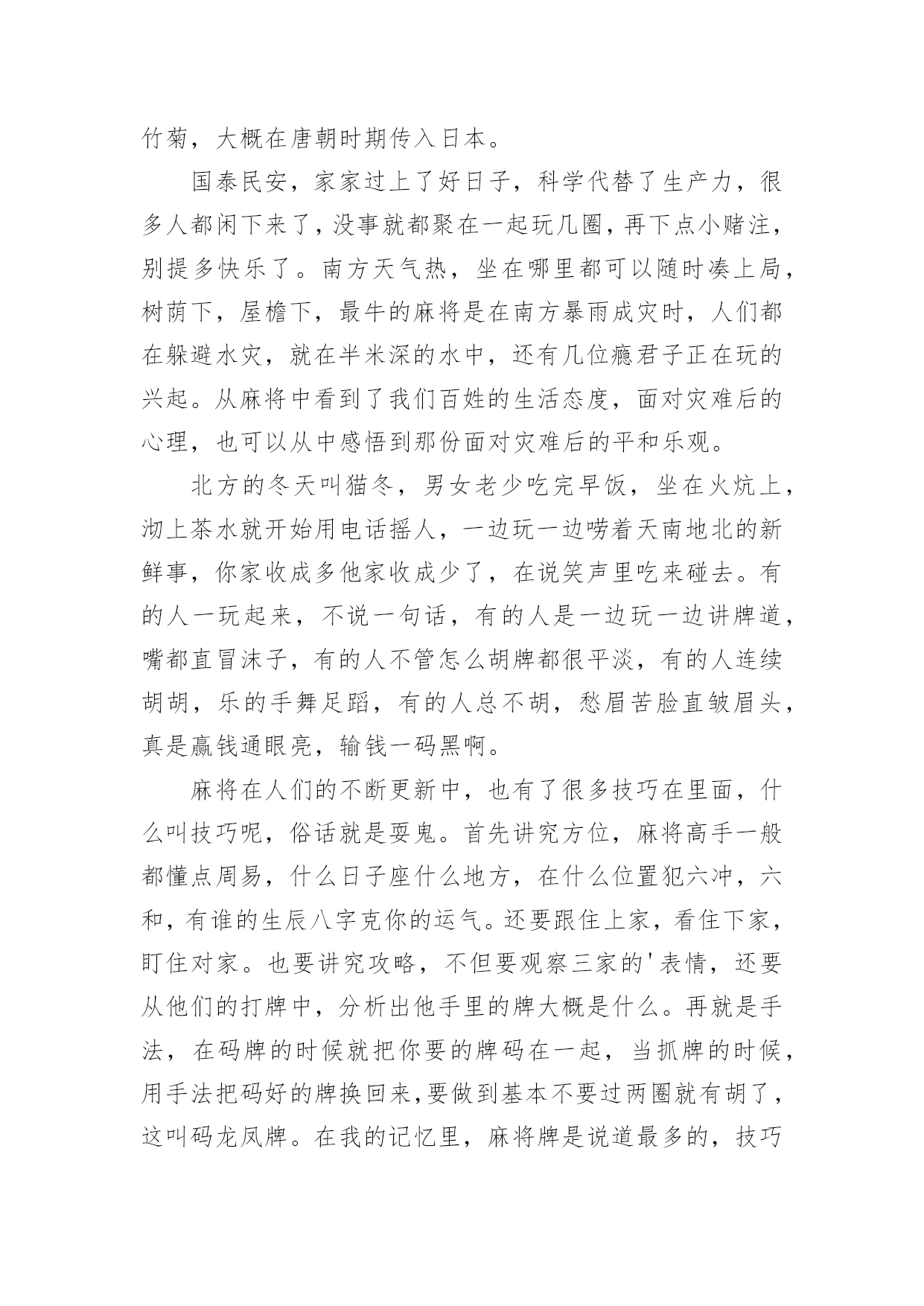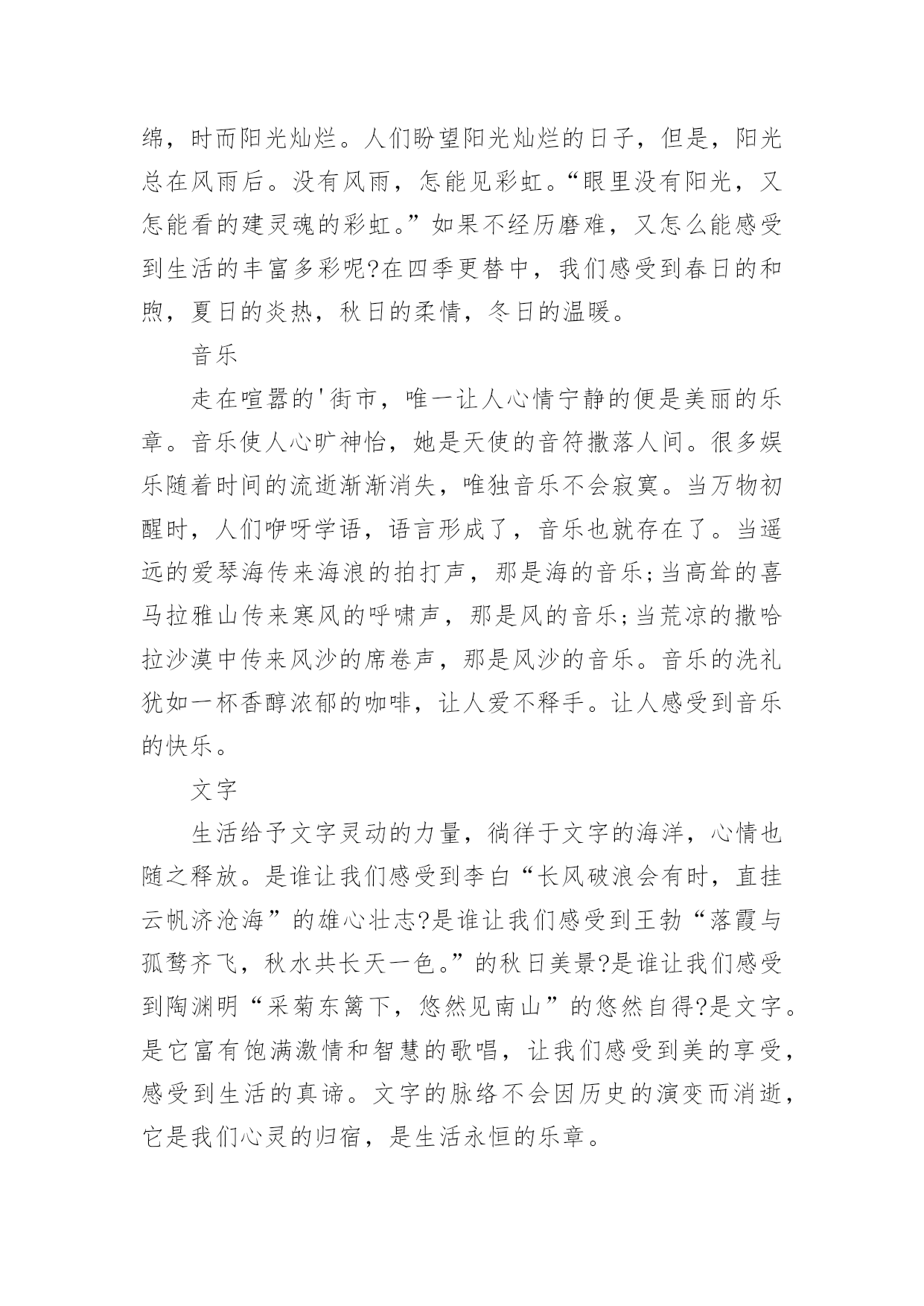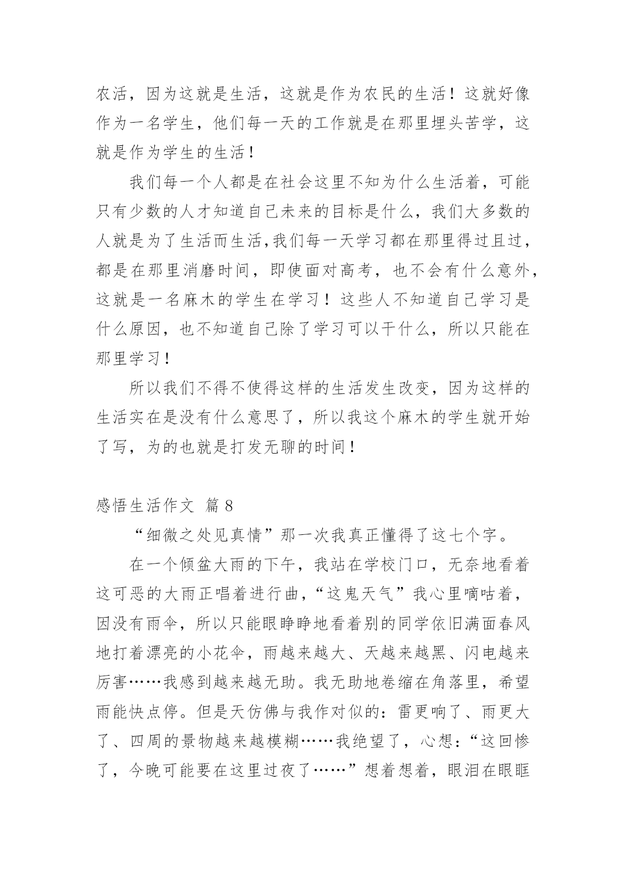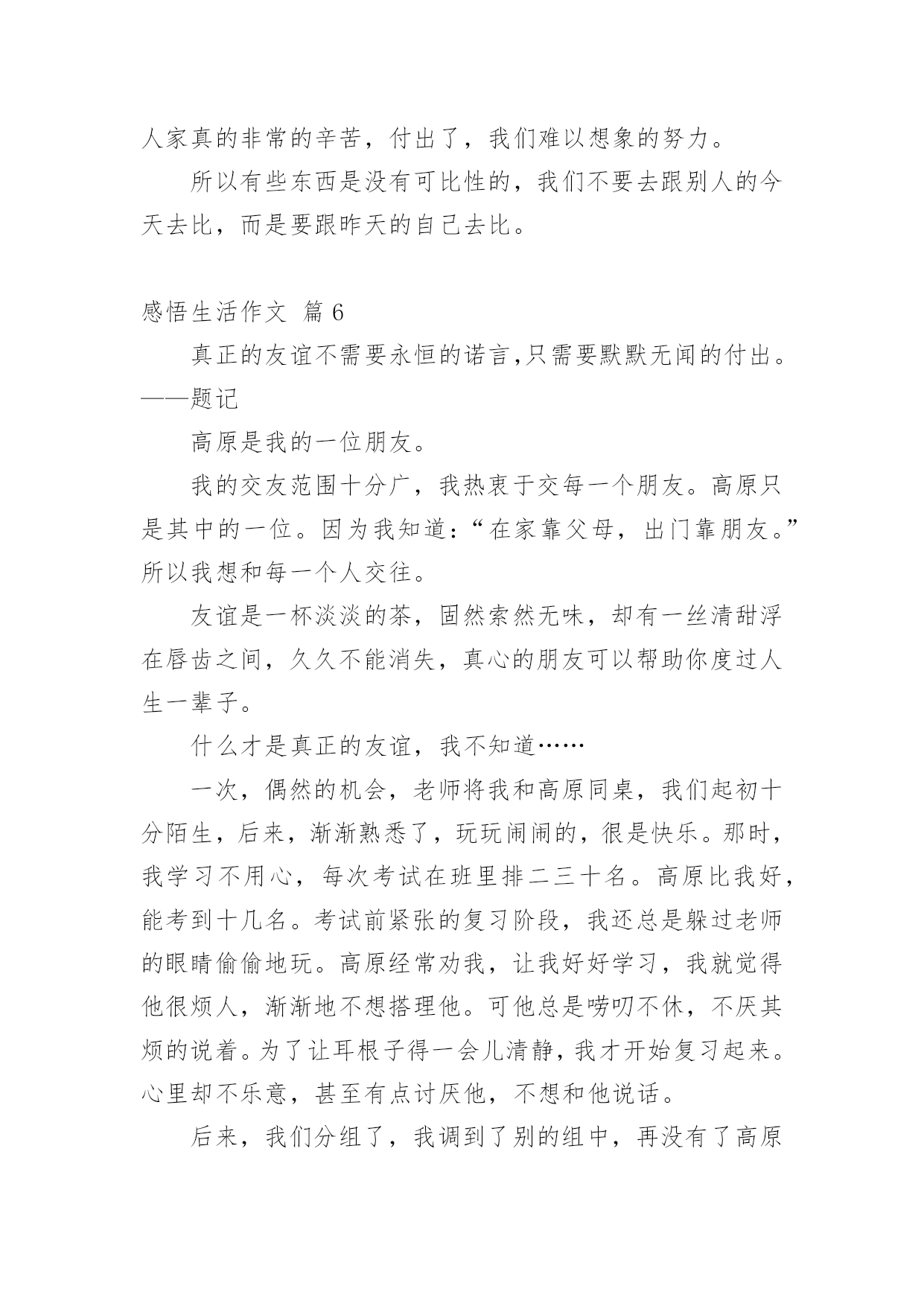 感悟生活作文【实用】感悟生活作文汇编十篇在日常生活或是工作学习中,许多人都写过作文吧,借助作文人们可以实现文化交流的目的。那么你有了解过作文吗?以下是小编为大家整理的感悟生活作文10篇,欢迎大家借鉴与参考,希望对大家有所帮助。感悟生活作文篇1这篇文章我主要想谈一谈我这么多年悟出来的一些道理。(一)为什么时间过得快或你有没有发现其实我们时间有时飞快,有时却极慢。这是为什么呢?给你们讲一个故事你们就知道了。从前吧,有两个人一个叫集中,一个叫分散。这一天,他们两人共同来到考场来考状元。开始考试了,起初两个人都很认真的写着答卷。过了十几分钟后分散开始东张西望,动来动去。他停止了答题竟然睡着了。而那个集中呢?他却认认真真的作答呢,无论出什么声音,他都一直认真的思考,毫不被周边的`事物所影响。通过这一故事你悟透了吗?对!没错!如果你认真的做一件事情,就会觉得时间过得飞快。反过来,如果你不认真对待一件事情,就会觉得时间过得很慢。(二)为什么人会喜新厌旧这个吧,我也不是非常的清楚,但有多少就说多少吧。曾经听了这样一个故事。一个小孩他看到了一个玩具就会非常喜欢,一直玩这个不放手。如果他看到一个更新鲜的玩意儿,他就会喜新厌旧。每一个人都会喜新厌旧的。那么如果这个世界上只有那一种玩具,那么一个人,你还会喜新厌旧吗?只让这个世界上有那么一种玩具,那么一个人还是不现实的。所以最好的选择就是珍惜喽!所以一定要记住唯一不会喜新厌旧的方法就是珍惜。感悟生活作文篇2麻将,是一种娱乐的工具,不管在哪里,不管在什么地方,只要有人的地方,基本都有人在玩麻将,只不过是各个地方的玩法不同,花样不同。常言道,赌品看人品,通过你的简单玩乐,就能品出你的个性和为人,这就叫打麻将看人生。麻将最早发源在江苏太仓,那里是为皇家储存皇粮的地方,因为麻雀太多,每年都要损失很多的粮食,所以每年为了驱赶麻雀就用了很多办法,用竹简做成各样的牌子,主要有火药枪形状的竹简,还有用绳子串起的鸟雀竹简,最后还有一种就是万贯。人们可以根据自己扑捉到的鸟雀,换取相应的竹简,去官家换取银两,没事的时候人们就用竹简做游戏,慢慢地就形成了,条,饼,万。条就是系鸟的串子,饼就是文钱,万就是万贯。火药枪打鸟也要观东南西北风向,中发白就是打中的意思,后来根据季节配上了春夏秋冬梅兰竹菊,大概在唐朝时期传入日本。国泰民安,家家过上了好日子,科学代替了生产力,很多人都闲下来了,没事就都聚在一起玩几圈,再下点小赌注,别提多快乐了。南方天气热,坐在哪里都可以随时凑上局,树荫下,屋檐下,最牛的麻将是在南方暴雨成灾时,人们都在躲避水灾,就在半米深的水中,还有几位瘾君子正在玩的兴起。从麻将中看到了我们百姓的生活态度,面对灾难后的心理,也可以从中感悟到那份面对灾难后的平和乐观。北方的冬天叫猫冬,男女老少吃完早饭,坐在火炕上,沏上茶水就开始用电话摇人,一边玩一边唠着天南地北的新鲜事,你家收成多他家收成少了,在说笑声里吃来碰去。有的人一玩起来,不说一句话,有的人是一边玩一边讲牌道,嘴都直冒沫子,有的人不管怎么胡牌都很平淡,有的人连续胡胡,乐的手舞足蹈,有的人总不胡,愁眉苦脸直皱眉头,真是赢钱通眼亮,输钱一码黑啊。麻将在人们的不断更新中,也有了很多技巧在里面,什么叫技巧呢,俗话就是耍鬼。首先讲究方位,麻将高手一般都懂点周易,什么日子座什么地方,在什么位置犯六冲,六和,有谁的生辰八字克你的运气。还要跟住上家,看住下家,盯住对家。也要讲究攻略,不但要观察三家的'表情,还要从他们的打牌中,分析出他手里的牌大概是什么。再就是手法,在码牌的时候就把你要的牌码在一起,当抓牌的时候,用手法把码好的牌换回来,要做到基本不要过两圈就有胡了,这叫码龙凤牌。在我的记忆里,麻将牌是说道最多的,技巧最多的,所以奉劝大家最好不要赌钱,你就是运气再好,也架不住人家用技巧啊,按术语说,人家是专业的,你是业余的,差距就是距离,不服不行啊。麻将虽小,却深受人们的喜爱,也从中感悟到了人生与麻将的很多关联和相似,有喜悦,有痛苦,有激动,有心跳,有意外,有曲折,那份突来的惊喜,那份高兴一半的失去,那份眼观六路的敏锐,那份耳听八方的细心,那份经历过无数对抗的从容,那份久经沙场的淡定,不到最后谁也决定不了结果,是输.是赢,每一步都是人生。感悟生活作文篇3春天,是一个充满希望的季节。春风和煦,春光明媚,大地变得多姿多彩。春风轻拂着大地,吹开了树的容颜,吹醒了沉睡的小草,吹的河水露出了笑颜,唤来了活泼机灵的小燕子。“一年之计在于春”。在这美好的季节里,全校师生一起去踏青。我们哼着歌,走在这条寻找春天的路上,路旁油菜花的清香夹杂着泥土的气息扑面而来,道路两旁的麦田随风荡漾,到处弥漫着春的气息,让人心旷神怡。清风拂来,疲倦一扫而空。整条路上都回荡着我们的笑声,伴随着花香,延伸向远方。眼前