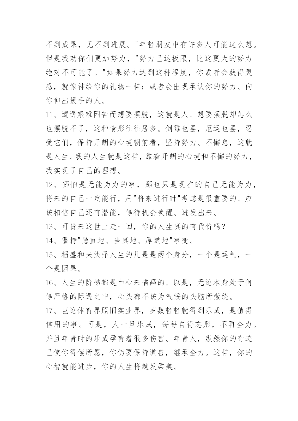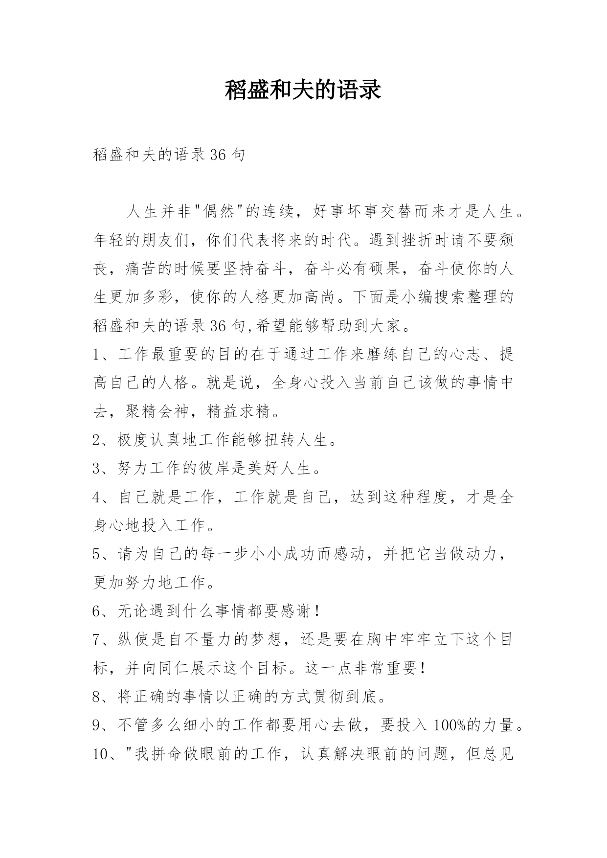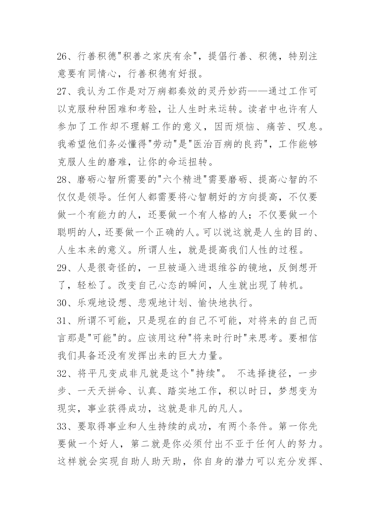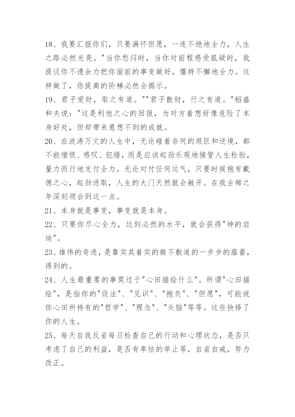 稻盛和夫的语录稻盛和夫的语录36句人生并非"偶然"的连续,好事坏事交替而来才是人生。年轻的朋友们,你们代表将来的时代。遇到挫折时请不要颓丧,痛苦的时候要坚持奋斗,奋斗必有硕果,奋斗使你的人生更加多彩,使你的人格更加高尚。下面是小编搜索整理的稻盛和夫的语录36句,希望能够帮助到大家。1、工作最重要的目的在于通过工作来磨练自己的心志、提高自己的人格。就是说,全身心投入当前自己该做的事情中去,聚精会神,精益求精。2、极度认真地工作能够扭转人生。3、努力工作的彼岸是美好人生。4、自己就是工作,工作就是自己,达到这种程度,才是全身心地投入工作。5、请为自己的每一步小小成功而感动,并把它当做动力,更加努力地工作。6、无论遇到什么事情都要感谢!7、纵使是自不量力的梦想,还是要在胸中牢牢立下这个目标,并向同仁展示这个目标。这一点非常重要!8、将正确的事情以正确的方式贯彻到底。9、不管多么细小的工作都要用心去做,要投入100%的力量。10、"我拼命做眼前的工作,认真解决眼前的问题,但总见不到成果,见不到进展。"年轻朋友中有许多人可能这么想。但是我劝你们更加努力,"努力已达极限,比这更大的努力绝对不可能了。"如果努力达到这种程度,你或者会获得灵感,就像神给你的礼物一样;或者会出现承认你的努力、向你伸出援手的人。11、遭遇艰难困苦而想要摆脱,这就是人。想要摆脱却怎么也摆脱不了,这种情形往往居多。倒霉也罢,厄运也罢,忍受它们,保持开朗的心境朝前看,坚持努力、不懈怠,这就是人生。我的人生就是这样,靠着开朗的心境和不懈的努力,我实现了自己的理想。12、哪怕是无能为力的事,那也只是现在的自己无能为力,将来的自己一定能行,用"将来进行时"考虑是很重要的。应该相信自己还有潜能,等待机会唤醒、迸发出来。13、可贵来这世上走一回,你的人生真的有代价吗?14、僵持"愚直地、当真地、厚道地"事变。15、稻盛和夫抉择人生的凡是是两个身分,一个是运气,一个是因果。16、人生的阶梯都是由心来描画的。以是,无论本身处于何等严格的际遇之中,心头都不该为气馁的头脑所萦绕。17、岂论体育界照旧实业界,岁数轻轻就得到乐成,是值得信用的事。可是,人一旦乐成,每每自得忘形,不再全力。并且年青时的乐成孕育着很多伤害。年青人,纵然你的奇迹已使你得偿所愿,你仍要保持谦善,继承全力。这样,你的心智就能进步,你的人生将越发柔美。18、我要汇报你们,只要满怀但愿,一连不绝地全力,人生之路必然光亮。"当你愁闷时,当你对前程感受狐疑时,我提议你不遗余力把你面前的事变做好,僵持不懈地全力。这样做了,你提高的阶梯必然会揭示。19、君子爱财,取之有道。""君子散财,行之有道。"稻盛和夫说:"这是利他之心的回报,为对方着想好像危险了本身好处,但却带来意想不到的成就。20、在波涛万丈的人生中,无论碰着奈何的艰巨和逆境,都不能憎恨、感叹、犯错,而是应该起劲乐观地接管人生检验,量力而行地支付全力。无论对付任何运气,只要时候抱有戴德之心,起劲进取,人生的大门天然就会敞开。在我古稀之年深刻领会到这一点。21、本身就是事变,事变就是本身。22、只要你尽心全力,达到必然的水平,就会获得"神的启迪"。23、雄伟的奇迹,是靠实其着实的微不敷道的一步步的蕴蓄,得到的。24、人生最重要的事莫过于"心田描绘什么"。所谓"心田描绘",是指你的"设法"、"见识"、"抱负"、"但愿",可能说你心田所持有的"哲学"、"理念"、"头脑"等等。这些抉择了你的人生。25、每天自我反省每日检查自己的行动和心理状态,是否只考虑了自己的利益,是否有卑怯的举止等,自省自戒,努力改正。26、行善积德"积善之家庆有余",提倡行善、积德,特别注意要有同情心,行善积德有好报。27、我认为工作是对万病都奏效的灵丹妙药——通过工作可以克服种种困难和考验,让人生时来运转。读者中也许有人参加了工作却不理解工作的意义,因而烦恼、痛苦、叹息。我希望他们务必懂得"劳动"是"医治百病的良药",工作能够克服人生的磨难,让你的命运扭转。28、磨砺心智所需要的"六个精进"需要磨砺、提高心智的不仅仅是领导。任何人都需要将心智朝好的方向提高,不仅要做一个有能力的人,还要做一个有人格的人;不仅要做一个聪明的人,还要做一个正确的人。可以说这就是人生的目的、人生本来的意义。所谓人生,就是提高我们人性的过程。29、人是很奇怪的,一旦被逼入进退维谷的镜地,反倒想开了,轻松了。改变自己心态的瞬间,人生就出现了转机。30、乐观地设想、悲观地计划、愉快地执行。31、所谓不可能,只是现在的自己不可能,对将来的自己而言那是"可能"的。应该用这种"将来时行时"来思考。要相信我们具备还没有发挥出来的巨大力量。32、将平凡变成非凡就是这个"持续"。不选择捷径,一步步、一天天拼命、认真、踏实地工作,积以时日,梦想