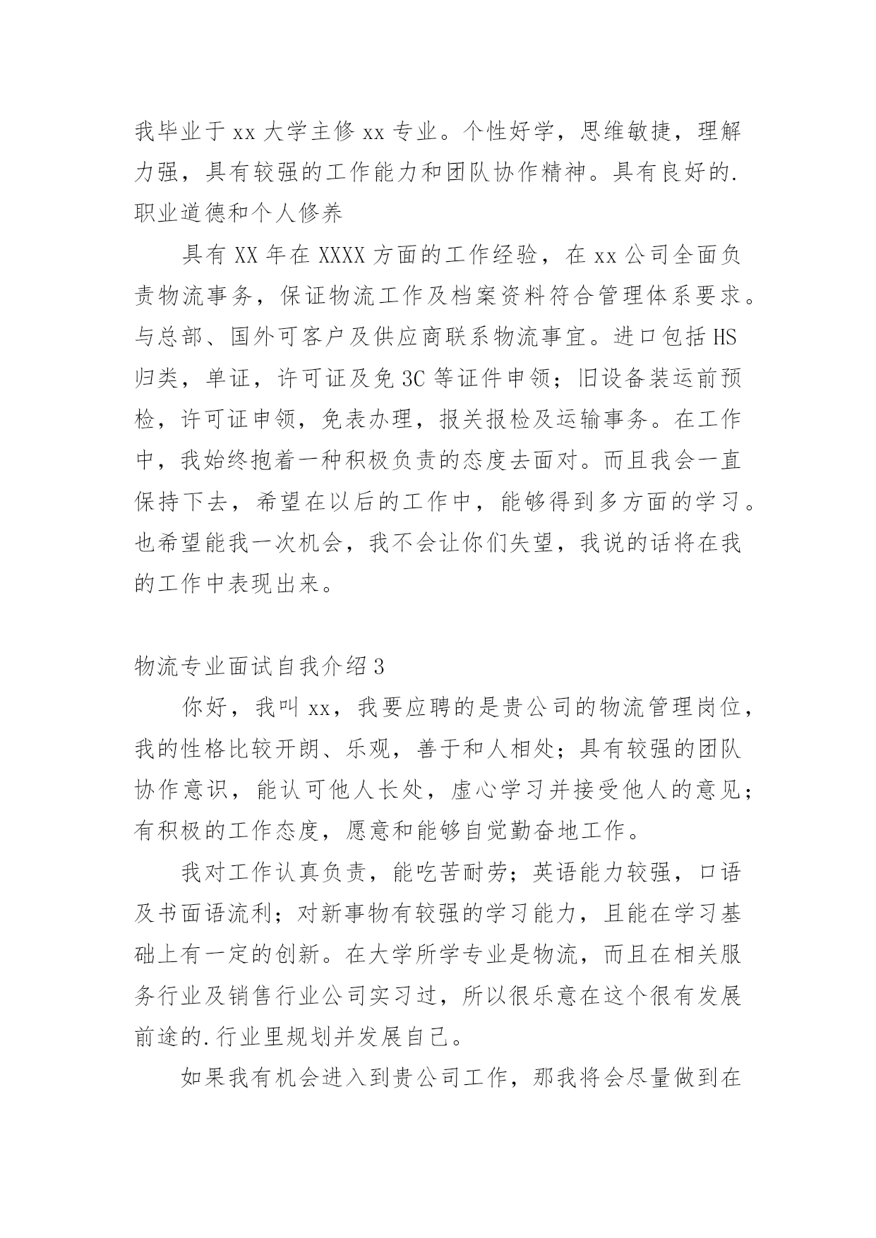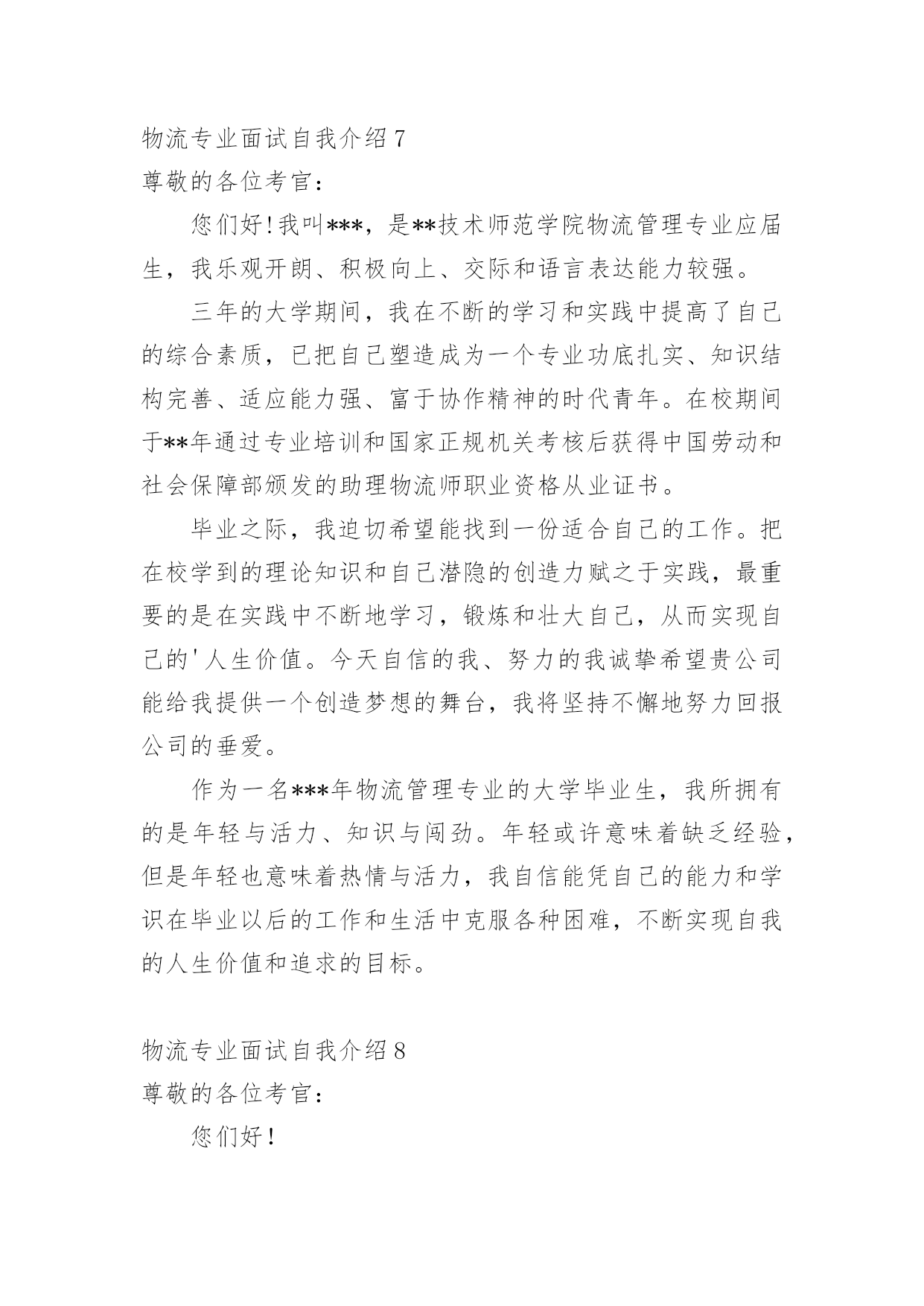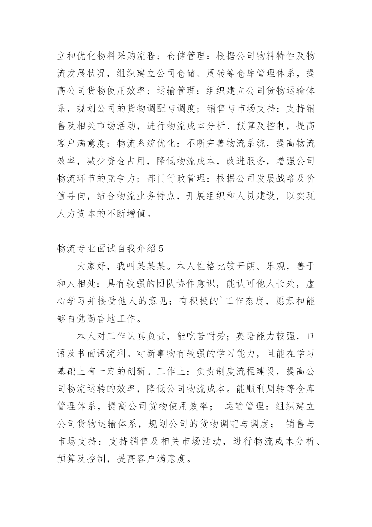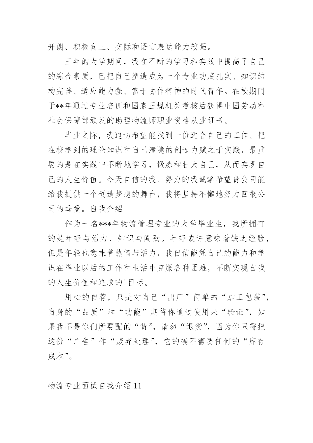 物流专业面试自我介绍物流专业面试自我介绍精选15篇当进入一个陌生环境,常常需要我们进行自我介绍,自我介绍可以满足我们渴望得到尊重的心理。那么你真的会写自我介绍吗?下面是小编收集整理的物流专业面试自我介绍,仅供参考,大家一起来看看吧。物流专业面试自我介绍1您好,今天我要应聘的是贵公司的某某岗位。本人今年毕业于某某大学,我的性格比较开朗、乐观,善于和人相处;具有较强的团队协作意识,能认可他人长处,虚心学习并接受他人的意见;有积极的工作态度,愿意和能够自觉勤奋地工作。对工作认真负责,能吃苦耐劳;英语能力较强,口语及书面语流利;对新事物有较强的'学习能力,且能在学习基础上有一定的创新。我在大学所学专业是物流,而且在相关服务行业及销售行业公司实习过,所以很乐意在这个很有发展前途的行业里规划并发展自己。谢谢!物流专业面试自我介绍2您好!很荣幸有这样一个机会,让我相各位介绍我自己。我毕业于xx大学主修xx专业。个性好学,思维敏捷,理解力强,具有较强的工作能力和团队协作精神。具有良好的.职业道德和个人修养具有XX年在XXXX方面的工作经验,在xx公司全面负责物流事务,保证物流工作及档案资料符合管理体系要求。与总部、国外可客户及供应商联系物流事宜。进口包括HS归类,单证,许可证及免3C等证件申领;旧设备装运前预检,许可证申领,免表办理,报关报检及运输事务。在工作中,我始终抱着一种积极负责的态度去面对。而且我会一直保持下去,希望在以后的工作中,能够得到多方面的学习。也希望能我一次机会,我不会让你们失望,我说的话将在我的工作中表现出来。物流专业面试自我介绍3你好,我叫xx,我要应聘的是贵公司的物流管理岗位,我的性格比较开朗、乐观,善于和人相处;具有较强的团队协作意识,能认可他人长处,虚心学习并接受他人的意见;有积极的工作态度,愿意和能够自觉勤奋地工作。我对工作认真负责,能吃苦耐劳;英语能力较强,口语及书面语流利;对新事物有较强的学习能力,且能在学习基础上有一定的创新。在大学所学专业是物流,而且在相关服务行业及销售行业公司实习过,所以很乐意在这个很有发展前途的.行业里规划并发展自己。如果我有机会进入到贵公司工作,那我将会尽量做到在流程建设方面,提高公司物流运转的效率,降低公司物流成本;供应商与采购管理方面,建立和优化物料采购流程;仓储管理方面,根据公司物料特性及物流发展状况,组织建立公司仓储、周转等仓库管理体系,提高公司货物使用效率;运输管理方面,组织建立公司货物运输体系,规划公司的货物调配与调度;销售与市场支持方面,支持销售及相关市场活动,进行物流成本分析、预算及控制,提高客户满意度;物流系统优化方面,不断完善物流系统,提高物流效率,减少资金占用,降低物流成本,改进服务,增强公司物流环节的竞争力;部门行政管理方面,根据公司发展战略及价值导向,结合物流业务特点,开展组织和人员建设,以实现人力资本的不断增值。物流专业面试自我介绍4大家好,本人xxx,性格比较开朗、乐观,善于和人相处;具有较强的团队协作意识,能认可他人长处,虚心学习并接受他人的意见;有积极的工作态度,愿意和能够自觉勤奋地工作。对工作认真负责,能吃苦耐劳;英语能力较强,口语及书面语流利;对新事物有较强的.学习能力,且能在学习基础上有一定的创新。在大学所学专业是物流,而且在相关服务行业及销售行业公司实习过,所以很乐意在这个很有发展前途的行业里规划并发展自己。谢谢!进一步介绍以后的工作时:制度流程建设:提高公司物流运转的效率,降低公司物流成本;供应商与采购管理:建立和优化物料采购流程;仓储管理:根据公司物料特性及物流发展状况,组织建立公司仓储、周转等仓库管理体系,提高公司货物使用效率;运输管理:组织建立公司货物运输体系,规划公司的货物调配与调度;销售与市场支持:支持销售及相关市场活动,进行物流成本分析、预算及控制,提高客户满意度;物流系统优化:不断完善物流系统,提高物流效率,减少资金占用,降低物流成本,改进服务,增强公司物流环节的竞争力;部门行政管理:根据公司发展战略及价值导向,结合物流业务特点,开展组织和人员建设,以实现人力资本的不断增值。物流专业面试自我介绍5大家好,我叫某某某。本人性格比较开朗、乐观,善于和人相处;具有较强的团队协作意识,能认可他人长处,虚心学习并接受他人的意见;有积极的`工作态度,愿意和能够自觉勤奋地工作。本人对工作认真负责,能吃苦耐劳;英语能力较强,口语及书面语流利。对新事物有较强的学习能力,且能在学习基础上有一定的创新。工作上:负责制度流程建设,提高公司物流运转的效率,降低公司物流成本。能顺利周转等仓库管理体系,提高公司货物使用效率;运输管理:组织建立公司货物运输体系,规划公司的货物调配与调度;销售与市场支持:支持销售及相关市场活动,进行物流成本分析、预算及控制