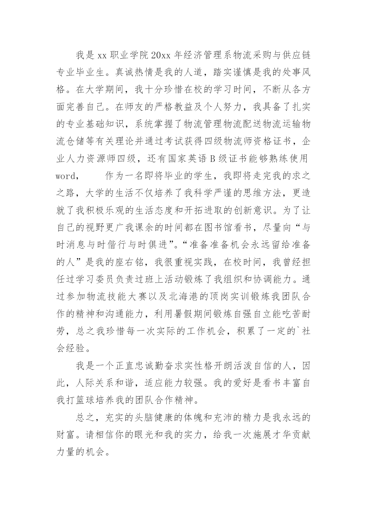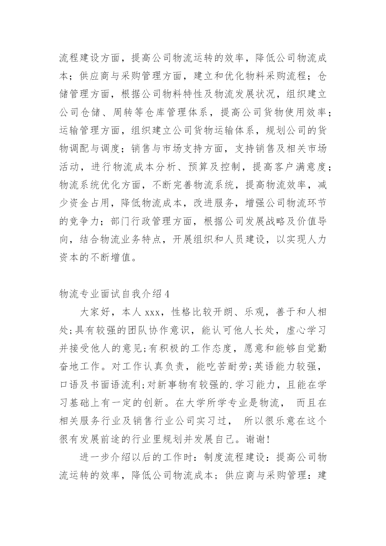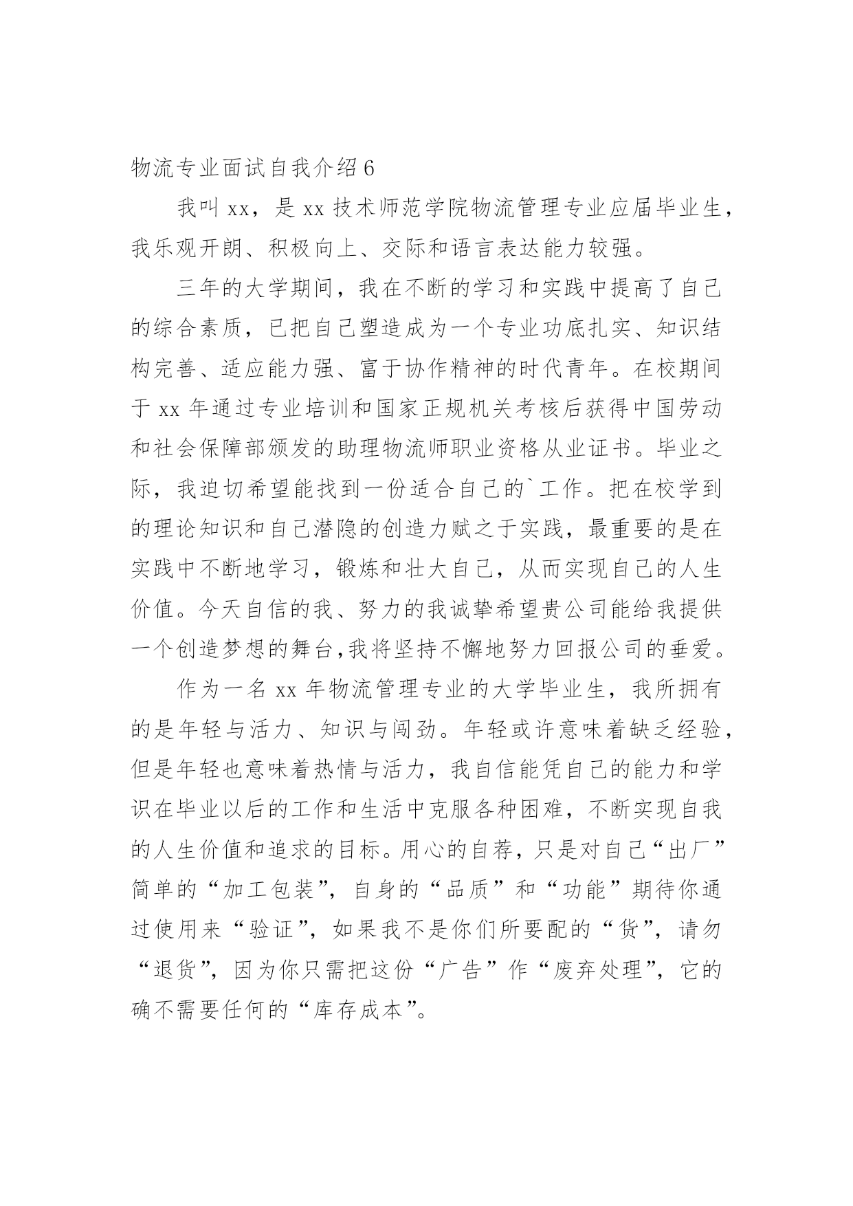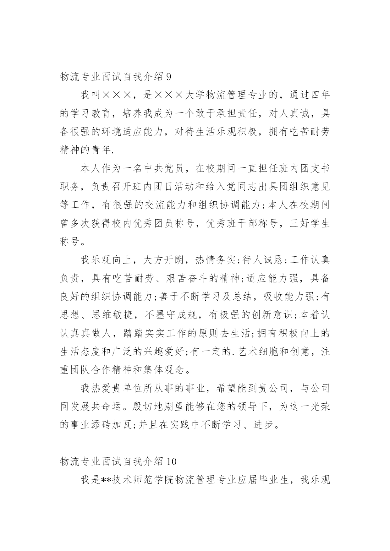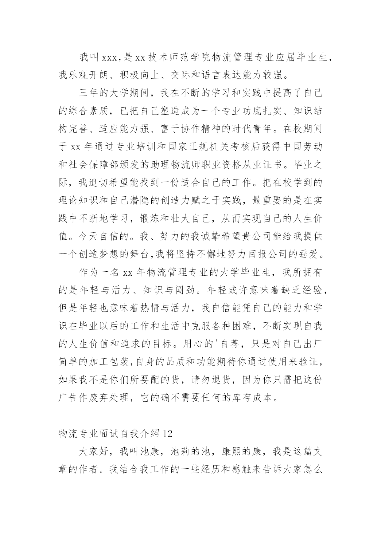 物流专业面试自我介绍物流专业面试自我介绍精选15篇当进入一个陌生环境,常常需要我们进行自我介绍,自我介绍可以满足我们渴望得到尊重的心理。那么你真的会写自我介绍吗?下面是小编收集整理的物流专业面试自我介绍,仅供参考,大家一起来看看吧。物流专业面试自我介绍1您好,今天我要应聘的是贵公司的某某岗位。本人今年毕业于某某大学,我的性格比较开朗、乐观,善于和人相处;具有较强的团队协作意识,能认可他人长处,虚心学习并接受他人的意见;有积极的工作态度,愿意和能够自觉勤奋地工作。对工作认真负责,能吃苦耐劳;英语能力较强,口语及书面语流利;对新事物有较强的'学习能力,且能在学习基础上有一定的创新。我在大学所学专业是物流,而且在相关服务行业及销售行业公司实习过,所以很乐意在这个很有发展前途的行业里规划并发展自己。谢谢!物流专业面试自我介绍2您好!很荣幸有这样一个机会,让我相各位介绍我自己。我毕业于xx大学主修xx专业。个性好学,思维敏捷,理解力强,具有较强的工作能力和团队协作精神。具有良好的.职业道德和个人修养具有XX年在XXXX方面的工作经验,在xx公司全面负责物流事务,保证物流工作及档案资料符合管理体系要求。与总部、国外可客户及供应商联系物流事宜。进口包括HS归类,单证,许可证及免3C等证件申领;旧设备装运前预检,许可证申领,免表办理,报关报检及运输事务。在工作中,我始终抱着一种积极负责的态度去面对。而且我会一直保持下去,希望在以后的工作中,能够得到多方面的学习。也希望能我一次机会,我不会让你们失望,我说的话将在我的工作中表现出来。物流专业面试自我介绍3你好,我叫xx,我要应聘的是贵公司的物流管理岗位,我的性格比较开朗、乐观,善于和人相处;具有较强的团队协作意识,能认可他人长处,虚心学习并接受他人的意见;有积极的工作态度,愿意和能够自觉勤奋地工作。我对工作认真负责,能吃苦耐劳;英语能力较强,口语及书面语流利;对新事物有较强的学习能力,且能在学习基础上有一定的创新。在大学所学专业是物流,而且在相关服务行业及销售行业公司实习过,所以很乐意在这个很有发展前途的.行业里规划并发展自己。如果我有机会进入到贵公司工作,那我将会尽量做到在流程建设方面,提高公司物流运转的效率,降低公司物流成本;供应商与采购管理方面,建立和优化物料采购流程;仓储管理方面,根据公司物料特性及物流发展状况,组织建立公司仓储、周转等仓库管理体系,提高公司货物使用效率;运输管理方面,组织建立公司货物运输体系,规划公司的货物调配与调度;销售与市场支持方面,支持销售及相关市场活动,进行物流成本分析、预算及控制,提高客户满意度;物流系统优化方面,不断完善物流系统,提高物流效率,减少资金占用,降低物流成本,改进服务,增强公司物流环节的竞争力;部门行政管理方面,根据公司发展战略及价值导向,结合物流业务特点,开展组织和人员建设,以实现人力资本的不断增值。物流专业面试自我介绍4大家好,本人xxx,性格比较开朗、乐观,善于和人相处;具有较强的团队协作意识,能认可他人长处,虚心学习并接受他人的意见;有积极的工作态度,愿意和能够自觉勤奋地工作。对工作认真负责,能吃苦耐劳;英语能力较强,口语及书面语流利;对新事物有较强的.学习能力,且能在学习基础上有一定的创新。在大学所学专业是物流,而且在相关服务行业及销售行业公司实习过,所以很乐意在这个很有发展前途的行业里规划并发展自己。谢谢!进一步介绍以后的工作时:制度流程建设:提高公司物流运转的效率,降低公司物流成本;供应商与采购管理:建立和优化物料采购流程;仓储管理:根据公司物料特性及物流发展状况,组织建立公司仓储、周转等仓库管理体系,提高公司货物使用效率;运输管理:组织建立公司货物运输体系,规划公司的货物调配与调度;销售与市场支持:支持销售及相关市场活动,进行物流成本分析、预算及控制,提高客户满意度;物流系统优化:不断完善物流系统,提高物流效率,减少资金占用,降低物流成本,改进服务,增强公司物流环节的竞争力;部门行政管理:根据公司发展战略及价值导向,结合物流业务特点,开展组织和人员建设,以实现人力资本的不断增值。物流专业面试自我介绍5大家好,我叫某某某。本人性格比较开朗、乐观,善于和人相处;具有较强的团队协作意识,能认可他人长处,虚心学习并接受他人的意见;有积极的`工作态度,愿意和能够自觉勤奋地工作。本人对工作认真负责,能吃苦耐劳;英语能力较强,口语及书面语流利。对新事物有较强的学习能力,且能在学习基础上有一定的创新。工作上:负责制度流程建设,提高公司物流运转的效率,降低公司物流成本。能顺利周转等仓库管理体系,提高公司货物使用效率;运输管理:组织建立公司货物运输体系,规划公司的货物调配与调度;销售与市场支持:支持销售及相关市场活动,进行物流成本分析、预算及控制