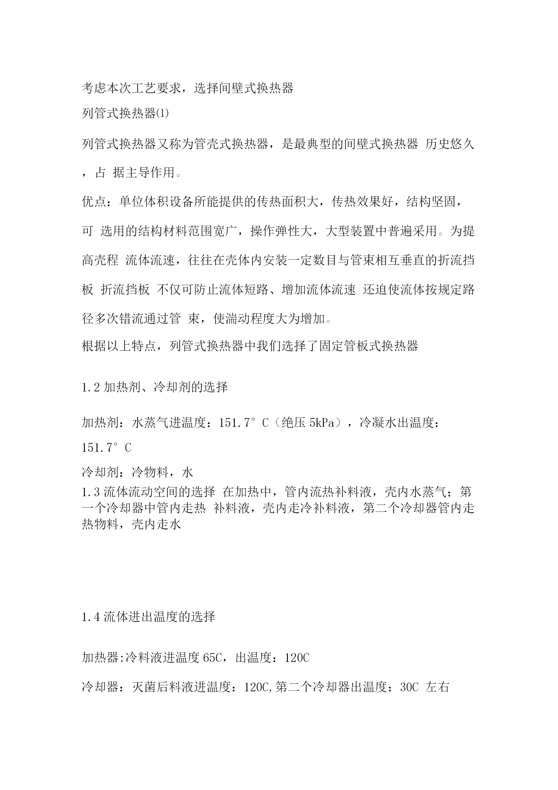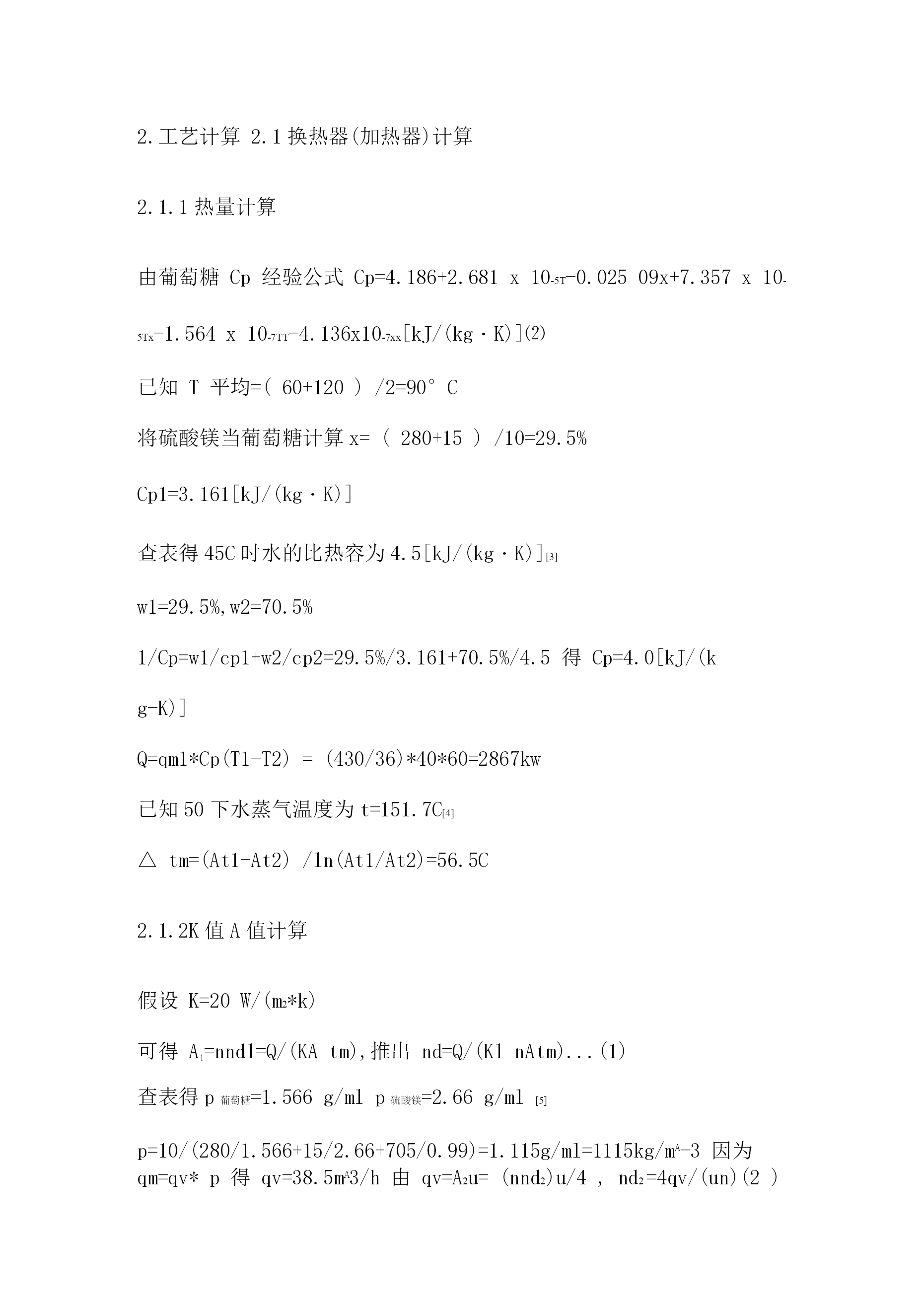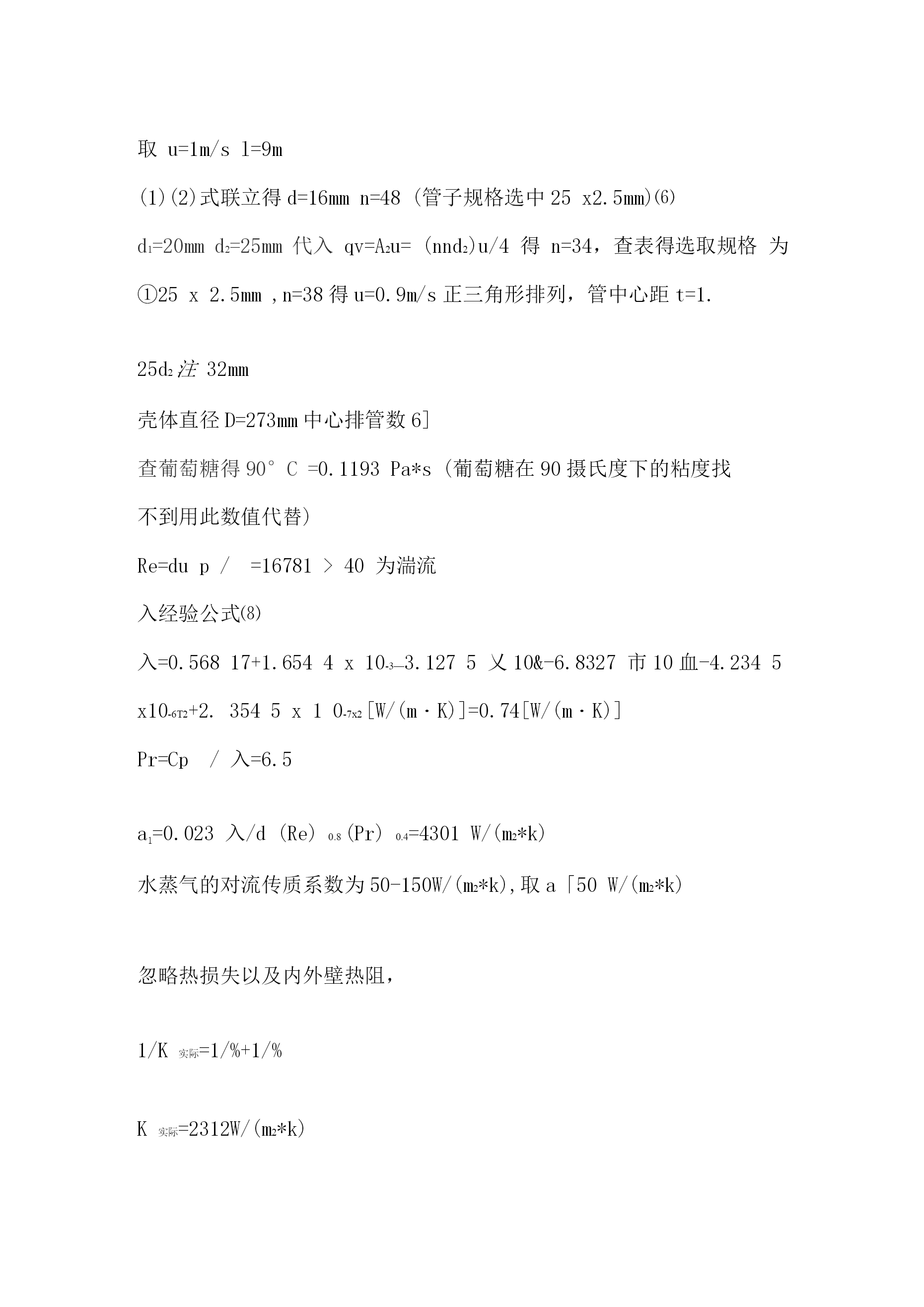 过程工程原理课程设计题目发酵补料液(430Kg/h)连续灭菌系统设计姓名完成日期TOC\o"1-5"\h\z设计方案简介41.1换热器类型的选择41.2加热剂、冷却剂的选择41.3流体流动空间的选择51.4流体进出温度的选择51.5换热器材质的选择51.6初步流程图6工艺计算72.1换热器(加热器)计算72.1.1热量计算72.1.2K值A值计算72.1.3管壁温度92.1.4壳体壁温92.1.5温度补偿92.2冷却器1计算92.2.1热量计算92.2.2面积A与K值计算102.2.3管壁温度112.2.4壳体壁温112.2.5温度补偿112.3冷却器2112.3.1热量计算112.3.2K值A值计算122.3.3管壁温度132.3.4壳体壁温132.3.5温度补偿133.辅助设备的选择143.1泵的选择143.1.1离心泵对外管路供给的压头Hfi153.1.2离心泵对加热器供给的压头Hf2153.1.3离心、泵对冷却器1供给的压头Hf3163.1.4离心、泵对冷却器2供给的压头hf4163.1.5离心泵对维持罐供给的压头Hf5163.1.6hfM173.1.7泵的选择173.2法兰和管板的选取183.3折流板193.4封头194.设计一览表195.设计评述236.参考文献247.主要符号说明21设计方案简介1.1换热器类型的选择换热器分类:1、两流体直接接触式换热器:会影响补料液浓度,难以精确控制2、蓄热式换热器:常用于回收气体热量或冷量,不适用本次设计3、间壁式换热器:应用广,冷热流体用间壁隔开,不影响料液浓度和染菌可能考虑本次工艺要求,选择间壁式换热器列管式换热器⑴列管式换热器又称为管壳式换热器,是最典型的间壁式换热器历史悠久,占据主导作用。优点:单位体积设备所能提供的传热面积大,传热效果好,结构坚固,可选用的结构材料范围宽广,操作弹性大,大型装置中普遍采用。为提高壳程流体流速,往往在壳体内安装一定数目与管束相互垂直的折流挡板折流挡板不仅可防止流体短路、增加流体流速还迫使流体按规定路径多次错流通过管束,使湍动程度大为增加。根据以上特点,列管式换热器中我们选择了固定管板式换热器1.2加热剂、冷却剂的选择加热剂:水蒸气进温度:151.7°C(绝压5kPa),冷凝水出温度:151.7°C冷却剂:冷物料,水1.3流体流动空间的选择在加热中,管内流热补料液,壳内水蒸气;第一个冷却器中管内走热补料液,壳内走冷补料液,第二个冷却器管内走热物料,壳内走水1.4流体进出温度的选择加热器:冷料液进温度65C,出温度:120C冷却器:灭菌后料液进温度:120C,第二个冷却器出温度:30C左右第一个冷却器冷料液进温度:25C,出温度:60C1.5换热器材质的选择不锈钢1.6初步流程图l=40m2t1=2S-Li=5m6=5m水L=5m7T5t24Z[冷凝水T1=t2=S0L3=40m2.工艺计算2.1换热器(加热器)计算2.1.1热量计算由葡萄糖Cp经验公式Cp=4.186+2.681x10-5T-0.02509x+7.357x10-5Tx-1.564x10-7TT-4.136x10-7xx[kJ/(kg・K)]⑵已知T平均=(60+120)/2=90°C将硫酸镁当葡萄糖计算x=(280+15)/10=29.5%Cp1=3.161[kJ/(kg・K)]查表得45C时水的比热容为4.5[kJ/(kg・K)][3]w1=29.5%,w2=70.5%1/Cp=w1/cp1+w2/cp2=29.5%/3.161+70.5%/4.5得Cp=4.0[kJ/(kg-K)]Q=qm1*Cp(T1-T2)=(430/36)*40*60=2867kw已知50下水蒸气温度为t=151.7C[4]△tm=(At1-At2)/ln(At1/At2)=56.5C2.1.2K值A值计算假设K=20W/(m2*k)可得A1=nndl=Q/(KAtm),推出nd=Q/(KlnAtm)...(1)查表得p葡萄糖=1.566g/mlp硫酸镁=2.66g/ml[5]p=10/(280/1.566+15/2.66+705/0.99)=1.115g/ml=1115kg/mA-3因为qm=qv*p得qv=38.5mA3/h由qv=A2u=(nnd2)u/4,nd2=4qv/(un)(2)取u=1m/sl=9m(1)(2)式联立得d=16mmn=48(管子规格选中25x2.5mm)⑹d1=20mmd2=25mm代入qv=A2u=(nnd2)u/4得n=34,查表得选取规格为①25x2.5mm,n=