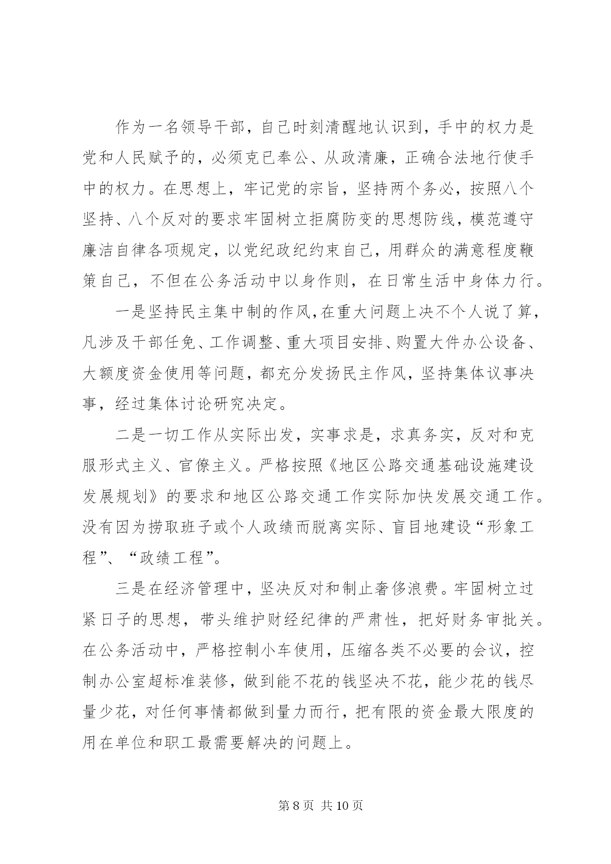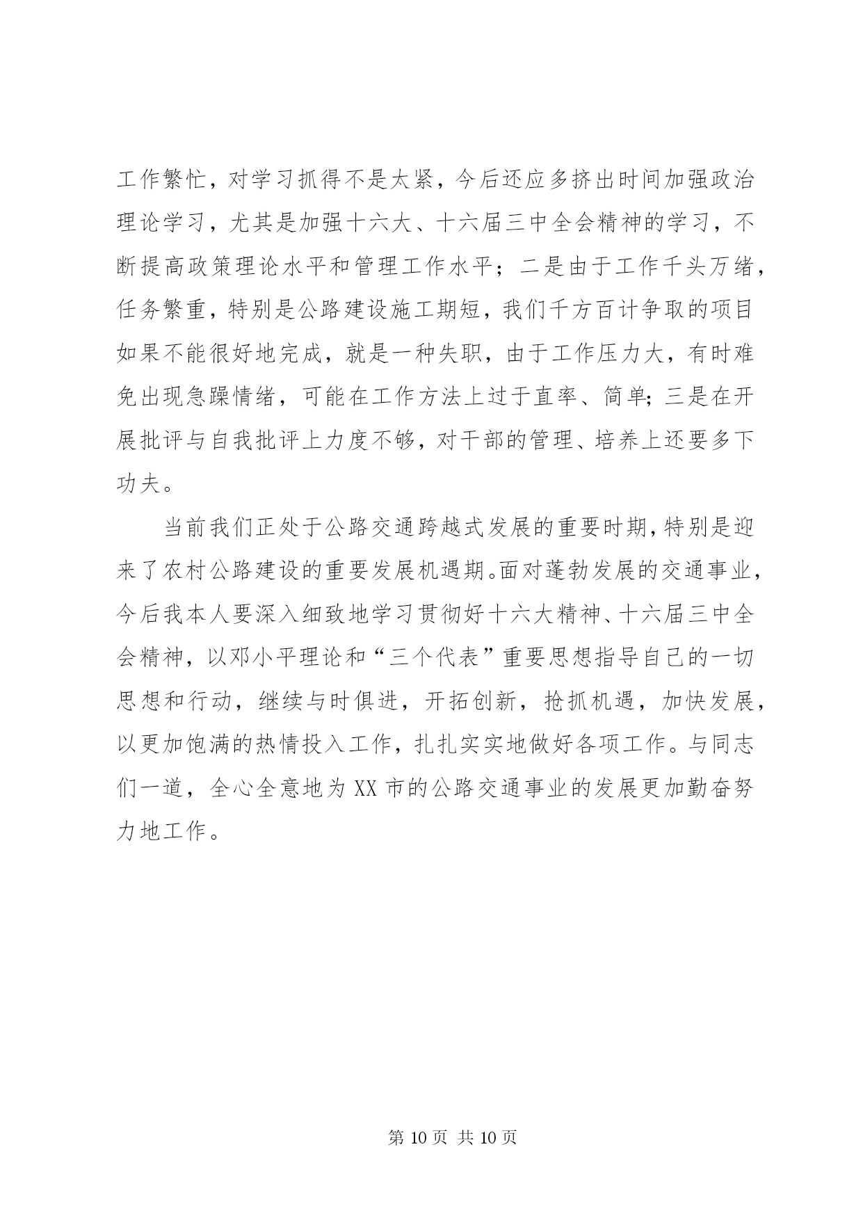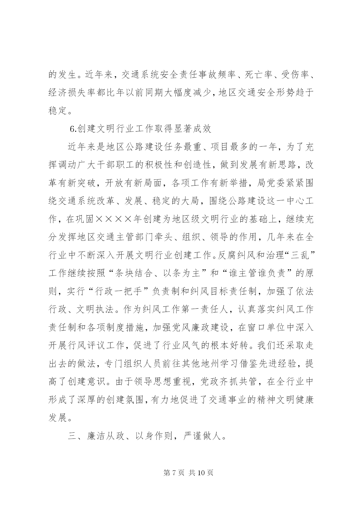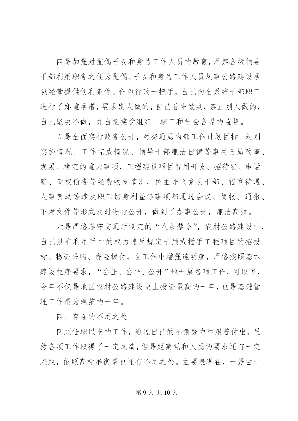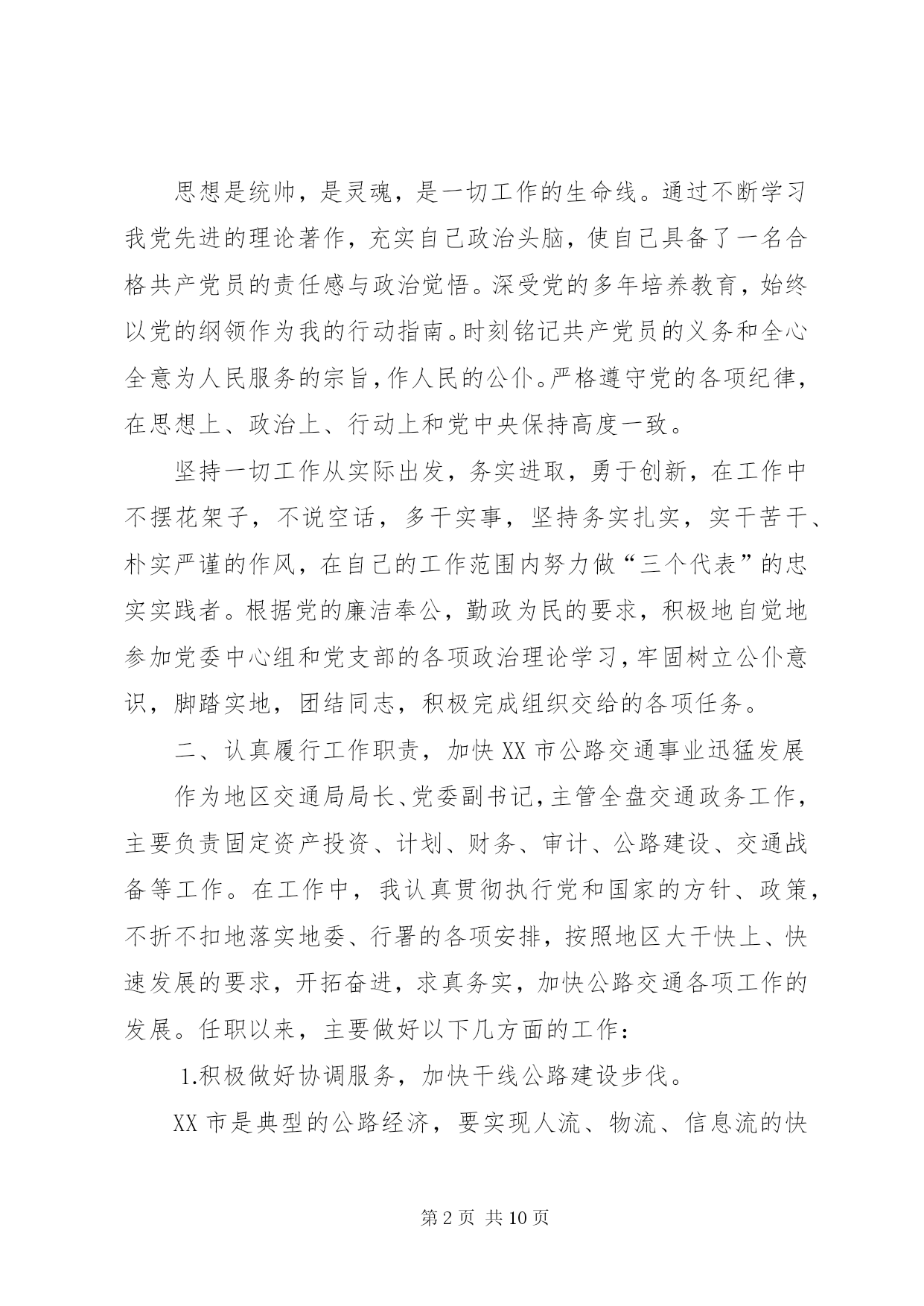 第PAGE\*Arabic\*MERGEFORMAT10页共NUMPAGES\*MERGEFORMAT10页交通局局长述职报告————————交通局本人任职以来,在马列主义、毛泽东思想、邓小平理论和“三个代表”重要思想的指引下,以只争朝夕的精神努力工作,恪尽职守,勤勉自立,为XX市交通事业的发展作出了自己的努力。特别是这两年自治区对农村公路建设投资逐年成倍增加,面对千载难逢的历史机遇和繁重的公路建设任务,作为地区交通局局长,自己深感肩负的责任重大。几年来,在地委行署的正确领导下,自己以发展地区交通事业、促进地区经济发展为已任,团结交通局领导班子全体成员,积极与有关部门协调配合,充分调动广大干部的积极性、创造性,抢抓机遇,开拓奋进,以强烈的责任感和使命感投身于地区交通事业的发展。通过艰苦付出和不懈努力,各项工作取得了显著的成效。农村公路建设任务每年都能在保证质量的前提下足额完成。并受到自治区交通厅通报表扬。公路规划工作在全疆交通系统十五个地州市中名列榜首,创建文明行业、纠风工作分别在全疆交通系统进行经验交流,运输市场秩序进一步规范,安全生产工作深入扎实地开展,交通工作呈现出良好的发展局面。取得成绩的同时,当然也存在一些不足。下面就任职以来所做的主要工作作以下总结。一、政治思想上始终保持与党一致,工作作风保持朴实、严谨。思想是统帅,是灵魂,是一切工作的生命线。通过不断学习我党先进的理论著作,充实自己政治头脑,使自己具备了一名合格共产党员的责任感与政治觉悟。深受党的多年培养教育,始终以党的纲领作为我的行动指南。时刻铭记共产党员的义务和全心全意为人民服务的宗旨,作人民的公仆。严格遵守党的各项纪律,在思想上、政治上、行动上和党中央保持高度一致。坚持一切工作从实际出发,务实进取,勇于创新,在工作中不摆花架子,不说空话,多干实事,坚持务实扎实,实干苦干、朴实严谨的作风,在自己的工作范围内努力做“三个代表”的忠实实践者。根据党的廉洁奉公,勤政为民的要求,积极地自觉地参加党委中心组和党支部的各项政治理论学习,牢固树立公仆意识,脚踏实地,团结同志,积极完成组织交给的各项任务。二、认真履行工作职责,加快XX市公路交通事业迅猛发展作为地区交通局局长、党委副书记,主管全盘交通政务工作,主要负责固定资产投资、计划、财务、审计、公路建设、交通战备等工作。在工作中,我认真贯彻执行党和国家的方针、政策,不折不扣地落实地委、行署的各项安排,按照地区大干快上、快速发展的要求,开拓奋进,求真务实,加快公路交通各项工作的发展。任职以来,主要做好以下几方面的工作:⒈积极做好协调服务,加快干线公路建设步伐。XX市是典型的公路经济,要实现人流、物流、信息流的快速发展,必须加大公路交通基础设施建设步伐,以公路建设的快速发展,带动相关产业的发展,拉动地区经济的快速增长。在新疆公路交通建设大投入、大建设、大发展时期,作为交通局局长,自己始终把加快地区公路交通基础设施建设、重点农村公路建设、“通达”和“通油”工程建设作为第一要务,抢抓机遇,千方百计争取项目和公路建设资金。在地委、行署的大力支持和交通厅的关怀下,通过我们的不懈努力,××××年度,我们争取到了亿多元的公路基础设施建设资金,其中:地区国省道干线投资亿元,新建、改建、改造道路多公里;农村道路投资万元,新建、改建道路多公里;地方城镇道路建设资金万元,累计修建公里;客运站点投资万元。××××年我区共安排国道、省道、干线公路建设项目个,公路建设总投资近亿元,建设里程多公里。在落实项目资金后,由于施工项目多,施工条件不一,为确保工程顺利进行,我们加强与各县(市)政府的协调与沟通,在认真落实地区出台的各项优惠政策的同时,积极主动与施工单位加强联系,及时了解施工进展情况,随时解决工作中遇到问题,做到哪里出现问题我们的工作就开展到哪里,通过大量艰苦细致的工作,为地区公路建设创造了更加宽松的施工环境,为工程项目的顺利实施提供了有力保证。⒉严格规范管理,把好质量关,确保农村公路建设顺利实施××××年全地区投入农村公路建设资金万元,建设里程公里,到十月底,个合同标段基本完工,完成工程量的。××××年,我区重点农村公路总投资万元,建设总里程公里,开工合同段六个。“通达”公路项目计划公里,“通油”公路项目计划公里,合计公里,预计年底将超额完成。无论从投资规模和建设标准上,在地区农村公路建设史上都是史无前例的。“质量重于泰山”,面对繁重任务和高质量的要求,我们做到了:⑴严格履行和遵守工程建设程序,把住了建设项目前期工作质量关;⑵严格实行项目法人责任制度、招投标制度、合同管理制度、工程监理制度,“双合同”制度;⑶明确了质量目标,建立起层层质量责任制;⑷采取群众监督、舆论监督相结合的形式,加强了对工程质量的监督管理。近几年来施
