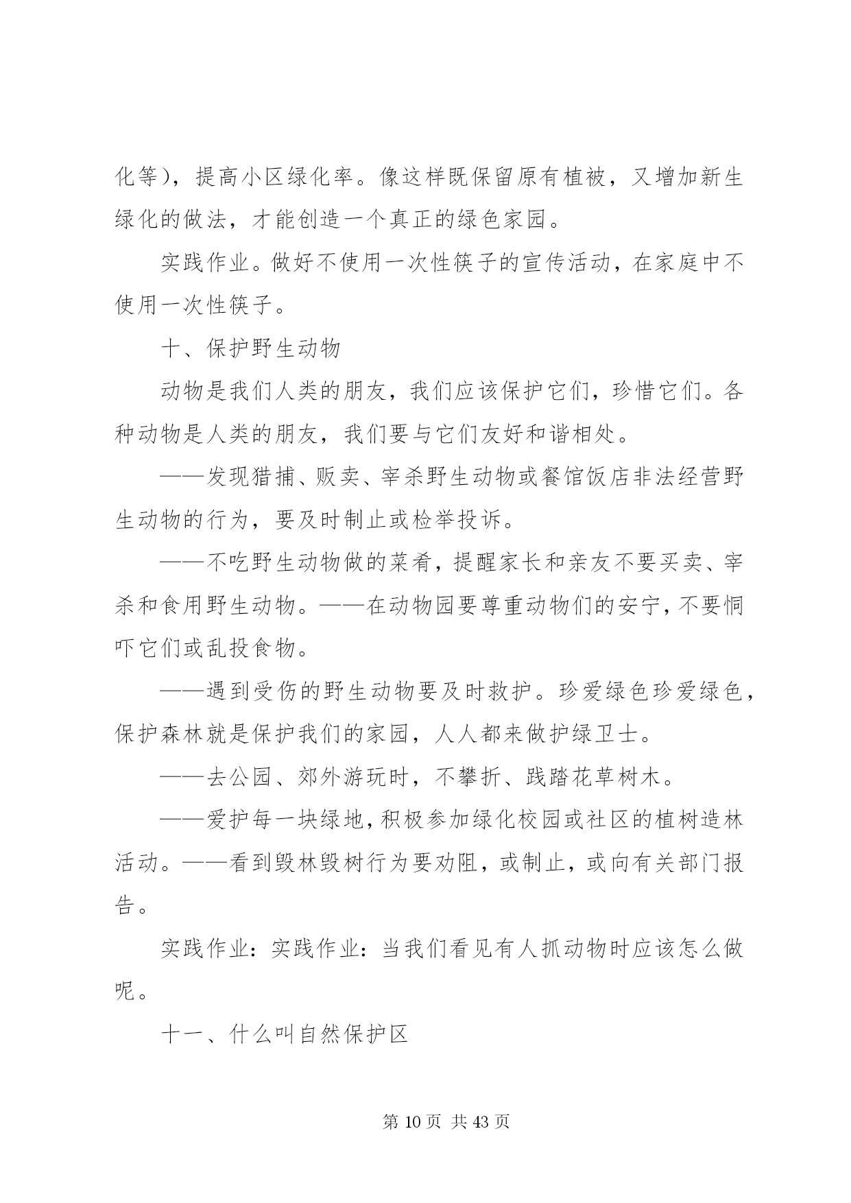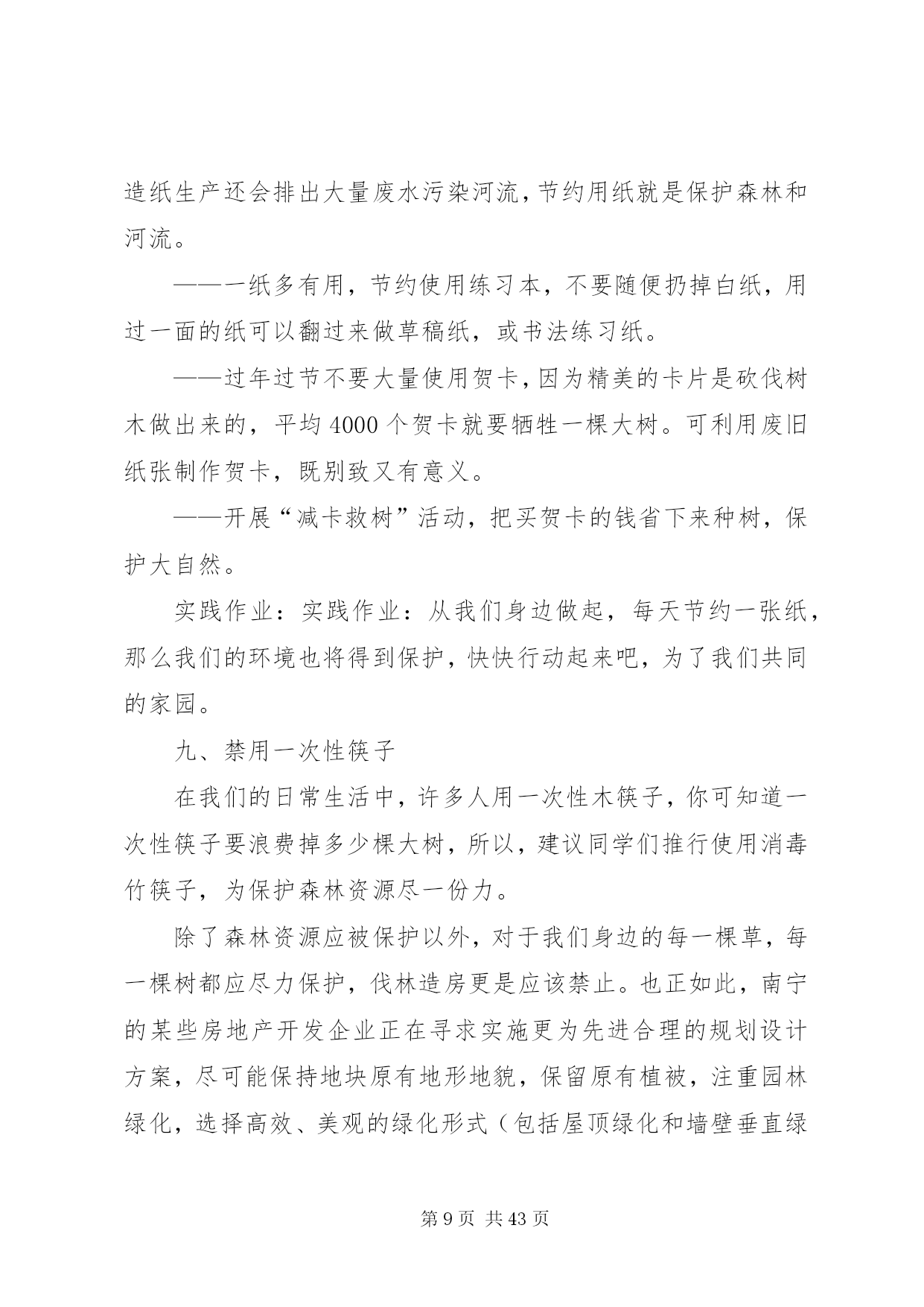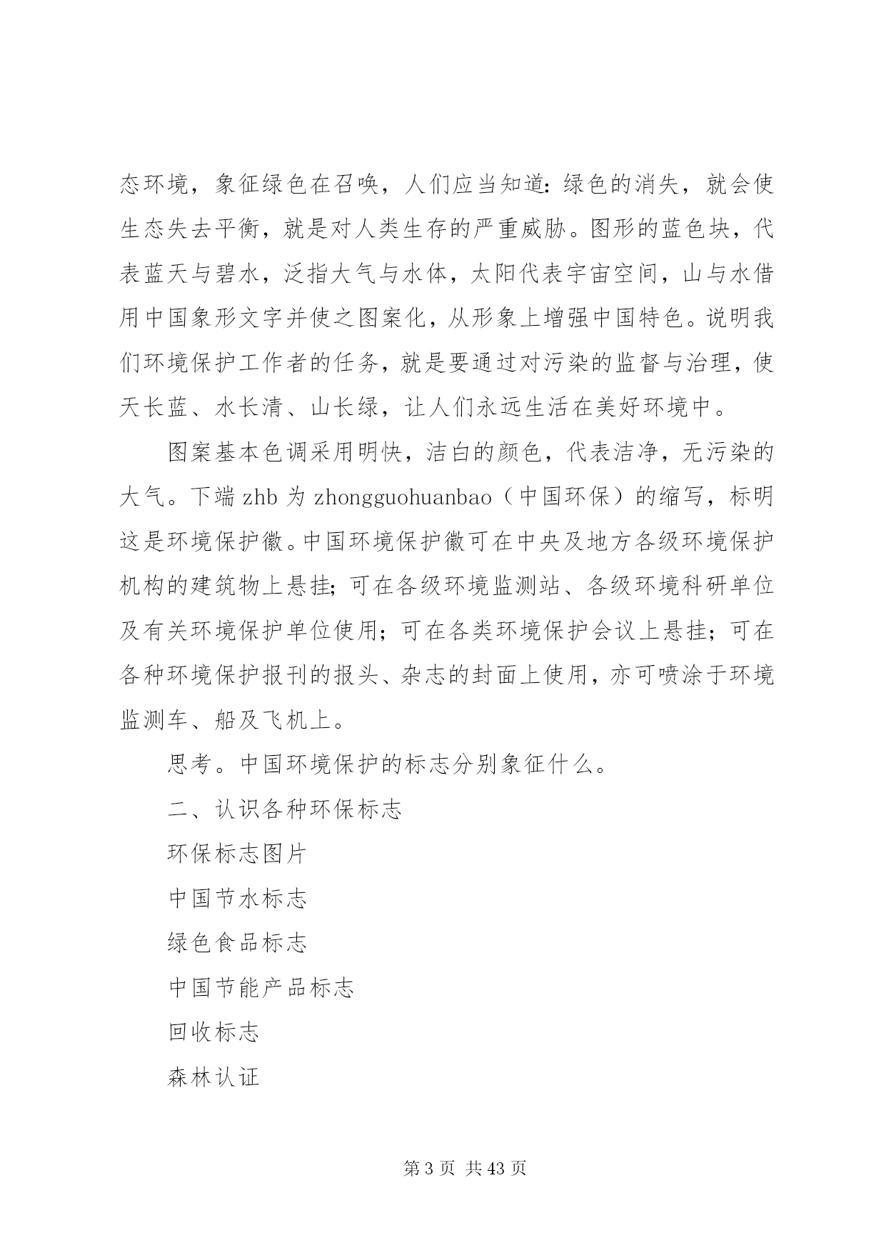 第PAGE\*Arabic\*MERGEFORMAT43页共NUMPAGES\*MERGEFORMAT43页学校本课程教材环保环境问题已经成为当今社会发展的重要问题。建设生态文明已经成为人们的共识。要让所有人知道,今天节约一滴水,留给后人一滴血。没有地球的健康就没有人类的健康。善待地球就是善待人类自己。一起动手,拯救地球,保护环境,追求绿色时尚,拥抱绿色生活,让经济发展的浪潮进入绿色的河道,是社会实现持续发展的必然。要想让人类像爱惜自己的生命一样爱护环境。就要树立环境保护意识,保护生态环境。争做环保公民,让地球远离污染,让绿色走进家园。让绿色看得见。让绿色听得见。让绿色神圣美妙。同花儿一起开放,和小树一起成长。让节约成为时尚,让公益成为风尚。所以环保教育在小学进行是十分必要的。让学生从小树立环保意识,形成环境保护理念并不断付出行动。我们的社会才能向绿色和谐发展。本校本课程讲义主要为学生讲解环保知识,自然界的奥秘等等。介绍每年的地球日、世界环境日和水日、绿色校园的相关知识。让所有的学生从小就成为环境的保护者,绿色家园的守卫者。由于时间仓促,编者水平有限,难免有不当之处,请大家批评指正。本书编写组2017年9月目录我们共同的家园1、中国环境保护徽图案设计2、认识各种环保标志3、你知道日常垃圾如何分类吗4、你家的龙头节水吗。5、绿色节日6、六·五”世界环境日的由来7、什么是地球日8、环保行为——防治噪声9、节约用纸10、禁用一次性筷子11、保护野生动物12、什么叫自然保护区13、什么是海洋污染14、什么是“绿色学校”一、中国环境保护徽图案设计及使用说明中国环境保护徽是中国环境保护的标志,象征地球,说明地球只有一个,这是我们全人类赖以生存的大环境,人们要共同保护它。徽标上端图案基本结构与组合同联合国环境保护徽相近,说明环境保护事业是全球性的,它为全世界所关注。在当今时代,日益恶化的环境告诫人们:环境保护事业与全人类生存休戚相关。上端图案绿色橄榄枝,既代表和平、安宁,又代表一切植物和生态环境,象征绿色在召唤,人们应当知道:绿色的消失,就会使生态失去平衡,就是对人类生存的严重威胁。图形的蓝色块,代表蓝天与碧水,泛指大气与水体,太阳代表宇宙空间,山与水借用中国象形文字并使之图案化,从形象上增强中国特色。说明我们环境保护工作者的任务,就是要通过对污染的监督与治理,使天长蓝、水长清、山长绿,让人们永远生活在美好环境中。图案基本色调采用明快,洁白的颜色,代表洁净,无污染的大气。下端zhb为zhongguohuanbao(中国环保)的缩写,标明这是环境保护徽。中国环境保护徽可在中央及地方各级环境保护机构的建筑物上悬挂;可在各级环境监测站、各级环境科研单位及有关环境保护单位使用;可在各类环境保护会议上悬挂;可在各种环境保护报刊的报头、杂志的封面上使用,亦可喷涂于环境监测车、船及飞机上。思考。中国环境保护的标志分别象征什么。二、认识各种环保标志环保标志图片中国节水标志绿色食品标志中国节能产品标志回收标志森林认证绿色之星有机产品标志无公害农产品标志香港环保标志台湾环保标志你知道下列标志的图片吗。能源之星一般固体废物污水排放口废气排放口噪声排放源图形标志补充污水排放口废气排放口噪声排放源一般固体废物危险废物国际绿色环保标志绿色市场认证标志安全饮品标志绿色环保标志环保协会标志三、你知道日常垃圾如何分类吗。同学们,在我们日常生活中会有许多的垃圾,垃圾的分类收集以及再生(回收)无疑是全民环保的一大举措,但你知道日常垃圾应如何分类吗。环保专家指出日常生活垃圾可分为三类:第一类是有毒、有害垃圾(如废电池等);\第二类是有机垃圾等可降解垃圾;第三类是难降解垃圾(如塑料、金属、玻璃等)。将垃圾分类后,其中有机垃圾经过处理后可用作花木肥料,可再生垃圾可分送有关部门回收使用,其余垃圾封装送交城市垃圾管理部门处理,这才是真正有效和正确的垃圾分类收集,集中处理的方法。实践作业。回家将垃圾进行分类。并将你的做法告诉爸爸、妈实践作业妈让她们共同关注环保,你能做到吗。四、你家的龙头节水吗。水是人类生存的重要条件,节约用水是我们每个公民应尽的义务,随着人们环保意识的增强,各种节水型的用具也应运而生。你可能还不知道,小小的水龙头都有节水型的。除此之外还有低容量的节水型抽水马桶等产品。这些产品帮助我们从生活的细微之处节约用水,保护生态环境——你还不愿追赶这样的潮流吗。实践作业。让我们一起动手画一张节约用水的图画,告诉所有的实践作业人要节约用水。五、绿色节日同学们:在我们的日常生活中,有许多可以纪念的节日,你比如说世界日世界环境日等等,今天老师带你们一起了解一下绿色节日。6月5日世界环境日、2月2日国际湿地日、3月22日世界水日、3月23日世界气象日、4月22日世界