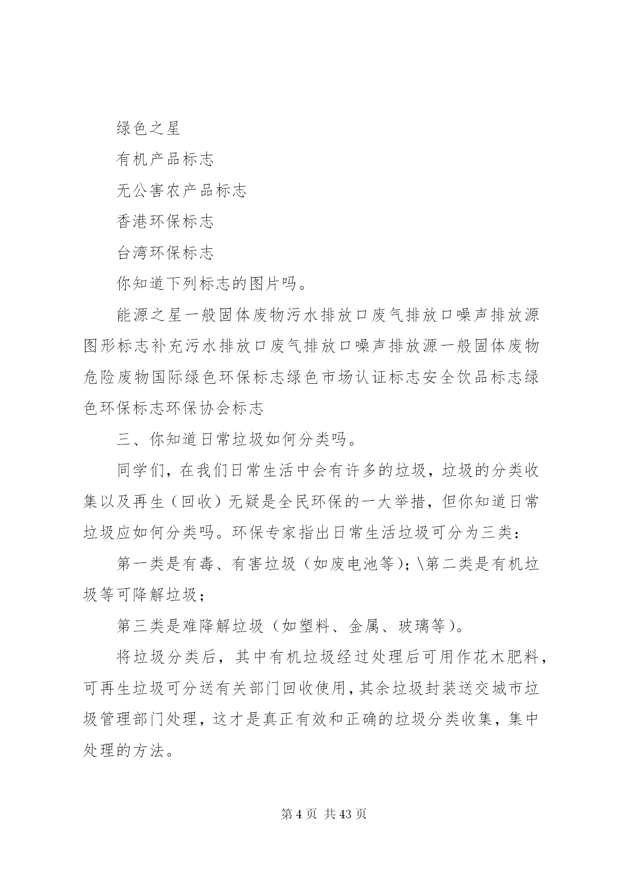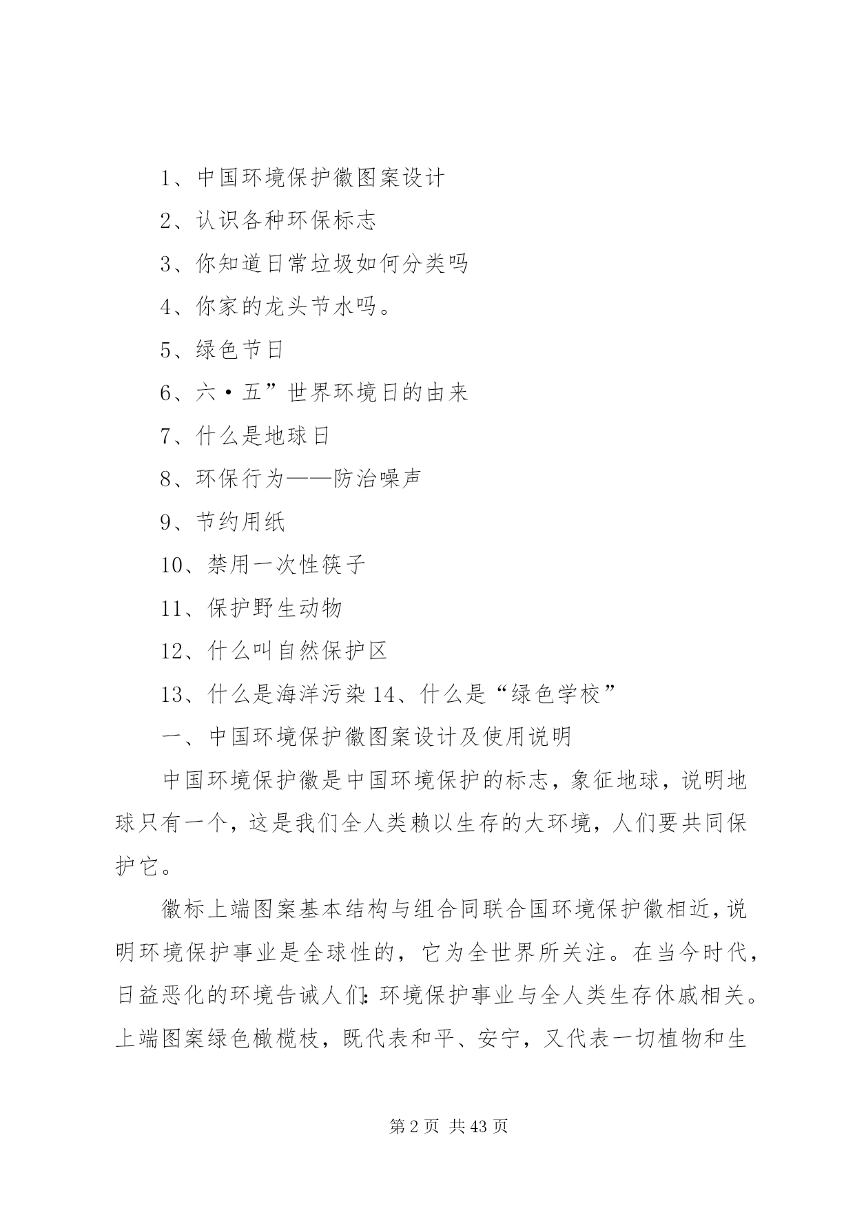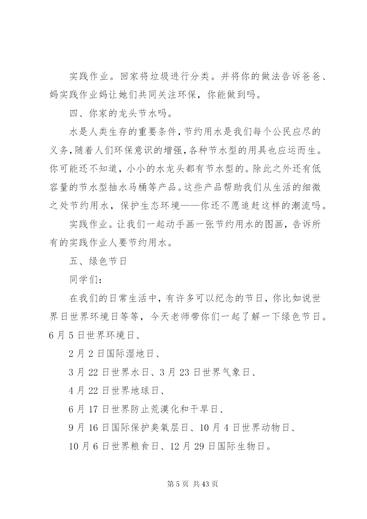 第PAGE\*Arabic\*MERGEFORMAT43页共NUMPAGES\*MERGEFORMAT43页学校本课程教材环保环境问题已经成为当今社会发展的重要问题。建设生态文明已经成为人们的共识。要让所有人知道,今天节约一滴水,留给后人一滴血。没有地球的健康就没有人类的健康。善待地球就是善待人类自己。一起动手,拯救地球,保护环境,追求绿色时尚,拥抱绿色生活,让经济发展的浪潮进入绿色的河道,是社会实现持续发展的必然。要想让人类像爱惜自己的生命一样爱护环境。就要树立环境保护意识,保护生态环境。争做环保公民,让地球远离污染,让绿色走进家园。让绿色看得见。让绿色听得见。让绿色神圣美妙。同花儿一起开放,和小树一起成长。让节约成为时尚,让公益成为风尚。所以环保教育在小学进行是十分必要的。让学生从小树立环保意识,形成环境保护理念并不断付出行动。我们的社会才能向绿色和谐发展。本校本课程讲义主要为学生讲解环保知识,自然界的奥秘等等。介绍每年的地球日、世界环境日和水日、绿色校园的相关知识。让所有的学生从小就成为环境的保护者,绿色家园的守卫者。由于时间仓促,编者水平有限,难免有不当之处,请大家批评指正。本书编写组2017年9月目录我们共同的家园1、中国环境保护徽图案设计2、认识各种环保标志3、你知道日常垃圾如何分类吗4、你家的龙头节水吗。5、绿色节日6、六·五”世界环境日的由来7、什么是地球日8、环保行为——防治噪声9、节约用纸10、禁用一次性筷子11、保护野生动物12、什么叫自然保护区13、什么是海洋污染14、什么是“绿色学校”一、中国环境保护徽图案设计及使用说明中国环境保护徽是中国环境保护的标志,象征地球,说明地球只有一个,这是我们全人类赖以生存的大环境,人们要共同保护它。徽标上端图案基本结构与组合同联合国环境保护徽相近,说明环境保护事业是全球性的,它为全世界所关注。在当今时代,日益恶化的环境告诫人们:环境保护事业与全人类生存休戚相关。上端图案绿色橄榄枝,既代表和平、安宁,又代表一切植物和生态环境,象征绿色在召唤,人们应当知道:绿色的消失,就会使生态失去平衡,就是对人类生存的严重威胁。图形的蓝色块,代表蓝天与碧水,泛指大气与水体,太阳代表宇宙空间,山与水借用中国象形文字并使之图案化,从形象上增强中国特色。说明我们环境保护工作者的任务,就是要通过对污染的监督与治理,使天长蓝、水长清、山长绿,让人们永远生活在美好环境中。图案基本色调采用明快,洁白的颜色,代表洁净,无污染的大气。下端zhb为zhongguohuanbao(中国环保)的缩写,标明这是环境保护徽。中国环境保护徽可在中央及地方各级环境保护机构的建筑物上悬挂;可在各级环境监测站、各级环境科研单位及有关环境保护单位使用;可在各类环境保护会议上悬挂;可在各种环境保护报刊的报头、杂志的封面上使用,亦可喷涂于环境监测车、船及飞机上。思考。中国环境保护的标志分别象征什么。二、认识各种环保标志环保标志图片中国节水标志绿色食品标志中国节能产品标志回收标志森林认证绿色之星有机产品标志无公害农产品标志香港环保标志台湾环保标志你知道下列标志的图片吗。能源之星一般固体废物污水排放口废气排放口噪声排放源图形标志补充污水排放口废气排放口噪声排放源一般固体废物危险废物国际绿色环保标志绿色市场认证标志安全饮品标志绿色环保标志环保协会标志三、你知道日常垃圾如何分类吗。同学们,在我们日常生活中会有许多的垃圾,垃圾的分类收集以及再生(回收)无疑是全民环保的一大举措,但你知道日常垃圾应如何分类吗。环保专家指出日常生活垃圾可分为三类:第一类是有毒、有害垃圾(如废电池等);\第二类是有机垃圾等可降解垃圾;第三类是难降解垃圾(如塑料、金属、玻璃等)。将垃圾分类后,其中有机垃圾经过处理后可用作花木肥料,可再生垃圾可分送有关部门回收使用,其余垃圾封装送交城市垃圾管理部门处理,这才是真正有效和正确的垃圾分类收集,集中处理的方法。实践作业。回家将垃圾进行分类。并将你的做法告诉爸爸、妈实践作业妈让她们共同关注环保,你能做到吗。四、你家的龙头节水吗。水是人类生存的重要条件,节约用水是我们每个公民应尽的义务,随着人们环保意识的增强,各种节水型的用具也应运而生。你可能还不知道,小小的水龙头都有节水型的。除此之外还有低容量的节水型抽水马桶等产品。这些产品帮助我们从生活的细微之处节约用水,保护生态环境——你还不愿追赶这样的潮流吗。实践作业。让我们一起动手画一张节约用水的图画,告诉所有的实践作业人要节约用水。五、绿色节日同学们:在我们的日常生活中,有许多可以纪念的节日,你比如说世界日世界环境日等等,今天老师带你们一起了解一下绿色节日。6月5日世界环境日、2月2日国际湿地日、3月22日世界水日、3月23日世界气象日、4月22日世界