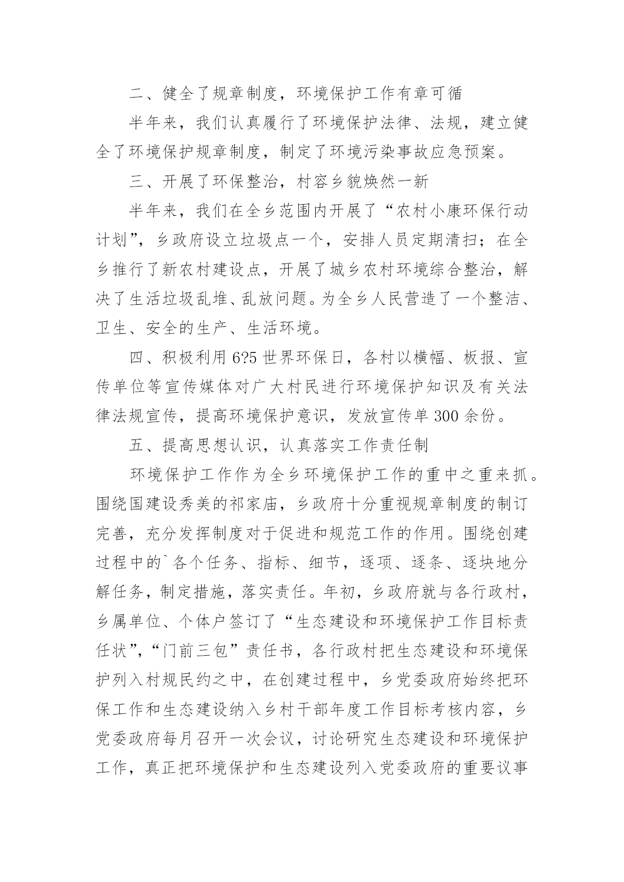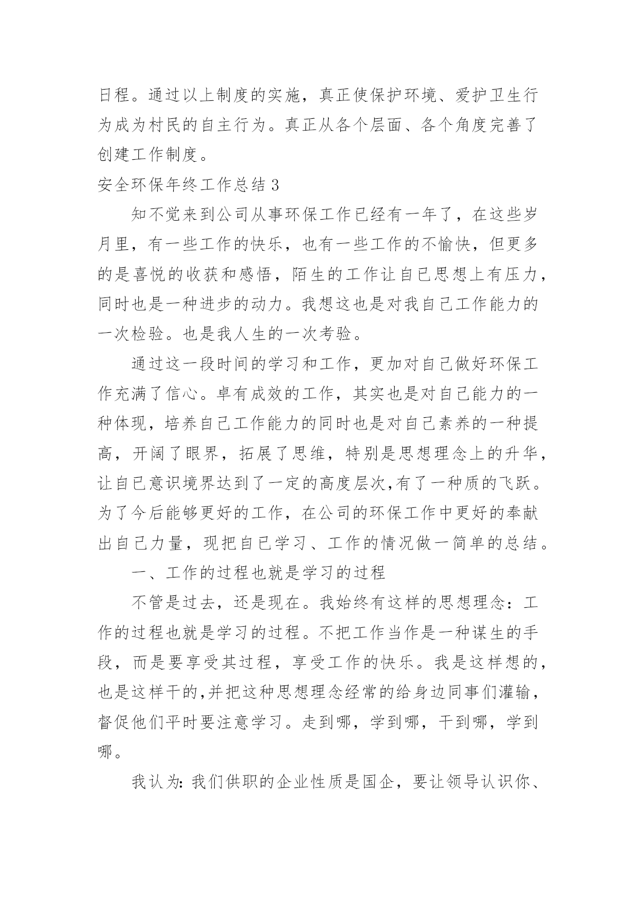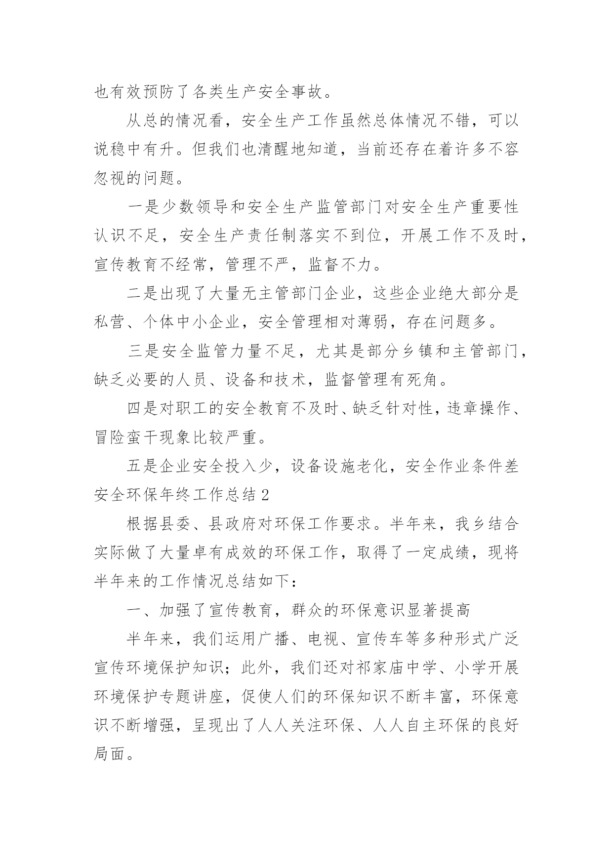 安全环保年终工作总结安全环保年终工作总结8篇总结是事后对某一阶段的学习或工作情况作加以回顾检查并分析评价的书面材料,他能够提升我们的书面表达能力,不如静下心来好好写写总结吧。那么你知道总结如何写吗?下面是小编为大家收集的安全环保年终工作总结,欢迎大家借鉴与参考,希望对大家有所帮助。安全环保年终工作总结120××年来,安全生产工作在政府的正确领导下,各乡镇、行业主管部门各项活动更加深入,安全生产状况有了大幅度的改善,安全形势稳中有升,有效预防了各类生产安全事故,尤其是杜绝了重特大事故发生,为安全稳定和经济发展起到了良好的服务保障作用。一、狠抓了安全生产基础建设和制度建设一是注重并及时抓好了安全生产基础工作。安委会根据国务院和市关于xx年安全生产工作要求,结合实际,年初及时就安全生产各项工作进行了专门研究、协调和安排部署。同时,根据安全生产实际需要,提出把安全生产基础建设作为今年工作重点来抓,明确了安全生产工作目标。二是建立健全了安全生产支撑体系。年初政府专门召开安全生产会议,根据实际情况,及时调整了安全生产委员会机构成员,进一步明确了各成员单位职责;各乡镇、各有关单位也按照要求建立了专人负责的安全生产机构,形成了从上到下比较完善的安全生产管理体制;结合实际,制定和完善了安全事故应急预案,建立了应急救援队伍,构建起安全生产应急救援工作体系;三是制定、完善并实施了安全生产各项制度。从领导到安全生产监管人员、到从业者,政府同各乡镇、局、总公司及中央和市属单位,各乡镇、有关部门都与各类生产经营单位层层签定了安全生产责任书,强化了安全生产重要地位,强化了安全生产的社会监督,初步建立起安全生产长效监管机制。二、加强了安全生产监管队伍建设一是初步建立起全县安全生产管理网络。政府在去年的基础上,又增加了人员,进一步充实了安全生产综合监管力量;各乡镇、主管部门及部分企业设立了专门机构,充实了监管人员力量,建立了覆盖各乡镇、主要企业的专兼职安全员队伍,初步形成了从上到下的安全生产监督管理网络。二是狠抓了监督管理队伍自身建设。采取专门培训、以会代训等各种措施,对安全生产专兼职人员进行及时、严格和有效的教育、培训及管理,提高了监督管理队伍的总体素质。三是引入了竞争激励机制。结合“安康杯”、“文明工地”、定期报告工作和综合考核等实际工作,对专兼职安全生产管理人员进行考核,进一步强化了监督管理工作。三、加强安全生产宣传教育为进一步营造良好的安全生产氛围,我们采取多种形式,加强了安全生产法律法规和安全知识的宣传。除了督促企业搞好经常性宣传教育,还结合6月份的全国安全生产月活动,先后通过举办各种安全生产宣传咨询、法制巡回展览、为企业宣讲安全知识及开办“谈安全”电视访谈,制作“安全管理”、“用电安全”、“机械安全”、“建筑安全”、“消防安全”等安全生产知识试卷并组织职工开展安全知识竞赛,宣传媒体及时进行跟踪宣传报道,在电视台开设“安全生产曝光”栏目等,有力推动了《xxx》的贯彻和落实。据统计,今年接到各类安全举报xx多起,既消除了隐患,也说明了群众对安全工作已经有了较强的认识。四、加强管理人员和从业人员的教育培训一是搞好各级领导、安全生产管理干部及重点生产经营单位主要负责人的培训。今年我们在各乡镇、主管部门对本单位所属干部和企业负责人进行全员教育培训的基础上,还专门组织了领导干部安全生产培训班。通过培训,普遍增强了安全生产意识和抓安全生产的责任感、紧迫感,使各级干部能够学法、知法,熟练运用法律开展工作。二是结合实际加强职工的安全知识培训。加强了对企业进行安全教育培训的执法检查,督促企业按照要求认真搞好上岗前、作业中等环节的安全教育,增强了从业人员的安全素质。三是继续加大了对特种作业人员培训力度。我们把落实持证上岗作为预防事故的重要内容,加大了对违反持证上岗规定的查处,并开办各种培训班xx期,培训特种作业人员xx多名,进一步提高了关键工作岗位人员的安全生产技能。五、认真开展各项安全生产专项整治一是搞好交通安全整治。安办按照计划组织多部门联合行动,及时对客货运输企业和运营车辆及汽车修理企业的安全生产情况进行了认真清理和严格整治。二是对强化了对化学危险品的`专项整治。结合实际,根据各不同时期情况,各职能部门按分工职责,密切协作,联合执法,使专项整治工作取得了良好效果,杜绝了安全事故。三是把非煤矿山作为重点进行综合整治。针对非煤矿山企业采矿点分散的特点,采取了强有力措施,对非煤矿山企业进行清理整顿,关闭拆除了各类不符合条件规定的小矿,并对现有的进行了严管严控,未发生生产安全事故。四是对建筑业进行了安全整治。加强对建筑业的安全监管,强化八项制度的贯彻落实工作,从加大安全投入,健全完善各项安全设施和措施,推进建筑业安全管理规范化工作入手,严肃查处违章指挥、无证上岗、违规