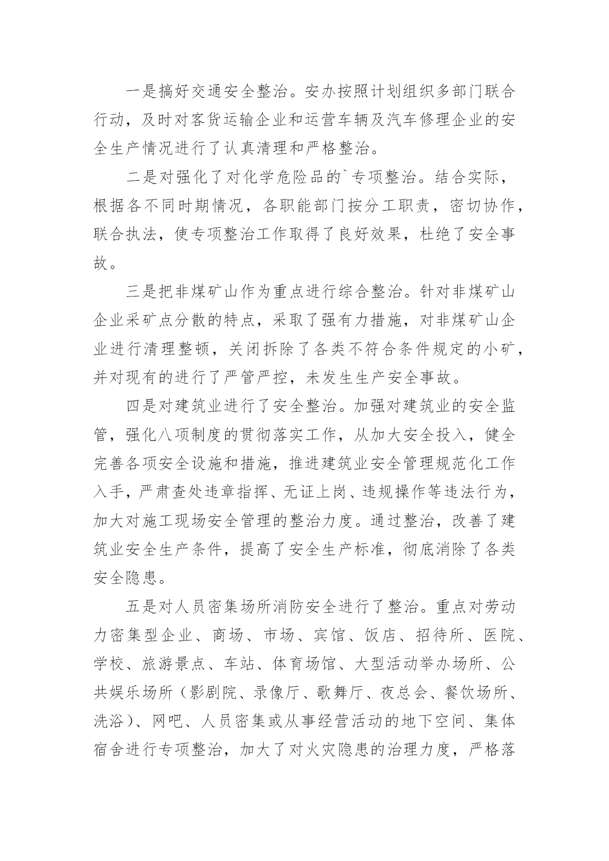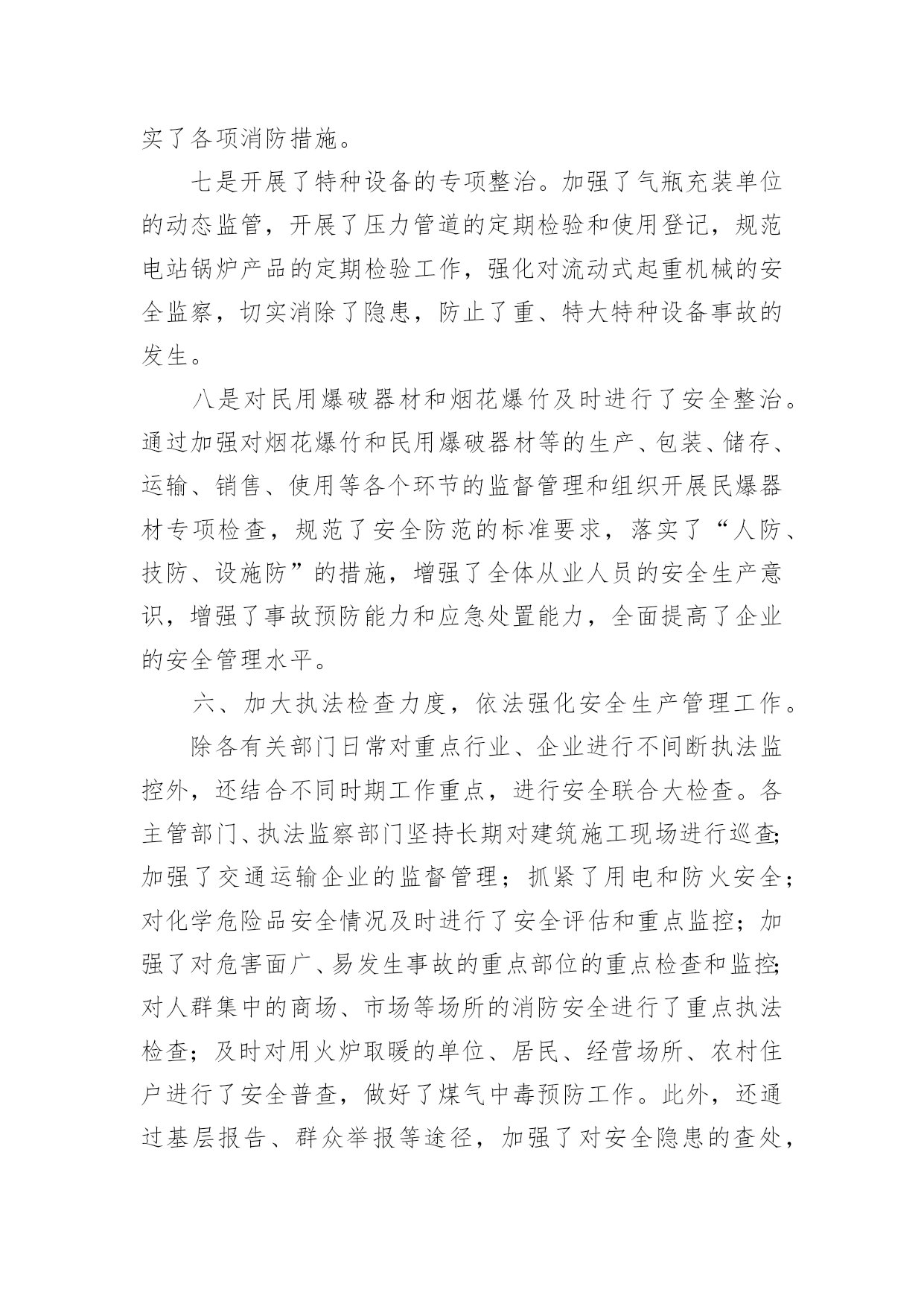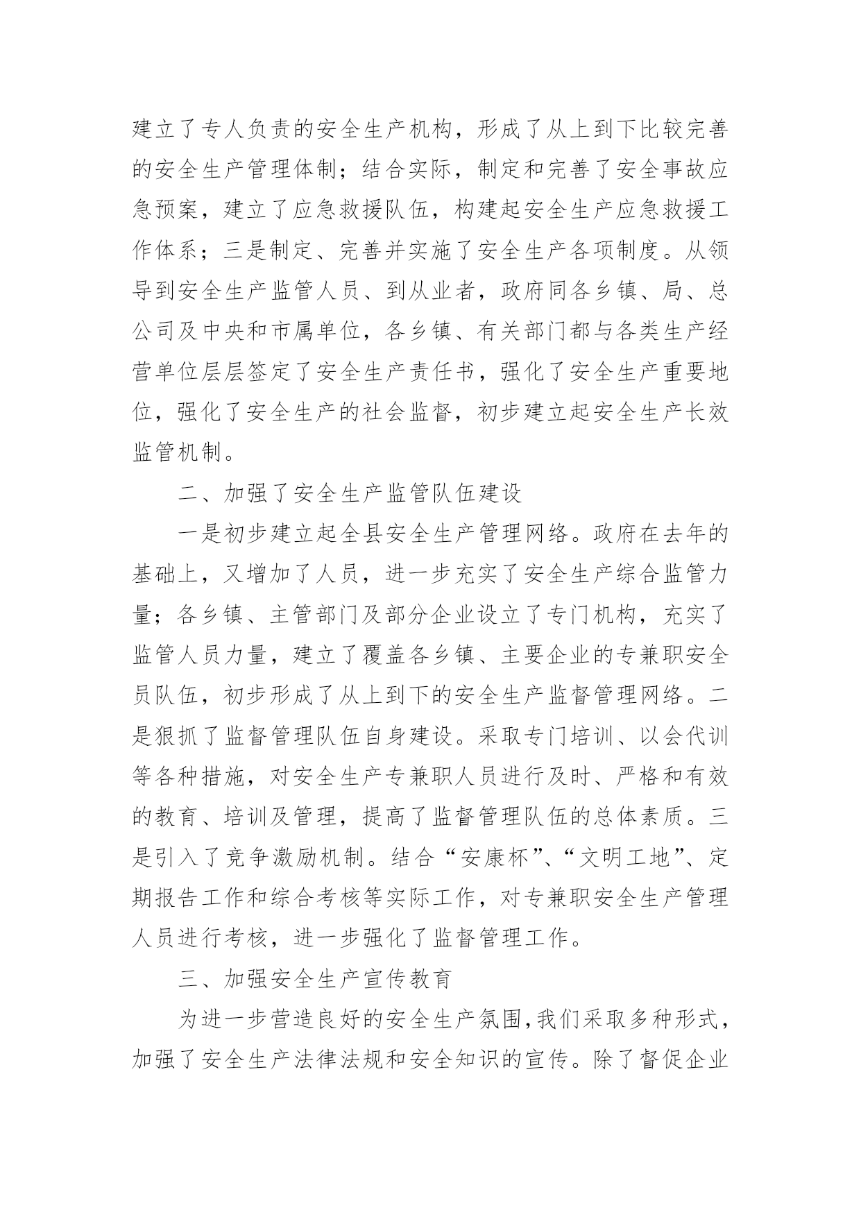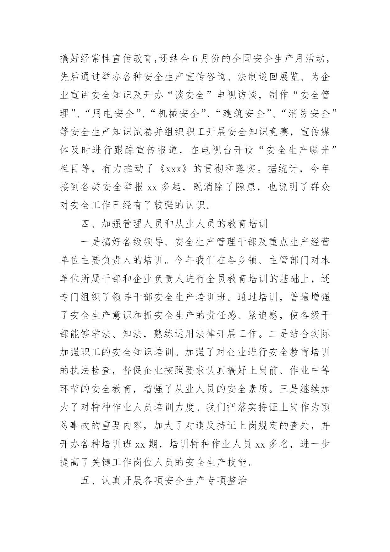 安全环保年终工作总结安全环保年终工作总结8篇总结是事后对某一阶段的学习或工作情况作加以回顾检查并分析评价的书面材料,他能够提升我们的书面表达能力,不如静下心来好好写写总结吧。那么你知道总结如何写吗?下面是小编为大家收集的安全环保年终工作总结,欢迎大家借鉴与参考,希望对大家有所帮助。安全环保年终工作总结120××年来,安全生产工作在政府的正确领导下,各乡镇、行业主管部门各项活动更加深入,安全生产状况有了大幅度的改善,安全形势稳中有升,有效预防了各类生产安全事故,尤其是杜绝了重特大事故发生,为安全稳定和经济发展起到了良好的服务保障作用。一、狠抓了安全生产基础建设和制度建设一是注重并及时抓好了安全生产基础工作。安委会根据国务院和市关于xx年安全生产工作要求,结合实际,年初及时就安全生产各项工作进行了专门研究、协调和安排部署。同时,根据安全生产实际需要,提出把安全生产基础建设作为今年工作重点来抓,明确了安全生产工作目标。二是建立健全了安全生产支撑体系。年初政府专门召开安全生产会议,根据实际情况,及时调整了安全生产委员会机构成员,进一步明确了各成员单位职责;各乡镇、各有关单位也按照要求建立了专人负责的安全生产机构,形成了从上到下比较完善的安全生产管理体制;结合实际,制定和完善了安全事故应急预案,建立了应急救援队伍,构建起安全生产应急救援工作体系;三是制定、完善并实施了安全生产各项制度。从领导到安全生产监管人员、到从业者,政府同各乡镇、局、总公司及中央和市属单位,各乡镇、有关部门都与各类生产经营单位层层签定了安全生产责任书,强化了安全生产重要地位,强化了安全生产的社会监督,初步建立起安全生产长效监管机制。二、加强了安全生产监管队伍建设一是初步建立起全县安全生产管理网络。政府在去年的基础上,又增加了人员,进一步充实了安全生产综合监管力量;各乡镇、主管部门及部分企业设立了专门机构,充实了监管人员力量,建立了覆盖各乡镇、主要企业的专兼职安全员队伍,初步形成了从上到下的安全生产监督管理网络。二是狠抓了监督管理队伍自身建设。采取专门培训、以会代训等各种措施,对安全生产专兼职人员进行及时、严格和有效的教育、培训及管理,提高了监督管理队伍的总体素质。三是引入了竞争激励机制。结合“安康杯”、“文明工地”、定期报告工作和综合考核等实际工作,对专兼职安全生产管理人员进行考核,进一步强化了监督管理工作。三、加强安全生产宣传教育为进一步营造良好的安全生产氛围,我们采取多种形式,加强了安全生产法律法规和安全知识的宣传。除了督促企业搞好经常性宣传教育,还结合6月份的全国安全生产月活动,先后通过举办各种安全生产宣传咨询、法制巡回展览、为企业宣讲安全知识及开办“谈安全”电视访谈,制作“安全管理”、“用电安全”、“机械安全”、“建筑安全”、“消防安全”等安全生产知识试卷并组织职工开展安全知识竞赛,宣传媒体及时进行跟踪宣传报道,在电视台开设“安全生产曝光”栏目等,有力推动了《xxx》的贯彻和落实。据统计,今年接到各类安全举报xx多起,既消除了隐患,也说明了群众对安全工作已经有了较强的认识。四、加强管理人员和从业人员的教育培训一是搞好各级领导、安全生产管理干部及重点生产经营单位主要负责人的培训。今年我们在各乡镇、主管部门对本单位所属干部和企业负责人进行全员教育培训的基础上,还专门组织了领导干部安全生产培训班。通过培训,普遍增强了安全生产意识和抓安全生产的责任感、紧迫感,使各级干部能够学法、知法,熟练运用法律开展工作。二是结合实际加强职工的安全知识培训。加强了对企业进行安全教育培训的执法检查,督促企业按照要求认真搞好上岗前、作业中等环节的安全教育,增强了从业人员的安全素质。三是继续加大了对特种作业人员培训力度。我们把落实持证上岗作为预防事故的重要内容,加大了对违反持证上岗规定的查处,并开办各种培训班xx期,培训特种作业人员xx多名,进一步提高了关键工作岗位人员的安全生产技能。五、认真开展各项安全生产专项整治一是搞好交通安全整治。安办按照计划组织多部门联合行动,及时对客货运输企业和运营车辆及汽车修理企业的安全生产情况进行了认真清理和严格整治。二是对强化了对化学危险品的`专项整治。结合实际,根据各不同时期情况,各职能部门按分工职责,密切协作,联合执法,使专项整治工作取得了良好效果,杜绝了安全事故。三是把非煤矿山作为重点进行综合整治。针对非煤矿山企业采矿点分散的特点,采取了强有力措施,对非煤矿山企业进行清理整顿,关闭拆除了各类不符合条件规定的小矿,并对现有的进行了严管严控,未发生生产安全事故。四是对建筑业进行了安全整治。加强对建筑业的安全监管,强化八项制度的贯彻落实工作,从加大安全投入,健全完善各项安全设施和措施,推进建筑业安全管理规范化工作入手,严肃查处违章指挥、无证上岗、违规