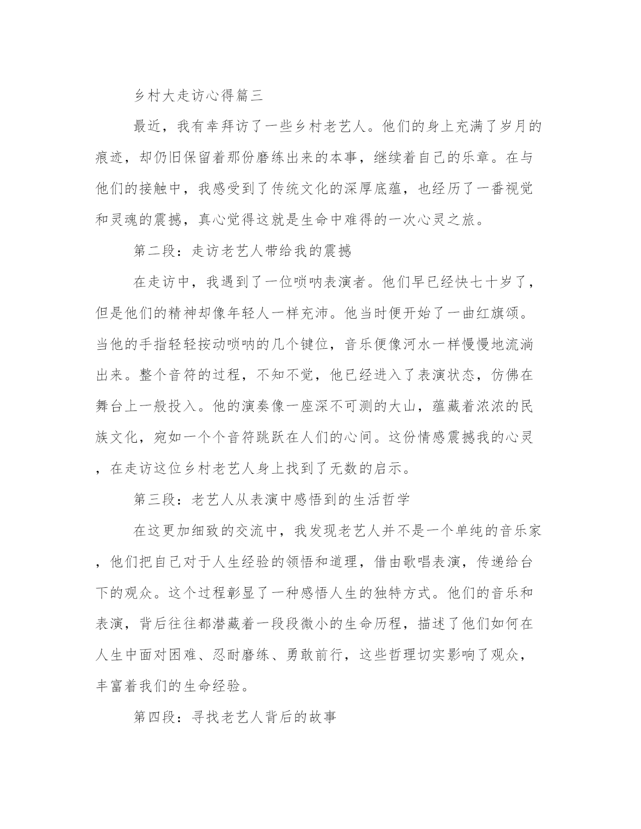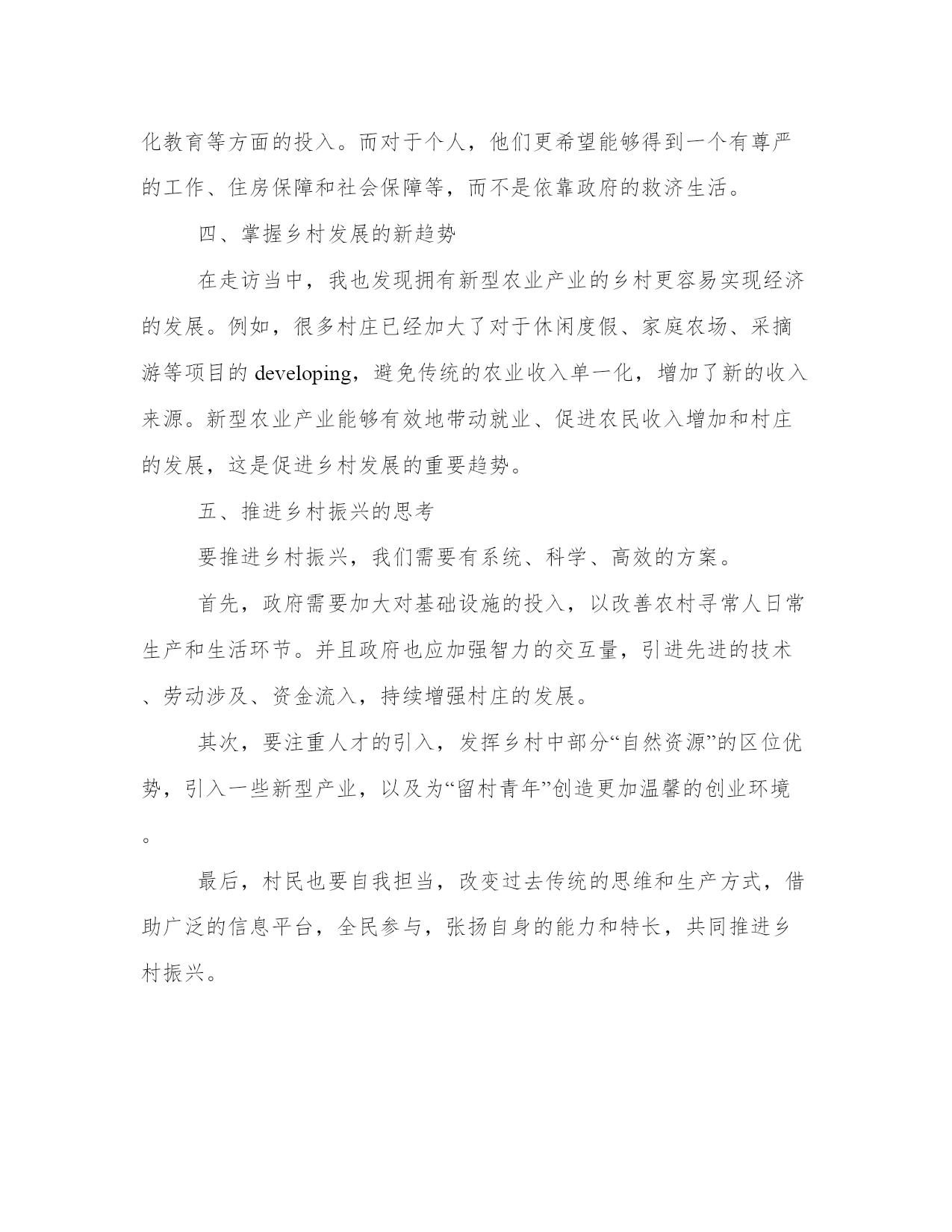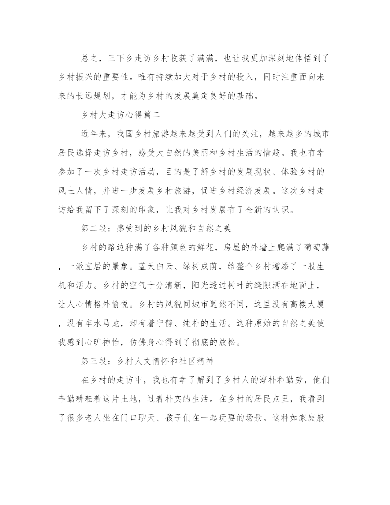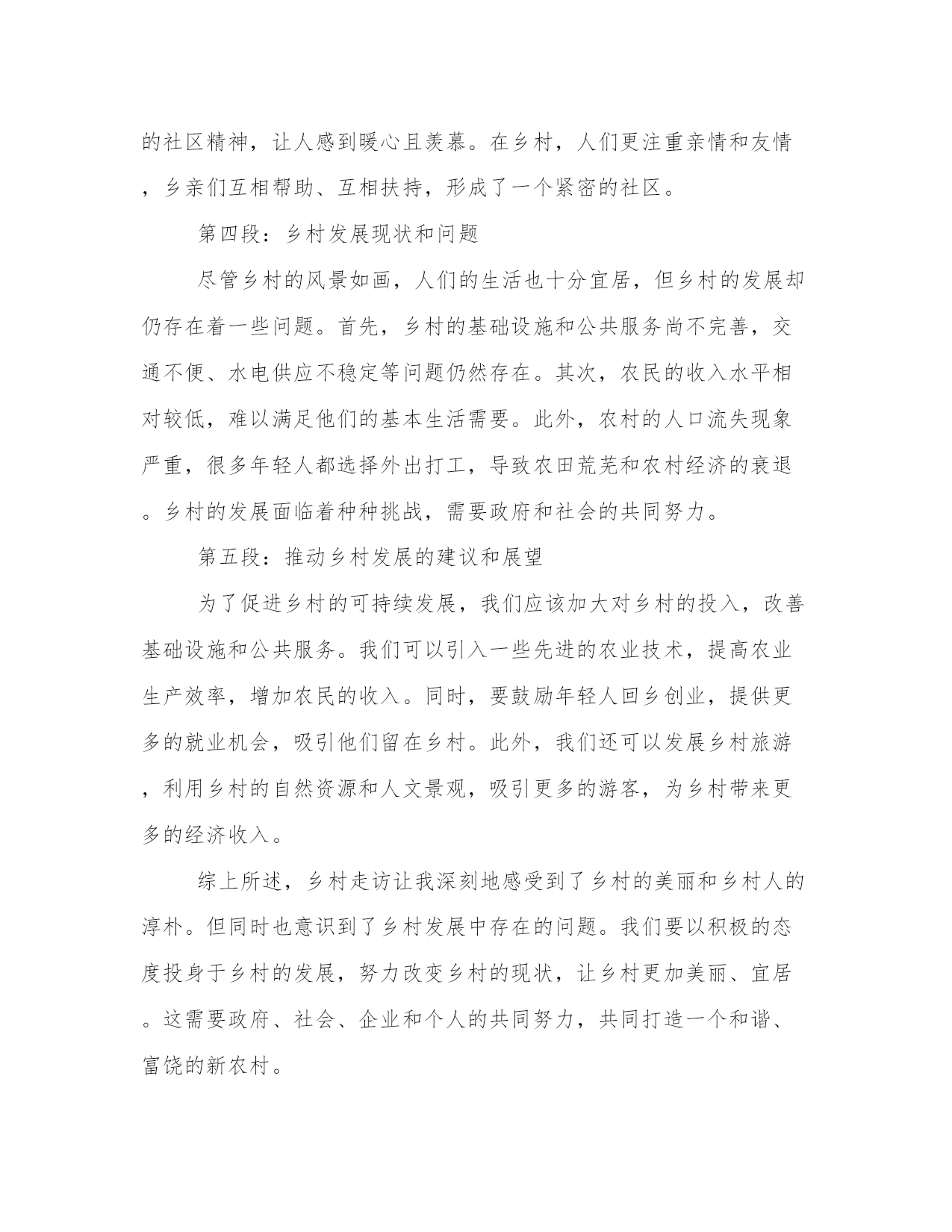 最新乡村大走访心得(模板15篇)阅读是获取信息和知识的重要途径,通过阅读可以拓宽自己的知识面和视野。一个较为完美的总结需要跳出细节,从宏观上概括并指出问题的核心。如果你想了解一些运动比赛的技巧和策略,以下的资料可能会给你一些帮助。乡村大走访心得篇一乡村振兴战略是近年来国家高度重视和推动的一项重大任务。为了加快推进乡村振兴,我省进行了“三下乡”走访乡村的活动。我很荣幸地参加了其中的一次走访活动,收获颇多,感悟良多。接下来,我将分享我的心得和体会。二、认识到乡村存在的问题在走访中,我深刻意识到乡村存在的问题。部分地区农业生产落后,农民收入水平低,乡村基础设施建设滞后,乡村环境污染严重,人口外流加速等问题十分突出。这些问题需要政府加大投入力度,加快改善乡村贫困落后的面貌。同时,我也认为需要引入更多新的职业、新的社会形态,提升乡村的吸引力和活力。三、深入了解群众的需求在走访时,我也深入了解了乡村居民的真实需求。在调研当中,许多村民反映希望政府能够加大对基础设施建设、农业生产技术、文化教育等方面的投入。而对于个人,他们更希望能够得到一个有尊严的工作、住房保障和社会保障等,而不是依靠政府的救济生活。四、掌握乡村发展的新趋势在走访当中,我也发现拥有新型农业产业的乡村更容易实现经济的发展。例如,很多村庄已经加大了对于休闲度假、家庭农场、采摘游等项目的developing,避免传统的农业收入单一化,增加了新的收入来源。新型农业产业能够有效地带动就业、促进农民收入增加和村庄的发展,这是促进乡村发展的重要趋势。五、推进乡村振兴的思考要推进乡村振兴,我们需要有系统、科学、高效的方案。首先,政府需要加大对基础设施的投入,以改善农村寻常人日常生产和生活环节。并且政府也应加强智力的交互量,引进先进的技术、劳动涉及、资金流入,持续增强村庄的发展。其次,要注重人才的引入,发挥乡村中部分“自然资源”的区位优势,引入一些新型产业,以及为“留村青年”创造更加温馨的创业环境。最后,村民也要自我担当,改变过去传统的思维和生产方式,借助广泛的信息平台,全民参与,张扬自身的能力和特长,共同推进乡村振兴。总之,三下乡走访乡村收获了满满,也让我更加深刻地体悟到了乡村振兴的重要性。唯有持续加大对于乡村的投入,同时注重面向未来的长远规划,才能为乡村的发展奠定良好的基础。乡村大走访心得篇二近年来,我国乡村旅游越来越受到人们的关注,越来越多的城市居民选择走访乡村,感受大自然的美丽和乡村生活的情趣。我也有幸参加了一次乡村走访活动,目的是了解乡村的发展现状、体验乡村的风土人情,并进一步发展乡村旅游,促进乡村经济发展。这次乡村走访给我留下了深刻的印象,让我对乡村发展有了全新的认识。第二段:感受到的乡村风貌和自然之美乡村的路边种满了各种颜色的鲜花,房屋的外墙上爬满了葡萄藤,一派宜居的景象。蓝天白云、绿树成荫,给整个乡村增添了一股生机和活力。乡村的空气十分清新,阳光透过树叶的缝隙洒在地面上,让人心情格外愉悦。乡村的风貌同城市迥然不同,这里没有高楼大厦,没有车水马龙,却有着宁静、纯朴的生活。这种原始的自然之美使我感到心旷神怡,仿佛身心得到了彻底的放松。第三段:乡村人文情怀和社区精神在乡村的走访中,我也有幸了解到了乡村人的淳朴和勤劳,他们辛勤耕耘着这片土地,过着朴实的生活。在乡村的居民点里,我看到了很多老人坐在门口聊天、孩子们在一起玩耍的场景。这种如家庭般的社区精神,让人感到暖心且羡慕。在乡村,人们更注重亲情和友情,乡亲们互相帮助、互相扶持,形成了一个紧密的社区。第四段:乡村发展现状和问题尽管乡村的风景如画,人们的生活也十分宜居,但乡村的发展却仍存在着一些问题。首先,乡村的基础设施和公共服务尚不完善,交通不便、水电供应不稳定等问题仍然存在。其次,农民的收入水平相对较低,难以满足他们的基本生活需要。此外,农村的人口流失现象严重,很多年轻人都选择外出打工,导致农田荒芜和农村经济的衰退。乡村的发展面临着种种挑战,需要政府和社会的共同努力。第五段:推动乡村发展的建议和展望为了促进乡村的可持续发展,我们应该加大对乡村的投入,改善基础设施和公共服务。我们可以引入一些先进的农业技术,提高农业生产效率,增加农民的收入。同时,要鼓励年轻人回乡创业,提供更多的就业机会,吸引他们留在乡村。此外,我们还可以发展乡村旅游,利用乡村的自然资源和人文景观,吸引更多的游客,为乡村带来更多的经济收入。综上所述,乡村走访让我深刻地感受到了乡村的美丽和乡村人的淳朴。但同时也意识到了乡村发展中存在的问题。我们要以积极的态度投身于乡村的发展,努力改变乡村的现状,让乡村更加美丽、宜居。这需要政府、社会、企业和个人的共同努力,共同打造一个和谐、富饶的新农村。乡村大走访心得篇三最近,我有幸