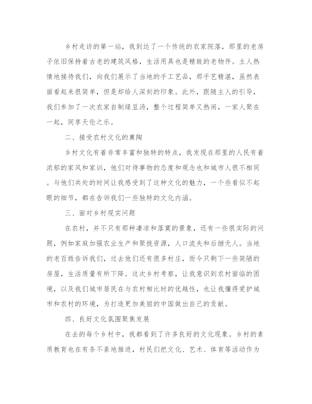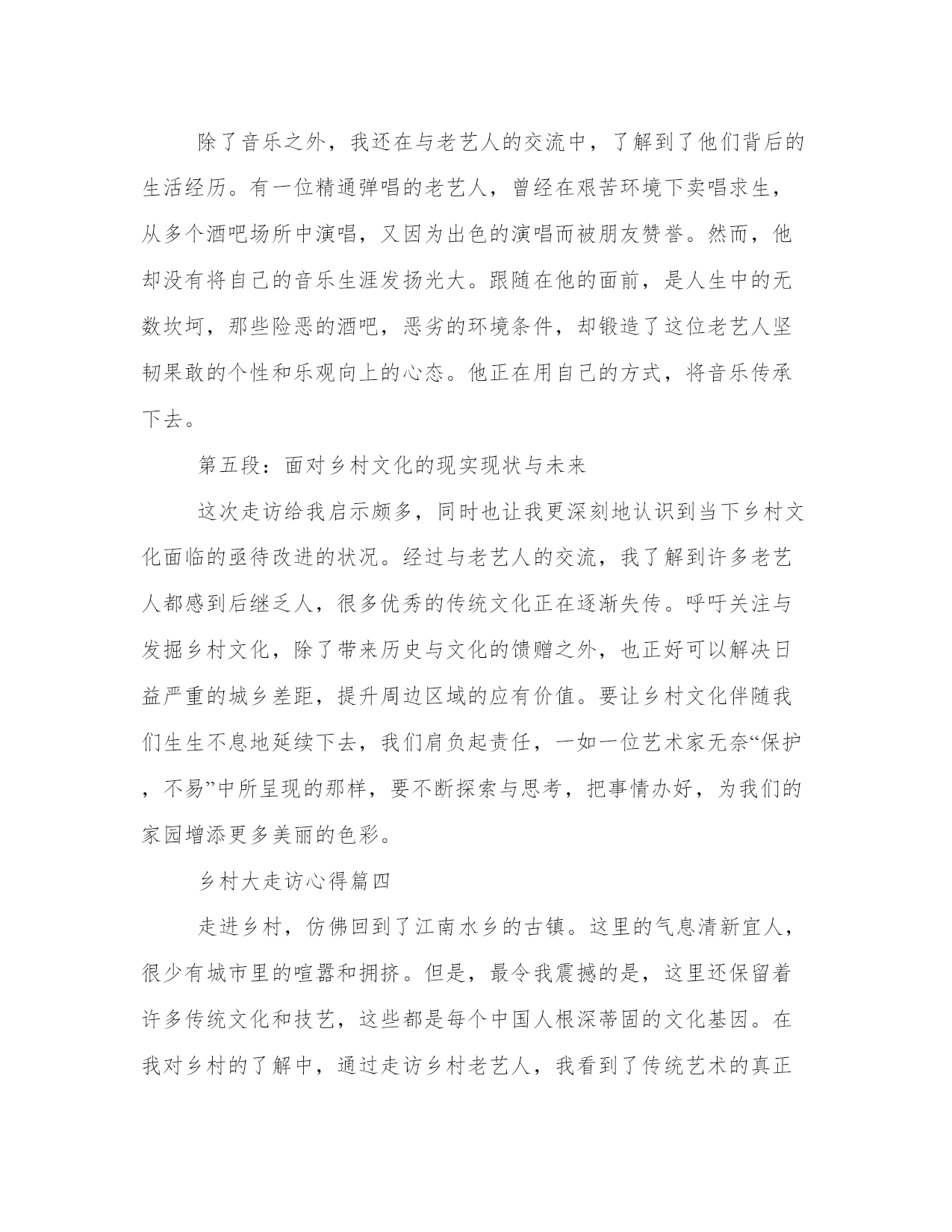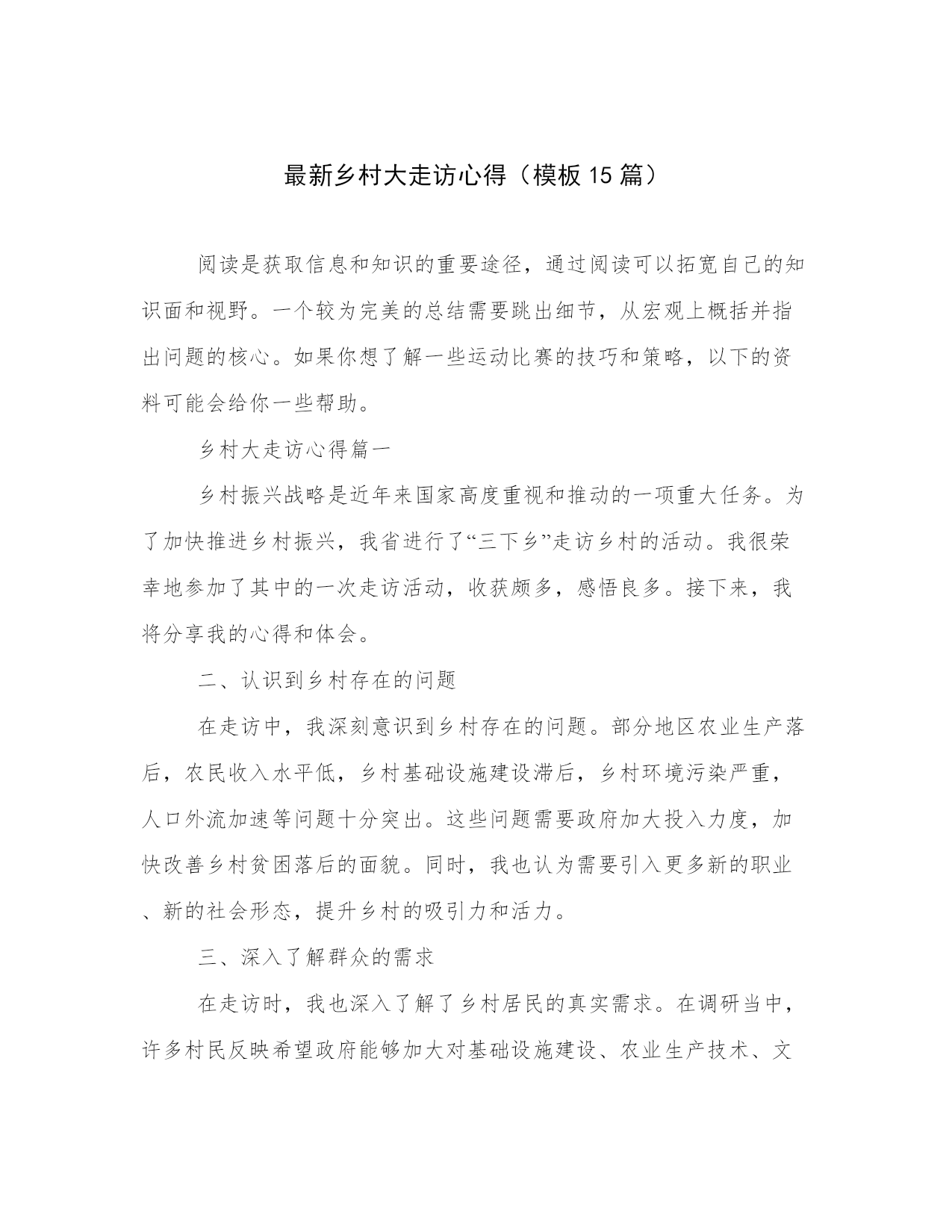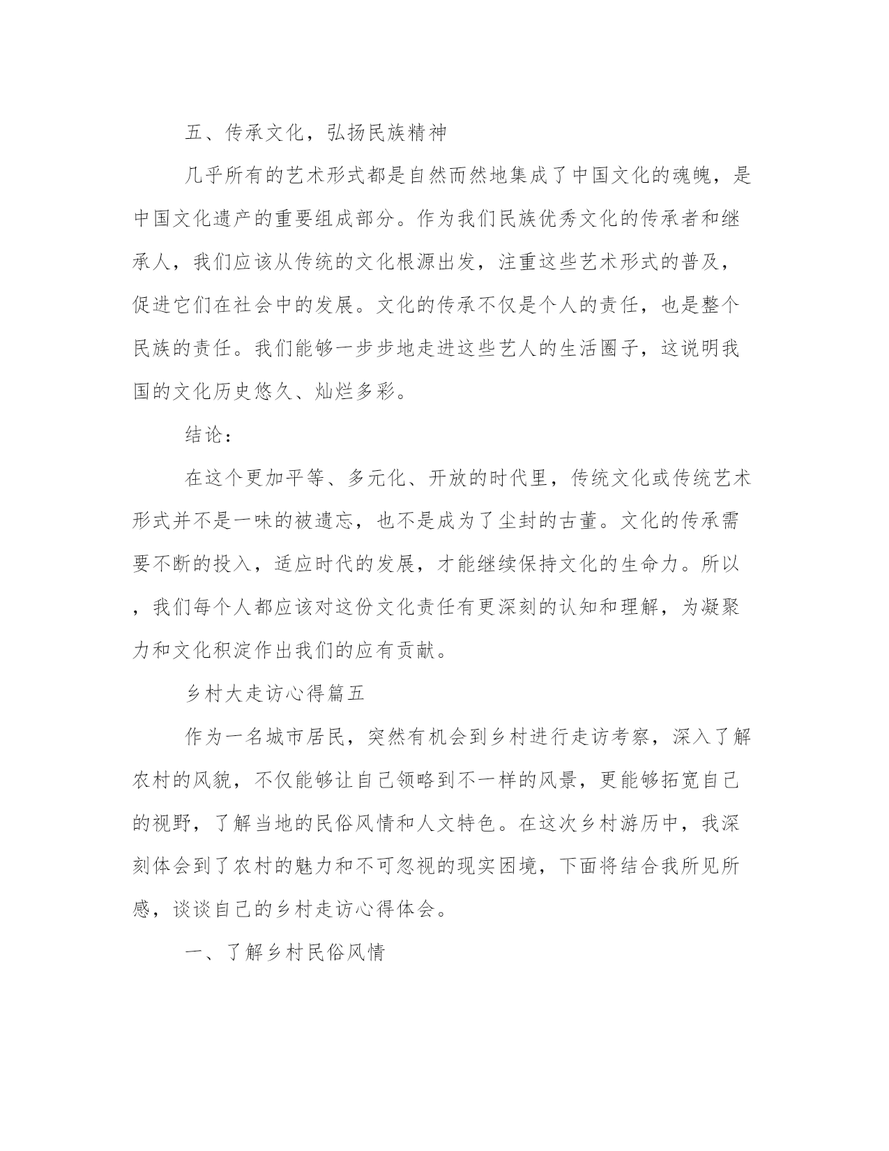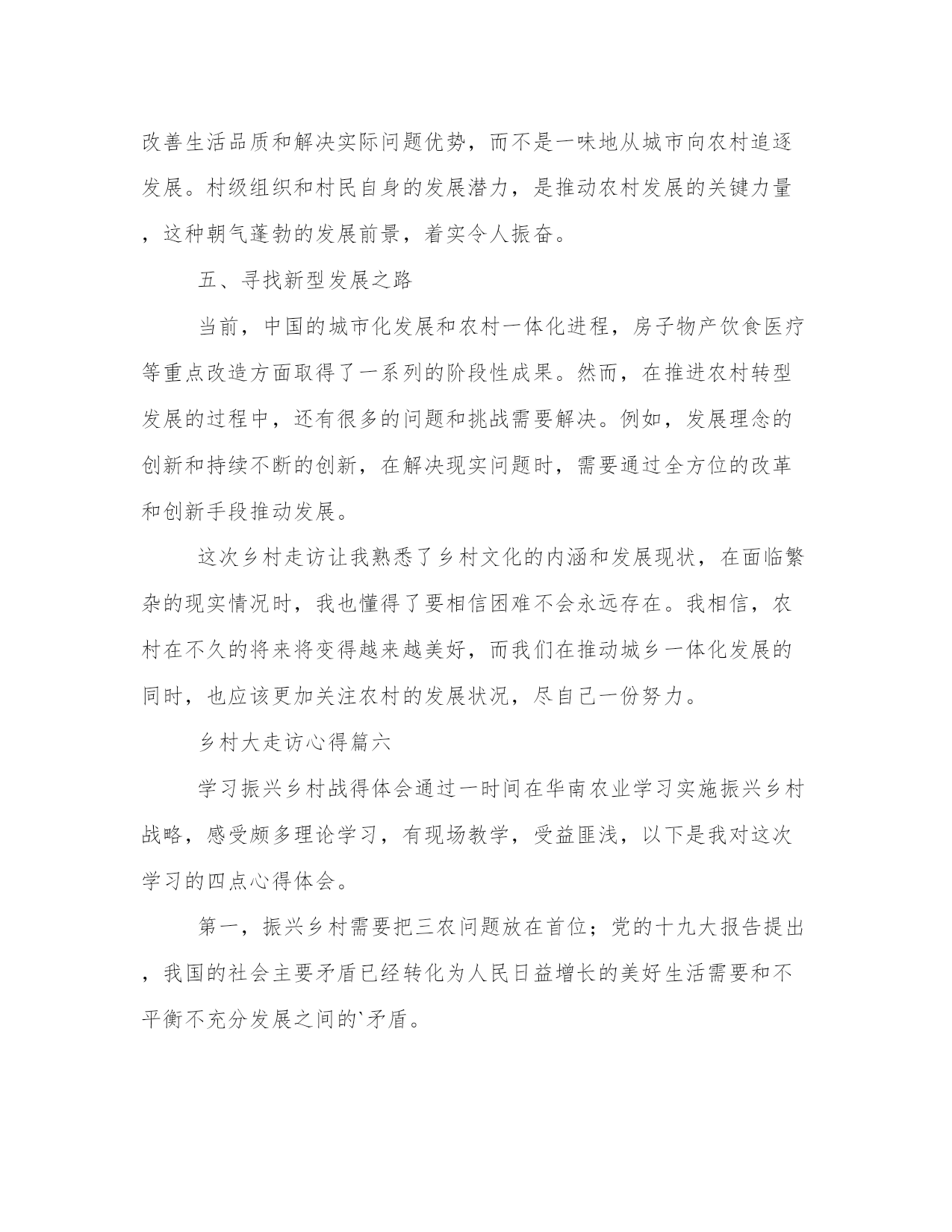 最新乡村大走访心得(模板15篇)阅读是获取信息和知识的重要途径,通过阅读可以拓宽自己的知识面和视野。一个较为完美的总结需要跳出细节,从宏观上概括并指出问题的核心。如果你想了解一些运动比赛的技巧和策略,以下的资料可能会给你一些帮助。乡村大走访心得篇一乡村振兴战略是近年来国家高度重视和推动的一项重大任务。为了加快推进乡村振兴,我省进行了“三下乡”走访乡村的活动。我很荣幸地参加了其中的一次走访活动,收获颇多,感悟良多。接下来,我将分享我的心得和体会。二、认识到乡村存在的问题在走访中,我深刻意识到乡村存在的问题。部分地区农业生产落后,农民收入水平低,乡村基础设施建设滞后,乡村环境污染严重,人口外流加速等问题十分突出。这些问题需要政府加大投入力度,加快改善乡村贫困落后的面貌。同时,我也认为需要引入更多新的职业、新的社会形态,提升乡村的吸引力和活力。三、深入了解群众的需求在走访时,我也深入了解了乡村居民的真实需求。在调研当中,许多村民反映希望政府能够加大对基础设施建设、农业生产技术、文化教育等方面的投入。而对于个人,他们更希望能够得到一个有尊严的工作、住房保障和社会保障等,而不是依靠政府的救济生活。四、掌握乡村发展的新趋势在走访当中,我也发现拥有新型农业产业的乡村更容易实现经济的发展。例如,很多村庄已经加大了对于休闲度假、家庭农场、采摘游等项目的developing,避免传统的农业收入单一化,增加了新的收入来源。新型农业产业能够有效地带动就业、促进农民收入增加和村庄的发展,这是促进乡村发展的重要趋势。五、推进乡村振兴的思考要推进乡村振兴,我们需要有系统、科学、高效的方案。首先,政府需要加大对基础设施的投入,以改善农村寻常人日常生产和生活环节。并且政府也应加强智力的交互量,引进先进的技术、劳动涉及、资金流入,持续增强村庄的发展。其次,要注重人才的引入,发挥乡村中部分“自然资源”的区位优势,引入一些新型产业,以及为“留村青年”创造更加温馨的创业环境。最后,村民也要自我担当,改变过去传统的思维和生产方式,借助广泛的信息平台,全民参与,张扬自身的能力和特长,共同推进乡村振兴。总之,三下乡走访乡村收获了满满,也让我更加深刻地体悟到了乡村振兴的重要性。唯有持续加大对于乡村的投入,同时注重面向未来的长远规划,才能为乡村的发展奠定良好的基础。乡村大走访心得篇二近年来,我国乡村旅游越来越受到人们的关注,越来越多的城市居民选择走访乡村,感受大自然的美丽和乡村生活的情趣。我也有幸参加了一次乡村走访活动,目的是了解乡村的发展现状、体验乡村的风土人情,并进一步发展乡村旅游,促进乡村经济发展。这次乡村走访给我留下了深刻的印象,让我对乡村发展有了全新的认识。第二段:感受到的乡村风貌和自然之美乡村的路边种满了各种颜色的鲜花,房屋的外墙上爬满了葡萄藤,一派宜居的景象。蓝天白云、绿树成荫,给整个乡村增添了一股生机和活力。乡村的空气十分清新,阳光透过树叶的缝隙洒在地面上,让人心情格外愉悦。乡村的风貌同城市迥然不同,这里没有高楼大厦,没有车水马龙,却有着宁静、纯朴的生活。这种原始的自然之美使我感到心旷神怡,仿佛身心得到了彻底的放松。第三段:乡村人文情怀和社区精神在乡村的走访中,我也有幸了解到了乡村人的淳朴和勤劳,他们辛勤耕耘着这片土地,过着朴实的生活。在乡村的居民点里,我看到了很多老人坐在门口聊天、孩子们在一起玩耍的场景。这种如家庭般的社区精神,让人感到暖心且羡慕。在乡村,人们更注重亲情和友情,乡亲们互相帮助、互相扶持,形成了一个紧密的社区。第四段:乡村发展现状和问题尽管乡村的风景如画,人们的生活也十分宜居,但乡村的发展却仍存在着一些问题。首先,乡村的基础设施和公共服务尚不完善,交通不便、水电供应不稳定等问题仍然存在。其次,农民的收入水平相对较低,难以满足他们的基本生活需要。此外,农村的人口流失现象严重,很多年轻人都选择外出打工,导致农田荒芜和农村经济的衰退。乡村的发展面临着种种挑战,需要政府和社会的共同努力。第五段:推动乡村发展的建议和展望为了促进乡村的可持续发展,我们应该加大对乡村的投入,改善基础设施和公共服务。我们可以引入一些先进的农业技术,提高农业生产效率,增加农民的收入。同时,要鼓励年轻人回乡创业,提供更多的就业机会,吸引他们留在乡村。此外,我们还可以发展乡村旅游,利用乡村的自然资源和人文景观,吸引更多的游客,为乡村带来更多的经济收入。综上所述,乡村走访让我深刻地感受到了乡村的美丽和乡村人的淳朴。但同时也意识到了乡村发展中存在的问题。我们要以积极的态度投身于乡村的发展,努力改变乡村的现状,让乡村更加美丽、宜居。这需要政府、社会、企业和个人的共同努力,共同打造一个和谐、富饶的新农村。乡村大走访心得篇三最近,我有幸