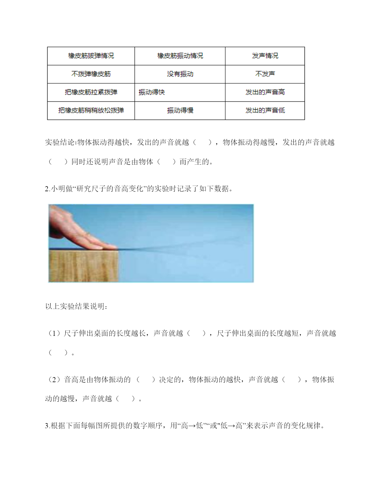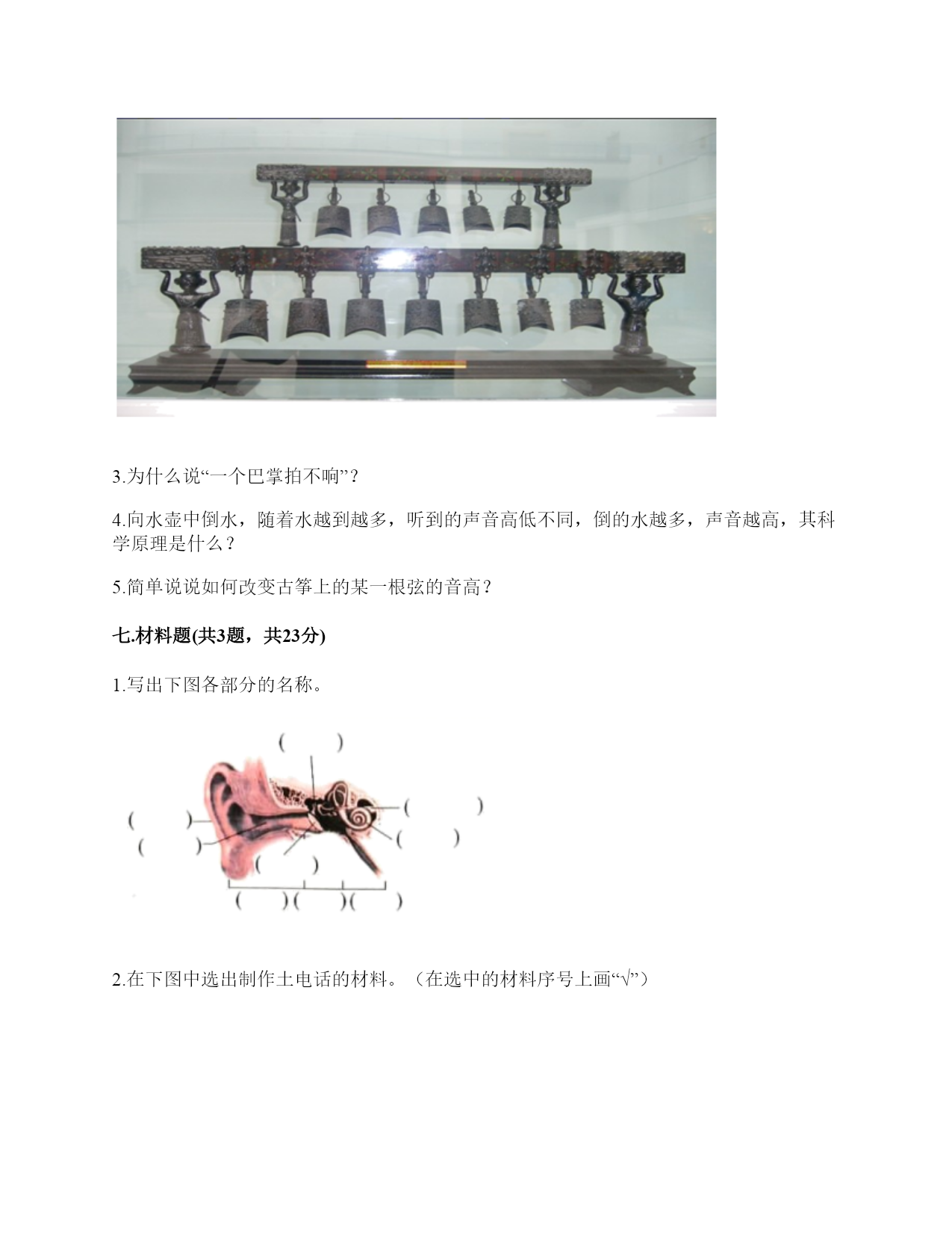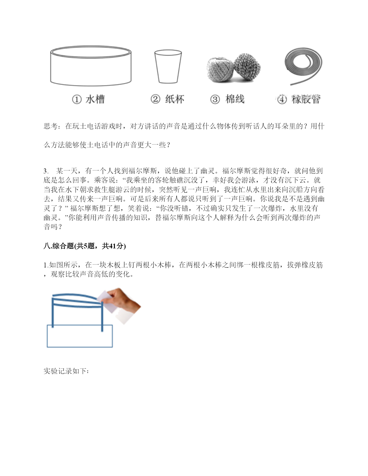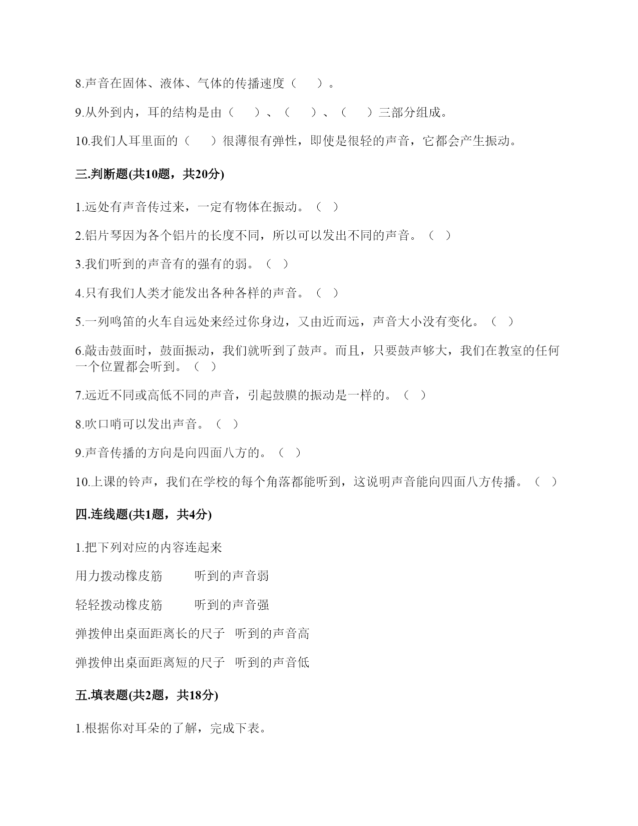 小学科学《声音》练习题一.选择题(共10题,共20分)1.流水的声音是由()。A.水的振动产生的B.空气的振动产生的C.岩石的振动产生的2.上课铃声响起,校园内各个地方的同学都能听到铃声,这不能说明的是()。A.声音能向四面八方传播B.空气能传播声音C.声音在空气中的传播能力比固体中强3.下列说法正确的是()。A.用手拍打墙面,可以听到声音,但没看到墙在振动,说明发声时不一定要振动B.老师讲课的声音是通过空气传播到我们耳朵的C.声音能在气体、固体中传播,不能在液体中传播4.下列关于声音说法正确的是()。A.声音可以在真空中传播B.声音可以在气体、液体和固体中向各个方向传播C.声音传播中遇到墙壁的阻挡就停止传播D.声音在水中比在空气中传播速度慢5.如图是我国古代的乐器编钟,用小锤敲击它们,会发出悦耳的声音。我们发现,当小锤敲击时,越小的编钟发出的声音()。A.越高B.越强C.越低6.将钢尺伸出桌边一部分,固定桌面的部分。手压下桌边外的钢尺并让尺滑过,手刚滑过时,看到尺()。A.越远离桌边越模糊不清B.每个部分都看得清晰C.伸出桌边越远越清晰7.声音在下列哪种物质中传播是最快的()。A.空气B.水C.钢铁D.木头8.在探索尺子音高变化的实验中,把钢尺伸出桌面不同的长度,用相同的力拨动时可以听到不同音高的声音。通过观察发现,下列因素会影响尺子音高变化的是()。A.振动幅度B.振动快慢C.两者都不是9.在实验中,抽掉玻璃钟罩内的空气使铃声慢慢变弱,证明了()。A.空气不能传声B.声音传播与空气无关C.空气能传声10.小明在调试自己的橡皮筋琴时发现有一根橡皮筋声音太低了,他应该()。A.将这根橡皮筋调紧一些B.将这根橡皮筋调松一些C.用力弹二.填空题(共10题,共48分)1.乐器发出高低不同的声音的原理是物体振动得越快,发出的声音();物体铜动得越慢,发出的声音()。2.声音的高低与发声物体的长短、()等因素有关。3.我们周围的声音可以分为()、()和()三种。4.轻轻拨动钢尺,钢尺振动的(),它发出的声音()。用力拨动钢尺,钢尺振动的幅度()它发出的声音()。声音的强弱和物体()有关。物体振动的幅度越大,声音越();物体振动的幅度越小,声音越()。5.声音的高低和物体振动的()有关。6.用不同的力度敲击同一个音叉,用力小时发出的声音(),用力大时发出的声音()。7.周围的声音根据()的不同,可以分为动物的()、自然界的)()、人类生产生活发出的声音。8.声音在固体、液体、气体的传播速度()。9.从外到内,耳的结构是由()、()、()三部分组成。10.我们人耳里面的()很薄很有弹性,即使是很轻的声音,它都会产生振动。三.判断题(共10题,共20分)1.远处有声音传过来,一定有物体在振动。()2.铝片琴因为各个铝片的长度不同,所以可以发出不同的声音。()3.我们听到的声音有的强有的弱。()4.只有我们人类才能发出各种各样的声音。()5.一列鸣笛的火车自远处来经过你身边,又由近而远,声音大小没有变化。()6.敲击鼓面时,鼓面振动,我们就听到了鼓声。而且,只要鼓声够大,我们在教室的任何一个位置都会听到。()7.远近不同或高低不同的声音,引起鼓膜的振动是一样的。()8.吹口哨可以发出声音。()9.声音传播的方向是向四面八方的。()10.上课的铃声,我们在学校的每个角落都能听到,这说明声音能向四面八方传播。()四.连线题(共1题,共4分)1.把下列对应的内容连起来用力拨动橡皮筋听到的声音弱轻轻拨动橡皮筋听到的声音强弹拨伸出桌面距离长的尺子听到的声音高弹拨伸出桌面距离短的尺子听到的声音低五.填表题(共2题,共18分)1.根据你对耳朵的了解,完成下表。2.探究尺子发出声音的音高变化实验记录表。六.简答题(共5题,共25分)1.声音在传播的过程中借助了什么物质?2.编钟上悬挂的是铜器。用木槌击打铜器。请你判断铜器发出的声音有什么不同?3.为什么说“一个巴掌拍不响”?4.向水壶中倒水,随着水越到越多,听到的声音高低不同,倒的水越多,声音越高,其科学原理是什么?5.简单说说如何改变古筝上的某一根弦的音高?七.材料题(共3题,共23分)1.写出下图各部分的名称。2.在下图中选出制作土电话的材料。(在选中的材料序号上画“√”)思考:在玩土电话游戏时,对方讲话的声音是通过什么物体传到听话人的耳朵里的?用什么方法能够使土电话中的声音更大一些?3.某一天,有一个人找到福尔摩斯,说他碰上了幽灵。福尔摩斯觉得很好奇,就问他到底是怎么回事。乘客说:“我乘坐的客轮触礁沉没了,幸好我会游泳,才没有沉下云。就当我在水下朝求救生艇游