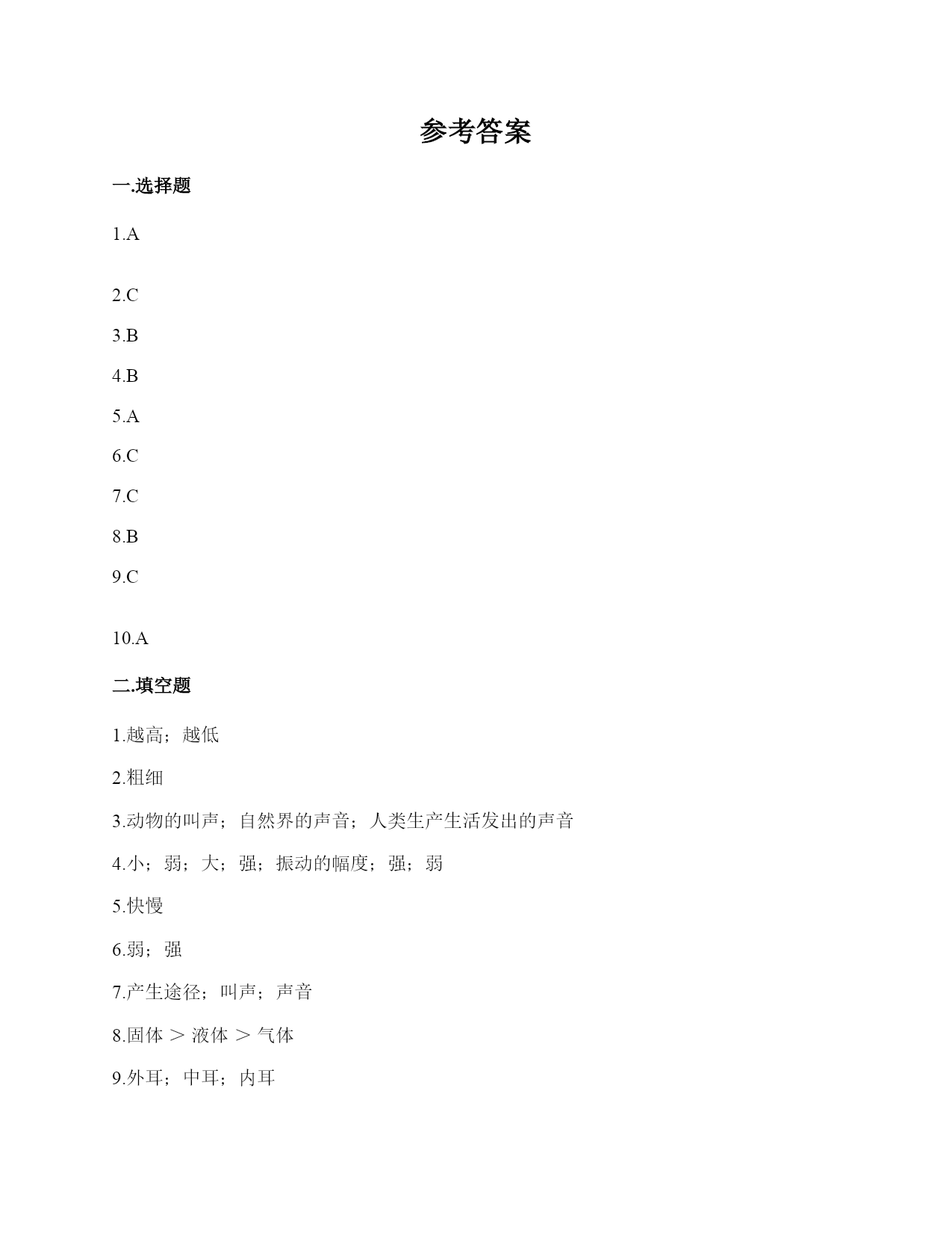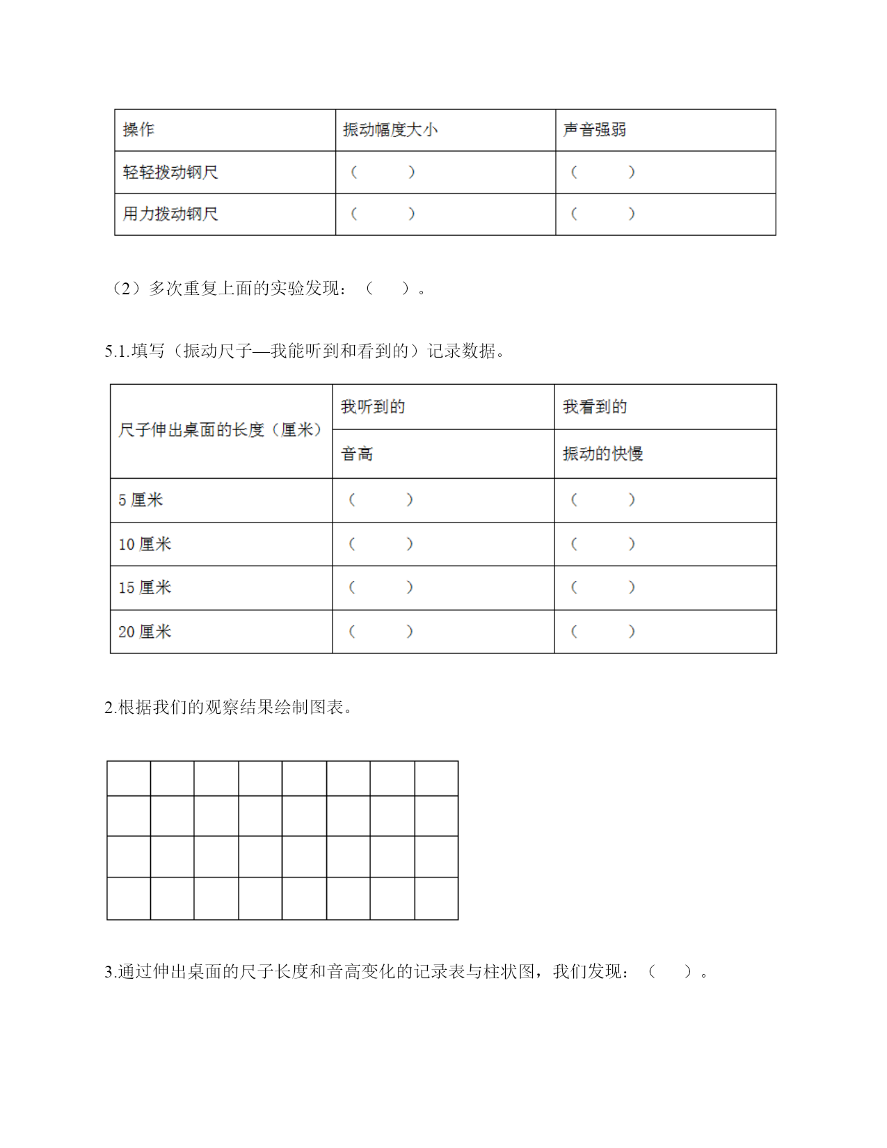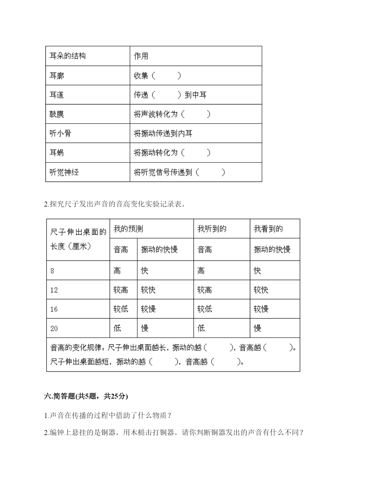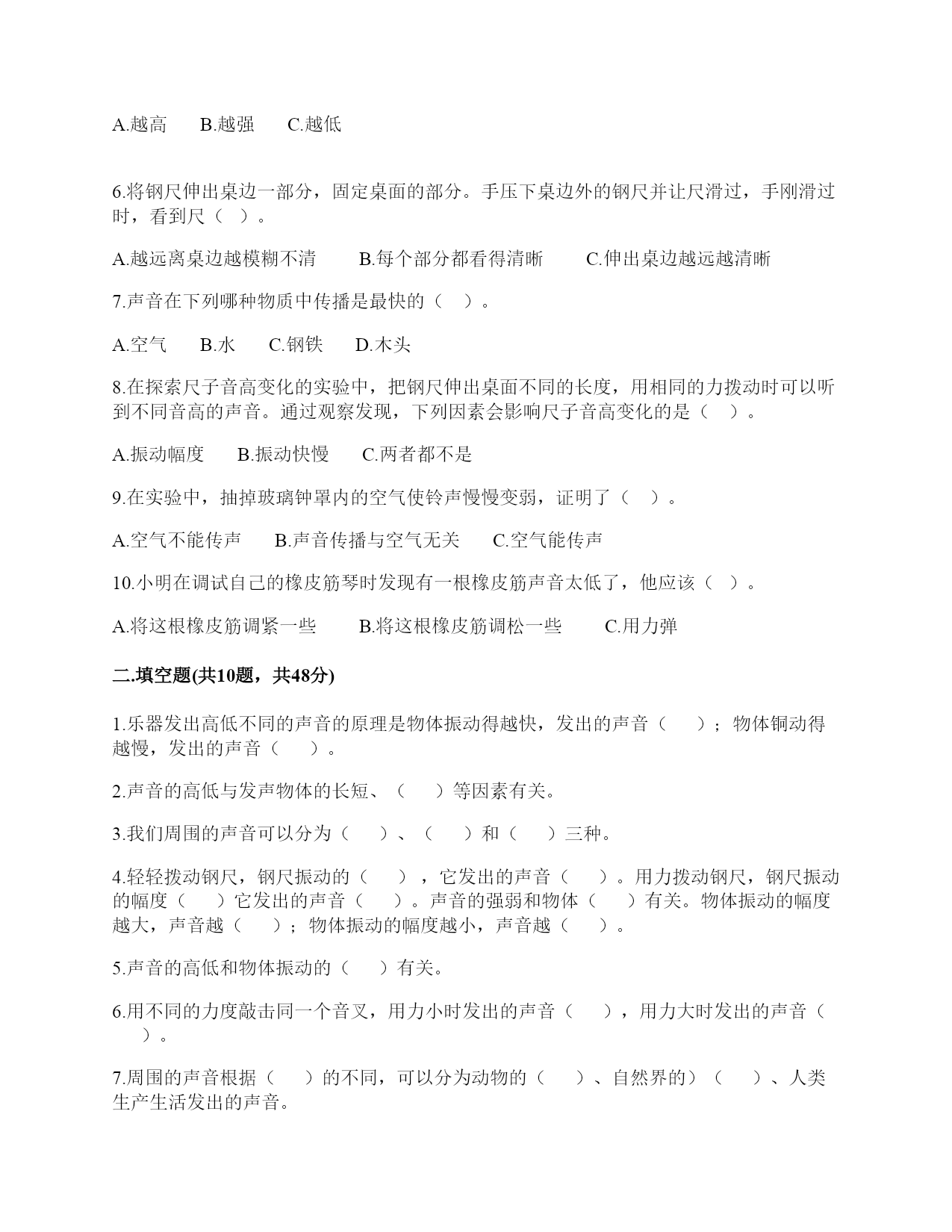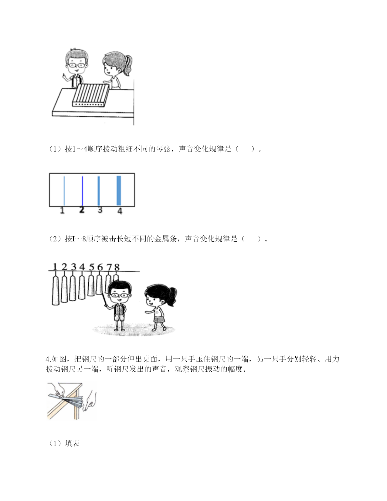 小学科学《声音》练习题一.选择题(共10题,共20分)1.流水的声音是由()。A.水的振动产生的B.空气的振动产生的C.岩石的振动产生的2.上课铃声响起,校园内各个地方的同学都能听到铃声,这不能说明的是()。A.声音能向四面八方传播B.空气能传播声音C.声音在空气中的传播能力比固体中强3.下列说法正确的是()。A.用手拍打墙面,可以听到声音,但没看到墙在振动,说明发声时不一定要振动B.老师讲课的声音是通过空气传播到我们耳朵的C.声音能在气体、固体中传播,不能在液体中传播4.下列关于声音说法正确的是()。A.声音可以在真空中传播B.声音可以在气体、液体和固体中向各个方向传播C.声音传播中遇到墙壁的阻挡就停止传播D.声音在水中比在空气中传播速度慢5.如图是我国古代的乐器编钟,用小锤敲击它们,会发出悦耳的声音。我们发现,当小锤敲击时,越小的编钟发出的声音()。A.越高B.越强C.越低6.将钢尺伸出桌边一部分,固定桌面的部分。手压下桌边外的钢尺并让尺滑过,手刚滑过时,看到尺()。A.越远离桌边越模糊不清B.每个部分都看得清晰C.伸出桌边越远越清晰7.声音在下列哪种物质中传播是最快的()。A.空气B.水C.钢铁D.木头8.在探索尺子音高变化的实验中,把钢尺伸出桌面不同的长度,用相同的力拨动时可以听到不同音高的声音。通过观察发现,下列因素会影响尺子音高变化的是()。A.振动幅度B.振动快慢C.两者都不是9.在实验中,抽掉玻璃钟罩内的空气使铃声慢慢变弱,证明了()。A.空气不能传声B.声音传播与空气无关C.空气能传声10.小明在调试自己的橡皮筋琴时发现有一根橡皮筋声音太低了,他应该()。A.将这根橡皮筋调紧一些B.将这根橡皮筋调松一些C.用力弹二.填空题(共10题,共48分)1.乐器发出高低不同的声音的原理是物体振动得越快,发出的声音();物体铜动得越慢,发出的声音()。2.声音的高低与发声物体的长短、()等因素有关。3.我们周围的声音可以分为()、()和()三种。4.轻轻拨动钢尺,钢尺振动的(),它发出的声音()。用力拨动钢尺,钢尺振动的幅度()它发出的声音()。声音的强弱和物体()有关。物体振动的幅度越大,声音越();物体振动的幅度越小,声音越()。5.声音的高低和物体振动的()有关。6.用不同的力度敲击同一个音叉,用力小时发出的声音(),用力大时发出的声音()。7.周围的声音根据()的不同,可以分为动物的()、自然界的)()、人类生产生活发出的声音。8.声音在固体、液体、气体的传播速度()。9.从外到内,耳的结构是由()、()、()三部分组成。10.我们人耳里面的()很薄很有弹性,即使是很轻的声音,它都会产生振动。三.判断题(共10题,共20分)1.远处有声音传过来,一定有物体在振动。()2.铝片琴因为各个铝片的长度不同,所以可以发出不同的声音。()3.我们听到的声音有的强有的弱。()4.只有我们人类才能发出各种各样的声音。()5.一列鸣笛的火车自远处来经过你身边,又由近而远,声音大小没有变化。()6.敲击鼓面时,鼓面振动,我们就听到了鼓声。而且,只要鼓声够大,我们在教室的任何一个位置都会听到。()7.远近不同或高低不同的声音,引起鼓膜的振动是一样的。()8.吹口哨可以发出声音。()9.声音传播的方向是向四面八方的。()10.上课的铃声,我们在学校的每个角落都能听到,这说明声音能向四面八方传播。()四.连线题(共1题,共4分)1.把下列对应的内容连起来用力拨动橡皮筋听到的声音弱轻轻拨动橡皮筋听到的声音强弹拨伸出桌面距离长的尺子听到的声音高弹拨伸出桌面距离短的尺子听到的声音低五.填表题(共2题,共18分)1.根据你对耳朵的了解,完成下表。2.探究尺子发出声音的音高变化实验记录表。六.简答题(共5题,共25分)1.声音在传播的过程中借助了什么物质?2.编钟上悬挂的是铜器。用木槌击打铜器。请你判断铜器发出的声音有什么不同?3.为什么说“一个巴掌拍不响”?4.向水壶中倒水,随着水越到越多,听到的声音高低不同,倒的水越多,声音越高,其科学原理是什么?5.简单说说如何改变古筝上的某一根弦的音高?七.材料题(共3题,共23分)1.写出下图各部分的名称。2.在下图中选出制作土电话的材料。(在选中的材料序号上画“√”)思考:在玩土电话游戏时,对方讲话的声音是通过什么物体传到听话人的耳朵里的?用什么方法能够使土电话中的声音更大一些?3.某一天,有一个人找到福尔摩斯,说他碰上了幽灵。福尔摩斯觉得很好奇,就问他到底是怎么回事。乘客说:“我乘坐的客轮触礁沉没了,幸好我会游泳,才没有沉下云。就当我在水下朝求救生艇游