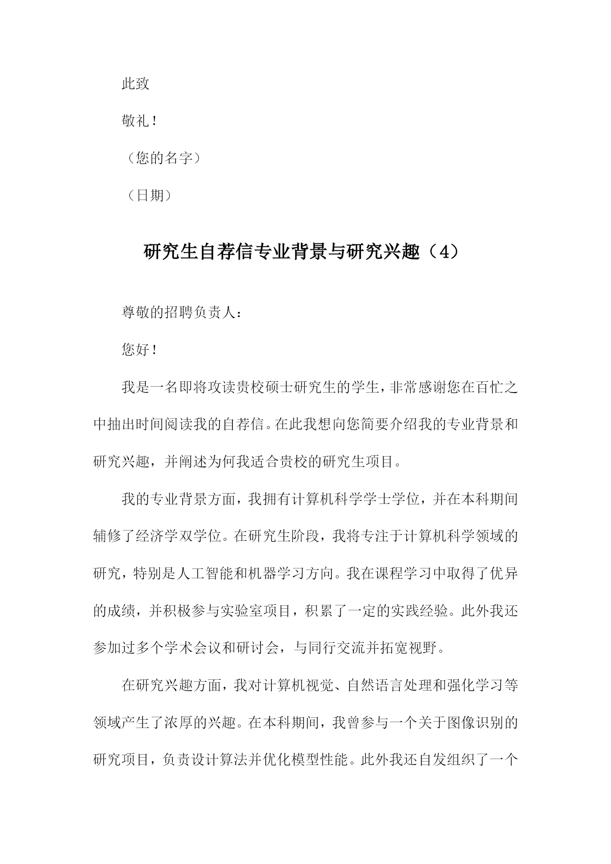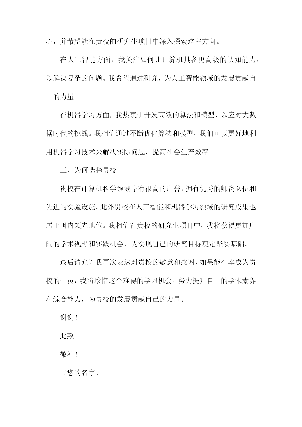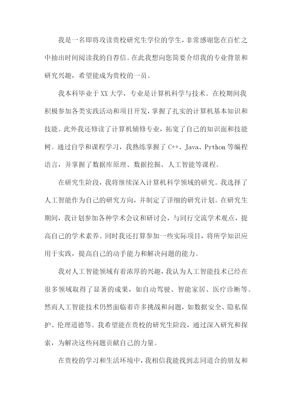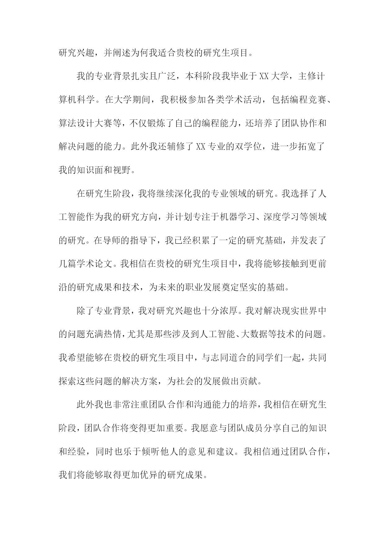 研究生自荐信专业背景与研究兴趣尊敬的招聘负责人:您好!我是一名即将攻读贵校硕士研究生的学生,非常荣幸有机会向您推荐自己。在此我想简要介绍一下我的专业背景和研究兴趣,并阐述为何我适合贵校的研究生项目。一、专业背景在本科阶段,我专注于计算机科学领域的研究与学习。通过系统的专业课程学习和实践,我掌握了计算机编程、算法设计、数据结构等基本技能。此外我还积极参与各类科研项目,积累了丰富的实践经验。在此基础上,我获得了优异的成绩,并发表了多篇学术论文。为了进一步深化自己的学术研究能力,我选择了计算机科学与技术专业攻读硕士学位。在研究生阶段,我将致力于人工智能、机器学习等领域的研究,以期在理论和技术上取得突破性进展。同时我也计划参加各种国际学术会议和研讨会,与同行交流学术观点,拓宽视野。二、研究兴趣我的研究兴趣主要集中在人工智能和机器学习两个方面,我对深度学习、自然语言处理、计算机视觉等领域的最新研究成果充满好奇心,并希望能在贵校的研究生项目中深入探索这些方向。在人工智能方面,我关注如何让计算机具备更高级的认知能力,以解决复杂的问题。我希望通过研究,为人工智能领域的发展贡献自己的力量。在机器学习方面,我热衷于开发高效的算法和模型,以应对大数据时代的挑战。我相信通过不断优化算法和模型,我们可以更好地利用机器学习技术来解决实际问题,提高社会生产效率。三、为何选择贵校贵校在计算机科学领域享有很高的声誉,拥有优秀的师资队伍和先进的实验设施。此外贵校在人工智能和机器学习领域的研究成果也居于国内领先地位。我相信在贵校的研究生项目中,我将获得更加广阔的学术视野和实践机会,为实现自己的研究目标奠定坚实基础。最后请允许我再次表达对贵校的敬意和感谢,如果能有幸成为贵校的一员,我将珍惜这个难得的学习机会,努力提升自己的学术素养和综合能力,为贵校的发展贡献自己的力量。谢谢!此致敬礼!(您的名字)研究生自荐信专业背景与研究兴趣(1)尊敬的招聘负责人:您好!我是一名即将攻读贵校研究生学位的学生,非常感谢您在百忙之中抽出时间阅读我的自荐信。在此我想向您简要介绍我的专业背景和研究兴趣,并阐述为何我适合贵校的研究生项目。我的专业背景扎实且广泛,本科阶段我毕业于XX大学,主修计算机科学。在大学期间,我积极参加各类实践活动和技术竞赛,通过实际操作和团队协作,积累了丰富的编程经验和解决问题的能力。此外我还辅修了经济学双学位,对金融、市场分析等领域也有一定的了解。研究生阶段,我将继续深化专业领域的研究。我计划攻读人工智能或大数据方向,专注于机器学习、深度学习等领域的理论研究与实践应用。在导师的指导下,我希望能够发表高水平的学术论文,为学术界做出贡献。同时我也热衷于将理论知识应用于实际问题,为企业解决技术难题。关于研究兴趣,我对计算机视觉、自然语言处理和智能机器人等领域充满浓厚兴趣。在本科阶段,我就积极参与相关课题的研究,积累了一定的研究经验。我相信在贵校的研究生项目中,我将能够继续深入探索这些领域,为实现技术创新和发展贡献自己的力量。选择贵校研究生项目的原因有很多,首先贵校在计算机科学领域享有很高的声誉,拥有一流的师资队伍和研究条件。其次贵校的学术氛围浓厚,学生普遍具有较高的学术素养和创新精神。最后贵校与多家知名企业和研究机构建立了紧密的合作关系,为学生提供了广阔的实践平台和职业发展机会。综上所述我相信自己具备攻读贵校研究生项目的专业背景和研究兴趣。如果能够获得贵校的录取,我将全力以赴,努力学习为贵校的发展贡献自己的一份力量。再次感谢您阅读我的自荐信,期待有机会与您进一步交流。此致敬礼!(您的名字)研究生自荐信专业背景与研究兴趣(2)尊敬的招聘负责人:您好!我是一名即将攻读贵校研究生学位的学生,非常感谢您在百忙之中抽出时间阅读我的自荐信。在此我想向您简要介绍我的专业背景和研究兴趣,并阐述为何我适合贵校的研究生项目。我的专业背景扎实且广泛,本科阶段我毕业于XX大学,主修计算机科学。在大学期间,我积极参加各类学术活动,包括编程竞赛、算法设计大赛等,不仅锻炼了自己的编程能力,还培养了团队协作和解决问题的能力。此外我还辅修了XX专业的双学位,进一步拓宽了我的知识面和视野。在研究生阶段,我将继续深化我的专业领域的研究。我选择了人工智能作为我的研究方向,并计划专注于机器学习、深度学习等领域的研究。在导师的指导下,我已经积累了一定的研究基础,并发表了几篇学术论文。我相信在贵校的研究生项目中,我将能够接触到更前沿的研究成果和技术,为未来的职业发展奠定坚实的基础。除了专业背景,我对研究兴趣也十分浓厚。我对解决现实世界中的问题充满热情,尤其是那些涉及到人工智能、大数据等技术的问题。我希望能够在贵校的研究生项目中,与志同道合的同学们