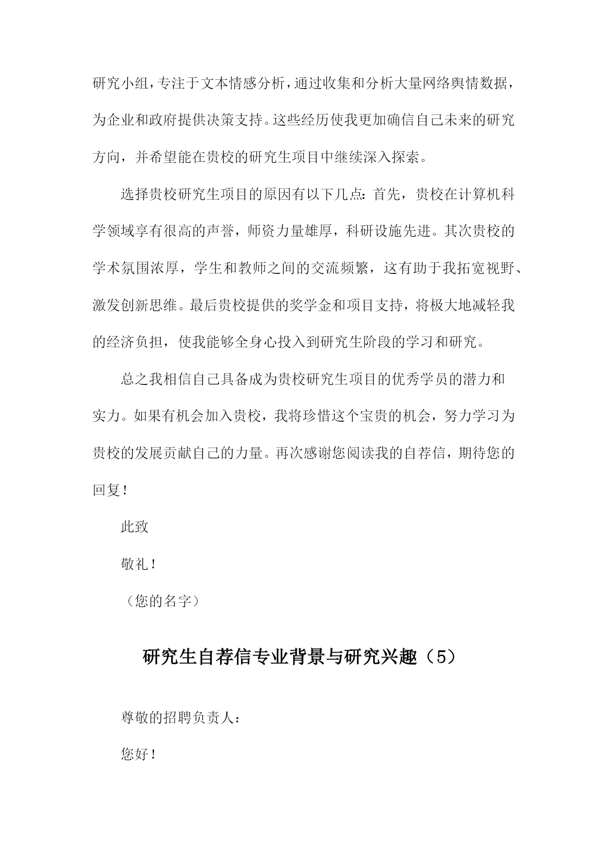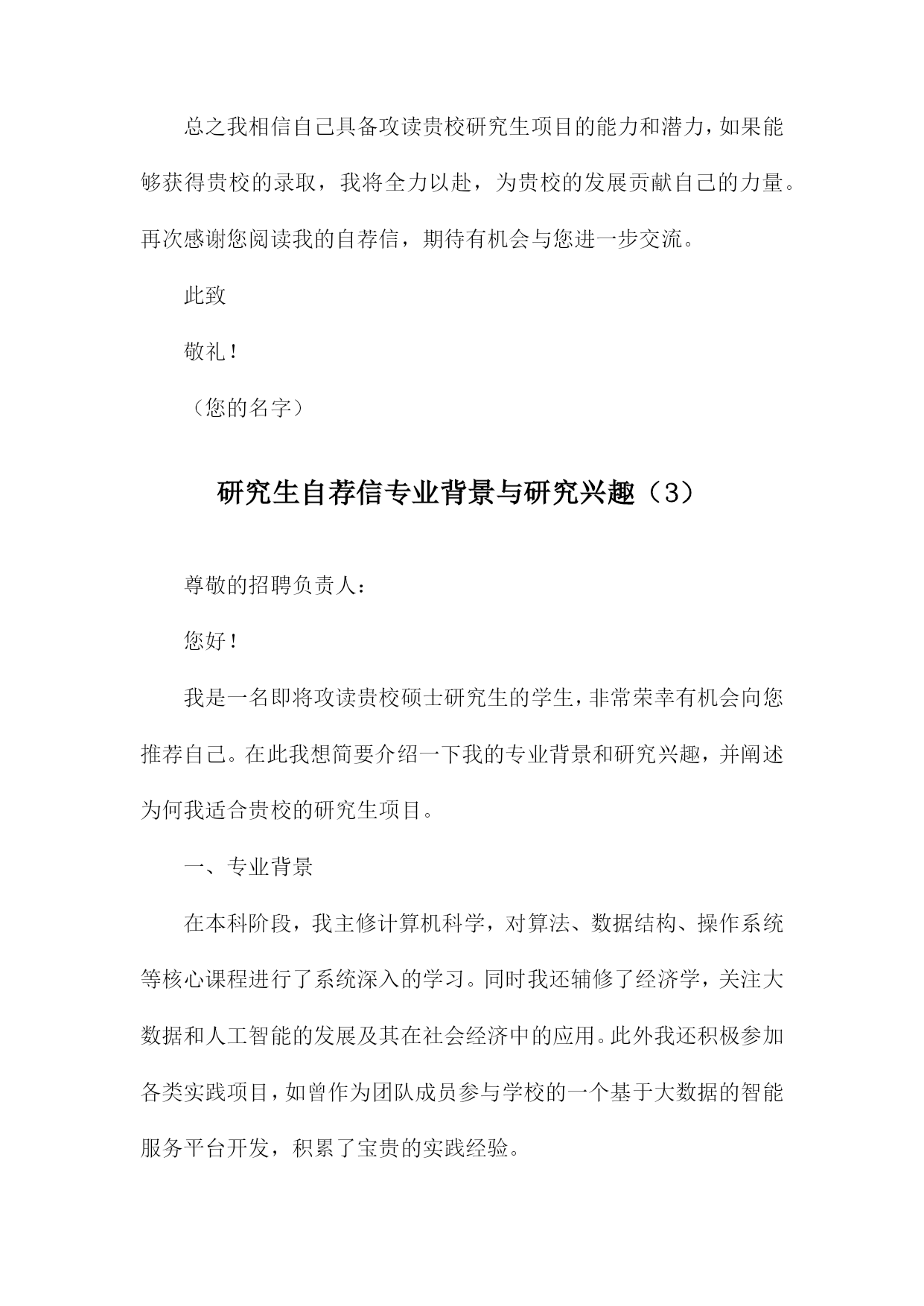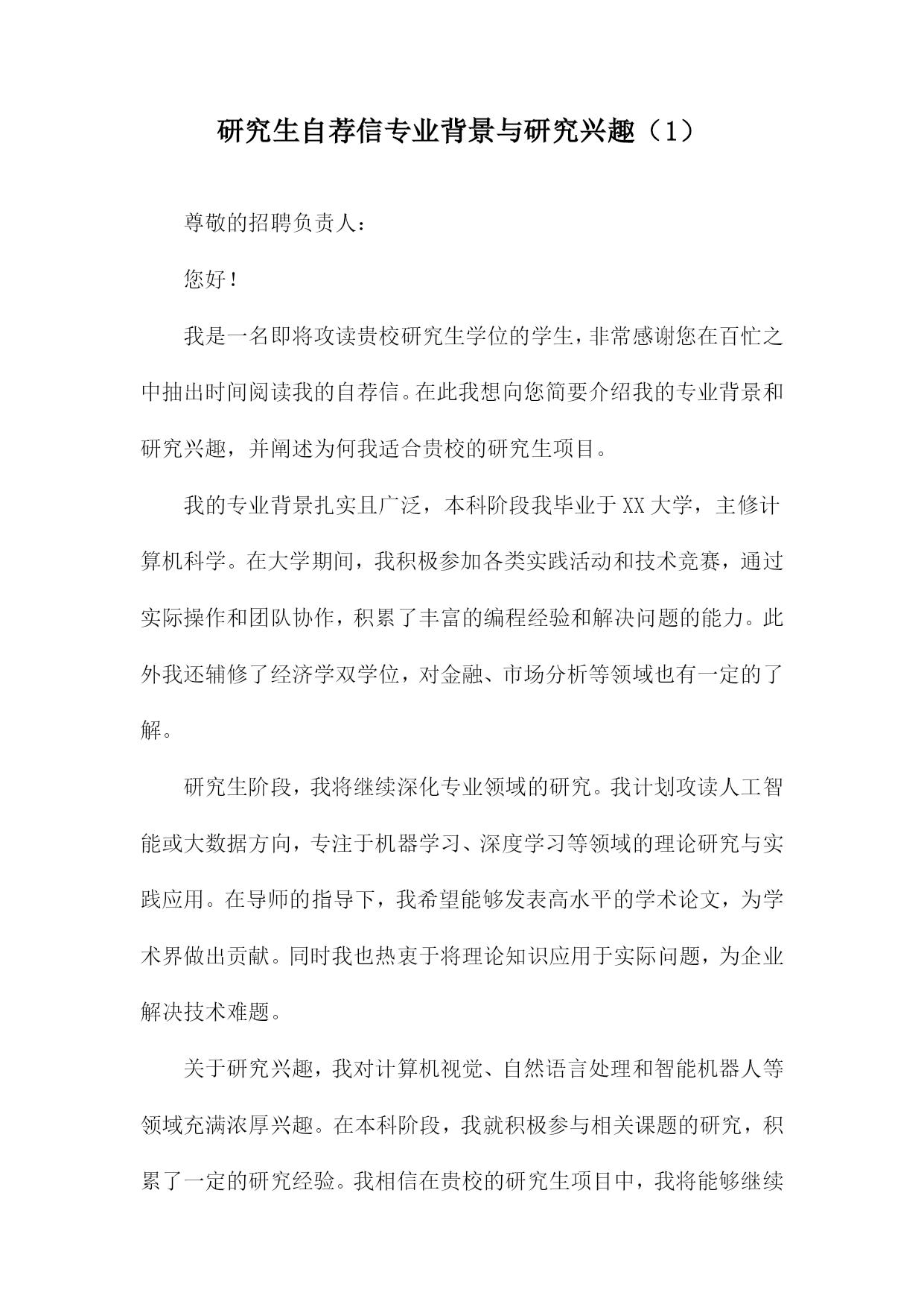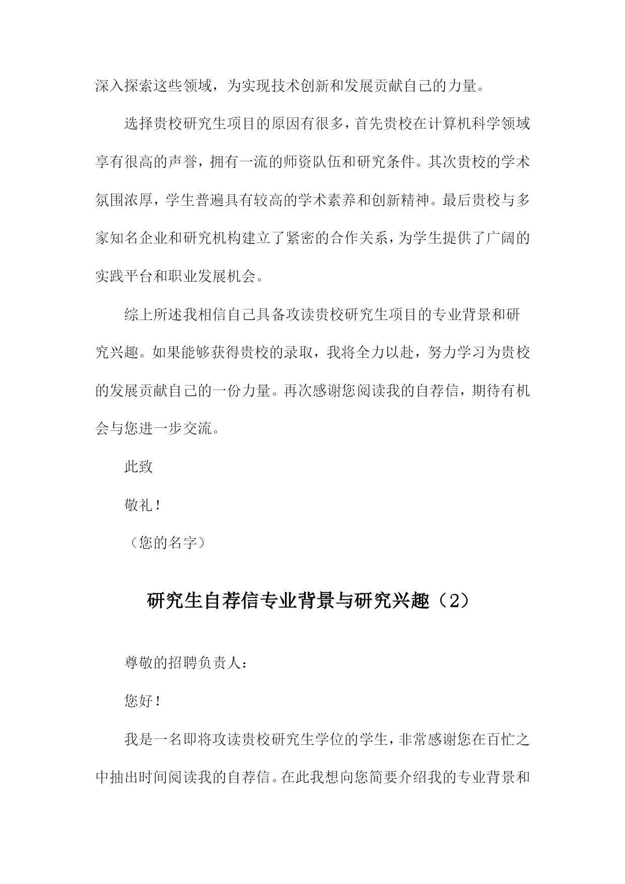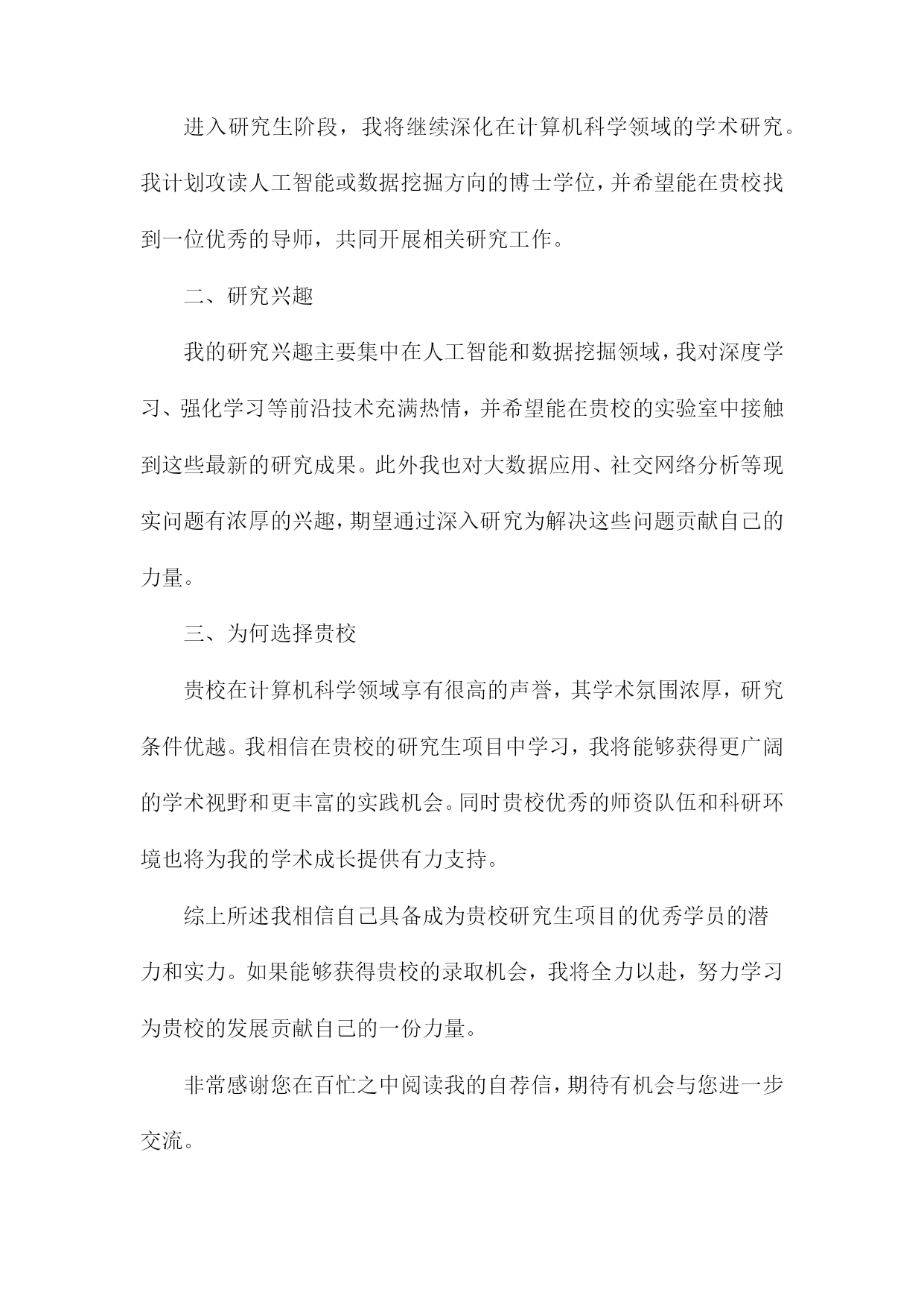 研究生自荐信专业背景与研究兴趣尊敬的招聘负责人:您好!我是一名即将攻读贵校硕士研究生的学生,非常荣幸有机会向您推荐自己。在此我想简要介绍一下我的专业背景和研究兴趣,并阐述为何我适合贵校的研究生项目。一、专业背景在本科阶段,我专注于计算机科学领域的研究与学习。通过系统的专业课程学习和实践,我掌握了计算机编程、算法设计、数据结构等基本技能。此外我还积极参与各类科研项目,积累了丰富的实践经验。在此基础上,我获得了优异的成绩,并发表了多篇学术论文。为了进一步深化自己的学术研究能力,我选择了计算机科学与技术专业攻读硕士学位。在研究生阶段,我将致力于人工智能、机器学习等领域的研究,以期在理论和技术上取得突破性进展。同时我也计划参加各种国际学术会议和研讨会,与同行交流学术观点,拓宽视野。二、研究兴趣我的研究兴趣主要集中在人工智能和机器学习两个方面,我对深度学习、自然语言处理、计算机视觉等领域的最新研究成果充满好奇心,并希望能在贵校的研究生项目中深入探索这些方向。在人工智能方面,我关注如何让计算机具备更高级的认知能力,以解决复杂的问题。我希望通过研究,为人工智能领域的发展贡献自己的力量。在机器学习方面,我热衷于开发高效的算法和模型,以应对大数据时代的挑战。我相信通过不断优化算法和模型,我们可以更好地利用机器学习技术来解决实际问题,提高社会生产效率。三、为何选择贵校贵校在计算机科学领域享有很高的声誉,拥有优秀的师资队伍和先进的实验设施。此外贵校在人工智能和机器学习领域的研究成果也居于国内领先地位。我相信在贵校的研究生项目中,我将获得更加广阔的学术视野和实践机会,为实现自己的研究目标奠定坚实基础。最后请允许我再次表达对贵校的敬意和感谢,如果能有幸成为贵校的一员,我将珍惜这个难得的学习机会,努力提升自己的学术素养和综合能力,为贵校的发展贡献自己的力量。谢谢!此致敬礼!(您的名字)研究生自荐信专业背景与研究兴趣(1)尊敬的招聘负责人:您好!我是一名即将攻读贵校研究生学位的学生,非常感谢您在百忙之中抽出时间阅读我的自荐信。在此我想向您简要介绍我的专业背景和研究兴趣,并阐述为何我适合贵校的研究生项目。我的专业背景扎实且广泛,本科阶段我毕业于XX大学,主修计算机科学。在大学期间,我积极参加各类实践活动和技术竞赛,通过实际操作和团队协作,积累了丰富的编程经验和解决问题的能力。此外我还辅修了经济学双学位,对金融、市场分析等领域也有一定的了解。研究生阶段,我将继续深化专业领域的研究。我计划攻读人工智能或大数据方向,专注于机器学习、深度学习等领域的理论研究与实践应用。在导师的指导下,我希望能够发表高水平的学术论文,为学术界做出贡献。同时我也热衷于将理论知识应用于实际问题,为企业解决技术难题。关于研究兴趣,我对计算机视觉、自然语言处理和智能机器人等领域充满浓厚兴趣。在本科阶段,我就积极参与相关课题的研究,积累了一定的研究经验。我相信在贵校的研究生项目中,我将能够继续深入探索这些领域,为实现技术创新和发展贡献自己的力量。选择贵校研究生项目的原因有很多,首先贵校在计算机科学领域享有很高的声誉,拥有一流的师资队伍和研究条件。其次贵校的学术氛围浓厚,学生普遍具有较高的学术素养和创新精神。最后贵校与多家知名企业和研究机构建立了紧密的合作关系,为学生提供了广阔的实践平台和职业发展机会。综上所述我相信自己具备攻读贵校研究生项目的专业背景和研究兴趣。如果能够获得贵校的录取,我将全力以赴,努力学习为贵校的发展贡献自己的一份力量。再次感谢您阅读我的自荐信,期待有机会与您进一步交流。此致敬礼!(您的名字)研究生自荐信专业背景与研究兴趣(2)尊敬的招聘负责人:您好!我是一名即将攻读贵校研究生学位的学生,非常感谢您在百忙之中抽出时间阅读我的自荐信。在此我想向您简要介绍我的专业背景和研究兴趣,并阐述为何我适合贵校的研究生项目。我的专业背景扎实且广泛,本科阶段我毕业于XX大学,主修计算机科学。在大学期间,我积极参加各类学术活动,包括编程竞赛、算法设计大赛等,不仅锻炼了自己的编程能力,还培养了团队协作和解决问题的能力。此外我还辅修了XX专业的双学位,进一步拓宽了我的知识面和视野。在研究生阶段,我将继续深化我的专业领域的研究。我选择了人工智能作为我的研究方向,并计划专注于机器学习、深度学习等领域的研究。在导师的指导下,我已经积累了一定的研究基础,并发表了几篇学术论文。我相信在贵校的研究生项目中,我将能够接触到更前沿的研究成果和技术,为未来的职业发展奠定坚实的基础。除了专业背景,我对研究兴趣也十分浓厚。我对解决现实世界中的问题充满热情,尤其是那些涉及到人工智能、大数据等技术的问题。我希望能够在贵校的研究生项目中,与志同道合的同学们