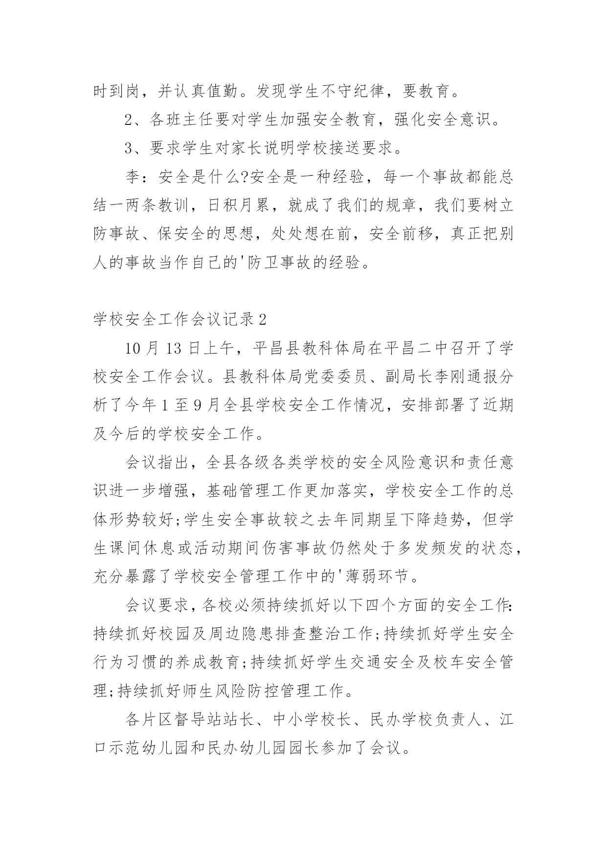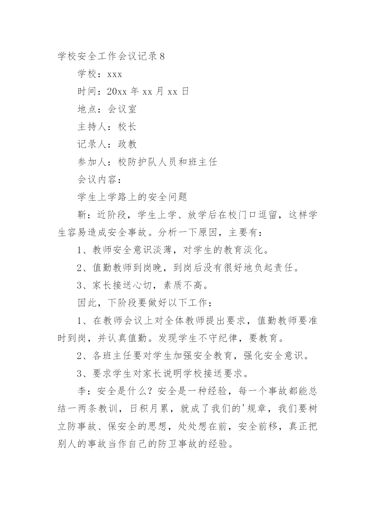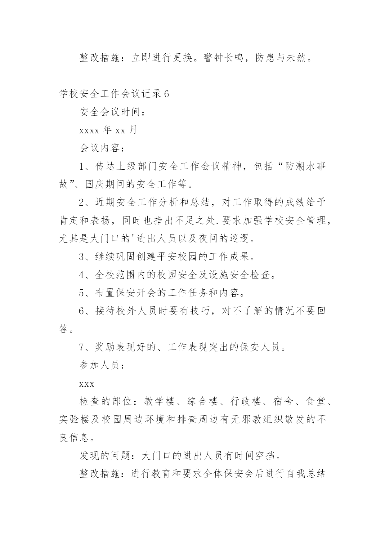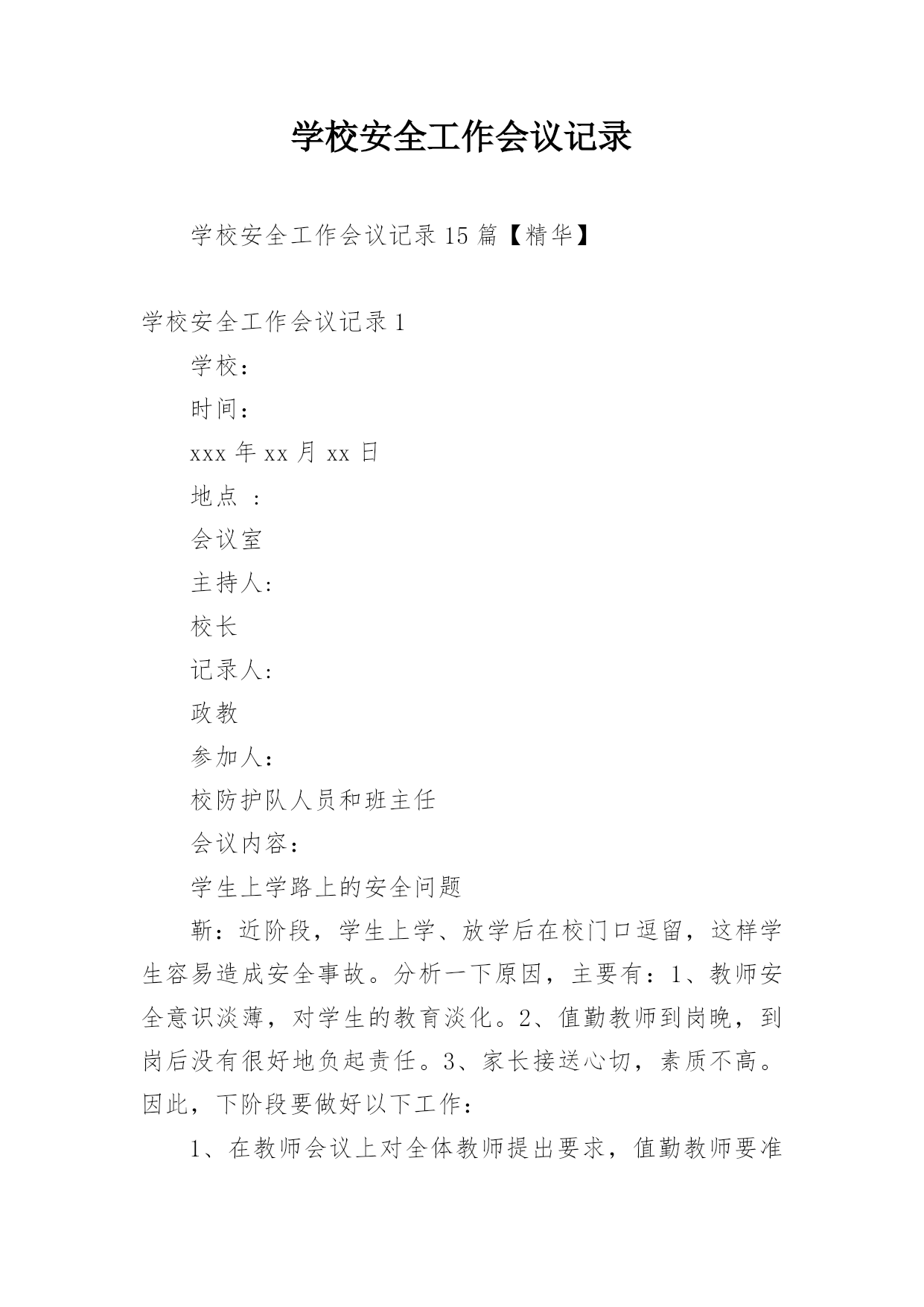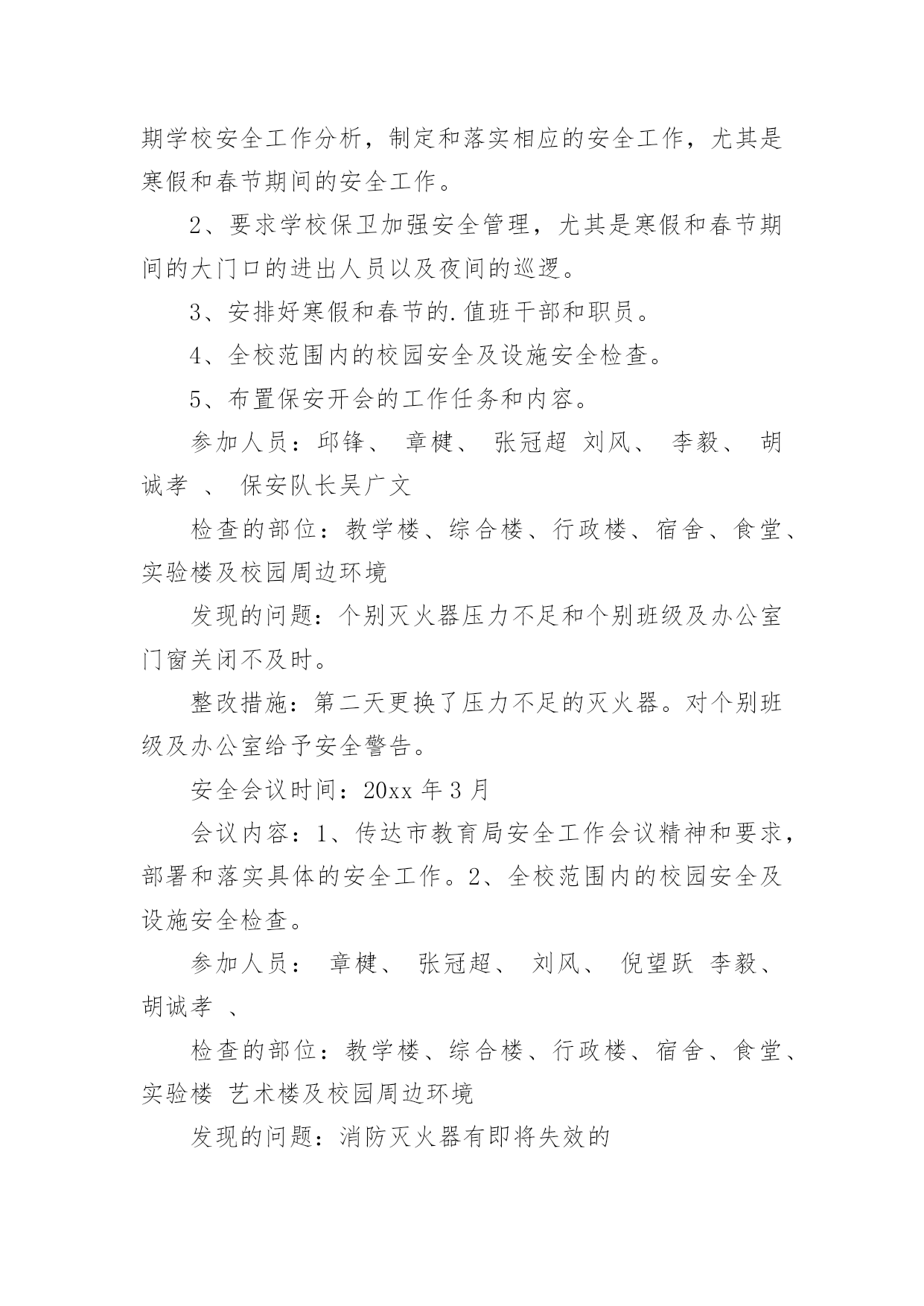 学校安全工作会议记录学校安全工作会议记录15篇【精华】学校安全工作会议记录1学校:时间:xxx年xx月xx日地点:会议室主持人:校长记录人:政教参加人:校防护队人员和班主任会议内容:学生上学路上的安全问题靳:近阶段,学生上学、放学后在校门口逗留,这样学生容易造成安全事故。分析一下原因,主要有:1、教师安全意识淡薄,对学生的教育淡化。2、值勤教师到岗晚,到岗后没有很好地负起责任。3、家长接送心切,素质不高。因此,下阶段要做好以下工作:1、在教师会议上对全体教师提出要求,值勤教师要准时到岗,并认真值勤。发现学生不守纪律,要教育。2、各班主任要对学生加强安全教育,强化安全意识。3、要求学生对家长说明学校接送要求。李:安全是什么?安全是一种经验,每一个事故都能总结一两条教训,日积月累,就成了我们的规章,我们要树立防事故、保安全的思想,处处想在前,安全前移,真正把别人的事故当作自己的'防卫事故的经验。学校安全工作会议记录210月13日上午,平昌县教科体局在平昌二中召开了学校安全工作会议。县教科体局党委委员、副局长李刚通报分析了今年1至9月全县学校安全工作情况,安排部署了近期及今后的学校安全工作。会议指出,全县各级各类学校的安全风险意识和责任意识进一步增强,基础管理工作更加落实,学校安全工作的总体形势较好;学生安全事故较之去年同期呈下降趋势,但学生课间休息或活动期间伤害事故仍然处于多发频发的状态,充分暴露了学校安全管理工作中的'薄弱环节。会议要求,各校必须持续抓好以下四个方面的安全工作:持续抓好校园及周边隐患排查整治工作;持续抓好学生安全行为习惯的养成教育;持续抓好学生交通安全及校车安全管理;持续抓好师生风险防控管理工作。各片区督导站站长、中小学校长、民办学校负责人、江口示范幼儿园和民办幼儿园园长参加了会议。学校安全工作会议记录3安全会议时间:20xx年xx月会议记录内容:学校工作安全第一靳:学校工作安全第一,没有安全就谈不上办学质量,一定要高度重视,全员参与,齐抓共管,校长是第一责任人。我主抓此项工作,下面中层具体分管:要求:1、一定要制订好新学期安全各种计划。2、在周五教师会议上进行安全工作部署。3、各组织分工检查,发现问题,及时报告解决。学校安全工作会议记录4安全会议时间:20xx年4月会议内容:1、交流在杭州市教育局学校反邪教警示教育培训班学习心得。2、学校安全排查和整改参加人员:邱锋、章楗、张冠超、刘风、倪望跃李毅、胡诚孝、检查的部位:教学楼、综合楼、行政楼、宿舍、食堂、实验楼艺术楼发现的问题:无整改措施:警钟长鸣,防患与未然。安全会议时间:20xx年5月会议内容:会议内容:传达市教育局安全工作会议精神,布置学校近期安全工作:一、加强学校防火安全工作;二、加强防盗情况检查;三、确定5月上旬配合有关部门全校师生进行应急避险演练。四、关于住校生的安全工作,拟定“逃生”演练时间。五、全校师生利用校园网和宣传窗学习新的《消防法》。六、进一步强***室安全工作要充分引起重视和传达室要严格出入管理制度。七、近期安全工作情况通报,确定安全生产月的活动计划。八、安全设施检查一次,损坏的`要立即整改。九、针对学校车辆日益增多,会议再一次重申校门口开车车速不得超过5公里。十、要求教师教育学生不要随意变动灭火器的位置。参加人员:邱锋章楗、张冠超、倪望跃刘风、李毅、胡诚孝、各年级组长检查的部位:教学楼、综合楼、行政楼、宿舍、食堂、实验楼艺术楼及校园周边环境发现的问题:无整改措施:安全防范。学校安全工作会议记录5安全会议时间:20xx年1月会议内容:1、传达市教育局和武林街道安全会议精神和要求。近期学校安全工作分析,制定和落实相应的安全工作,尤其是寒假和春节期间的安全工作。2、要求学校保卫加强安全管理,尤其是寒假和春节期间的大门口的进出人员以及夜间的巡逻。3、安排好寒假和春节的.值班干部和职员。4、全校范围内的校园安全及设施安全检查。5、布置保安开会的工作任务和内容。参加人员:邱锋、章楗、张冠超刘风、李毅、胡诚孝、保安队长吴广文检查的部位:教学楼、综合楼、行政楼、宿舍、食堂、实验楼及校园周边环境发现的问题:个别灭火器压力不足和个别班级及办公室门窗关闭不及时。整改措施:第二天更换了压力不足的灭火器。对个别班级及办公室给予安全警告。安全会议时间:20xx年3月会议内容:1、传达市教育局安全工作会议精神和要求,部署和落实具体的安全工作。2、全校范围内的校园安全及设施安全检查。参加人员:章楗、张冠超、刘风、倪望跃李毅、胡诚孝、检查的部位:教学楼、综合楼、行政楼、宿舍、食堂、实验楼艺术楼及校园周边环境发现的问题:消防灭火器有即将失效的整改措施:立即进行更换。警钟长鸣,防患与未然。学校安全工作会议记录6安全会议时间:xxxx年xx月会议内容:1、传达上级部门安全