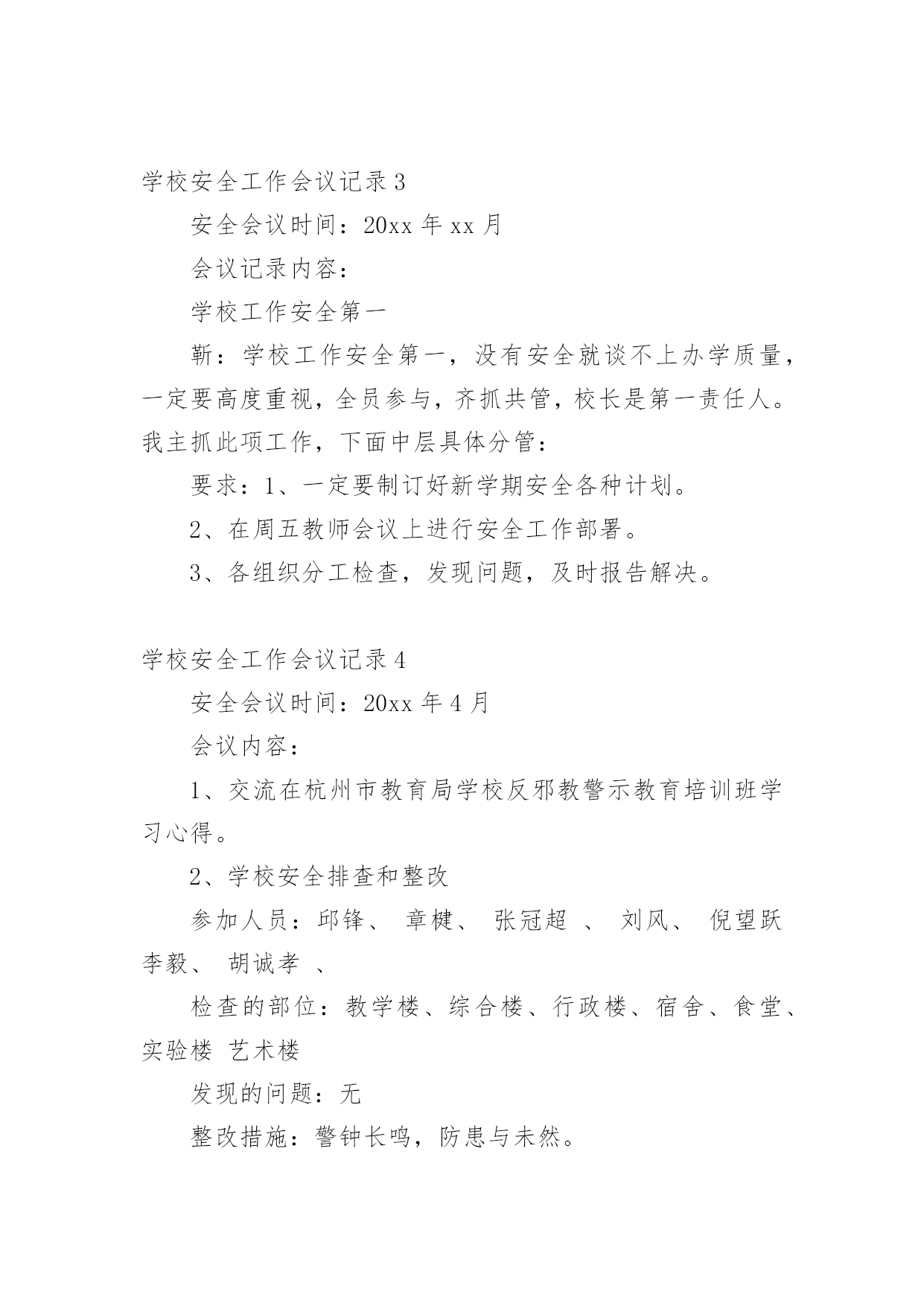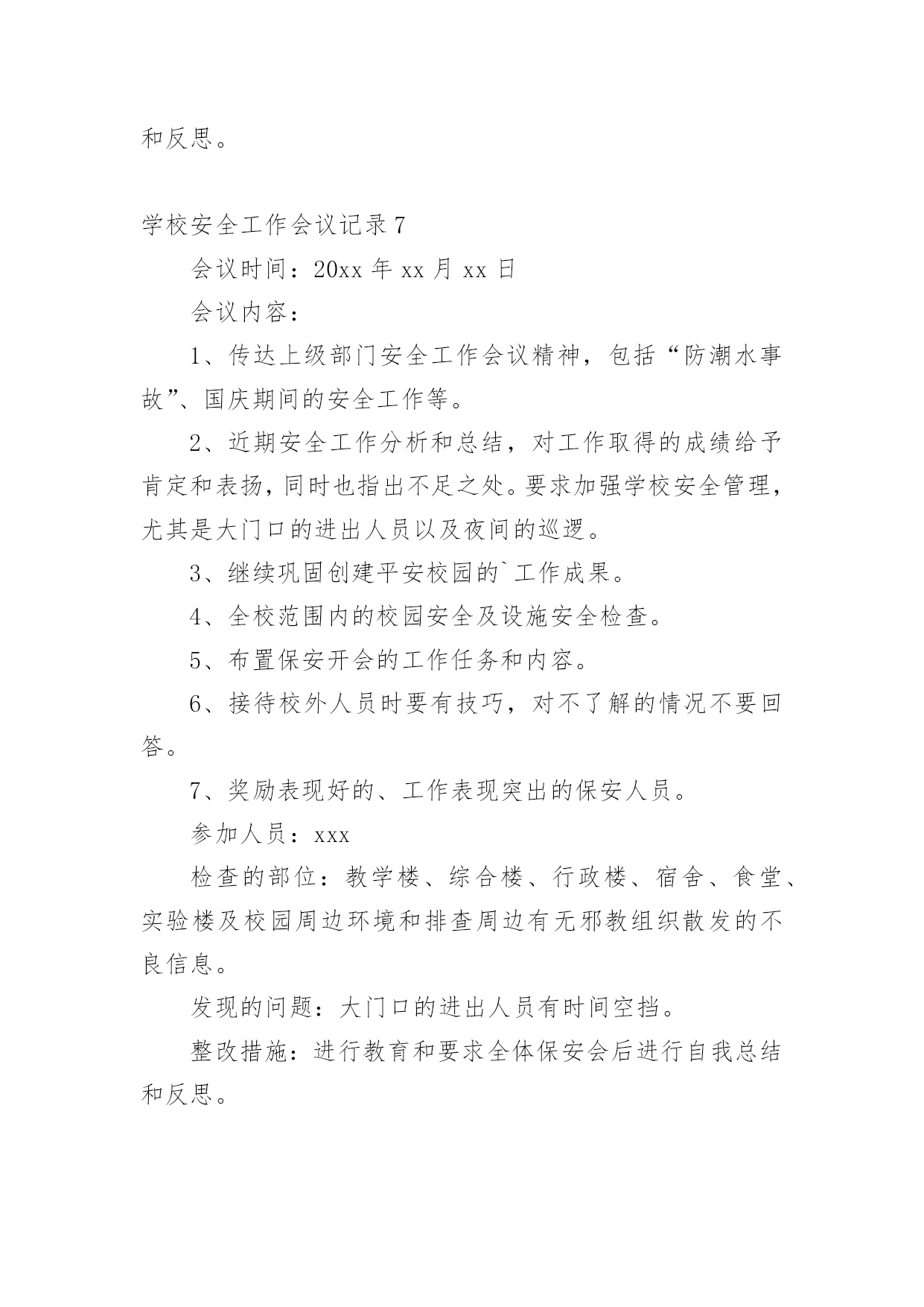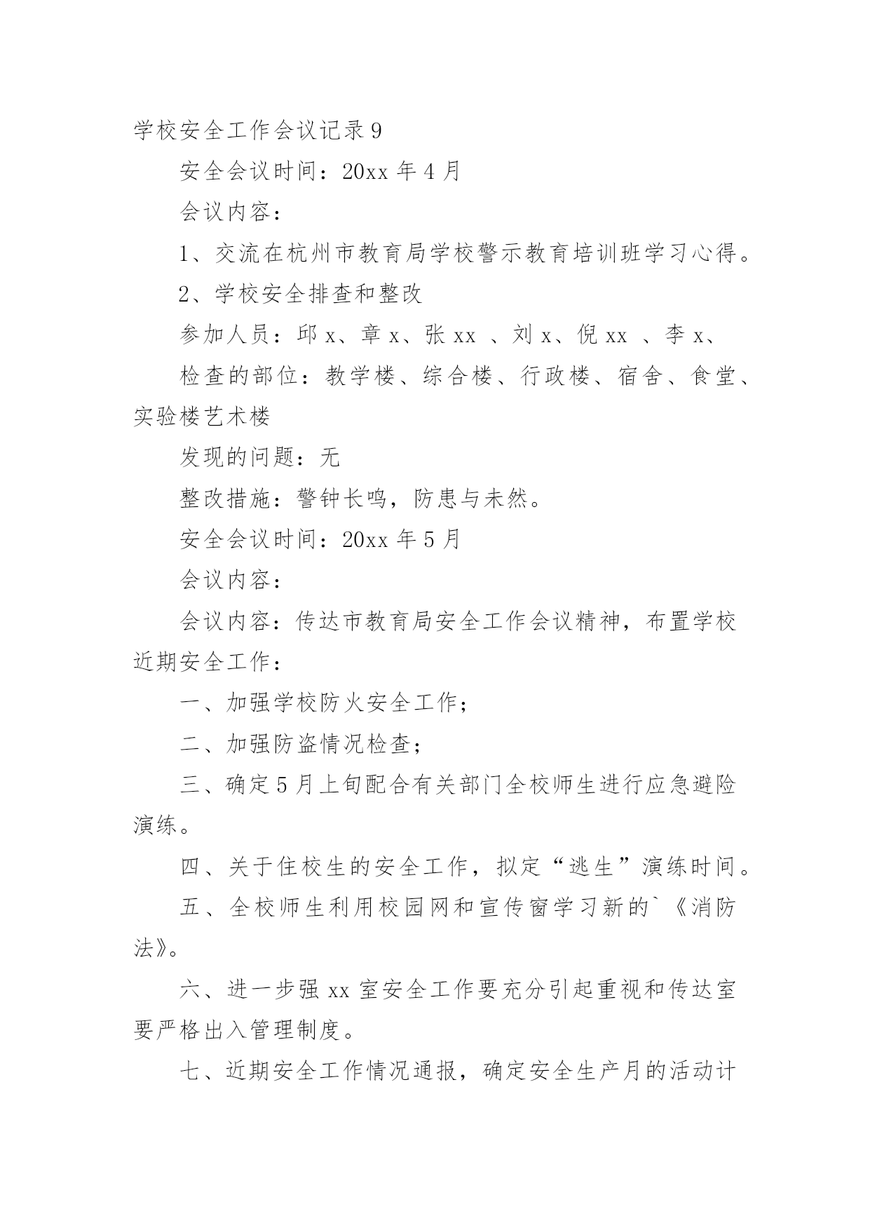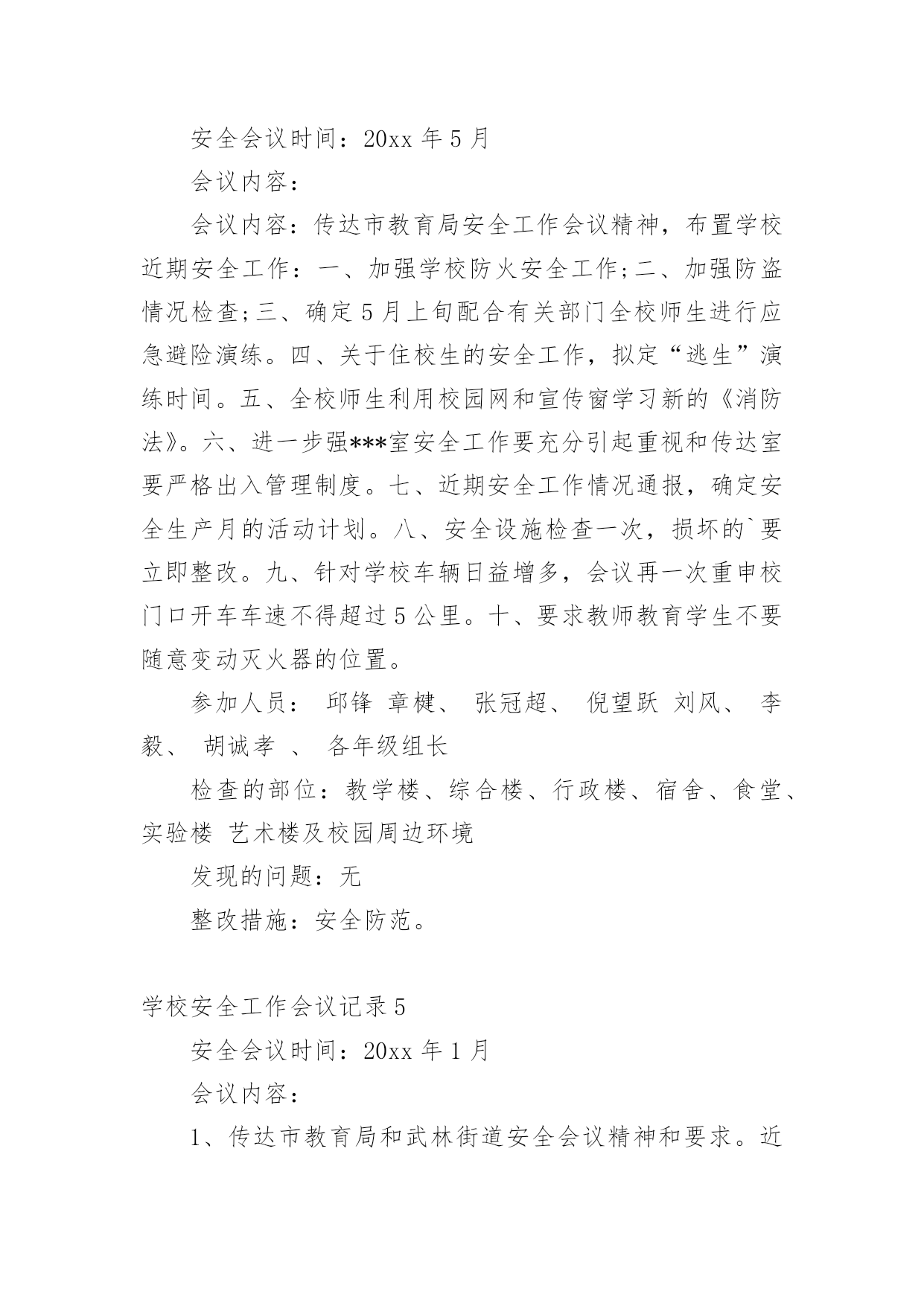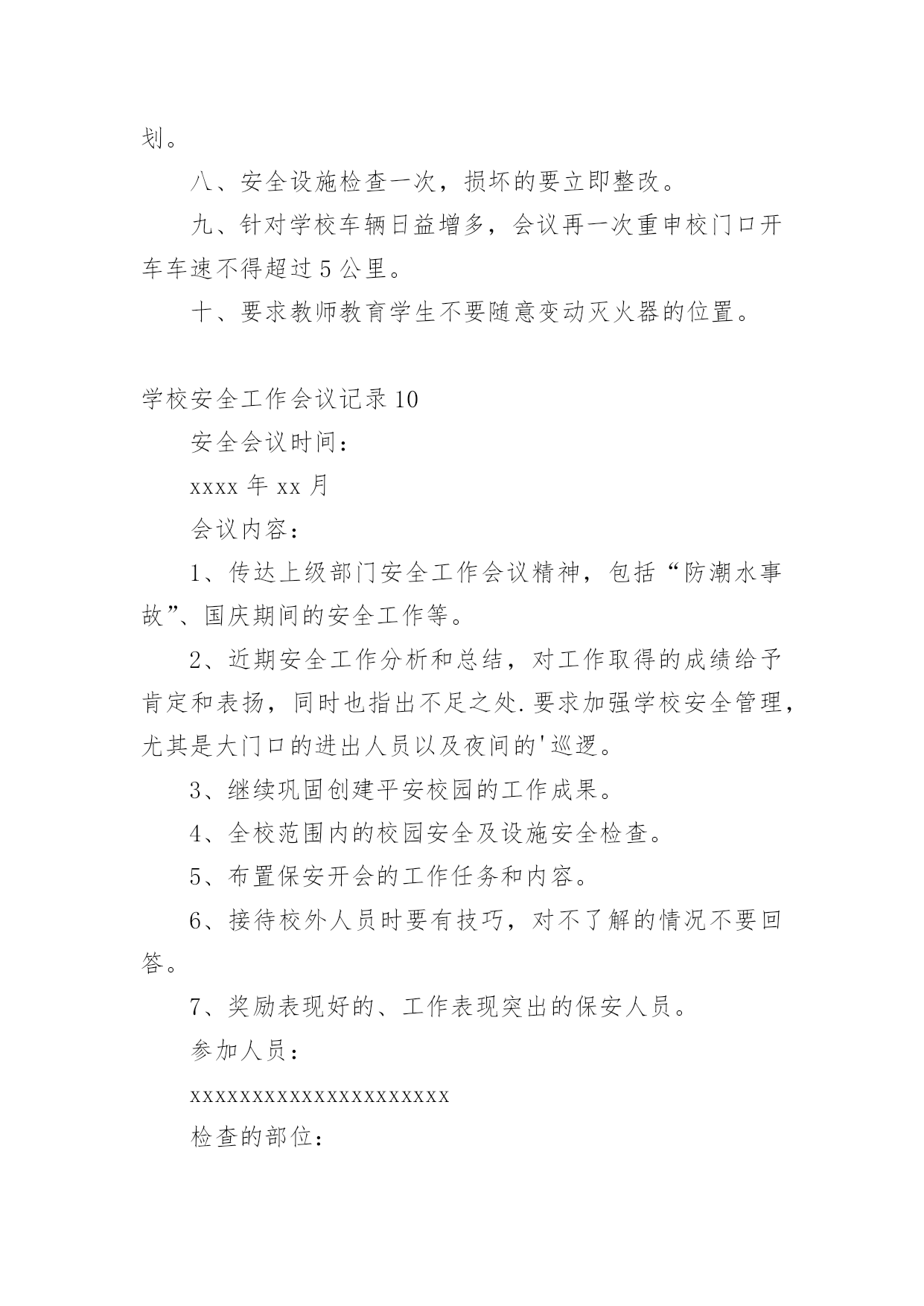 学校安全工作会议记录学校安全工作会议记录15篇【精华】学校安全工作会议记录1学校:时间:xxx年xx月xx日地点:会议室主持人:校长记录人:政教参加人:校防护队人员和班主任会议内容:学生上学路上的安全问题靳:近阶段,学生上学、放学后在校门口逗留,这样学生容易造成安全事故。分析一下原因,主要有:1、教师安全意识淡薄,对学生的教育淡化。2、值勤教师到岗晚,到岗后没有很好地负起责任。3、家长接送心切,素质不高。因此,下阶段要做好以下工作:1、在教师会议上对全体教师提出要求,值勤教师要准时到岗,并认真值勤。发现学生不守纪律,要教育。2、各班主任要对学生加强安全教育,强化安全意识。3、要求学生对家长说明学校接送要求。李:安全是什么?安全是一种经验,每一个事故都能总结一两条教训,日积月累,就成了我们的规章,我们要树立防事故、保安全的思想,处处想在前,安全前移,真正把别人的事故当作自己的'防卫事故的经验。学校安全工作会议记录210月13日上午,平昌县教科体局在平昌二中召开了学校安全工作会议。县教科体局党委委员、副局长李刚通报分析了今年1至9月全县学校安全工作情况,安排部署了近期及今后的学校安全工作。会议指出,全县各级各类学校的安全风险意识和责任意识进一步增强,基础管理工作更加落实,学校安全工作的总体形势较好;学生安全事故较之去年同期呈下降趋势,但学生课间休息或活动期间伤害事故仍然处于多发频发的状态,充分暴露了学校安全管理工作中的'薄弱环节。会议要求,各校必须持续抓好以下四个方面的安全工作:持续抓好校园及周边隐患排查整治工作;持续抓好学生安全行为习惯的养成教育;持续抓好学生交通安全及校车安全管理;持续抓好师生风险防控管理工作。各片区督导站站长、中小学校长、民办学校负责人、江口示范幼儿园和民办幼儿园园长参加了会议。学校安全工作会议记录3安全会议时间:20xx年xx月会议记录内容:学校工作安全第一靳:学校工作安全第一,没有安全就谈不上办学质量,一定要高度重视,全员参与,齐抓共管,校长是第一责任人。我主抓此项工作,下面中层具体分管:要求:1、一定要制订好新学期安全各种计划。2、在周五教师会议上进行安全工作部署。3、各组织分工检查,发现问题,及时报告解决。学校安全工作会议记录4安全会议时间:20xx年4月会议内容:1、交流在杭州市教育局学校反邪教警示教育培训班学习心得。2、学校安全排查和整改参加人员:邱锋、章楗、张冠超、刘风、倪望跃李毅、胡诚孝、检查的部位:教学楼、综合楼、行政楼、宿舍、食堂、实验楼艺术楼发现的问题:无整改措施:警钟长鸣,防患与未然。安全会议时间:20xx年5月会议内容:会议内容:传达市教育局安全工作会议精神,布置学校近期安全工作:一、加强学校防火安全工作;二、加强防盗情况检查;三、确定5月上旬配合有关部门全校师生进行应急避险演练。四、关于住校生的安全工作,拟定“逃生”演练时间。五、全校师生利用校园网和宣传窗学习新的《消防法》。六、进一步强***室安全工作要充分引起重视和传达室要严格出入管理制度。七、近期安全工作情况通报,确定安全生产月的活动计划。八、安全设施检查一次,损坏的`要立即整改。九、针对学校车辆日益增多,会议再一次重申校门口开车车速不得超过5公里。十、要求教师教育学生不要随意变动灭火器的位置。参加人员:邱锋章楗、张冠超、倪望跃刘风、李毅、胡诚孝、各年级组长检查的部位:教学楼、综合楼、行政楼、宿舍、食堂、实验楼艺术楼及校园周边环境发现的问题:无整改措施:安全防范。学校安全工作会议记录5安全会议时间:20xx年1月会议内容:1、传达市教育局和武林街道安全会议精神和要求。近期学校安全工作分析,制定和落实相应的安全工作,尤其是寒假和春节期间的安全工作。2、要求学校保卫加强安全管理,尤其是寒假和春节期间的大门口的进出人员以及夜间的巡逻。3、安排好寒假和春节的.值班干部和职员。4、全校范围内的校园安全及设施安全检查。5、布置保安开会的工作任务和内容。参加人员:邱锋、章楗、张冠超刘风、李毅、胡诚孝、保安队长吴广文检查的部位:教学楼、综合楼、行政楼、宿舍、食堂、实验楼及校园周边环境发现的问题:个别灭火器压力不足和个别班级及办公室门窗关闭不及时。整改措施:第二天更换了压力不足的灭火器。对个别班级及办公室给予安全警告。安全会议时间:20xx年3月会议内容:1、传达市教育局安全工作会议精神和要求,部署和落实具体的安全工作。2、全校范围内的校园安全及设施安全检查。参加人员:章楗、张冠超、刘风、倪望跃李毅、胡诚孝、检查的部位:教学楼、综合楼、行政楼、宿舍、食堂、实验楼艺术楼及校园周边环境发现的问题:消防灭火器有即将失效的整改措施:立即进行更换。警钟长鸣,防患与未然。学校安全工作会议记录6安全会议时间:xxxx年xx月会议内容:1、传达上级部门安全
