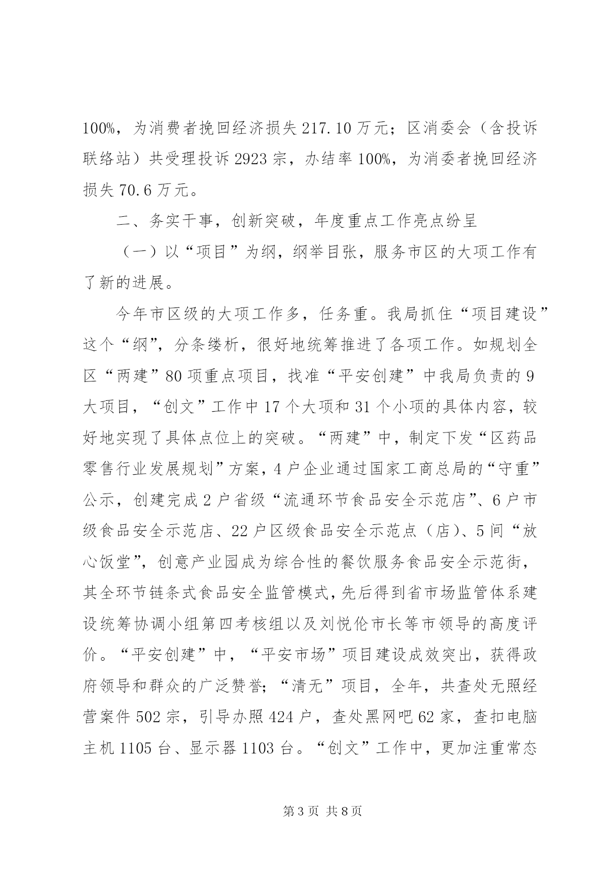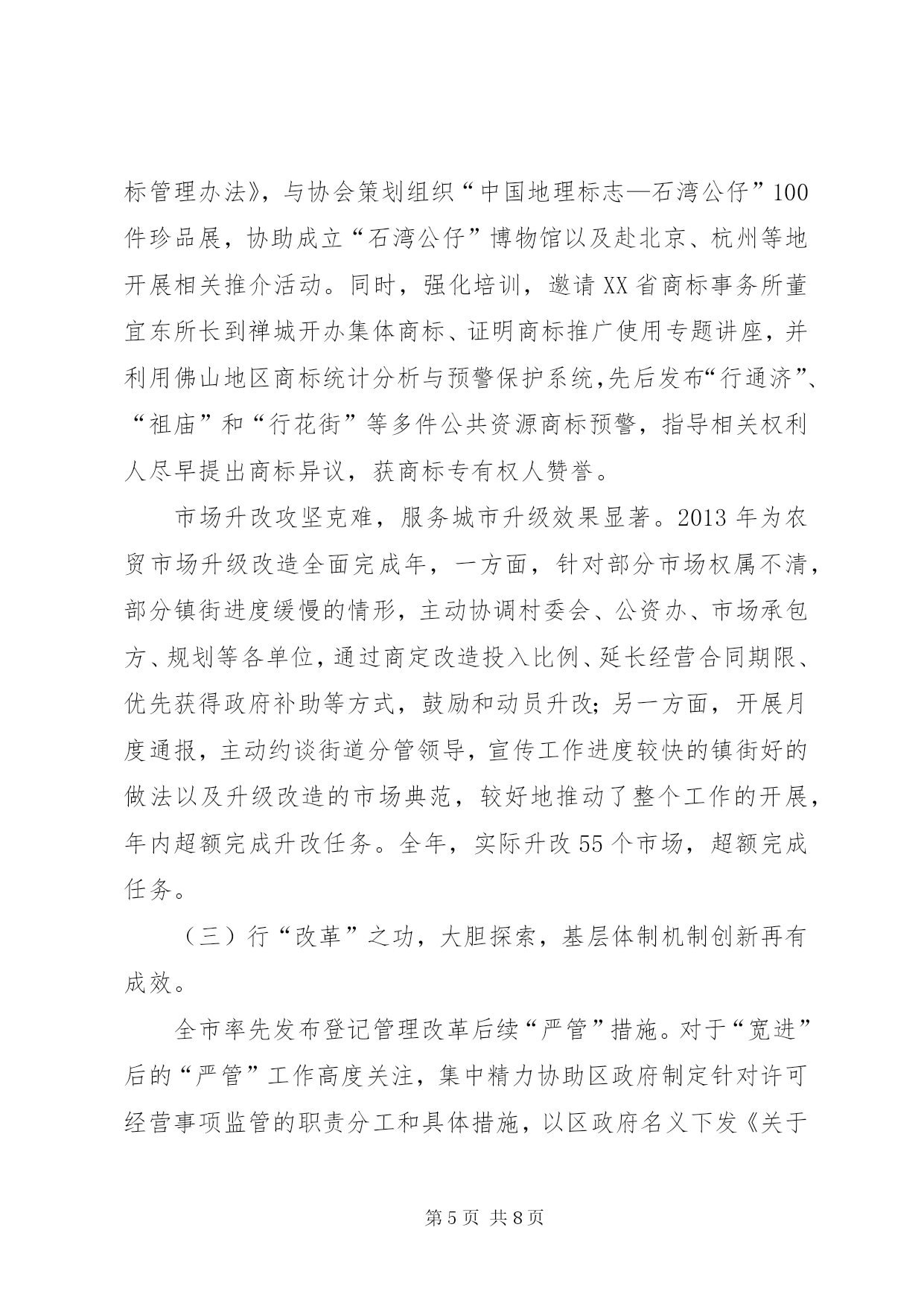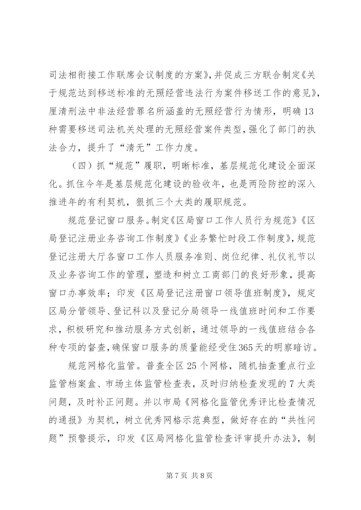 第PAGE\*Arabic\*MERGEFORMAT8页共NUMPAGES\*MERGEFORMAT8页区工商局工作总结20**年,在xx市局和区委区政府的直接领导下,我局以服务地方经济发展和基层工商机关转型升级作为年度工作主线,围绕“务实、创新、规范”开展工作,全面落实省局“五项重点工作”争当“两个率先”排头兵,市局“六个抓手”的工作部署,积极投身区委区政府“中心禅城”的建设,取得了新的成绩。一、树惠民政风,抓“行评”整改,履职效能全面提升全局认识到位,超常规组织部署“四风”整治和“行评”工作,一方面,构建从局领导、“庸懒散奢”整治专责工作组、科室分局,到每一位干部职工的“以上率下,上下同步”的“链条式”查改模式,扎实开展“四风”整治。另一方面,全身心投入政风行风民主评议,打开门办工商,走到群众中去听取意见,邀请群众和媒体体验工商业务办理,自主收集到5个方面,14项存在问题,并先后就《区第三方民意测评通报》、《区政风行风建设主要问题的通报》提到的存在问题,制定28项整改措施,形成整改总方案,尤其是针对共性的问题,力争改变“哪里发现哪里整改”的孤立运作,探索“上升、落地、铺展”的整改新模式,全方位地提升了全局整体的履职效能。全年共有93个次的单位及个人受到区级以上表彰。其中,3个是国家级的表彰:区局被评为全国工商系统2012-2013年度诚信市场创建工作突出单位,祖庙分局被评为全国工商系统先进集体,区个私协会被评为全国个私协会先进集体;1个是省级表彰:区局被省“三打”领导小组评为“全省‘三打’专项行动先进集体”;进驻行政服务中心窗口每季度均被xx市行政服务中心评为先进窗口,并荣获年度先进窗口;区局在全区行评中列26个被评议单位榜首,连续4年蝉联全市系统绩效考核第一名,并获得全区绩效考核优秀等次,四项基础的履职工作也都取得突出的成效。一是窗口效能继续提升,经济户口“质量双升”。全年共核准设立登记10739户,注销登记5469户,全区共有经济户口74721户,注册资本(金)约348.69亿元,分别同比增长4.48%和14.72%。二是商标战略持续推进,名标工程再传喜讯。新增“恒洁”、“圣德堡”、“惠万家”和“百年糊涂酒”4件中国驰名商标,全区共有24件中国驰名商标、65件省著名商标、3件集体商标、1件证明商标,累计有效注册商标23060件,比上年增长9.7%。并继去年首批14件28个类别的公共资源商标获准注册后,成功申报第二批11件23个类别的公共资源商标。三是监管执法更加到位,市场秩序规范有序。全年,共结案1338宗,特别是强化了反法案件的查处,共结案248宗,比去年同期增长37%。四是消费环境继续好转,维权处置实现双百。全年,12315投诉举报中心共接到申诉举报案件4044宗,办结率均达到100%,为消费者挽回经济损失217.10万元;区消委会(含投诉联络站)共受理投诉2923宗,办结率100%,为消委者挽回经济损失70.6万元。二、务实干事,创新突破,年度重点工作亮点纷呈(一)以“项目”为纲,纲举目张,服务市区的大项工作有了新的进展。今年市区级的大项工作多,任务重。我局抓住“项目建设”这个“纲”,分条缕析,很好地统筹推进了各项工作。如规划全区“两建”80项重点项目,找准“平安创建”中我局负责的9大项目,“创文”工作中17个大项和31个小项的具体内容,较好地实现了具体点位上的突破。“两建”中,制定下发“区药品零售行业发展规划”方案,4户企业通过国家工商总局的“守重”公示,创建完成2户省级“流通环节食品安全示范店”、6户市级食品安全示范店、22户区级食品安全示范点(店)、5间“放心饭堂”,创意产业园成为综合性的餐饮服务食品安全示范街,其全环节链条式食品安全监管模式,先后得到省市场监管体系建设统筹协调小组第四考核组以及刘悦伦市长等市领导的高度评价。“平安创建”中,“平安市场”项目建设成效突出,获得政府领导和群众的广泛赞誉;“清无”项目,全年,共查处无照经营案件502宗,引导办照424户,查处黑网吧62家,查扣电脑主机1105台、显示器1103台。“创文”工作中,更加注重常态化推进,制作“创文实地考察易反弹项目的工作指引”以及“创文专项检查记录表”,重点加强实地考察项目三大重点领域的工作落实,高要求、高标准地完成了年度“迎检”任务。(二)走“务实”道路,贴近需求,服务经济发展更趋到位。围绕园区与重大项目建设,服务产业发展获区长批示肯定。在7大产业园区以及区重大项目所在地建立26个工商服务联系点,充分了解企业需求,提供“预约服务、延时服务、上门服务、”和“绿色通道”等更有针对性的服务措施,并主动与区行政服务中心协商,将区重大项目纳入联合审批的实施范畴,提速重大项目的落地,获得良好的社会效应。同时,跟进南风古灶