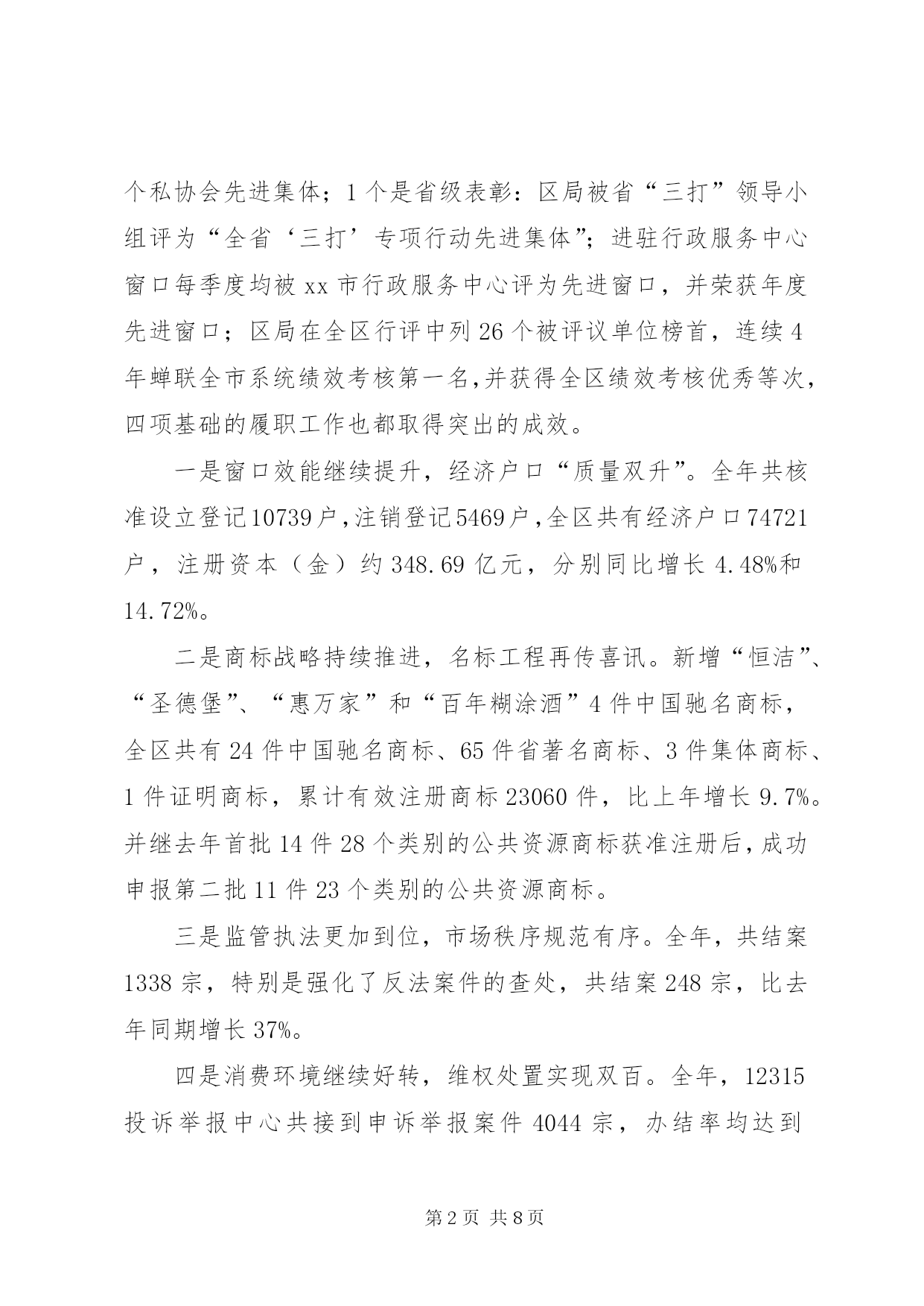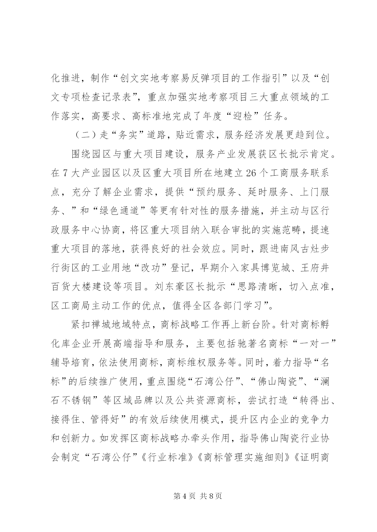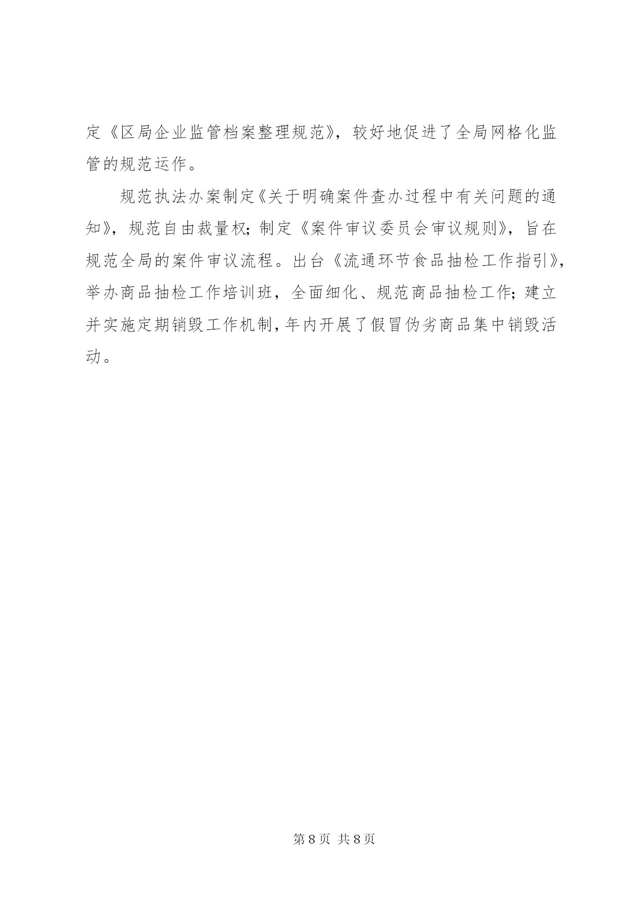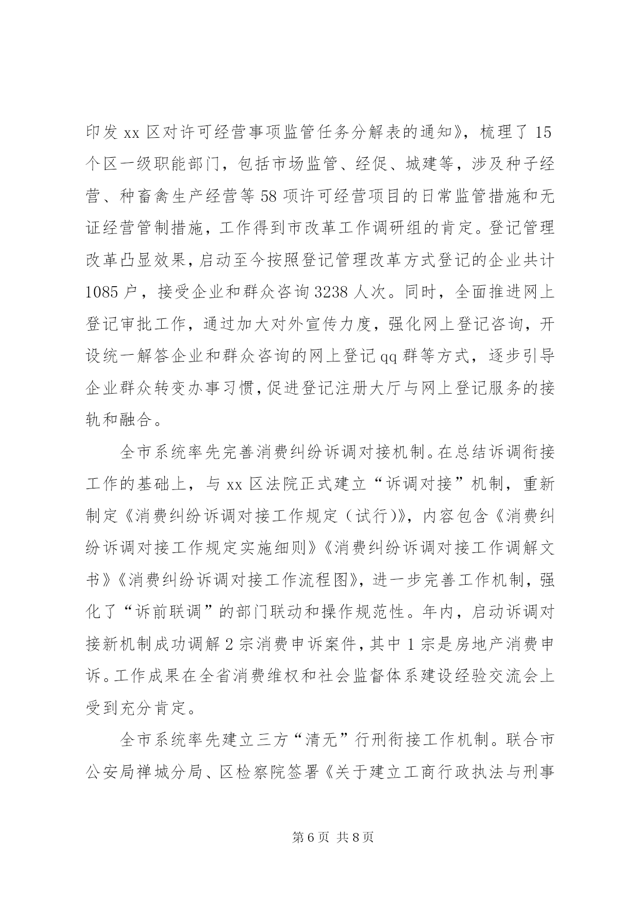 第PAGE\*Arabic\*MERGEFORMAT8页共NUMPAGES\*MERGEFORMAT8页区工商局工作总结20**年,在xx市局和区委区政府的直接领导下,我局以服务地方经济发展和基层工商机关转型升级作为年度工作主线,围绕“务实、创新、规范”开展工作,全面落实省局“五项重点工作”争当“两个率先”排头兵,市局“六个抓手”的工作部署,积极投身区委区政府“中心禅城”的建设,取得了新的成绩。一、树惠民政风,抓“行评”整改,履职效能全面提升全局认识到位,超常规组织部署“四风”整治和“行评”工作,一方面,构建从局领导、“庸懒散奢”整治专责工作组、科室分局,到每一位干部职工的“以上率下,上下同步”的“链条式”查改模式,扎实开展“四风”整治。另一方面,全身心投入政风行风民主评议,打开门办工商,走到群众中去听取意见,邀请群众和媒体体验工商业务办理,自主收集到5个方面,14项存在问题,并先后就《区第三方民意测评通报》、《区政风行风建设主要问题的通报》提到的存在问题,制定28项整改措施,形成整改总方案,尤其是针对共性的问题,力争改变“哪里发现哪里整改”的孤立运作,探索“上升、落地、铺展”的整改新模式,全方位地提升了全局整体的履职效能。全年共有93个次的单位及个人受到区级以上表彰。其中,3个是国家级的表彰:区局被评为全国工商系统2012-2013年度诚信市场创建工作突出单位,祖庙分局被评为全国工商系统先进集体,区个私协会被评为全国个私协会先进集体;1个是省级表彰:区局被省“三打”领导小组评为“全省‘三打’专项行动先进集体”;进驻行政服务中心窗口每季度均被xx市行政服务中心评为先进窗口,并荣获年度先进窗口;区局在全区行评中列26个被评议单位榜首,连续4年蝉联全市系统绩效考核第一名,并获得全区绩效考核优秀等次,四项基础的履职工作也都取得突出的成效。一是窗口效能继续提升,经济户口“质量双升”。全年共核准设立登记10739户,注销登记5469户,全区共有经济户口74721户,注册资本(金)约348.69亿元,分别同比增长4.48%和14.72%。二是商标战略持续推进,名标工程再传喜讯。新增“恒洁”、“圣德堡”、“惠万家”和“百年糊涂酒”4件中国驰名商标,全区共有24件中国驰名商标、65件省著名商标、3件集体商标、1件证明商标,累计有效注册商标23060件,比上年增长9.7%。并继去年首批14件28个类别的公共资源商标获准注册后,成功申报第二批11件23个类别的公共资源商标。三是监管执法更加到位,市场秩序规范有序。全年,共结案1338宗,特别是强化了反法案件的查处,共结案248宗,比去年同期增长37%。四是消费环境继续好转,维权处置实现双百。全年,12315投诉举报中心共接到申诉举报案件4044宗,办结率均达到100%,为消费者挽回经济损失217.10万元;区消委会(含投诉联络站)共受理投诉2923宗,办结率100%,为消委者挽回经济损失70.6万元。二、务实干事,创新突破,年度重点工作亮点纷呈(一)以“项目”为纲,纲举目张,服务市区的大项工作有了新的进展。今年市区级的大项工作多,任务重。我局抓住“项目建设”这个“纲”,分条缕析,很好地统筹推进了各项工作。如规划全区“两建”80项重点项目,找准“平安创建”中我局负责的9大项目,“创文”工作中17个大项和31个小项的具体内容,较好地实现了具体点位上的突破。“两建”中,制定下发“区药品零售行业发展规划”方案,4户企业通过国家工商总局的“守重”公示,创建完成2户省级“流通环节食品安全示范店”、6户市级食品安全示范店、22户区级食品安全示范点(店)、5间“放心饭堂”,创意产业园成为综合性的餐饮服务食品安全示范街,其全环节链条式食品安全监管模式,先后得到省市场监管体系建设统筹协调小组第四考核组以及刘悦伦市长等市领导的高度评价。“平安创建”中,“平安市场”项目建设成效突出,获得政府领导和群众的广泛赞誉;“清无”项目,全年,共查处无照经营案件502宗,引导办照424户,查处黑网吧62家,查扣电脑主机1105台、显示器1103台。“创文”工作中,更加注重常态化推进,制作“创文实地考察易反弹项目的工作指引”以及“创文专项检查记录表”,重点加强实地考察项目三大重点领域的工作落实,高要求、高标准地完成了年度“迎检”任务。(二)走“务实”道路,贴近需求,服务经济发展更趋到位。围绕园区与重大项目建设,服务产业发展获区长批示肯定。在7大产业园区以及区重大项目所在地建立26个工商服务联系点,充分了解企业需求,提供“预约服务、延时服务、上门服务、”和“绿色通道”等更有针对性的服务措施,并主动与区行政服务中心协商,将区重大项目纳入联合审批的实施范畴,提速重大项目的落地,获得良好的社会效应。同时,跟进南风古灶