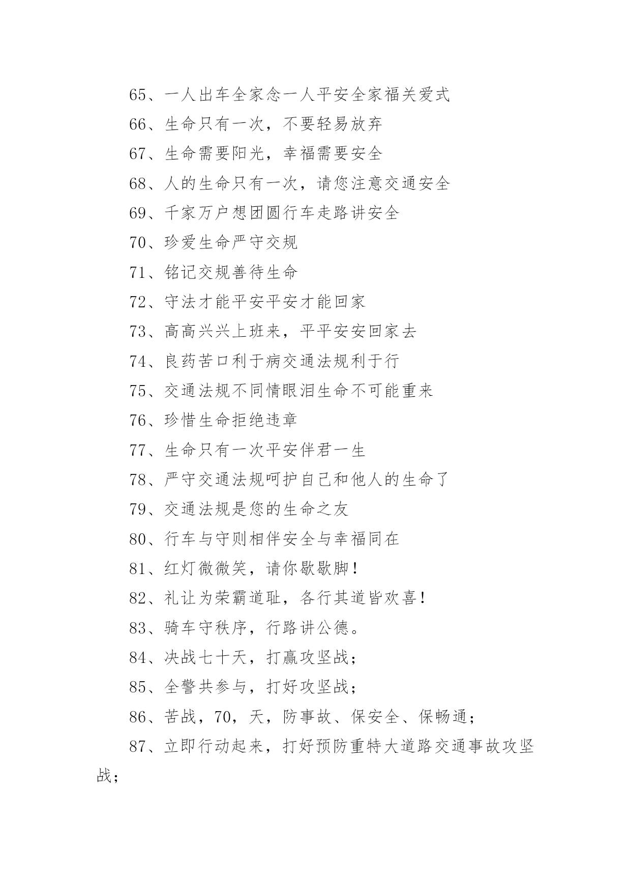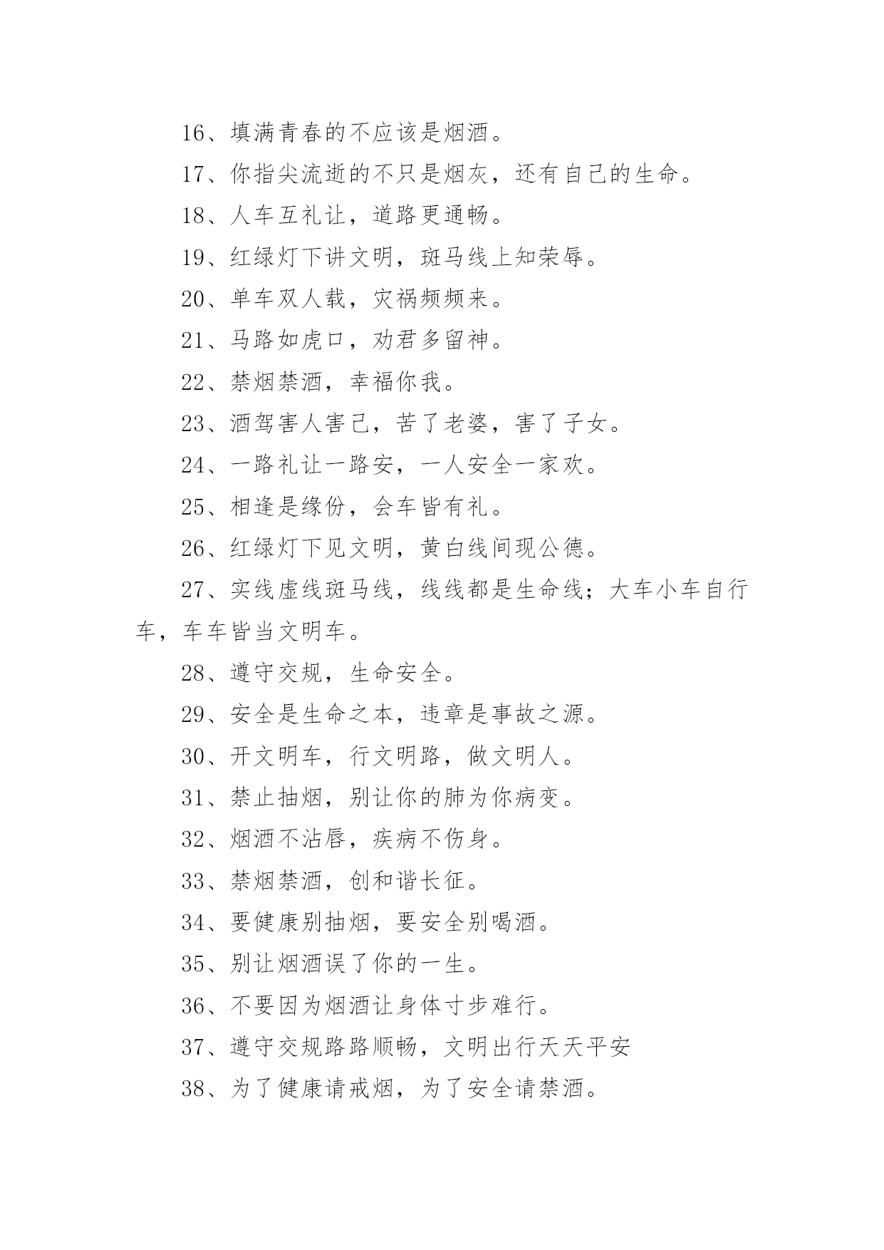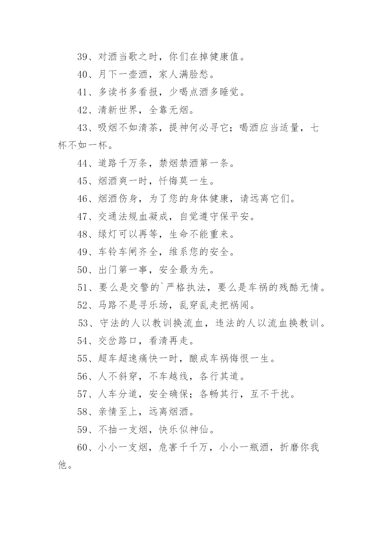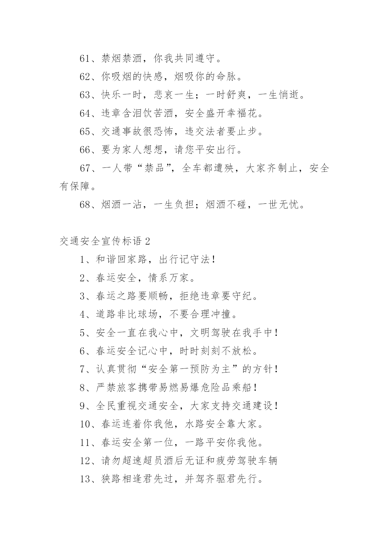 交通安全宣传标语在日常的学习、工作、生活中,大家或多或少都接触过一些经典的标语吧,标语在一定程度上反映了社会经济制度的本质和社会的文明程度,它的意义十分重大。究竟什么样的标语才是好的标语呢?以下是小编为大家收集的交通安全宣传标语,欢迎阅读,希望大家能够喜欢。交通安全宣传标语11、永远不要与生命赛跑。2、抽烟是魔鬼,少活二十岁。3、平安过一生,烟酒勿相碰。4、摒弃烟酒陋习创造健康新未来。5、少喝一杯酒,少抽一只烟,快乐你我他。6、拒绝烟草,珍爱生命。7、无烟校园,清新一片。8、饭后不抽烟,赛过活神仙。9、酒是烈焰,多酌烧身;烟是魔鬼,多抽伤身。10、梦是相反,烟酒是正面一击。11、喜欢你没有烟草和酒精的味道。12、烟,吸进去的是尼古丁,吐出来的是你的生命。13、抽烟喝酒,有害健康。14、健康,随烟而逝;病痛,伴烟而生。15、创建无烟酒校园,共度无烦恼人生。16、填满青春的不应该是烟酒。17、你指尖流逝的不只是烟灰,还有自己的生命。18、人车互礼让,道路更通畅。19、红绿灯下讲文明,斑马线上知荣辱。20、单车双人载,灾祸频频来。21、马路如虎口,劝君多留神。22、禁烟禁酒,幸福你我。23、酒驾害人害己,苦了老婆,害了子女。24、一路礼让一路安,一人安全一家欢。25、相逢是缘份,会车皆有礼。26、红绿灯下见文明,黄白线间现公德。27、实线虚线斑马线,线线都是生命线;大车小车自行车,车车皆当文明车。28、遵守交规,生命安全。29、安全是生命之本,违章是事故之源。30、开文明车,行文明路,做文明人。31、禁止抽烟,别让你的肺为你病变。32、烟酒不沾唇,疾病不伤身。33、禁烟禁酒,创和谐长征。34、要健康别抽烟,要安全别喝酒。35、别让烟酒误了你的一生。36、不要因为烟酒让身体寸步难行。37、遵守交规路路顺畅,文明出行天天平安38、为了健康请戒烟,为了安全请禁酒。39、对酒当歌之时,你们在掉健康值。40、月下一壶酒,家人满脸愁。41、多读书多看报,少喝点酒多睡觉。42、清新世界,全靠无烟。43、吸烟不如清茶,提神何必寻它;喝酒应当适量,七杯不如一杯。44、道路千万条,禁烟禁酒第一条。45、烟酒爽一时,忏悔莫一生。46、烟酒伤身,为了您的身体健康,请远离它们。47、交通法规血凝成,自觉遵守保平安。48、绿灯可以再等,生命不能重来。49、车铃车闸齐全,维系您的安全。50、出门第一事,安全最为先。51、要么是交警的`严格执法,要么是车祸的残酷无情。52、马路不是寻乐场,乱穿乱走把祸闯。53、守法的人以教训换流血,违法的人以流血换教训。54、交岔路口,看清再走。55、超车超速痛快一时,酿成车祸悔恨一生。56、人不斜穿,不车越线,各行其道。57、人车分道,安全确保;各畅其行,互不干扰。58、亲情至上,远离烟酒。59、不抽一支烟,快乐似神仙。60、小小一支烟,危害千千万,小小一瓶酒,折磨你我他。61、禁烟禁酒,你我共同遵守。62、你吸烟的快感,烟吸你的命脉。63、快乐一时,悲哀一生;一时舒爽,一生悄逝。64、违章含泪饮苦酒,安全盛开幸福花。65、交通事故很恐怖,违交法者要止步。66、要为家人想想,请您平安出行。67、一人带“禁品”,全车都遭殃,大家齐制止,安全有保障。68、烟酒一沾,一生负担;烟酒不碰,一世无忧。交通安全宣传标语21、和谐回家路,出行记守法!2、春运安全,情系万家。3、春运之路要顺畅,拒绝违章要守纪。4、道路非比球场,不要合理冲撞。5、安全一直在我心中,文明驾驶在我手中!6、春运安全记心中,时时刻刻不放松。7、认真贯彻“安全第一预防为主”的方针!8、严禁旅客携带易燃易爆危险品乘船!9、全民重视交通安全,大家支持交通建设!10、春运连着你我他,水路安全靠大家。11、春运安全第一位,一路平安你我他。12、请勿超速超员酒后无证和疲劳驾驶车辆13、狭路相逢君先过,并驾齐驱君先行。14、有一种期盼叫回家过年,有一种负责叫文明驾驶。15、人人守春运交规,户户才会齐欢乐!16、确保春运安全,合家欢度春节!17、春运保安全,真情满人间。18、春节回家团圆,莫忘路上交通安全。19、守交规迎春朝旭日,保平安贺喜庆羊年。20、分分秒秒珍惜生命,时时刻刻重视安全21、全力投入春运交通安全维护,打响新年交通安全第一炮!22、保障春运交通安全,营造节日祥和氛围!23、维护道路交通畅通,保障群众出行安全!24、自觉遵守道路交通安全法规,全力确保春运交通安全有序!25、规范行车秩序,严查交通违法,确保春运安全!26、强化春运客运管理,提高春运服务质量!27、春运安全连万家,出行平安你我他!28、春运保安全,真情满人间!29、安全是最好的效益,平安是全家的福气!30、守法规路路平安,慎驾驶家家团圆!31、保障春运交通安全,营造平安祥和的.节日氛围。32、严禁超员超