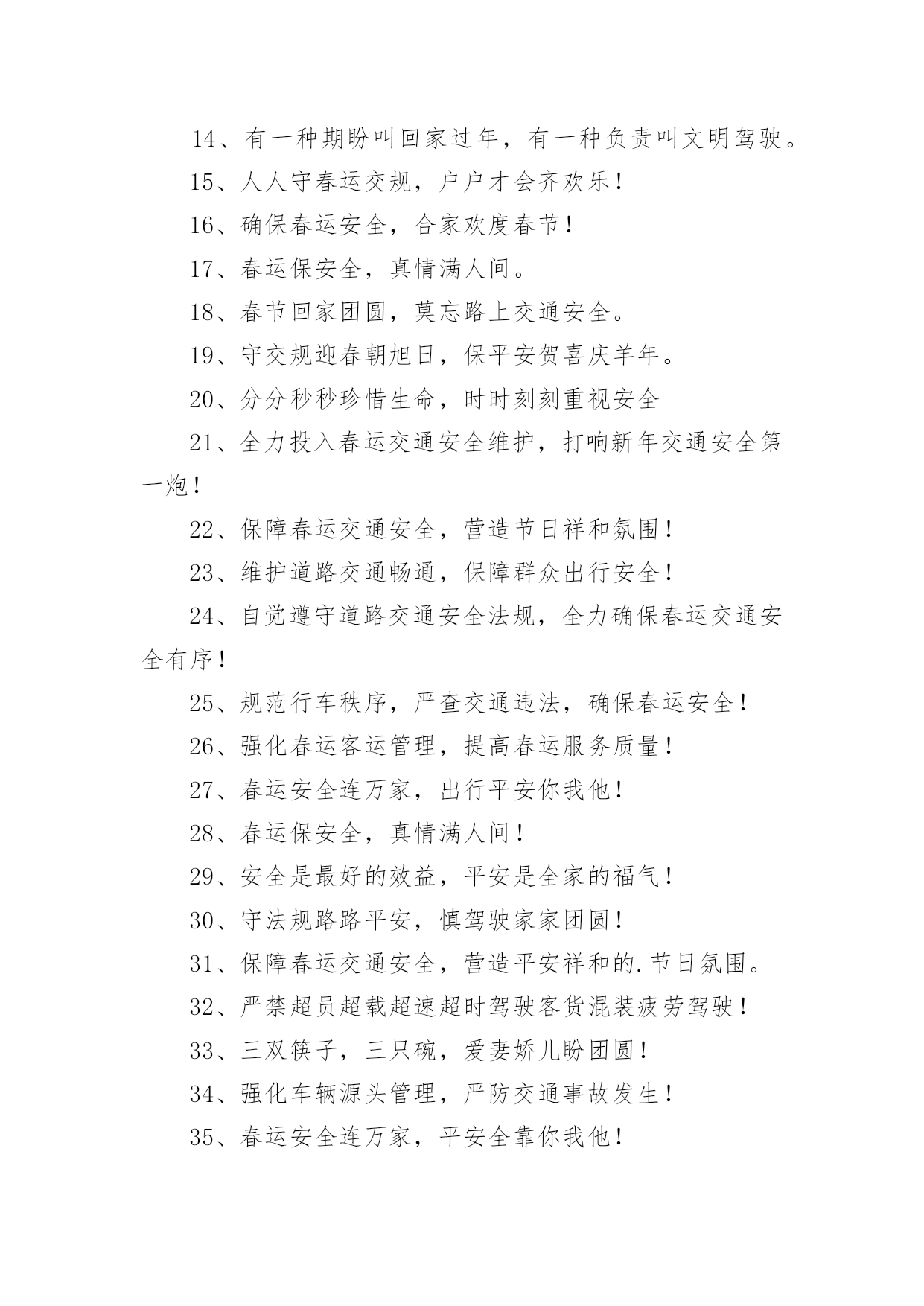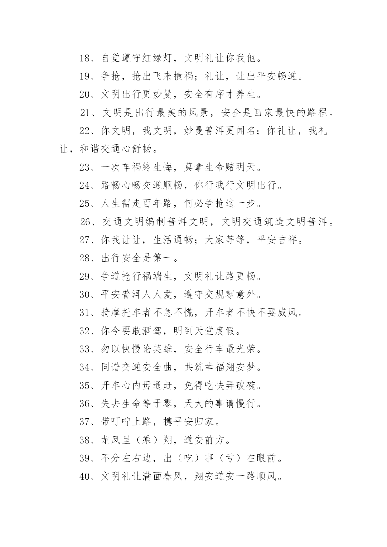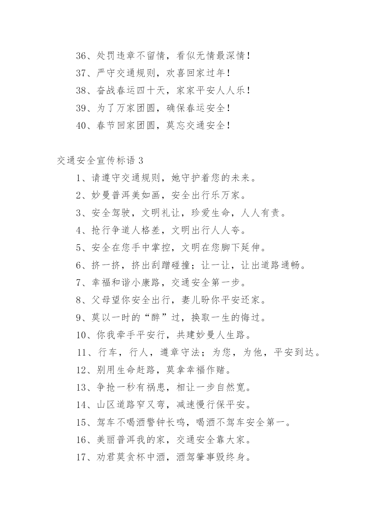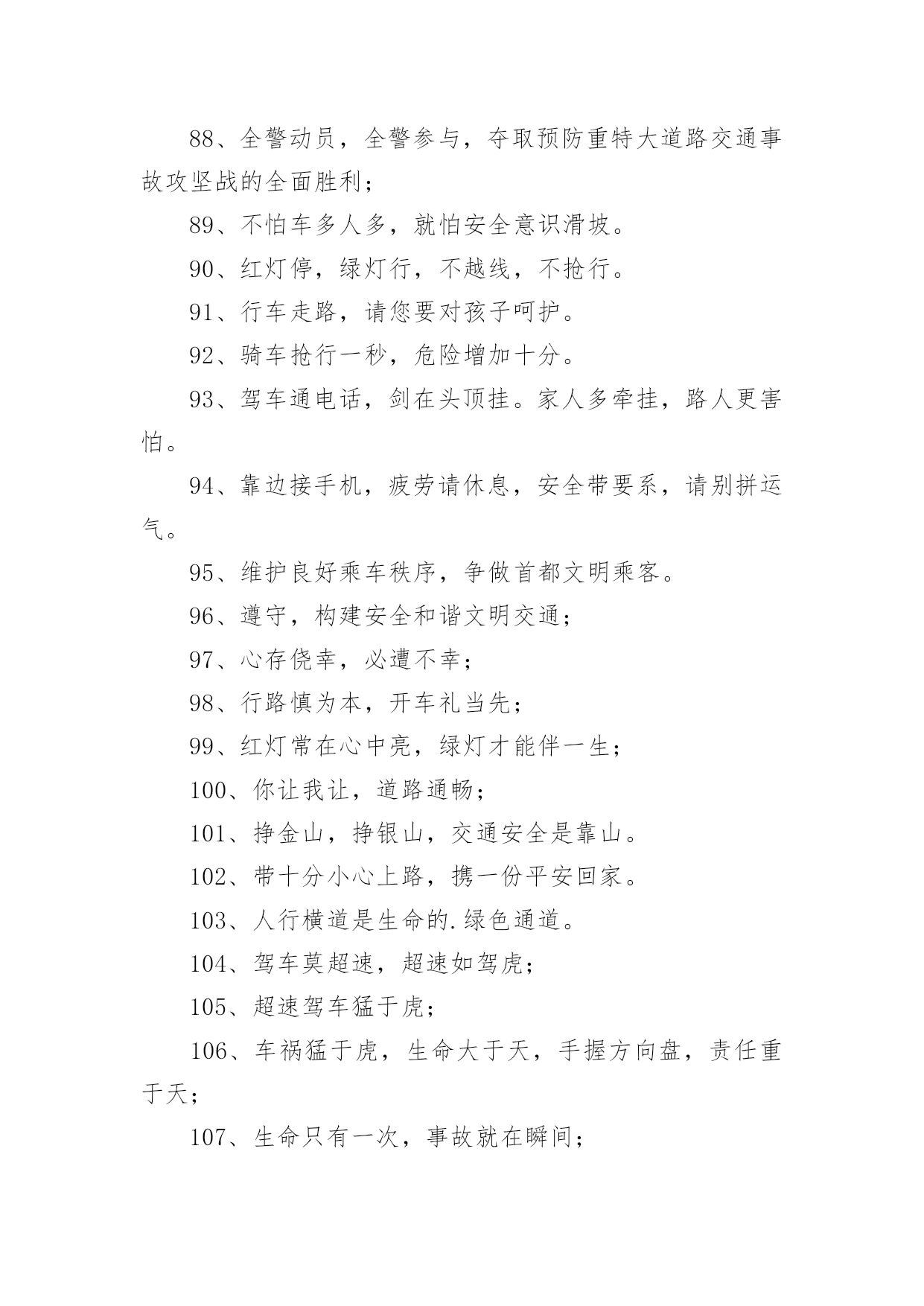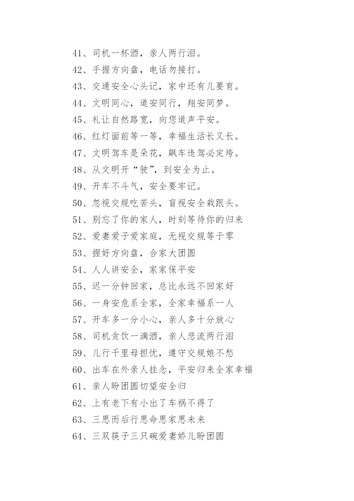 交通安全宣传标语在日常的学习、工作、生活中,大家或多或少都接触过一些经典的标语吧,标语在一定程度上反映了社会经济制度的本质和社会的文明程度,它的意义十分重大。究竟什么样的标语才是好的标语呢?以下是小编为大家收集的交通安全宣传标语,欢迎阅读,希望大家能够喜欢。交通安全宣传标语11、永远不要与生命赛跑。2、抽烟是魔鬼,少活二十岁。3、平安过一生,烟酒勿相碰。4、摒弃烟酒陋习创造健康新未来。5、少喝一杯酒,少抽一只烟,快乐你我他。6、拒绝烟草,珍爱生命。7、无烟校园,清新一片。8、饭后不抽烟,赛过活神仙。9、酒是烈焰,多酌烧身;烟是魔鬼,多抽伤身。10、梦是相反,烟酒是正面一击。11、喜欢你没有烟草和酒精的味道。12、烟,吸进去的是尼古丁,吐出来的是你的生命。13、抽烟喝酒,有害健康。14、健康,随烟而逝;病痛,伴烟而生。15、创建无烟酒校园,共度无烦恼人生。16、填满青春的不应该是烟酒。17、你指尖流逝的不只是烟灰,还有自己的生命。18、人车互礼让,道路更通畅。19、红绿灯下讲文明,斑马线上知荣辱。20、单车双人载,灾祸频频来。21、马路如虎口,劝君多留神。22、禁烟禁酒,幸福你我。23、酒驾害人害己,苦了老婆,害了子女。24、一路礼让一路安,一人安全一家欢。25、相逢是缘份,会车皆有礼。26、红绿灯下见文明,黄白线间现公德。27、实线虚线斑马线,线线都是生命线;大车小车自行车,车车皆当文明车。28、遵守交规,生命安全。29、安全是生命之本,违章是事故之源。30、开文明车,行文明路,做文明人。31、禁止抽烟,别让你的肺为你病变。32、烟酒不沾唇,疾病不伤身。33、禁烟禁酒,创和谐长征。34、要健康别抽烟,要安全别喝酒。35、别让烟酒误了你的一生。36、不要因为烟酒让身体寸步难行。37、遵守交规路路顺畅,文明出行天天平安38、为了健康请戒烟,为了安全请禁酒。39、对酒当歌之时,你们在掉健康值。40、月下一壶酒,家人满脸愁。41、多读书多看报,少喝点酒多睡觉。42、清新世界,全靠无烟。43、吸烟不如清茶,提神何必寻它;喝酒应当适量,七杯不如一杯。44、道路千万条,禁烟禁酒第一条。45、烟酒爽一时,忏悔莫一生。46、烟酒伤身,为了您的身体健康,请远离它们。47、交通法规血凝成,自觉遵守保平安。48、绿灯可以再等,生命不能重来。49、车铃车闸齐全,维系您的安全。50、出门第一事,安全最为先。51、要么是交警的`严格执法,要么是车祸的残酷无情。52、马路不是寻乐场,乱穿乱走把祸闯。53、守法的人以教训换流血,违法的人以流血换教训。54、交岔路口,看清再走。55、超车超速痛快一时,酿成车祸悔恨一生。56、人不斜穿,不车越线,各行其道。57、人车分道,安全确保;各畅其行,互不干扰。58、亲情至上,远离烟酒。59、不抽一支烟,快乐似神仙。60、小小一支烟,危害千千万,小小一瓶酒,折磨你我他。61、禁烟禁酒,你我共同遵守。62、你吸烟的快感,烟吸你的命脉。63、快乐一时,悲哀一生;一时舒爽,一生悄逝。64、违章含泪饮苦酒,安全盛开幸福花。65、交通事故很恐怖,违交法者要止步。66、要为家人想想,请您平安出行。67、一人带“禁品”,全车都遭殃,大家齐制止,安全有保障。68、烟酒一沾,一生负担;烟酒不碰,一世无忧。交通安全宣传标语21、和谐回家路,出行记守法!2、春运安全,情系万家。3、春运之路要顺畅,拒绝违章要守纪。4、道路非比球场,不要合理冲撞。5、安全一直在我心中,文明驾驶在我手中!6、春运安全记心中,时时刻刻不放松。7、认真贯彻“安全第一预防为主”的方针!8、严禁旅客携带易燃易爆危险品乘船!9、全民重视交通安全,大家支持交通建设!10、春运连着你我他,水路安全靠大家。11、春运安全第一位,一路平安你我他。12、请勿超速超员酒后无证和疲劳驾驶车辆13、狭路相逢君先过,并驾齐驱君先行。14、有一种期盼叫回家过年,有一种负责叫文明驾驶。15、人人守春运交规,户户才会齐欢乐!16、确保春运安全,合家欢度春节!17、春运保安全,真情满人间。18、春节回家团圆,莫忘路上交通安全。19、守交规迎春朝旭日,保平安贺喜庆羊年。20、分分秒秒珍惜生命,时时刻刻重视安全21、全力投入春运交通安全维护,打响新年交通安全第一炮!22、保障春运交通安全,营造节日祥和氛围!23、维护道路交通畅通,保障群众出行安全!24、自觉遵守道路交通安全法规,全力确保春运交通安全有序!25、规范行车秩序,严查交通违法,确保春运安全!26、强化春运客运管理,提高春运服务质量!27、春运安全连万家,出行平安你我他!28、春运保安全,真情满人间!29、安全是最好的效益,平安是全家的福气!30、守法规路路平安,慎驾驶家家团圆!31、保障春运交通安全,营造平安祥和的.节日氛围。32、严禁超员超