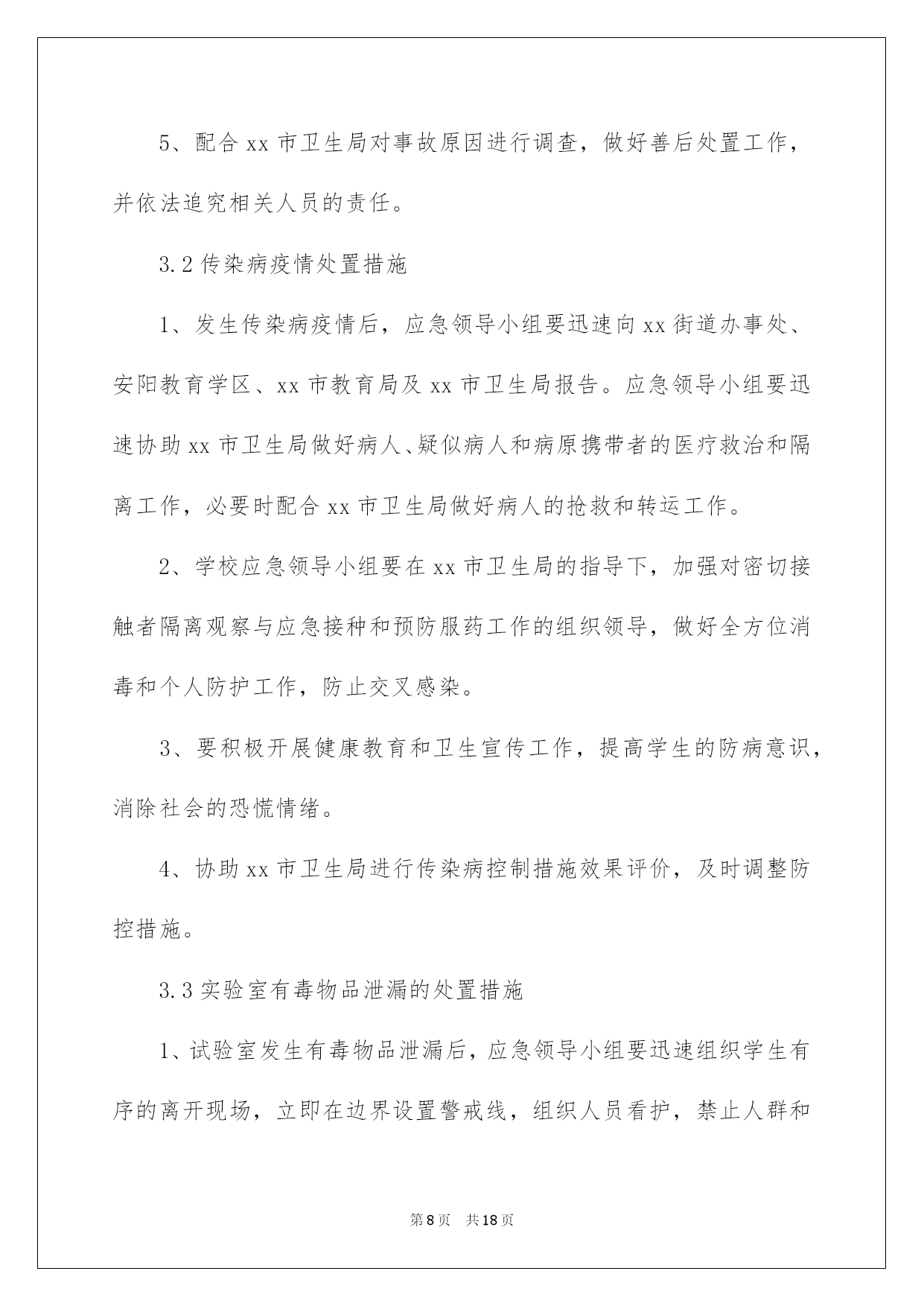 第PAGE\*Arabic\*MERGEFORMAT18页共NUMPAGES\*Arabic\*MERGEFORMAT18页第PAGE\*MERGEFORMAT18页共NUMPAGES\*MERGEFORMAT18页第PAGE\*MERGEFORMAT18页共NUMPAGES\*MERGEFORMAT18页第PAGE\*MERGEFORMAT18页共NUMPAGES\*MERGEFORMAT18页第PAGE\*MERGEFORMAT18页共NUMPAGES\*MERGEFORMAT18页第PAGE\*MERGEFORMAT18页共NUMPAGES\*MERGEFORMAT18页第PAGE\*MERGEFORMAT18页共NUMPAGES\*MERGEFORMAT18页第PAGE\*MERGEFORMAT18页共NUMPAGES\*MERGEFORMAT18页第PAGE\*MERGEFORMAT18页共NUMPAGES\*MERGEFORMAT18页第PAGE\*MERGEFORMAT18页共NUMPAGES\*MERGEFORMAT18页第PAGE\*MERGEFORMAT18页共NUMPAGES\*MERGEFORMAT18页2022小学突发公共事件应急预案小学突发公共事件应急预案在学习、工作乃至生活中,有时会遇到无法预料的突发事故,为了可以及时作出应急响应,降低事故后果,总不可避免地需要事先编制应急预案。那么优秀的应急预案是什么样的呢?下面是我收集整理的小学突发公共事件应急预案,供大家参考借鉴,希望可以帮助到有需要的朋友。小学突发公共事件应急预案1为了保障全校师生员工健康地学习、工作、生活,促进学校各项工作顺利开展,防范杜绝各类突发公共事件的发生,切实有效降低和控制公共突发事件的危害,依照上级有关要求及有关法律法规,从我校实际出发,特制定本预案。一、严格落实行政人员值班制和日情况通报制根据学校安排的值班表,进一步明确任务,细化目标,强化责任,预防为主,努力将工作做在前头,每天值班情况在行政会和教师会时进行简要通报,并填写在校务日志上,发现问题,立即采取相应措施,尽量将问题消灭在萌芽之中,将损失减少到最低程度。出现各类突发公共事件,要立即报告学校综合治理工作领导组,并在5——10分钟内上报区教体局。学校综合治理工作领导小组要本着“先控制,后处置,救人第一,减少损失”的原则,果断处理,积极抢救,组织师生离开危险区域,维护现场秩序,保护好事故现场,积极做好事故善后处理工作。二、突发公共事件向区教体局报告的主要内容是:(1)事件发生基本情况,包括时间、地点、涉及人员、破坏程度及人员伤亡情况;(2)事件发生起因分析、性质的初步判断和影响程度的初步评估;(3)事件发生后学校所采取的应急措施;(4)事态发展状态、处置过程和结果;(5)需要报送的其他事项。三、突发公共事件抢险救灾组织机构总指挥:xx副总指挥:xx成员:xx(1)抢险救灾队伍组长:xx成员:xx年级组长、班主任(2)通讯信息组组长:xx成员:xx(3)后勤保障组组长:xx成员:xx(4)卫生防疫组组长:xx成员:xx班主任三、安全事故抢险应急预备案(1)火灾事故应急预案一、发生火灾事故时,立即向119消防指挥中心报警,并向学校综合治理工作领导小组汇报,同时立即向区教体局报告。二、迅速切断电源。三、抢险救灾组等在场有关人员应用最快的速度在第一时间内疏散师生,把人员撤离到安全区域。四、积极配合消防人员灭火,严禁学生参与灭火。五、在进行灭火的同时,应采取有效的隔离措施,防止火势蔓延。(2)食物中毒应急预案一、发现师生有类似食物中毒症状时,应迅速送至医院诊治。二、迅速向学校综合治理工作领导小组报告,同时立即向区教体局、区卫生防疫部门报告。三、做好所食用食物取样工作,以备卫生部门检验。如果是食用校外食物所致,也积极配合有关部门取样。四、迅速排查食用致毒食物的师生名单,并检查他们的身体状况。五、做好家长、家属的思想工作,稳定他们的情绪。六、积极配合上级有关部门做好诊治、调查、事故处理等工作。(3)其它意外伤害事故应急预案一、如发生师生身体受到意外伤害,特别是交通事故时,应立即拨打122交通事故报警电话,保护好事故现场,及时报告学校综合治理工作领导小组,及时送伤病者到医院诊治或拨打120急救电话。二、视情况及时向xx派出所、区教体局报告(教育科xx,办公室xx)(区卫生局疾控中心电话xx)。三、迅速调查事故发生的原因,并做好有关材料的收集等工作。四、通知伤病者的家属或学生家长。五、妥善处理有关事宜。小学突发公共事件应急预案2为了积极