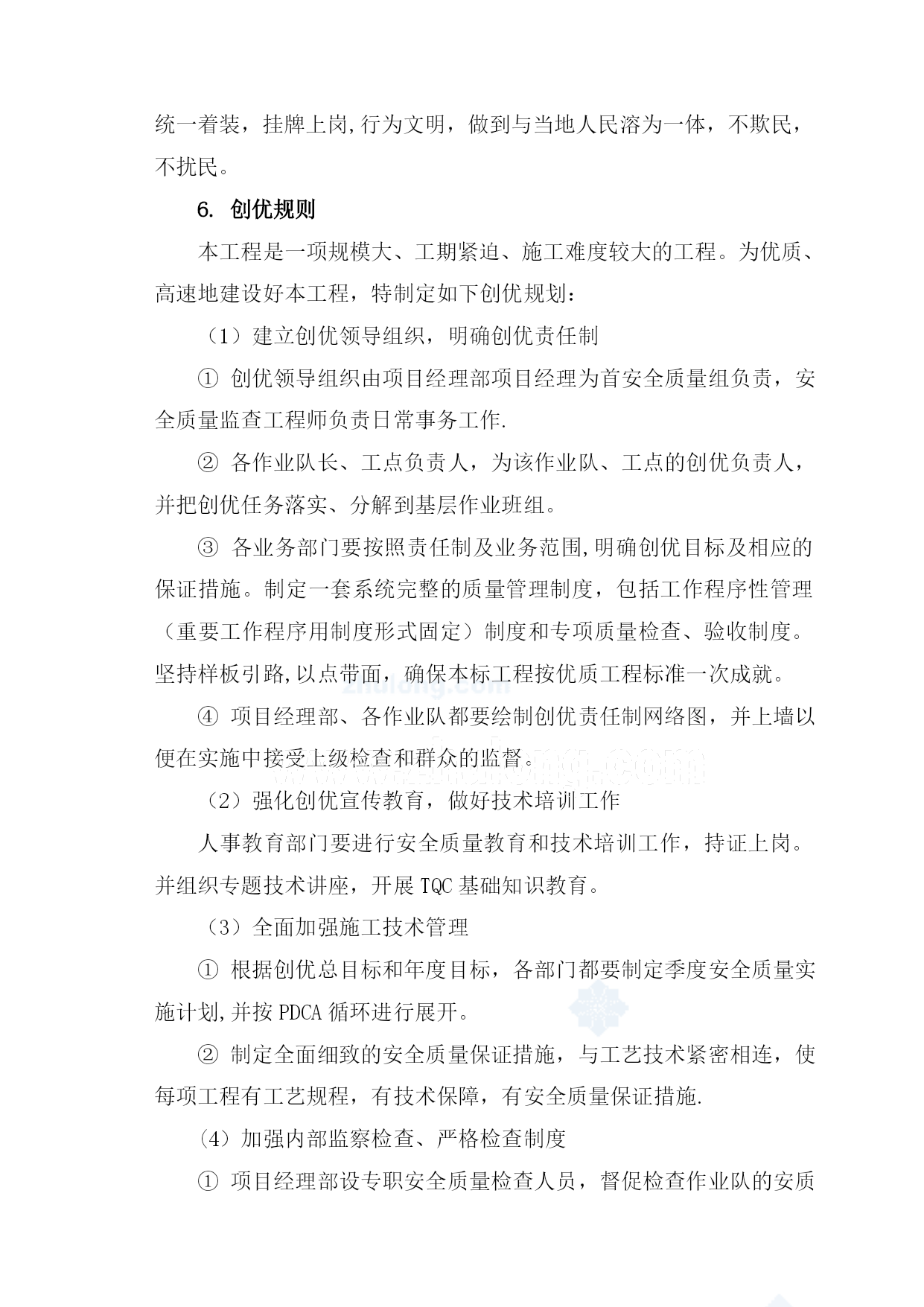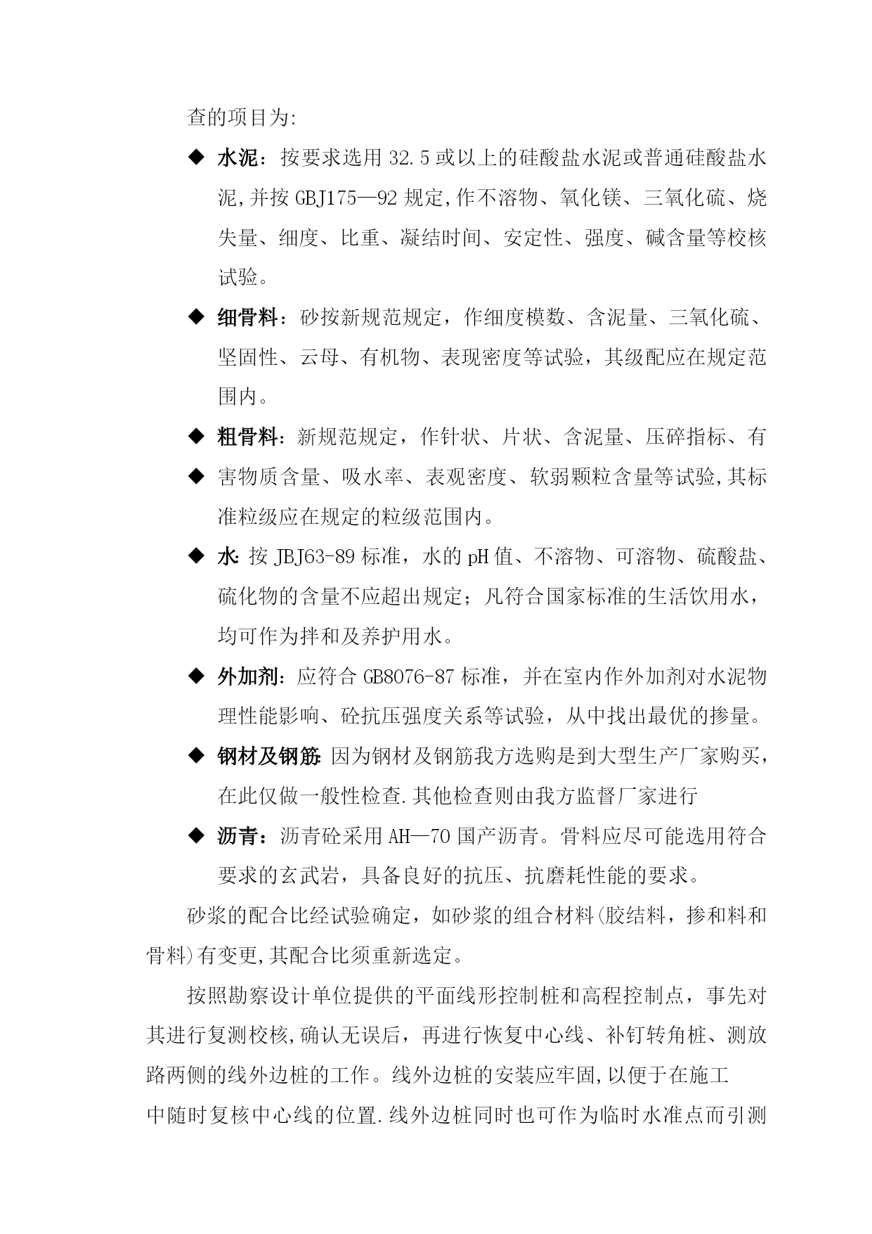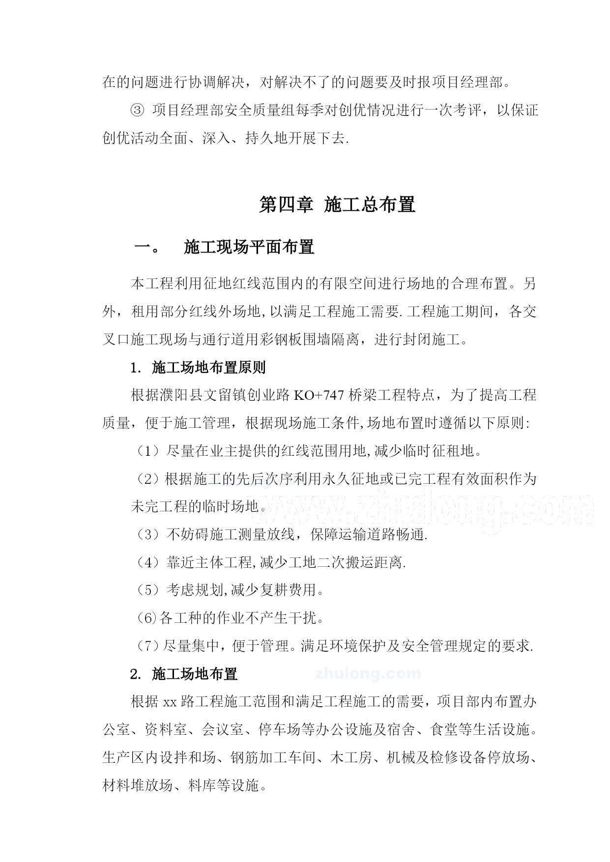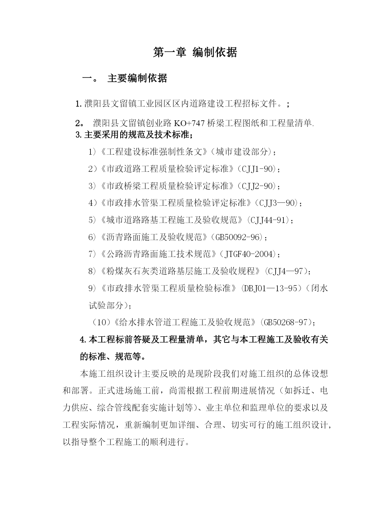 建筑组织施工设计实用文档(实用文档,可以直接使用,可编辑优秀版资料,欢迎下载)第一章编制依据一。主要编制依据1.濮阳县文留镇工业园区区内道路建设工程招标文件。;2。濮阳县文留镇创业路KO+747桥梁工程图纸和工程量清单.3.主要采用的规范及技术标准;1)《工程建设标准强制性条文》(城市建设部分);2)《市政道路工程质量检验评定标准》(CJJ1-90);3)《市政桥梁工程质量检验评定标准》(CJJ2-90);4)《市政排水管渠工程质量检验评定标准》(CJJ3—90);5)《城市道路路基工程施工及验收规范》(CJJ44-91);6)《沥青路面施工及验收规范》(GB50092-96);7)《公路沥青路面施工技术规范》(JTGF40-2004);8)《粉煤灰石灰类道路基层施工及验收规程》(CJJ4—97);9)《市政排水管渠工程质量检验标准》(DBJ01—13-95)(闭水试验部分);(10)《给水排水管道工程施工及验收规范》(GB50268-97);4.本工程标前答疑及工程量清单,其它与本工程施工及验收有关的标准、规范等。本施工组织设计主要反映的是现阶段我们对施工组织的总体设想和部署。正式进场施工前,尚需根据工程前期进展情况(如拆迁、电力供应、综合管线配套实施计划等)、业主单位和监理单位的要求以及工程实际情况,重新编制更加详细、合理、切实可行的施工组织设计,以指导整个工程施工的顺利进行。第二章工程概况概述本工程位于濮阳县文留镇创业路西延及勘探路,工程名称濮阳县文留镇创业路KO+747桥梁工程.本标段包括道路、排水、桥梁等单位工程。施工总目标我们对本项目建设的指导思想是:信守合同、重视质量、科学组织、确保工期。工期目标本工程拟于具备开工条件的地段先行施工,2021年1月15日竣工,施工总工期80日历天.质量目标工程质量符合国家现行有关设计施工及验收规范的有关要求,达到优良。争创省市政示范工程。安全目标安全工作是保质、保量完成施工任务的先决条件,坚决贯彻“预防为主、安全第一”的思想,确保事故发生率为零。环境保护目标工程弃碴,生活垃圾处理及机械噪音均按南通市施工与环境管理办法执行,并积极响应业主提出的其他环保要求,增强职工的环保意识,做到环保深入人心,争创环境保护先进单位.文明施工目标文明施工目标:争创省文明工地。遵照业主有关文明施工要求,配制各类牌图和宣传标语,施工人员统一着装,挂牌上岗,行为文明,做到与当地人民溶为一体,不欺民,不扰民。创优规则本工程是一项规模大、工期紧迫、施工难度较大的工程。为优质、高速地建设好本工程,特制定如下创优规划:(1)建立创优领导组织,明确创优责任制①创优领导组织由项目经理部项目经理为首安全质量组负责,安全质量监查工程师负责日常事务工作.②各作业队长、工点负责人,为该作业队、工点的创优负责人,并把创优任务落实、分解到基层作业班组。③各业务部门要按照责任制及业务范围,明确创优目标及相应的保证措施。制定一套系统完整的质量管理制度,包括工作程序性管理(重要工作程序用制度形式固定)制度和专项质量检查、验收制度。坚持样板引路,以点带面,确保本标工程按优质工程标准一次成就。④项目经理部、各作业队都要绘制创优责任制网络图,并上墙以便在实施中接受上级检查和群众的监督。(2)强化创优宣传教育,做好技术培训工作人事教育部门要进行安全质量教育和技术培训工作,持证上岗。并组织专题技术讲座,开展TQC基础知识教育。(3)全面加强施工技术管理①根据创优总目标和年度目标,各部门都要制定季度安全质量实施计划,并按PDCA循环进行展开。②制定全面细致的安全质量保证措施,与工艺技术紧密相连,使每项工程有工艺规程,有技术保障,有安全质量保证措施.(4)加强内部监察检查、严格检查制度①项目经理部设专职安全质量检查人员,督促检查作业队的安质工作,并做到严格把关,协调服务,作业队设立安质室,人员配备应满足工作需要.各作业队应配专职安全检查质量检查人员.②各作业队、各工点要认真进行分项工程细目检查验评定工作,按每月施工项目进行自检和自评,项目经理部抽查当月的验评项目总数的25%,对未达到验标“优良"的分项工程以返工,重新验评,直到要求为止,如数据不真实,不得验评。③各级监察、检查人员对违章指挥、违章施工,不遵守工艺细则,有权提出劝阻和警告或处以罚款,对安全质量做出突出贡献的个人和集体,有权提出建议,请求领导给予适当奖励。(5)大力推行运用新技术、新材料、新工艺、新设备、深入开展QC小组攻关活动,并推广运用先进合理办法.①对技术密集的工程项目,要认真做好实施性组织设计,编制详尽的施工工艺及技术措施,拟定攻关课题,积极开展小组活动,确保一
