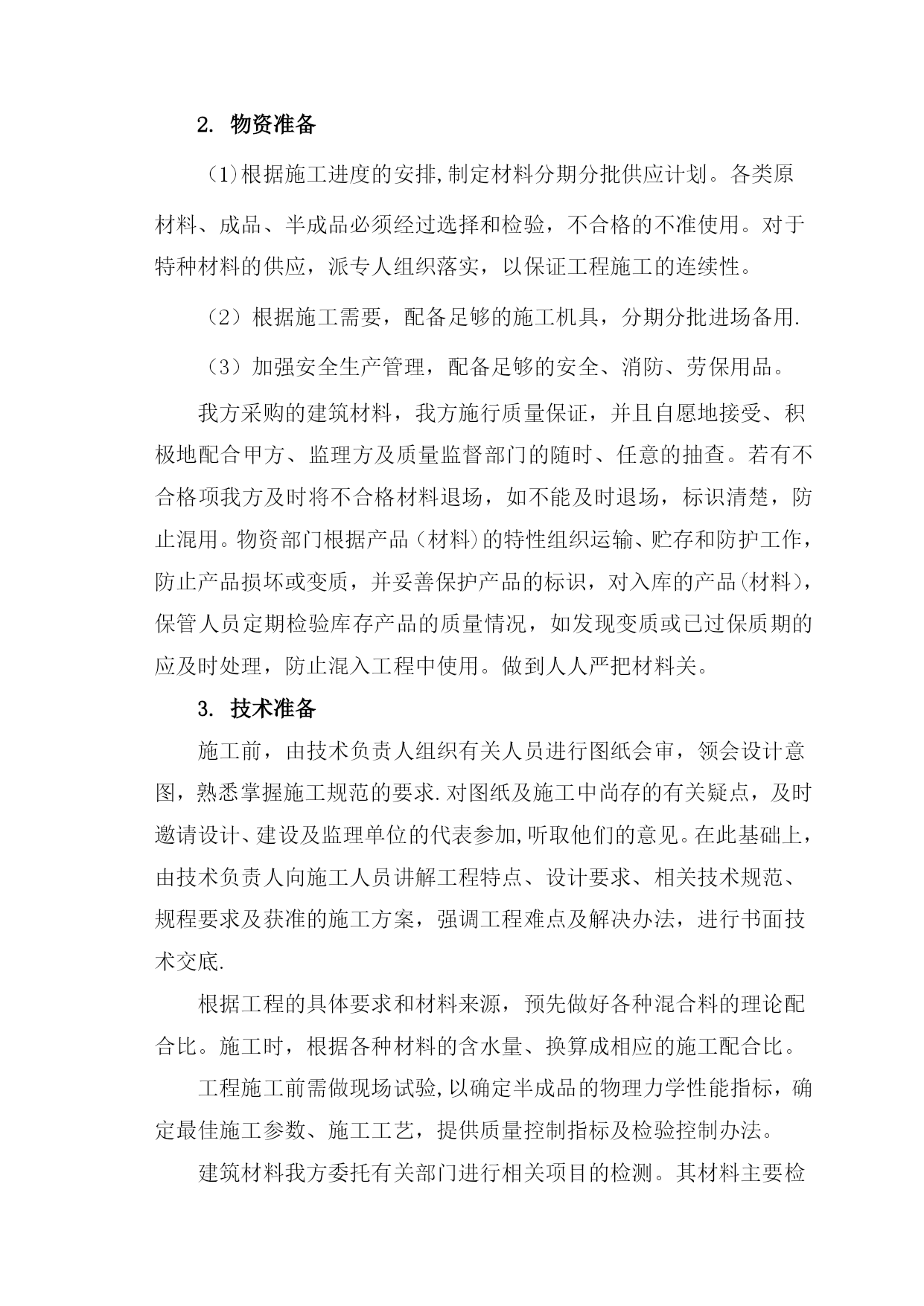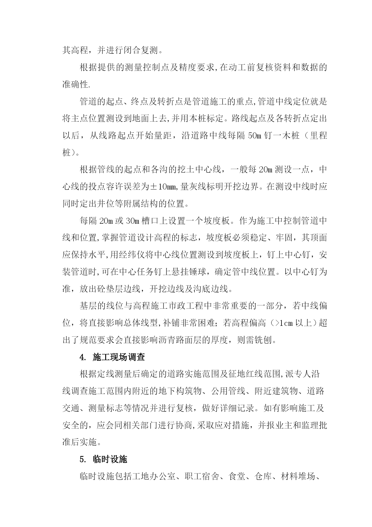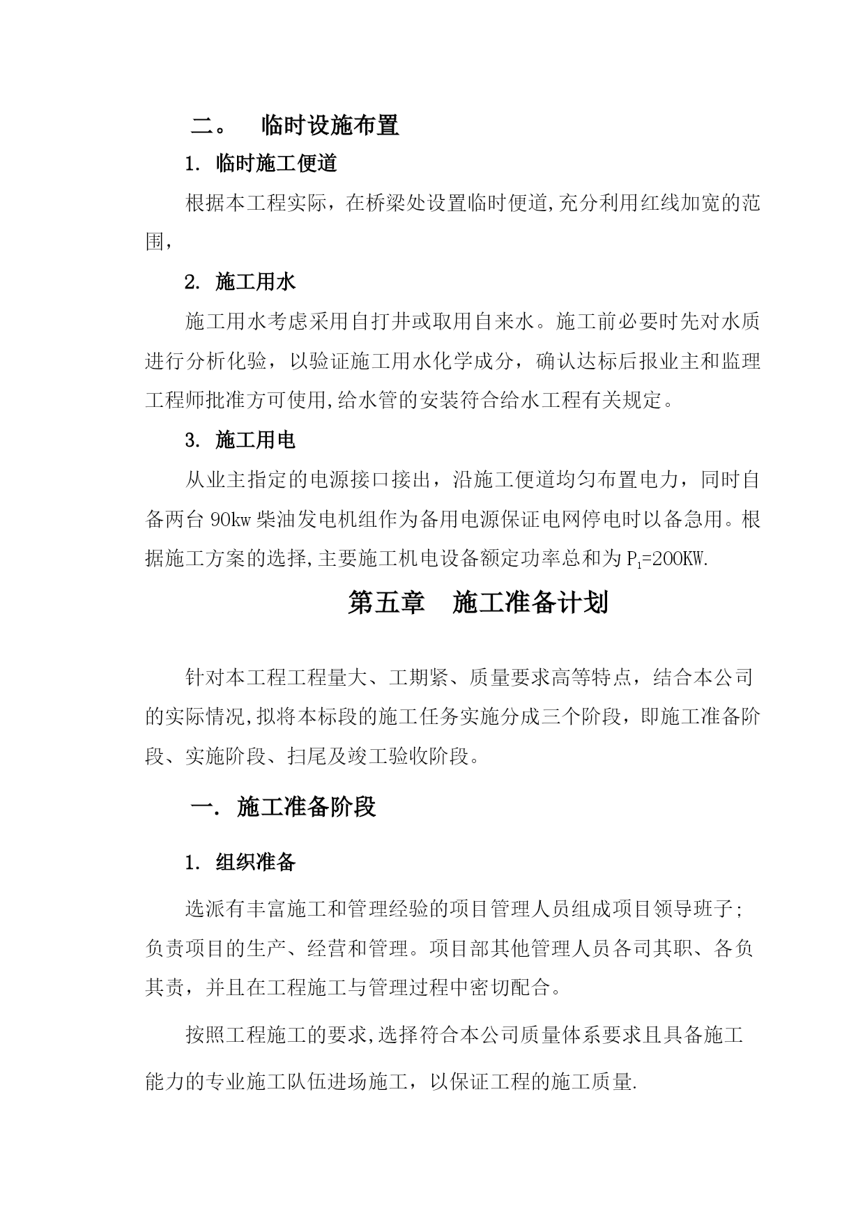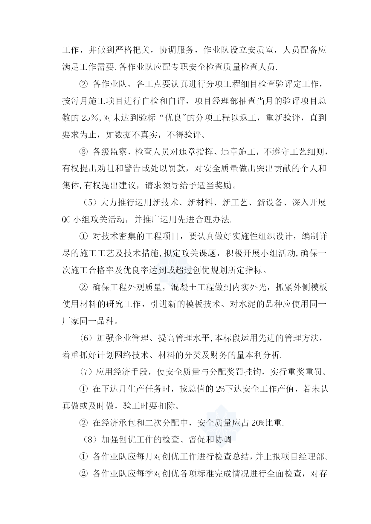 建筑组织施工设计实用文档(实用文档,可以直接使用,可编辑优秀版资料,欢迎下载)第一章编制依据一。主要编制依据1.濮阳县文留镇工业园区区内道路建设工程招标文件。;2。濮阳县文留镇创业路KO+747桥梁工程图纸和工程量清单.3.主要采用的规范及技术标准;1)《工程建设标准强制性条文》(城市建设部分);2)《市政道路工程质量检验评定标准》(CJJ1-90);3)《市政桥梁工程质量检验评定标准》(CJJ2-90);4)《市政排水管渠工程质量检验评定标准》(CJJ3—90);5)《城市道路路基工程施工及验收规范》(CJJ44-91);6)《沥青路面施工及验收规范》(GB50092-96);7)《公路沥青路面施工技术规范》(JTGF40-2004);8)《粉煤灰石灰类道路基层施工及验收规程》(CJJ4—97);9)《市政排水管渠工程质量检验标准》(DBJ01—13-95)(闭水试验部分);(10)《给水排水管道工程施工及验收规范》(GB50268-97);4.本工程标前答疑及工程量清单,其它与本工程施工及验收有关的标准、规范等。本施工组织设计主要反映的是现阶段我们对施工组织的总体设想和部署。正式进场施工前,尚需根据工程前期进展情况(如拆迁、电力供应、综合管线配套实施计划等)、业主单位和监理单位的要求以及工程实际情况,重新编制更加详细、合理、切实可行的施工组织设计,以指导整个工程施工的顺利进行。第二章工程概况概述本工程位于濮阳县文留镇创业路西延及勘探路,工程名称濮阳县文留镇创业路KO+747桥梁工程.本标段包括道路、排水、桥梁等单位工程。施工总目标我们对本项目建设的指导思想是:信守合同、重视质量、科学组织、确保工期。工期目标本工程拟于具备开工条件的地段先行施工,2021年1月15日竣工,施工总工期80日历天.质量目标工程质量符合国家现行有关设计施工及验收规范的有关要求,达到优良。争创省市政示范工程。安全目标安全工作是保质、保量完成施工任务的先决条件,坚决贯彻“预防为主、安全第一”的思想,确保事故发生率为零。环境保护目标工程弃碴,生活垃圾处理及机械噪音均按南通市施工与环境管理办法执行,并积极响应业主提出的其他环保要求,增强职工的环保意识,做到环保深入人心,争创环境保护先进单位.文明施工目标文明施工目标:争创省文明工地。遵照业主有关文明施工要求,配制各类牌图和宣传标语,施工人员统一着装,挂牌上岗,行为文明,做到与当地人民溶为一体,不欺民,不扰民。创优规则本工程是一项规模大、工期紧迫、施工难度较大的工程。为优质、高速地建设好本工程,特制定如下创优规划:(1)建立创优领导组织,明确创优责任制①创优领导组织由项目经理部项目经理为首安全质量组负责,安全质量监查工程师负责日常事务工作.②各作业队长、工点负责人,为该作业队、工点的创优负责人,并把创优任务落实、分解到基层作业班组。③各业务部门要按照责任制及业务范围,明确创优目标及相应的保证措施。制定一套系统完整的质量管理制度,包括工作程序性管理(重要工作程序用制度形式固定)制度和专项质量检查、验收制度。坚持样板引路,以点带面,确保本标工程按优质工程标准一次成就。④项目经理部、各作业队都要绘制创优责任制网络图,并上墙以便在实施中接受上级检查和群众的监督。(2)强化创优宣传教育,做好技术培训工作人事教育部门要进行安全质量教育和技术培训工作,持证上岗。并组织专题技术讲座,开展TQC基础知识教育。(3)全面加强施工技术管理①根据创优总目标和年度目标,各部门都要制定季度安全质量实施计划,并按PDCA循环进行展开。②制定全面细致的安全质量保证措施,与工艺技术紧密相连,使每项工程有工艺规程,有技术保障,有安全质量保证措施.(4)加强内部监察检查、严格检查制度①项目经理部设专职安全质量检查人员,督促检查作业队的安质工作,并做到严格把关,协调服务,作业队设立安质室,人员配备应满足工作需要.各作业队应配专职安全检查质量检查人员.②各作业队、各工点要认真进行分项工程细目检查验评定工作,按每月施工项目进行自检和自评,项目经理部抽查当月的验评项目总数的25%,对未达到验标“优良"的分项工程以返工,重新验评,直到要求为止,如数据不真实,不得验评。③各级监察、检查人员对违章指挥、违章施工,不遵守工艺细则,有权提出劝阻和警告或处以罚款,对安全质量做出突出贡献的个人和集体,有权提出建议,请求领导给予适当奖励。(5)大力推行运用新技术、新材料、新工艺、新设备、深入开展QC小组攻关活动,并推广运用先进合理办法.①对技术密集的工程项目,要认真做好实施性组织设计,编制详尽的施工工艺及技术措施,拟定攻关课题,积极开展小组活动,确保一