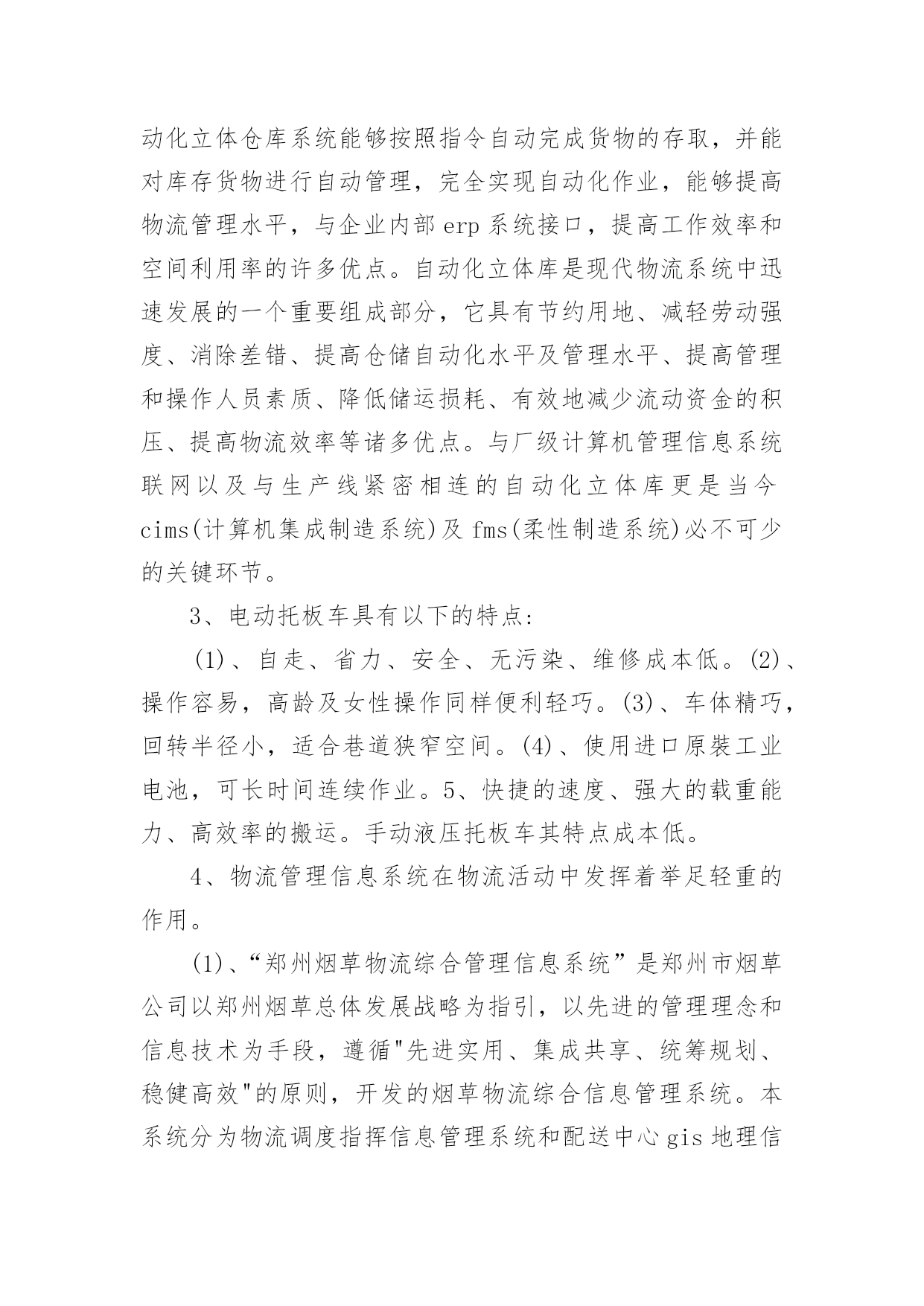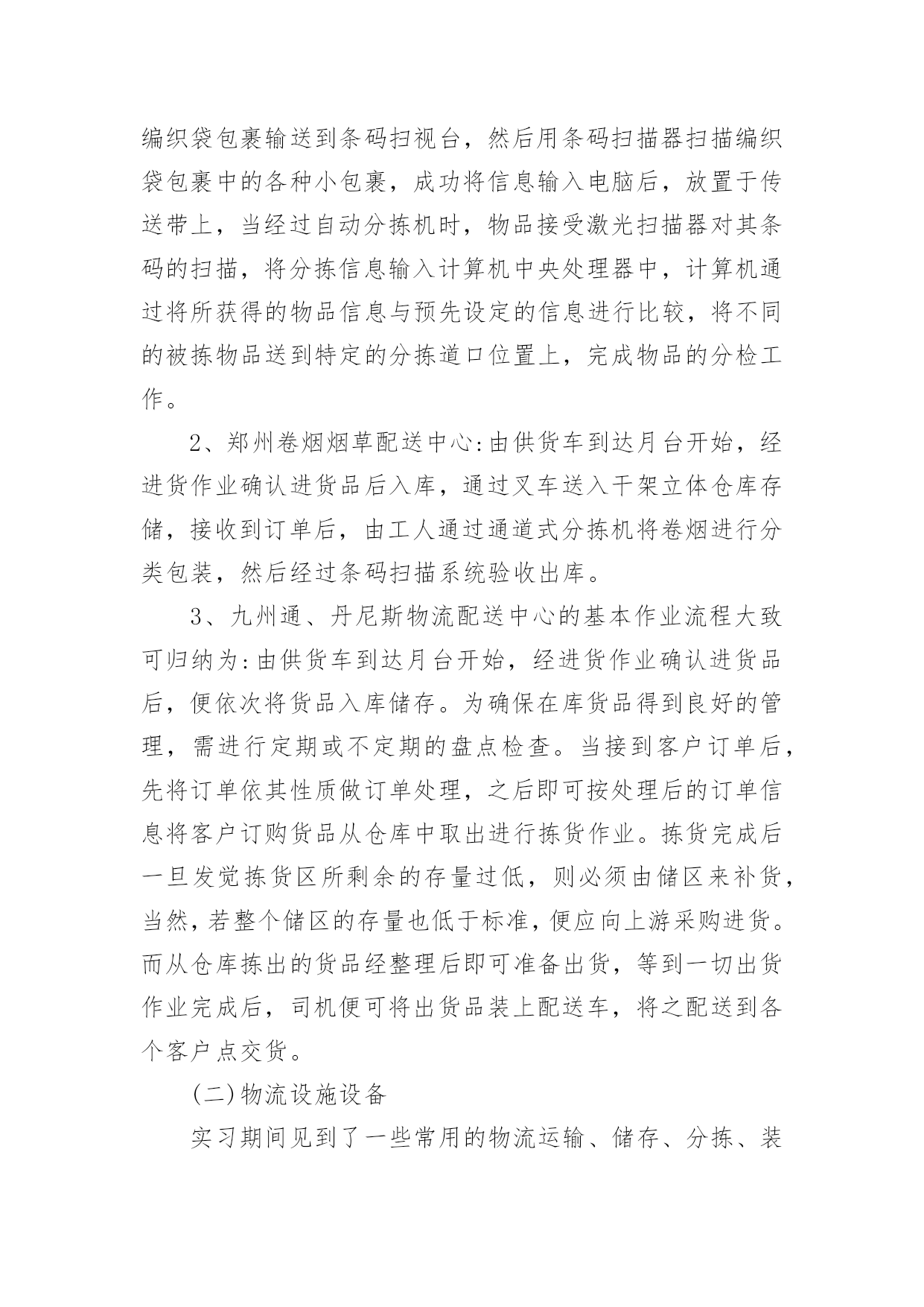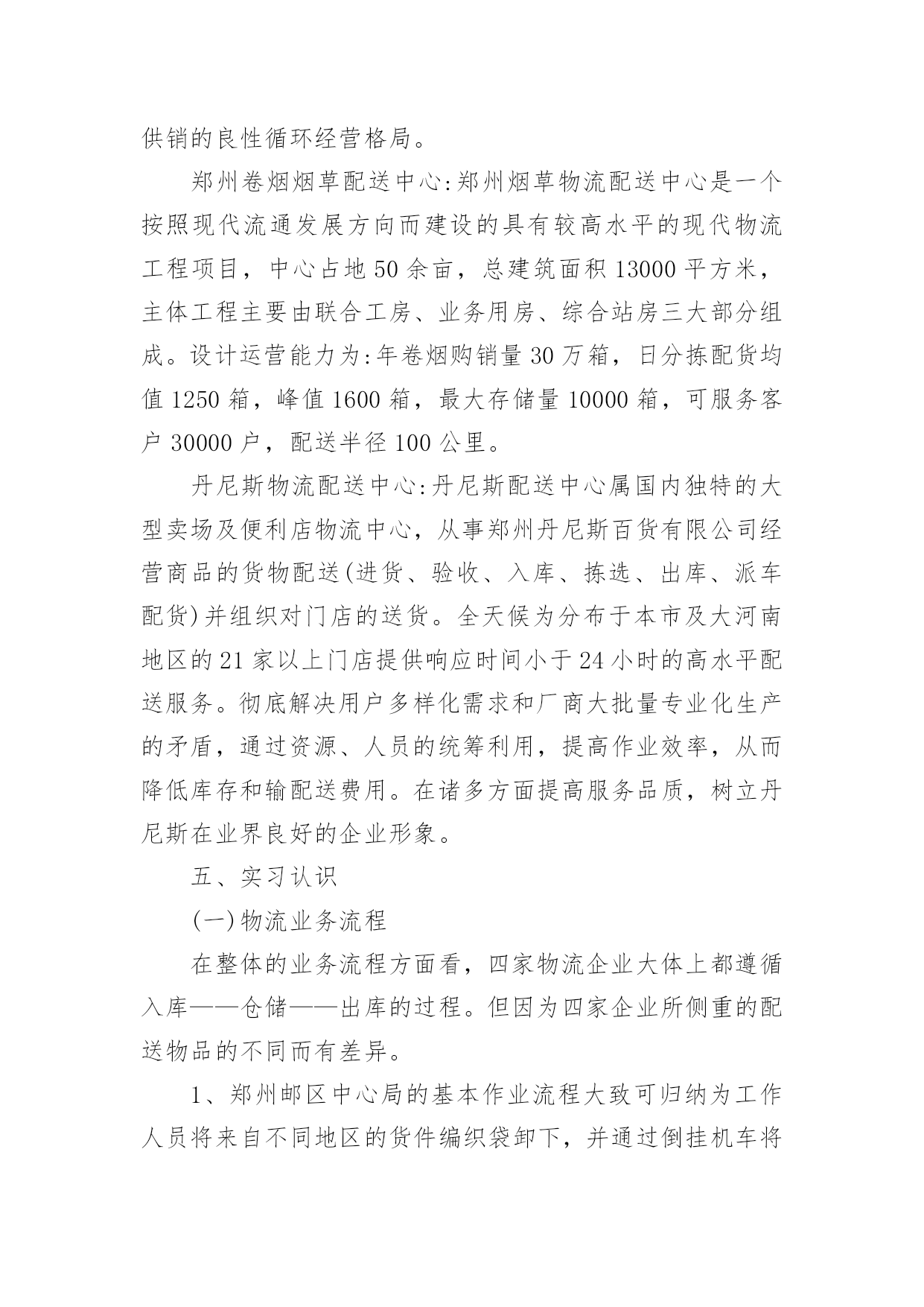 物流专业的实习报告物流专业的实习报告模板5篇在现实生活中,报告与我们愈发关系密切,要注意报告在写作时具有一定的格式。写起报告来就毫无头绪?以下是小编收集整理的物流专业的实习报告模板5篇,欢迎大家借鉴与参考,希望对大家有所帮助。物流专业的实习报告模板5篇1一、认识实习目的物流管理专业的认识实习,是学生在完成教学计划规定的相关专业基础课程后所进行的综合性实习,是课堂教学的延伸和补充,是理论联系实际的重要教学环节。通过到不同企业的参观实习,使物流管理专业学生在理论学习的基础上,能直观地接触实际工作和具体业务,进一步熟悉物流管理的工作内容,了解物流管理运作流程和方法,弥补单纯课堂教学的不足,进一步掌握所学理论,做到理论与实践相结合,提高学生分析和解决实际问题的能力,培养学生合作意识、创新精神和实践能力,为深入学习后续物流专业课程以及将来走上工作岗位打下一定基础。1、通过认识实习,较全面地了解物流实际环节、企业的物流流程,一般的岗位操作技能和方法;2、进一步消化和深化已学到的物流管理知识,并为以后的物流管理专业课程学习作好准备;3、培养发现问题、分析问题、解决具体事物的能力;4、培养理论和实践相结合的能力。二、认识实习基本内容1、宏观层次(1)企业发展基本概况,如企业发展历史、企业家简介、企业定位、企业主要经营范围、企业规模、组织结构、供应链组成和市场竞争状况等。认识实习报告范文。(2)熟悉企业的业务特点、基本工作程序、流转过程,如采购、储存、配货等。(3)企业管理信息系统的使用情况和特点以及相关软件的使用情况。(4)企业文化、客户服务的内容和方式、企业的发展前景。(5)企业现存的问题,结合企业的现实,寻求解决的办法。2、微观层次微观层次的实习分物流业务流程、物流设施设备、物流设施规划三部分。(1)物流业务流程。如订单处理、商品流通、仓储、包装、运输、配送等物流业务,学生根据货物的实际流动用物流系统的相关知识对物流业务流程进行分析。认识实习报告范文。(2)物流设施设备。参观常用的物流运输、储存、分拣、装卸搬运、信息处理等物流设施设备,如货架、起重机、输送机、叉车、堆垛机、托盘、集装箱等,了解简单操作并对工作场合、工作流程、工作要求进行学习和了解。(3)物流设施规划。着重了解工厂总平面布置、车间布置及物料搬运系统等内容,其目标是通过对工厂各组成部分相互关系的分析,进行合理布置,得到高效运行的生产系统,获得最佳的经济效益和社会效益。三、认识实习时间5月3日至5月8日四、认识实习地点郑州邮区中心局:属于国家二级中心局,是全国重要的邮政枢纽,担负着十分重要的邮政通信任务,长期以来,郑州邮区中心局就在全网发挥着举足轻重的作用。它具有邮件分拣封发、邮件接发、邮件运输、报刊分发、邮件容器管理调拨、全省报刊汇总要数等职能,担负着5条火车邮路、7条省际汽车邮路、16条29个班次二级干线邮件运输任务,昼夜接发火车58趟次,汽车108趟,30个一级干线航班,日接发转运邮件5万余袋,旺季日最高量达到7多万袋;郑州邮区中心局邮件接发量和邮件中转量均居全国前列。河南九州通医药物流中心:河南九州通医药有限公司于20xx年2月正式开业。其经营范围宽广,经营产品品种齐全。销售网络以河南省为中心,辐射到陕西、山西、宁夏、安徽、河北等周边省区。20xx年实现对外销售收入13亿元,已成为河南省规模最大的医药物流企业。在河南九州通正在形成,低成本经营、快速周转、大数量销售、全品种代理、多客户供销的良性循环经营格局。郑州卷烟烟草配送中心:郑州烟草物流配送中心是一个按照现代流通发展方向而建设的具有较高水平的现代物流工程项目,中心占地50余亩,总建筑面积13000平方米,主体工程主要由联合工房、业务用房、综合站房三大部分组成。设计运营能力为:年卷烟购销量30万箱,日分拣配货均值1250箱,峰值1600箱,最大存储量10000箱,可服务客户30000户,配送半径100公里。丹尼斯物流配送中心:丹尼斯配送中心属国内独特的大型卖场及便利店物流中心,从事郑州丹尼斯百货有限公司经营商品的货物配送(进货、验收、入库、拣选、出库、派车配货)并组织对门店的送货。全天候为分布于本市及大河南地区的21家以上门店提供响应时间小于24小时的高水平配送服务。彻底解决用户多样化需求和厂商大批量专业化生产的矛盾,通过资源、人员的统筹利用,提高作业效率,从而降低库存和输配送费用。在诸多方面提高服务品质,树立丹尼斯在业界良好的企业形象。五、实习认识(一)物流业务流程在整体的业务流程方面看,四家物流企业大体上都遵循入库——仓储——出库的过程。但因为四家企业所侧重的配送物品的不同而有差异。1、郑州邮区中心局的基本作业流程大致可归纳为工作人员将来自不同地区的货件编织袋卸下,并通过倒挂机车将编织袋包裹输送到条码扫视台,然