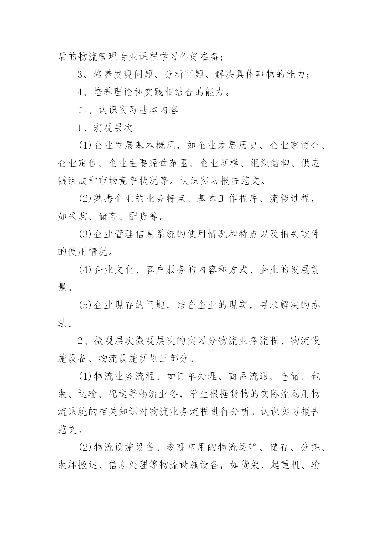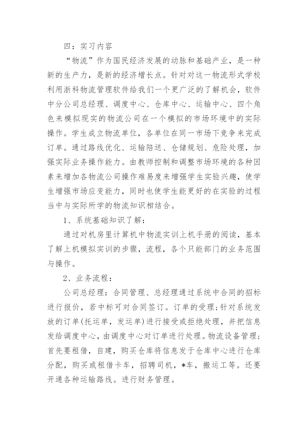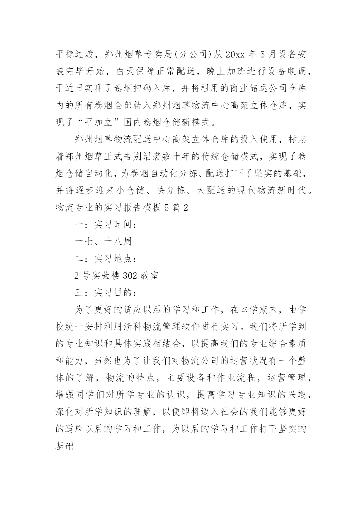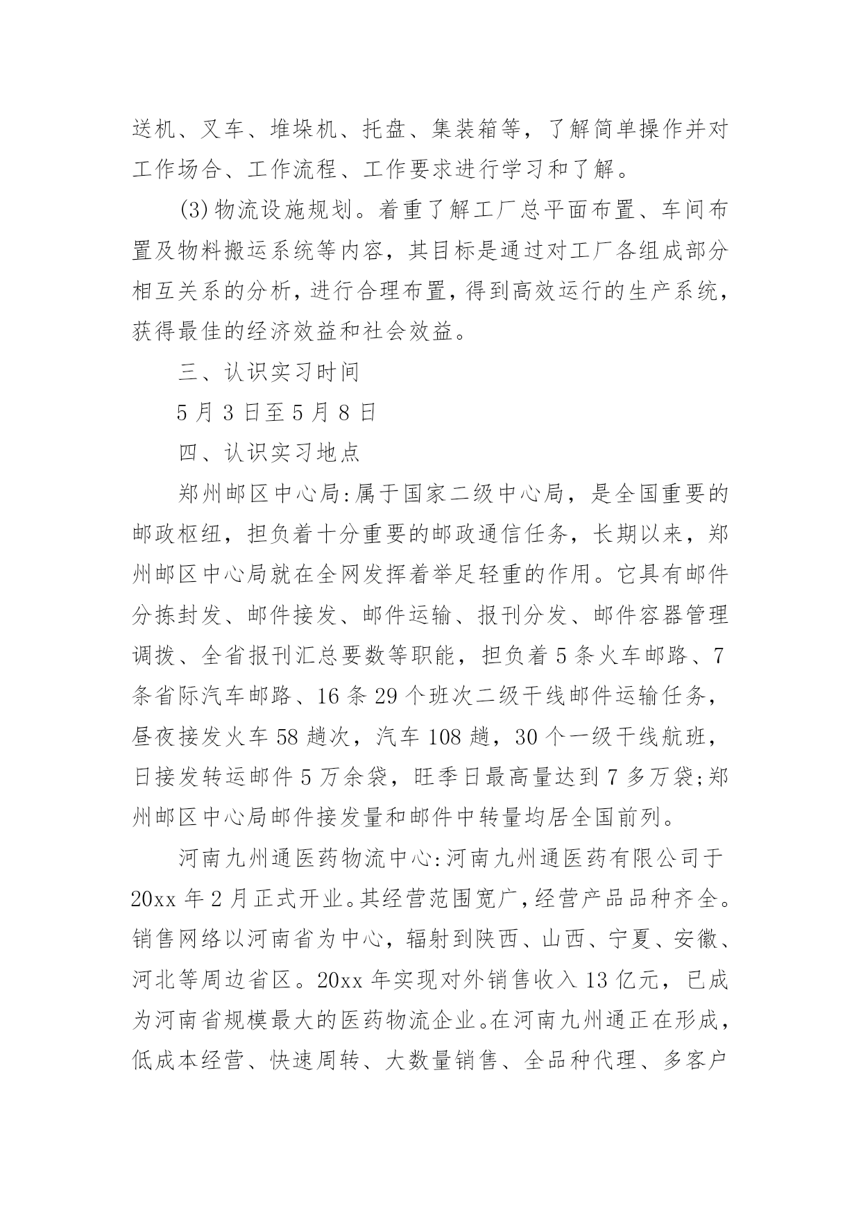物流专业的实习报告物流专业的实习报告模板5篇在现实生活中,报告与我们愈发关系密切,要注意报告在写作时具有一定的格式。写起报告来就毫无头绪?以下是小编收集整理的物流专业的实习报告模板5篇,欢迎大家借鉴与参考,希望对大家有所帮助。物流专业的实习报告模板5篇1一、认识实习目的物流管理专业的认识实习,是学生在完成教学计划规定的相关专业基础课程后所进行的综合性实习,是课堂教学的延伸和补充,是理论联系实际的重要教学环节。通过到不同企业的参观实习,使物流管理专业学生在理论学习的基础上,能直观地接触实际工作和具体业务,进一步熟悉物流管理的工作内容,了解物流管理运作流程和方法,弥补单纯课堂教学的不足,进一步掌握所学理论,做到理论与实践相结合,提高学生分析和解决实际问题的能力,培养学生合作意识、创新精神和实践能力,为深入学习后续物流专业课程以及将来走上工作岗位打下一定基础。1、通过认识实习,较全面地了解物流实际环节、企业的物流流程,一般的岗位操作技能和方法;2、进一步消化和深化已学到的物流管理知识,并为以后的物流管理专业课程学习作好准备;3、培养发现问题、分析问题、解决具体事物的能力;4、培养理论和实践相结合的能力。二、认识实习基本内容1、宏观层次(1)企业发展基本概况,如企业发展历史、企业家简介、企业定位、企业主要经营范围、企业规模、组织结构、供应链组成和市场竞争状况等。认识实习报告范文。(2)熟悉企业的业务特点、基本工作程序、流转过程,如采购、储存、配货等。(3)企业管理信息系统的使用情况和特点以及相关软件的使用情况。(4)企业文化、客户服务的内容和方式、企业的发展前景。(5)企业现存的问题,结合企业的现实,寻求解决的办法。2、微观层次微观层次的实习分物流业务流程、物流设施设备、物流设施规划三部分。(1)物流业务流程。如订单处理、商品流通、仓储、包装、运输、配送等物流业务,学生根据货物的实际流动用物流系统的相关知识对物流业务流程进行分析。认识实习报告范文。(2)物流设施设备。参观常用的物流运输、储存、分拣、装卸搬运、信息处理等物流设施设备,如货架、起重机、输送机、叉车、堆垛机、托盘、集装箱等,了解简单操作并对工作场合、工作流程、工作要求进行学习和了解。(3)物流设施规划。着重了解工厂总平面布置、车间布置及物料搬运系统等内容,其目标是通过对工厂各组成部分相互关系的分析,进行合理布置,得到高效运行的生产系统,获得最佳的经济效益和社会效益。三、认识实习时间5月3日至5月8日四、认识实习地点郑州邮区中心局:属于国家二级中心局,是全国重要的邮政枢纽,担负着十分重要的邮政通信任务,长期以来,郑州邮区中心局就在全网发挥着举足轻重的作用。它具有邮件分拣封发、邮件接发、邮件运输、报刊分发、邮件容器管理调拨、全省报刊汇总要数等职能,担负着5条火车邮路、7条省际汽车邮路、16条29个班次二级干线邮件运输任务,昼夜接发火车58趟次,汽车108趟,30个一级干线航班,日接发转运邮件5万余袋,旺季日最高量达到7多万袋;郑州邮区中心局邮件接发量和邮件中转量均居全国前列。河南九州通医药物流中心:河南九州通医药有限公司于20xx年2月正式开业。其经营范围宽广,经营产品品种齐全。销售网络以河南省为中心,辐射到陕西、山西、宁夏、安徽、河北等周边省区。20xx年实现对外销售收入13亿元,已成为河南省规模最大的医药物流企业。在河南九州通正在形成,低成本经营、快速周转、大数量销售、全品种代理、多客户供销的良性循环经营格局。郑州卷烟烟草配送中心:郑州烟草物流配送中心是一个按照现代流通发展方向而建设的具有较高水平的现代物流工程项目,中心占地50余亩,总建筑面积13000平方米,主体工程主要由联合工房、业务用房、综合站房三大部分组成。设计运营能力为:年卷烟购销量30万箱,日分拣配货均值1250箱,峰值1600箱,最大存储量10000箱,可服务客户30000户,配送半径100公里。丹尼斯物流配送中心:丹尼斯配送中心属国内独特的大型卖场及便利店物流中心,从事郑州丹尼斯百货有限公司经营商品的货物配送(进货、验收、入库、拣选、出库、派车配货)并组织对门店的送货。全天候为分布于本市及大河南地区的21家以上门店提供响应时间小于24小时的高水平配送服务。彻底解决用户多样化需求和厂商大批量专业化生产的矛盾,通过资源、人员的统筹利用,提高作业效率,从而降低库存和输配送费用。在诸多方面提高服务品质,树立丹尼斯在业界良好的企业形象。五、实习认识(一)物流业务流程在整体的业务流程方面看,四家物流企业大体上都遵循入库——仓储——出库的过程。但因为四家企业所侧重的配送物品的不同而有差异。1、郑州邮区中心局的基本作业流程大致可归纳为工作人员将来自不同地区的货件编织袋卸下,并通过倒挂机车将编织袋包裹输送到条码扫视台,然