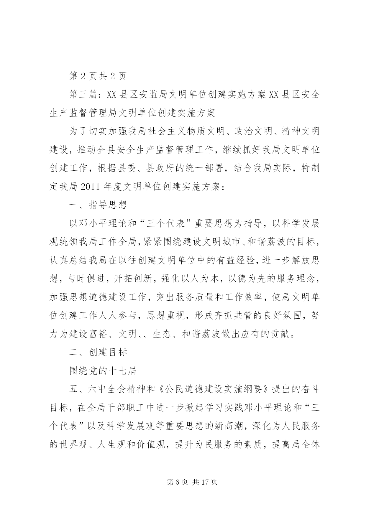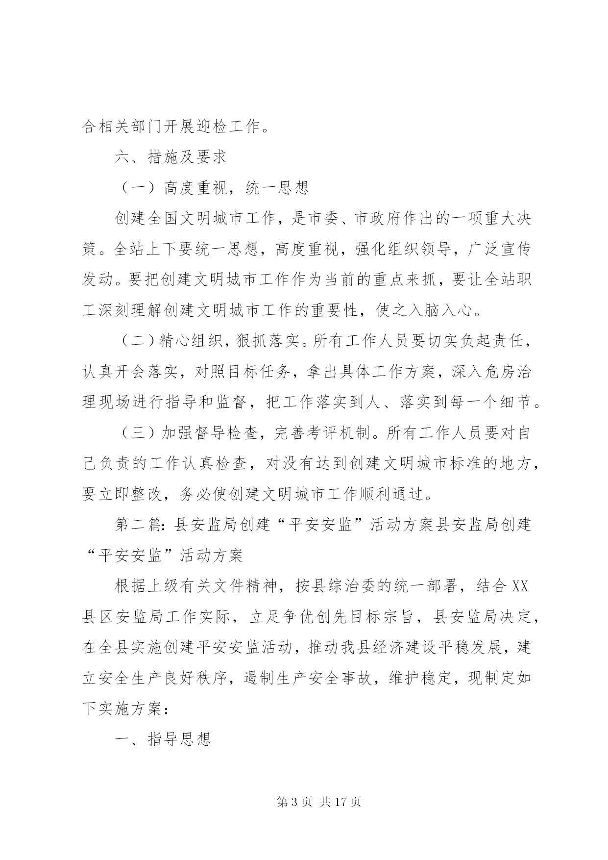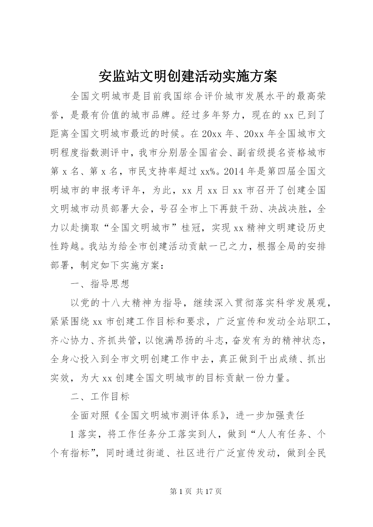 第PAGE\*Arabic\*MERGEFORMAT17页共NUMPAGES\*MERGEFORMAT17页安监站文明创建活动实施方案全国文明城市是目前我国综合评价城市发展水平的最高荣誉,是最有价值的城市品牌。经过多年努力,现在的xx已到了距离全国文明城市最近的时候。在20xx年、20xx年全国城市文明程度指数测评中,我市分别居全国省会、副省级提名资格城市第x名、第x名,市民支持率超过xx%。2014年是第四届全国文明城市的申报考评年,为此,xx月xx日xx市召开了创建全国文明城市动员部署大会,号召全市上下再鼓干劲、决战决胜,全力以赴摘取“全国文明城市”桂冠,实现xx精神文明建设历史性跨越。我站为给全市创建活动贡献一己之力,根据全局的安排部署,制定如下实施方案:一、指导思想以党的十八大精神为指导,继续深入贯彻落实科学发展观,紧紧围绕xx市创建工作目标和要求,广泛宣传和发动全站职工,齐心协力、齐抓共管,以饱满昂扬的斗志,奋发有为的精神状态,全身心投入到全市文明创建工作中去,真正做到干出成绩、抓出实效,为大xx创建全国文明城市的目标贡献一份力量。二、工作目标全面对照《全国文明城市测评体系》,进一步加强责任1落实,将工作任务分工落实到人,做到“人人有任务、个个有指标”,同时通过街道、社区进行广泛宣传发动,做到全民共同参与、共同监督,围绕房屋安全检查、危房巡查,特别是危房治理等重点、难点问题开展工作,努力在创建考核中圆满完成各项责任分解指标,确保相应测评指标达标,全面实现创建目标。三、创建步骤根据xx区文明城市创建工作的部署和安排,结合本站工作实际,将“创建”工作分成以下三个阶段进行实施:第一阶段:宣传、发动阶段(2014年10月)1、层层发动、广泛动员。组织街道、社区,发动基层房管协理员,深入辖区居民家中开展宣传、动员工作。结合房屋安全管理工作实际,制定工作方案,在动员的基础上,广泛进行宣传,使社区广大居民群众,广泛了解创建全国文明城市的重大意义、目标要求和具体措施,统一思想,形成共识。第二阶段:整体推进、重点整治(2014年11月)结合我站实际,明确创建文明城市工作一票否决机制,狠抓目标落实。对自己负责的工作要逐项核对检查,已经达到标准的工作项目进行认真总结、保持成绩,对尚未达到标准的项目实施专项整治。第三阶段:巩固提高、自检自查(2014年11月)主要任务。在保持成绩基础上,进一步提升工作质量。对照目标任务分工,对我站的创建工作进行自查和测评,做好各项迎接检查评审工作。精心组织各类台账、报表等汇报材料,积极配合相关部门开展迎检工作。六、措施及要求(一)高度重视,统一思想创建全国文明城市工作,是市委、市政府作出的一项重大决策。全站上下要统一思想,高度重视,强化组织领导,广泛宣传发动。要把创建文明城市工作作为当前的重点来抓,要让全站职工深刻理解创建文明城市工作的重要性,使之入脑入心。(二)精心组织,狠抓落实。所有工作人员要切实负起责任,认真开会落实,对照目标任务,拿出具体工作方案,深入危房治理现场进行指导和监督,把工作落实到人、落实到每一个细节。(三)加强督导检查,完善考评机制。所有工作人员要对自己负责的工作认真检查,对没有达到创建文明城市标准的地方,要立即整改,务必使创建文明城市工作顺利通过。第二篇:县安监局创建“平安安监”活动方案县安监局创建“平安安监”活动方案根据上级有关文件精神,按县综治委的统一部署,结合XX县区安监局工作实际,立足争优创先目标宗旨,县安监局决定,在全县实施创建平安安监活动,推动我县经济建设平稳发展,建立安全生产良好秩序,遏制生产安全事故,维护稳定,现制定如下实施方案:一、指导思想以党的十八大精神、邓小平理论和三个代表重要思想为指导,深入贯彻科学发展观,高举中国特色社会主义伟大旗帜,紧紧围绕构建社会主义和谐社会和全面建设小康社会的目标,在县委、县政府统一领导下,安全生产工作以深化安全生产年活动为重要措施,坚持安全第一、预防为主、综合治理方针,落实责任,强化监管,深化整治,为全县经济发展创良好环境做出贡献。二、创建目标强化安全生产监管工作,增强安全监管的有效性和权威性,依法落实安全生产主体责任,遏制生产安全事故发生。1、确保泗洪各种专业市场、一般市场平安健康有序发展。2、确保举报结案率达100%。3、确保事故隐患整改率达100%。4、确保本级权限内生产安全事故按时结案率达100%。三、组织领导及职责分工1、成立工作领导小组,以县安监局局长吴登明同志任组长,副局长林祥成、王道达、陈亚军,纪检组长杨志祥为副组长,王爱萍、许琪、张孝福、陈远超、丁耀、丁友法、唐国张为成员。2、职责分工吴登明局长负责领导小组全面工作林祥成副局长负责行政执法监察、目标管理、规划计划、职业健康、应急管理、安全生产事