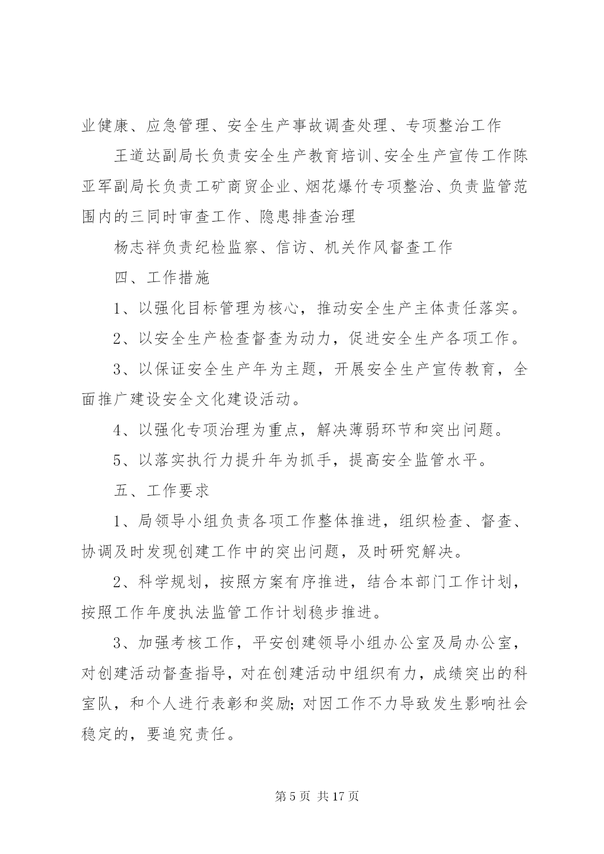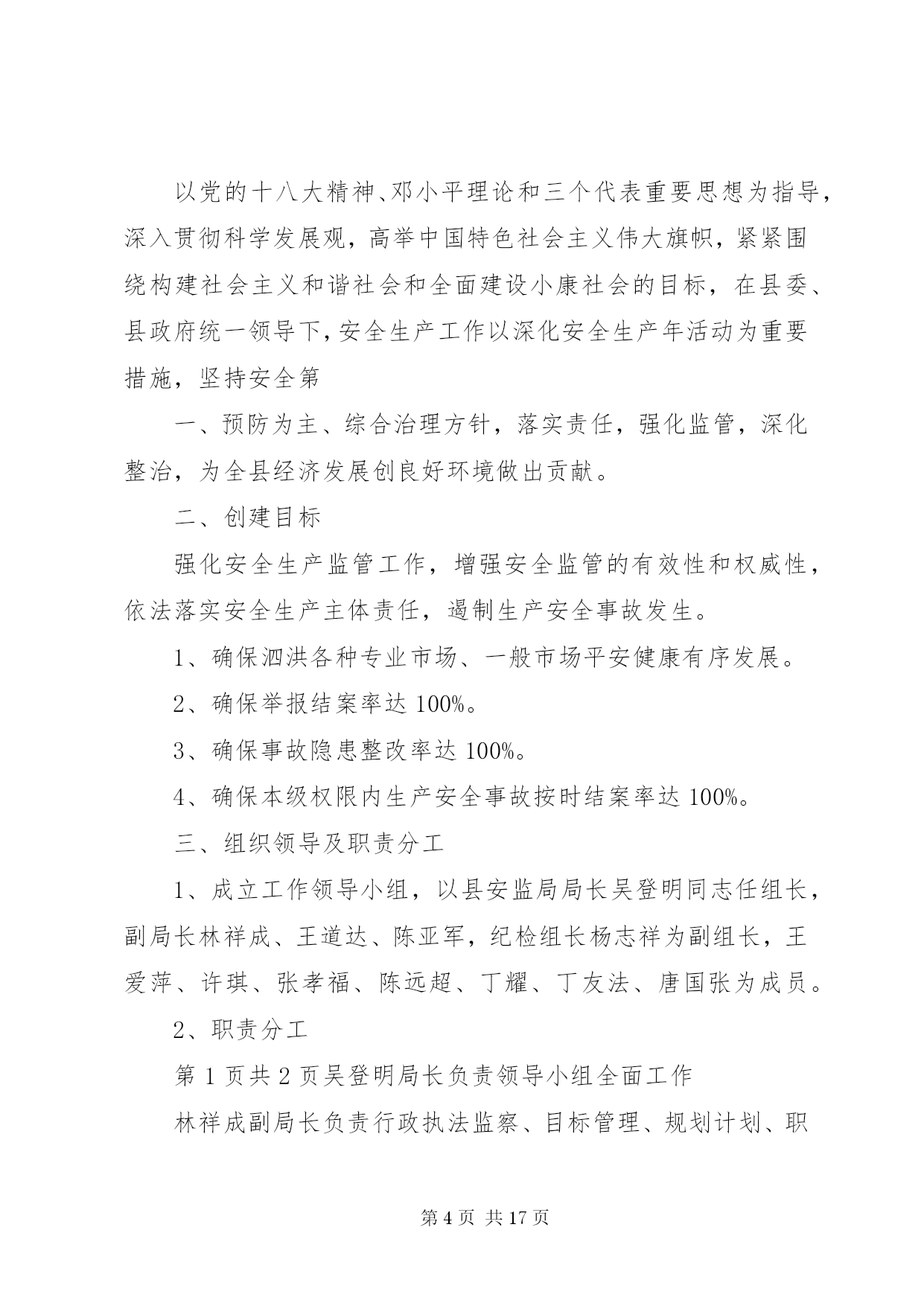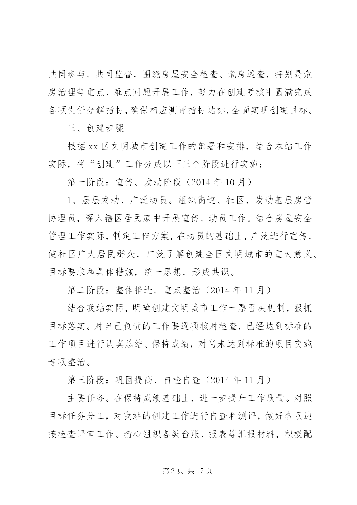第PAGE\*Arabic\*MERGEFORMAT17页共NUMPAGES\*MERGEFORMAT17页安监站文明创建活动实施方案全国文明城市是目前我国综合评价城市发展水平的最高荣誉,是最有价值的城市品牌。经过多年努力,现在的xx已到了距离全国文明城市最近的时候。在20xx年、20xx年全国城市文明程度指数测评中,我市分别居全国省会、副省级提名资格城市第x名、第x名,市民支持率超过xx%。2014年是第四届全国文明城市的申报考评年,为此,xx月xx日xx市召开了创建全国文明城市动员部署大会,号召全市上下再鼓干劲、决战决胜,全力以赴摘取“全国文明城市”桂冠,实现xx精神文明建设历史性跨越。我站为给全市创建活动贡献一己之力,根据全局的安排部署,制定如下实施方案:一、指导思想以党的十八大精神为指导,继续深入贯彻落实科学发展观,紧紧围绕xx市创建工作目标和要求,广泛宣传和发动全站职工,齐心协力、齐抓共管,以饱满昂扬的斗志,奋发有为的精神状态,全身心投入到全市文明创建工作中去,真正做到干出成绩、抓出实效,为大xx创建全国文明城市的目标贡献一份力量。二、工作目标全面对照《全国文明城市测评体系》,进一步加强责任1落实,将工作任务分工落实到人,做到“人人有任务、个个有指标”,同时通过街道、社区进行广泛宣传发动,做到全民共同参与、共同监督,围绕房屋安全检查、危房巡查,特别是危房治理等重点、难点问题开展工作,努力在创建考核中圆满完成各项责任分解指标,确保相应测评指标达标,全面实现创建目标。三、创建步骤根据xx区文明城市创建工作的部署和安排,结合本站工作实际,将“创建”工作分成以下三个阶段进行实施:第一阶段:宣传、发动阶段(2014年10月)1、层层发动、广泛动员。组织街道、社区,发动基层房管协理员,深入辖区居民家中开展宣传、动员工作。结合房屋安全管理工作实际,制定工作方案,在动员的基础上,广泛进行宣传,使社区广大居民群众,广泛了解创建全国文明城市的重大意义、目标要求和具体措施,统一思想,形成共识。第二阶段:整体推进、重点整治(2014年11月)结合我站实际,明确创建文明城市工作一票否决机制,狠抓目标落实。对自己负责的工作要逐项核对检查,已经达到标准的工作项目进行认真总结、保持成绩,对尚未达到标准的项目实施专项整治。第三阶段:巩固提高、自检自查(2014年11月)主要任务。在保持成绩基础上,进一步提升工作质量。对照目标任务分工,对我站的创建工作进行自查和测评,做好各项迎接检查评审工作。精心组织各类台账、报表等汇报材料,积极配合相关部门开展迎检工作。六、措施及要求(一)高度重视,统一思想创建全国文明城市工作,是市委、市政府作出的一项重大决策。全站上下要统一思想,高度重视,强化组织领导,广泛宣传发动。要把创建文明城市工作作为当前的重点来抓,要让全站职工深刻理解创建文明城市工作的重要性,使之入脑入心。(二)精心组织,狠抓落实。所有工作人员要切实负起责任,认真开会落实,对照目标任务,拿出具体工作方案,深入危房治理现场进行指导和监督,把工作落实到人、落实到每一个细节。(三)加强督导检查,完善考评机制。所有工作人员要对自己负责的工作认真检查,对没有达到创建文明城市标准的地方,要立即整改,务必使创建文明城市工作顺利通过。第二篇:县安监局创建“平安安监”活动方案县安监局创建“平安安监”活动方案根据上级有关文件精神,按县综治委的统一部署,结合XX县区安监局工作实际,立足争优创先目标宗旨,县安监局决定,在全县实施创建平安安监活动,推动我县经济建设平稳发展,建立安全生产良好秩序,遏制生产安全事故,维护稳定,现制定如下实施方案:一、指导思想以党的十八大精神、邓小平理论和三个代表重要思想为指导,深入贯彻科学发展观,高举中国特色社会主义伟大旗帜,紧紧围绕构建社会主义和谐社会和全面建设小康社会的目标,在县委、县政府统一领导下,安全生产工作以深化安全生产年活动为重要措施,坚持安全第一、预防为主、综合治理方针,落实责任,强化监管,深化整治,为全县经济发展创良好环境做出贡献。二、创建目标强化安全生产监管工作,增强安全监管的有效性和权威性,依法落实安全生产主体责任,遏制生产安全事故发生。1、确保泗洪各种专业市场、一般市场平安健康有序发展。2、确保举报结案率达100%。3、确保事故隐患整改率达100%。4、确保本级权限内生产安全事故按时结案率达100%。三、组织领导及职责分工1、成立工作领导小组,以县安监局局长吴登明同志任组长,副局长林祥成、王道达、陈亚军,纪检组长杨志祥为副组长,王爱萍、许琪、张孝福、陈远超、丁耀、丁友法、唐国张为成员。2、职责分工吴登明局长负责领导小组全面工作林祥成副局长负责行政执法监察、目标管理、规划计划、职业健康、应急管理、安全生产事