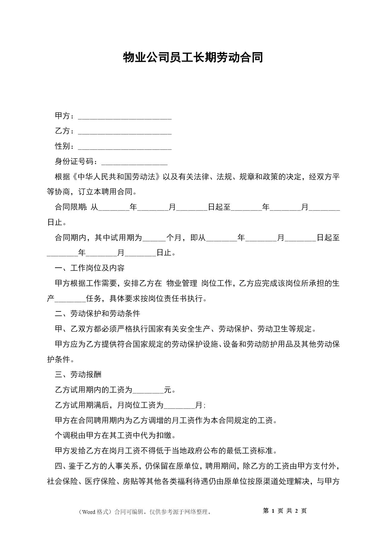 第PAGE\*MERGEFORMAT2页共NUMPAGES\*MERGEFORMAT2页(Word格式)合同可编辑,仅供参考源于网络整理。物业公司员工长期劳动合同甲方:________________________乙方:________________________性别:________________________身份证号码:_________________根据《中华人民共和国劳动法》以及有关法律、法规、规章和政策的决定,经双方平等协商,订立本聘用合同。合同限期:从________年________月________日起至________年________月________日止。合同期内,其中试用期为______个月,即从________年________月________日起至________年________月________日止。一、工作岗位及内容甲方根据工作需要,安排乙方在物业管理岗位工作,乙方应完成该岗位所承担的生产________任务,具体要求按岗位责任书执行。二、劳动保护和劳动条件甲、乙双方都必须严格执行国家有关安全生产、劳动保护、劳动卫生等规定。甲方应为乙方提供符合国家规定的劳动保护设施、设备和劳动防护用品及其他劳动保护条件。三、劳动报酬乙方试用期内的工资为________元。乙方试用期满后,月岗位工资为________月;甲方在合同聘用期内为乙方调增的月工资作为本合同规定的工资。个调税由甲方在其工资中代为扣缴。甲方发给乙方在岗月工资不得低于当地政府公布的最低工资标准。四、鉴于乙方的人事关系,仍保留在原单位,聘用期间,除乙方的工资由甲方支付外,社会保险、医疗保险、房贴等其他各类福利待遇仍由原单位按原渠道处理解决,与甲方无涉。五、违约责任甲、乙双方应严格遵守法律、法规、规章以及甲方依法制定的各项管理制度。甲、乙任何一方提出解除本协议,应提前三十日书面通知对方,方可解除本协议。由于甲、乙任何一方的过错,造成本合同不能履行,或不能完全履行的,由过错的一方承担法律责任。甲、乙任何一方违反本合同,给对方造成经济损失的,应当根据后果和责任的大小,向对方支付赔偿金。本协议期满即行终止,双方需要延长合作期限的,应在本协议满前一个月内办理聘用的续订手续。六、其它本协议若有未尽事宜,由双方友好协商解决。本协议一式二份,经甲、乙双方签字盖章后生效,甲、乙双方各执一份。甲方盖章:________________________乙方签名:___________________法定代表:________________________法定代表:_________________________签名:_______________________签名:____________________________________年_________月________日_____________年________月________日