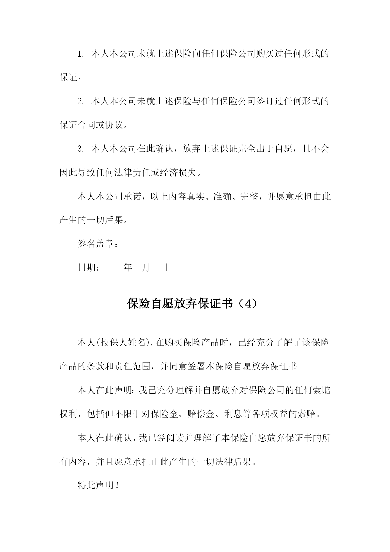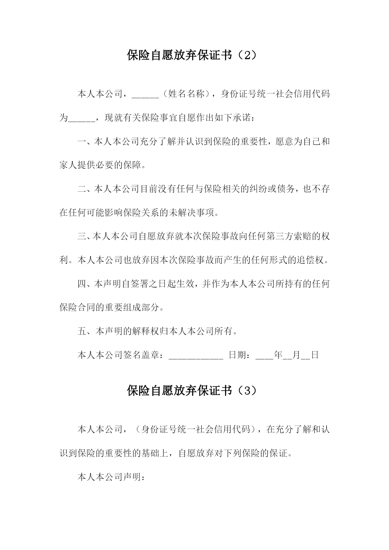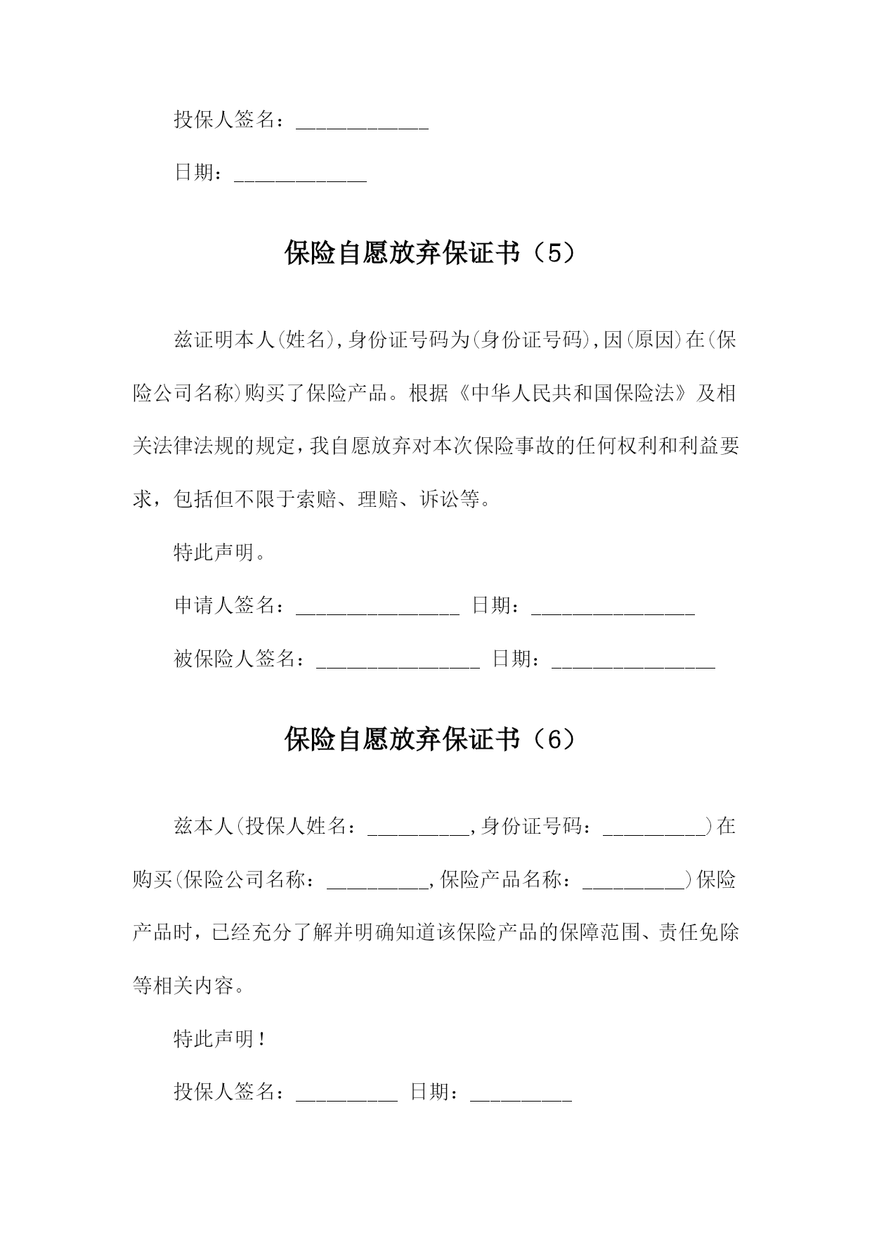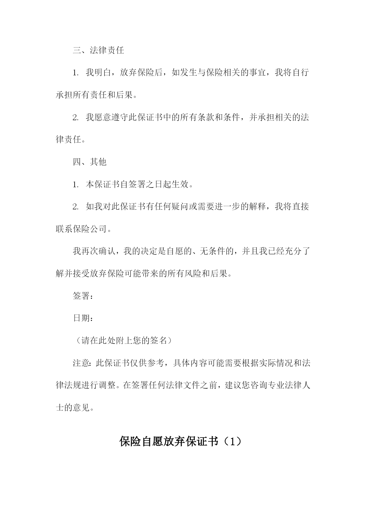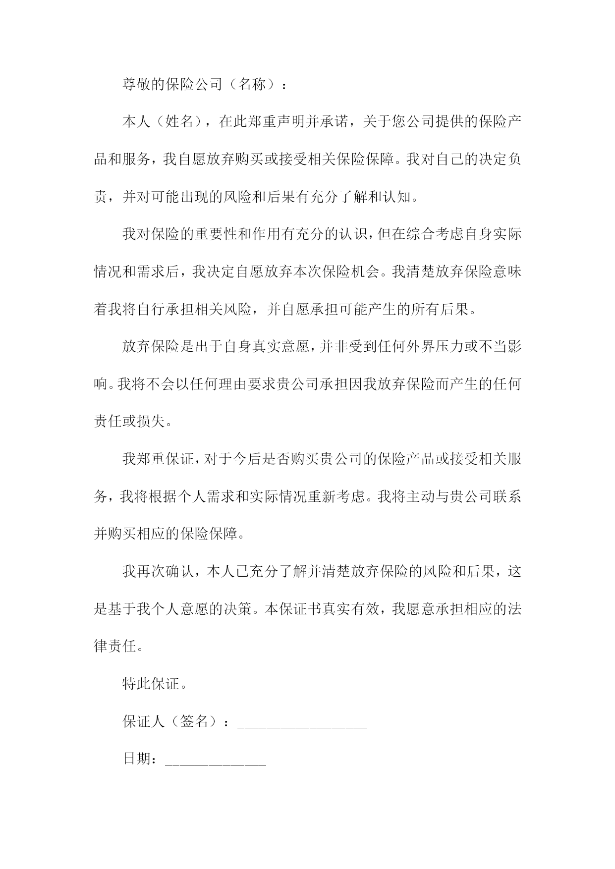 保险自愿放弃保证书尊敬的保险公司及相关各方:我,(您的全名),在此郑重声明并确认,关于(具体的保险产品名称),我自愿决定放弃该保险的相关权益。我在此提供的所有信息均为真实、准确,并对此保证书的真实性负完全责任。一、保证事项1.我已充分了解并清楚知道所放弃的保险产品的所有条款、保障范围及相关权益。2.我自愿、无条件地放弃该保险的相关权益,包括但不限于保险金的索赔权、保险合同的解除权等。3.我确认,放弃该保险权益的决定是我个人的真实意愿,与他人无关。二、声明与承诺1.我保证,此决定完全基于我的个人考虑和判断,不会受到任何外部因素的影响或干预。2.我承诺,此决定是我本人的真实意愿,不存在任何形式的压力或误导。3.我理解并接受,放弃保险可能带来的相关风险及后果。三、法律责任1.我明白,放弃保险后,如发生与保险相关的事宜,我将自行承担所有责任和后果。2.我愿意遵守此保证书中的所有条款和条件,并承担相关的法律责任。四、其他1.本保证书自签署之日起生效。2.如我对此保证书有任何疑问或需要进一步的解释,我将直接联系保险公司。我再次确认,我的决定是自愿的、无条件的,并且我已经充分了解并接受放弃保险可能带来的所有风险和后果。签署:日期:(请在此处附上您的签名)注意:此保证书仅供参考,具体内容可能需要根据实际情况和法律法规进行调整。在签署任何法律文件之前,建议您咨询专业法律人士的意见。保险自愿放弃保证书(1)尊敬的保险公司(名称):本人(姓名),在此郑重声明并承诺,关于您公司提供的保险产品和服务,我自愿放弃购买或接受相关保险保障。我对自己的决定负责,并对可能出现的风险和后果有充分了解和认知。我对保险的重要性和作用有充分的认识,但在综合考虑自身实际情况和需求后,我决定自愿放弃本次保险机会。我清楚放弃保险意味着我将自行承担相关风险,并自愿承担可能产生的所有后果。放弃保险是出于自身真实意愿,并非受到任何外界压力或不当影响。我将不会以任何理由要求贵公司承担因我放弃保险而产生的任何责任或损失。我郑重保证,对于今后是否购买贵公司的保险产品或接受相关服务,我将根据个人需求和实际情况重新考虑。我将主动与贵公司联系并购买相应的保险保障。我再次确认,本人已充分了解并清楚放弃保险的风险和后果,这是基于我个人意愿的决策。本保证书真实有效,我愿意承担相应的法律责任。特此保证。保证人(签名):__________________日期:______________保险自愿放弃保证书(2)本人本公司,______(姓名名称),身份证号统一社会信用代码为______,现就有关保险事宜自愿作出如下承诺:一、本人本公司充分了解并认识到保险的重要性,愿意为自己和家人提供必要的保障。二、本人本公司目前没有任何与保险相关的纠纷或债务,也不存在任何可能影响保险关系的未解决事项。三、本人本公司自愿放弃就本次保险事故向任何第三方索赔的权利。本人本公司也放弃因本次保险事故而产生的任何形式的追偿权。四、本声明自签署之日起生效,并作为本人本公司所持有的任何保险合同的重要组成部分。五、本声明的解释权归本人本公司所有。本人本公司签名盖章:____________日期:____年__月__日保险自愿放弃保证书(3)本人本公司,(身份证号统一社会信用代码),在充分了解和认识到保险的重要性的基础上,自愿放弃对下列保险的保证。本人本公司声明:1.本人本公司未就上述保险向任何保险公司购买过任何形式的保证。2.本人本公司未就上述保险与任何保险公司签订过任何形式的保证合同或协议。3.本人本公司在此确认,放弃上述保证完全出于自愿,且不会因此导致任何法律责任或经济损失。本人本公司承诺,以上内容真实、准确、完整,并愿意承担由此产生的一切后果。签名盖章:日期:____年__月__日保险自愿放弃保证书(4)本人(投保人姓名),在购买保险产品时,已经充分了解了该保险产品的条款和责任范围,并同意签署本保险自愿放弃保证书。本人在此声明:我已充分理解并自愿放弃对保险公司的任何索赔权利,包括但不限于对保险金、赔偿金、利息等各项权益的索赔。本人在此确认,我已经阅读并理解了本保险自愿放弃保证书的所有内容,并且愿意承担由此产生的一切法律后果。特此声明!投保人签名:_____________日期:_____________保险自愿放弃保证书(5)兹证明本人(姓名),身份证号码为(身份证号码),因(原因)在(保险公司名称)购买了保险产品。根据《中华人民共和国保险法》及相关法律法规的规定,我自愿放弃对本次保险事故的任何权利和利益要求,包括但不限于索赔、理赔、诉讼等。特此声明。申请人签名:________________日期:______