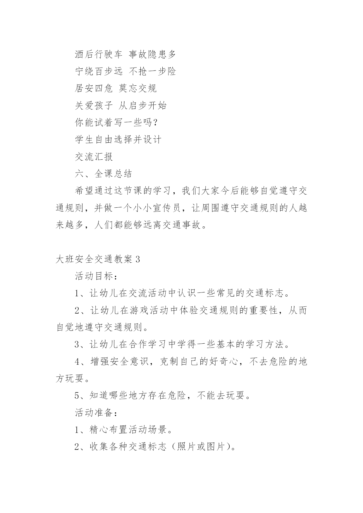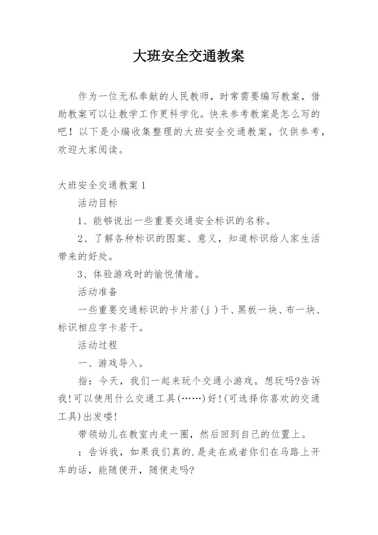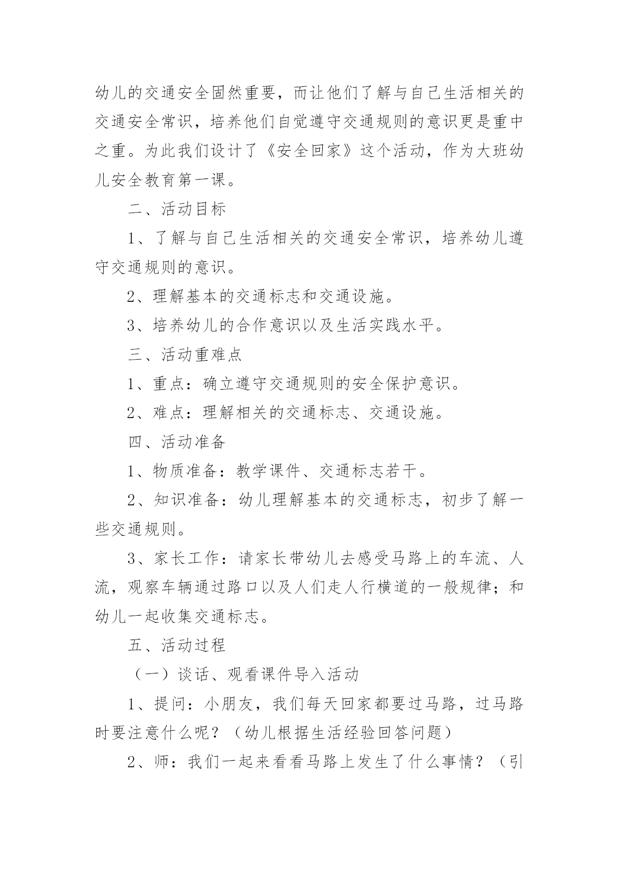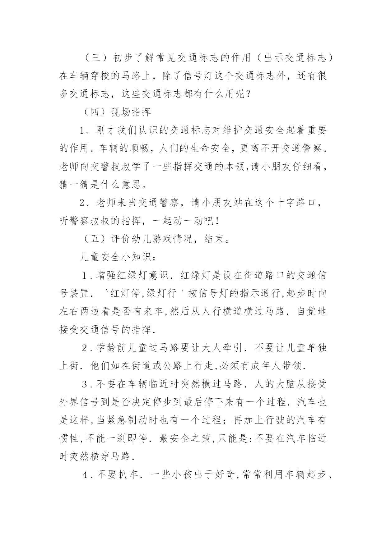 大班安全交通教案作为一位无私奉献的人民教师,时常需要编写教案,借助教案可以让教学工作更科学化。快来参考教案是怎么写的吧!以下是小编收集整理的大班安全交通教案,仅供参考,欢迎大家阅读。大班安全交通教案1活动目标1、能够说出一些重要交通安全标识的名称。2、了解各种标识的图案、意义,知道标识给人家生活带来的好处。3、体验游戏时的愉悦情绪。活动准备一些重要交通标识的卡片若(j)干、黑板一块、布一块、标识相应字卡若干。活动过程一、游戏导入。指:今天,我们一起来玩个交通小游戏。想玩吗?告诉我!可以使用什么交通工具(……)好!(可选择你喜欢的交通工具)出发喽!带领幼儿在教室内走一圈,然后回到自己的位置上。:告诉我,如果我们真的.是走在或者你们在马路上开车的话,能随便开,随便走吗?二、认识标识指:瞧!老师这有很多交痛标识图片,谁说说,你都认识哪些?(掀开布,幼儿自由说)指:我们现在一个个来认识。(逐一认识并解释其主要作用)请幼儿说说认识的标识,指出标识并说说标识的名字,把字卡贴在相应的标识卡片下面。三、走迷宫图指:好了,罗老师现在要给我们变一个魔术了,看看,你们还记得这个标识叫什么名字吗?(一名助教老师:罗老师,站在黑板后面,老师随意的逐一复习标识的名字,再认一认标识,幼儿回答对一个随即往后传给罗老师,罗老师在黑板后用标识卡片拼出一幅迷宫图)指:瞧!罗老师给我们变出了一幅迷宫图,哦,小朋友你们想去这个开心乐园玩吗?那必须通关啊,我们一起闯关吧!(把迷宫图路线上的标识逐一认识就可算通关)四、认识其它标识指:今天我们认识了一些交通标识,生活中还有很多标识,谁说说你还见过哪些?在什么地方见过?教师可出示几张标识(如:麦当劳、08年北京奥运会会徽等)五、游戏指:谁能快快的说出我手里拿的是什么标识,我就请他向我迈进一步。大班安全交通教案2教学目标:知识:知道交通规则是政府制定的法规,学习有关的交通规则常识,认识一些常见的交通标志和设施。.态度:了解交通事故的无情给个人、家庭和社会造成的巨大危害,形成强烈的交通安全意识,养成对生命负责的态度。能力:提高自我保护能力。教学重点:1、认识常见的交通标志和设施,了解他们的作用,体会识别交通标志、遵守交通法规的重要意义。2、懂得交通规则是政府制定的法规,人人都要遵守。3、认识到违反交通规则可能会给自己、他人及社会带来巨大的危害和痛苦,提高自觉遵守交通规则的意识。教具准备:多媒体课件教学过程:一、交流谈话,引入课题1、大家都知道,人最宝贵的是生命,生命对我们而言只有一次,可如今,我们的生命却受到各种因素的威胁,那么你们知道现在对人类生命威胁最大的头号杀手是什么吗?生自由谈2、对,就是交通事故,尤其是对于我们中小学生来说,车祸已经成为夺取我们宝贵生命的最大威胁。3、老师请大家看一些资料4、放录像短片5、看了刚才的短片,你有什么想法?学生自由谈(随学生回答板书:交通安全)二、认识各种交通标志和设施。过渡:过街天桥、隔离带等这些交通设施都是为了保障我们的生命安全而设的,如果不会识别交通标志,不能正确使用这些设施,就有可能发生像这样命丧车轮的惨剧。所以,遵守交通规则,首先得学会识别和使用交通标志及交通设施,老师这里有一些常用的,你认识哪些,他们的作用是什么?1、先小组讨论交流一下2、学生说说见过的标志和设施3、汇报交流4、教师小结并将交通标志分类:警告标志、禁令标志、指示标志。三、遵守交通规则1、过渡语:虽然这些交通标志和设施给我们提供了很多便利,帮助我们来遵守交通规则,但是就是有人视而不见,一次次以身犯险。课前,老师让大家展开调查,可以调查我们身边的不遵守交通规则的现象,也可以搜集一些交通事故的案例、新闻、图片等,下面谁来汇报一下你的'调查内容?2、学生自由谈,并在汇报后说说体会。3、(出示录像短片)老师这也有一些相关的案例,让我们一起来看一下。4、谁来说说你的感受?(引导学生说出对自己、他人及社会等方面都带来了危害)5、小结:这些惊人的数据,这些惨痛的教训,都在告诉我们不遵守交通规则不仅给自己,同时给社会、给他人都带来了巨大的危害。看来,这是一项关系到你、我、他,大家共同利益的事情。板题:你我他6、可是,为什么还有那么多人不遵守交通规则,视生命如儿戏呢?学生自由谈7、小结:除了这些原因,还说明人们的法律意识淡薄,因为遵守交通规则也是国家制定的一项法律法规,是人人都得遵守的,而不仅仅是自己的事情。8、那么,自觉遵守交通规则除了过马路走人行横道之外,还要做到什么?(在日常生活中我们步行或骑车一般都要哪些交通规则?)先让学生自由谈,再播放交通规则短片。四、(议一议)如果遇到下面的情况,你会怎样做呢?a、在没有红绿灯的情况下过马路。b、要迟到了,不走人行横道可以节约很多时间。像这几个同学这样做对不对,有什么危害?五、为了唤