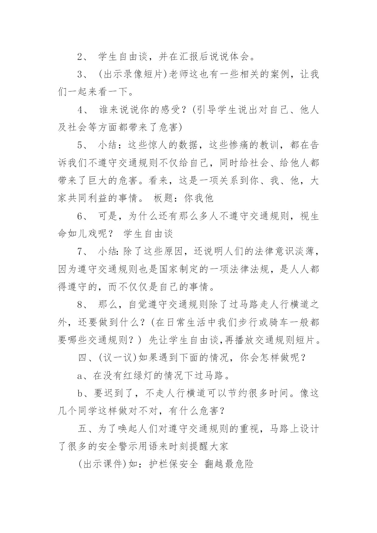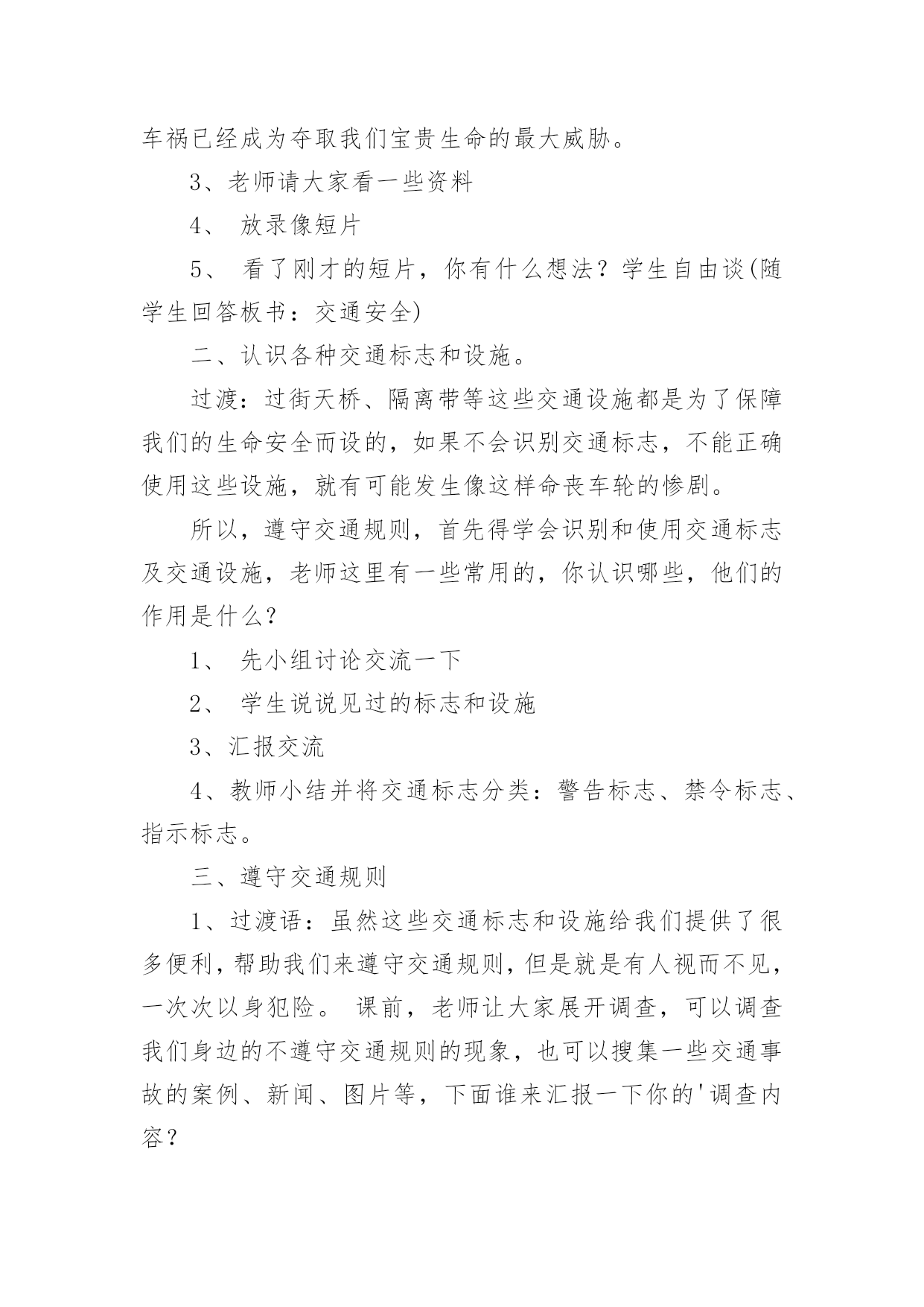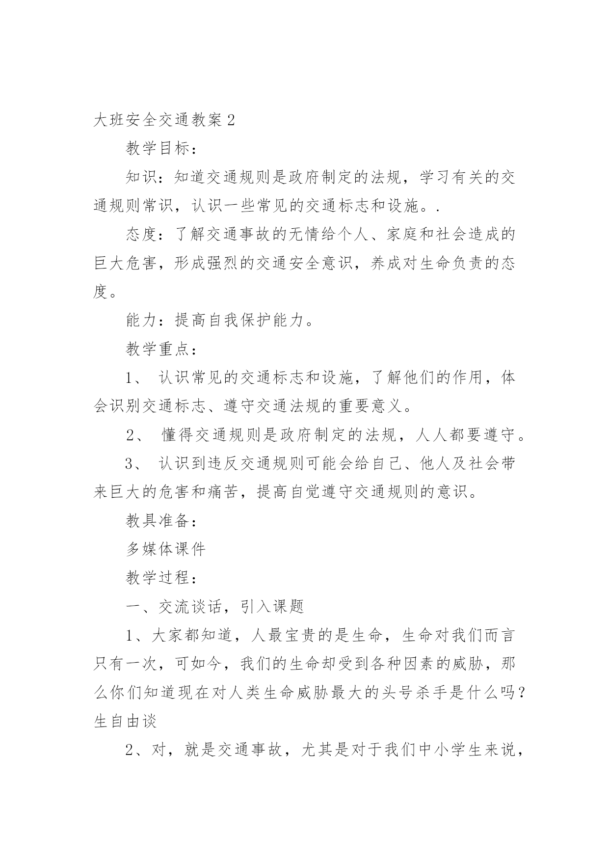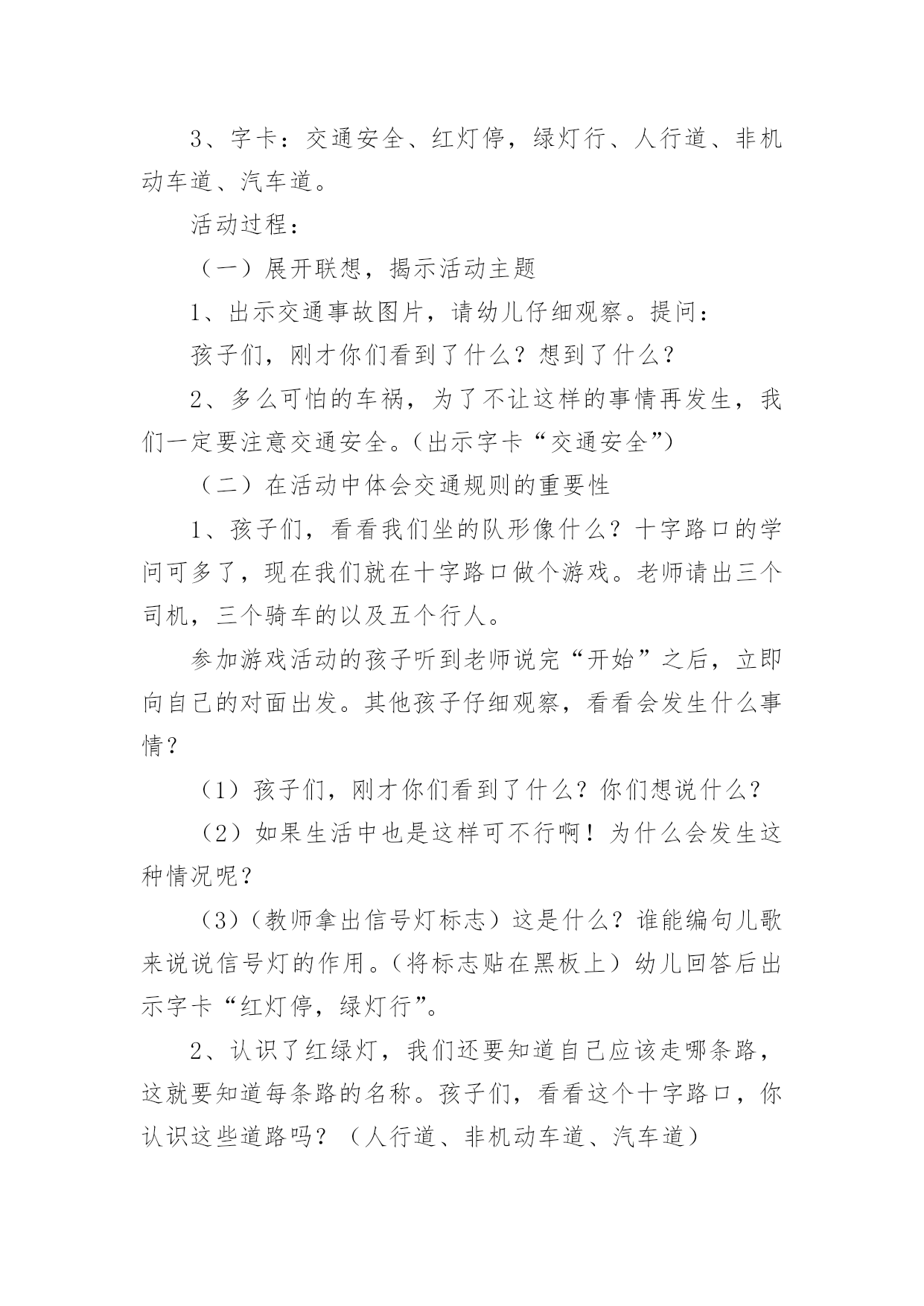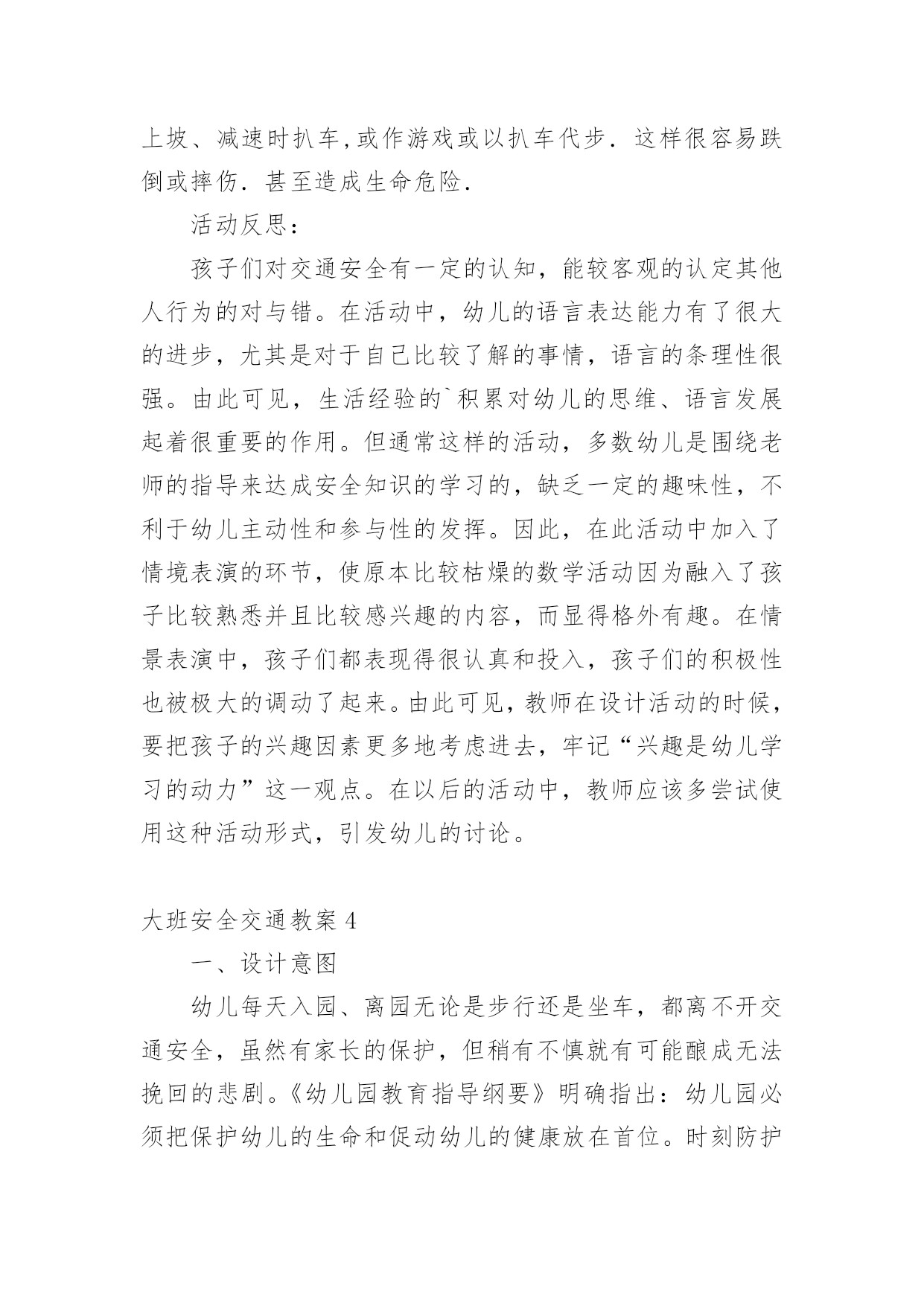 大班安全交通教案作为一位无私奉献的人民教师,时常需要编写教案,借助教案可以让教学工作更科学化。快来参考教案是怎么写的吧!以下是小编收集整理的大班安全交通教案,仅供参考,欢迎大家阅读。大班安全交通教案1活动目标1、能够说出一些重要交通安全标识的名称。2、了解各种标识的图案、意义,知道标识给人家生活带来的好处。3、体验游戏时的愉悦情绪。活动准备一些重要交通标识的卡片若(j)干、黑板一块、布一块、标识相应字卡若干。活动过程一、游戏导入。指:今天,我们一起来玩个交通小游戏。想玩吗?告诉我!可以使用什么交通工具(……)好!(可选择你喜欢的交通工具)出发喽!带领幼儿在教室内走一圈,然后回到自己的位置上。:告诉我,如果我们真的.是走在或者你们在马路上开车的话,能随便开,随便走吗?二、认识标识指:瞧!老师这有很多交痛标识图片,谁说说,你都认识哪些?(掀开布,幼儿自由说)指:我们现在一个个来认识。(逐一认识并解释其主要作用)请幼儿说说认识的标识,指出标识并说说标识的名字,把字卡贴在相应的标识卡片下面。三、走迷宫图指:好了,罗老师现在要给我们变一个魔术了,看看,你们还记得这个标识叫什么名字吗?(一名助教老师:罗老师,站在黑板后面,老师随意的逐一复习标识的名字,再认一认标识,幼儿回答对一个随即往后传给罗老师,罗老师在黑板后用标识卡片拼出一幅迷宫图)指:瞧!罗老师给我们变出了一幅迷宫图,哦,小朋友你们想去这个开心乐园玩吗?那必须通关啊,我们一起闯关吧!(把迷宫图路线上的标识逐一认识就可算通关)四、认识其它标识指:今天我们认识了一些交通标识,生活中还有很多标识,谁说说你还见过哪些?在什么地方见过?教师可出示几张标识(如:麦当劳、08年北京奥运会会徽等)五、游戏指:谁能快快的说出我手里拿的是什么标识,我就请他向我迈进一步。大班安全交通教案2教学目标:知识:知道交通规则是政府制定的法规,学习有关的交通规则常识,认识一些常见的交通标志和设施。.态度:了解交通事故的无情给个人、家庭和社会造成的巨大危害,形成强烈的交通安全意识,养成对生命负责的态度。能力:提高自我保护能力。教学重点:1、认识常见的交通标志和设施,了解他们的作用,体会识别交通标志、遵守交通法规的重要意义。2、懂得交通规则是政府制定的法规,人人都要遵守。3、认识到违反交通规则可能会给自己、他人及社会带来巨大的危害和痛苦,提高自觉遵守交通规则的意识。教具准备:多媒体课件教学过程:一、交流谈话,引入课题1、大家都知道,人最宝贵的是生命,生命对我们而言只有一次,可如今,我们的生命却受到各种因素的威胁,那么你们知道现在对人类生命威胁最大的头号杀手是什么吗?生自由谈2、对,就是交通事故,尤其是对于我们中小学生来说,车祸已经成为夺取我们宝贵生命的最大威胁。3、老师请大家看一些资料4、放录像短片5、看了刚才的短片,你有什么想法?学生自由谈(随学生回答板书:交通安全)二、认识各种交通标志和设施。过渡:过街天桥、隔离带等这些交通设施都是为了保障我们的生命安全而设的,如果不会识别交通标志,不能正确使用这些设施,就有可能发生像这样命丧车轮的惨剧。所以,遵守交通规则,首先得学会识别和使用交通标志及交通设施,老师这里有一些常用的,你认识哪些,他们的作用是什么?1、先小组讨论交流一下2、学生说说见过的标志和设施3、汇报交流4、教师小结并将交通标志分类:警告标志、禁令标志、指示标志。三、遵守交通规则1、过渡语:虽然这些交通标志和设施给我们提供了很多便利,帮助我们来遵守交通规则,但是就是有人视而不见,一次次以身犯险。课前,老师让大家展开调查,可以调查我们身边的不遵守交通规则的现象,也可以搜集一些交通事故的案例、新闻、图片等,下面谁来汇报一下你的'调查内容?2、学生自由谈,并在汇报后说说体会。3、(出示录像短片)老师这也有一些相关的案例,让我们一起来看一下。4、谁来说说你的感受?(引导学生说出对自己、他人及社会等方面都带来了危害)5、小结:这些惊人的数据,这些惨痛的教训,都在告诉我们不遵守交通规则不仅给自己,同时给社会、给他人都带来了巨大的危害。看来,这是一项关系到你、我、他,大家共同利益的事情。板题:你我他6、可是,为什么还有那么多人不遵守交通规则,视生命如儿戏呢?学生自由谈7、小结:除了这些原因,还说明人们的法律意识淡薄,因为遵守交通规则也是国家制定的一项法律法规,是人人都得遵守的,而不仅仅是自己的事情。8、那么,自觉遵守交通规则除了过马路走人行横道之外,还要做到什么?(在日常生活中我们步行或骑车一般都要哪些交通规则?)先让学生自由谈,再播放交通规则短片。四、(议一议)如果遇到下面的情况,你会怎样做呢?a、在没有红绿灯的情况下过马路。b、要迟到了,不走人行横道可以节约很多时间。像这几个同学这样做对不对,有什么危害?五、为了唤