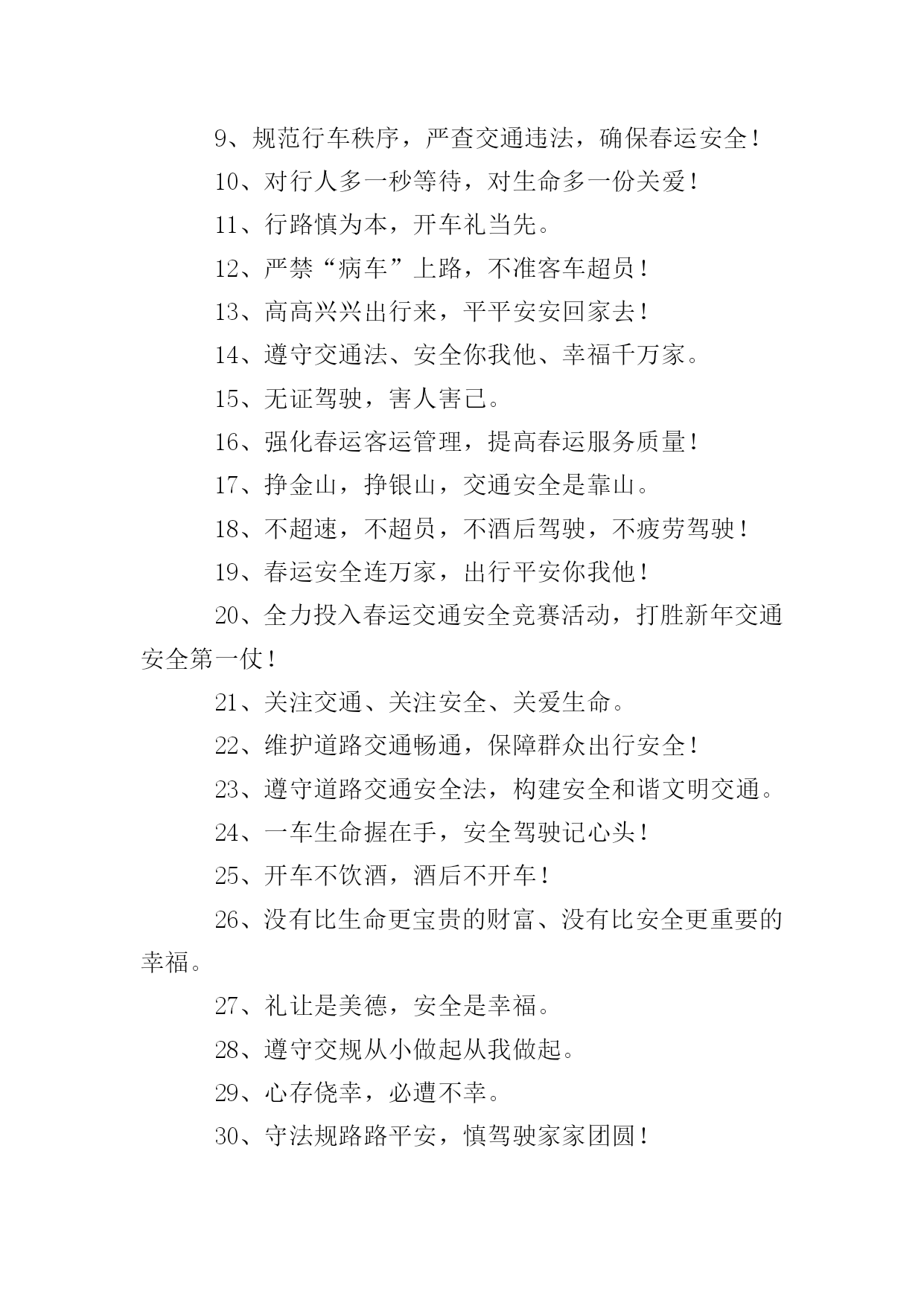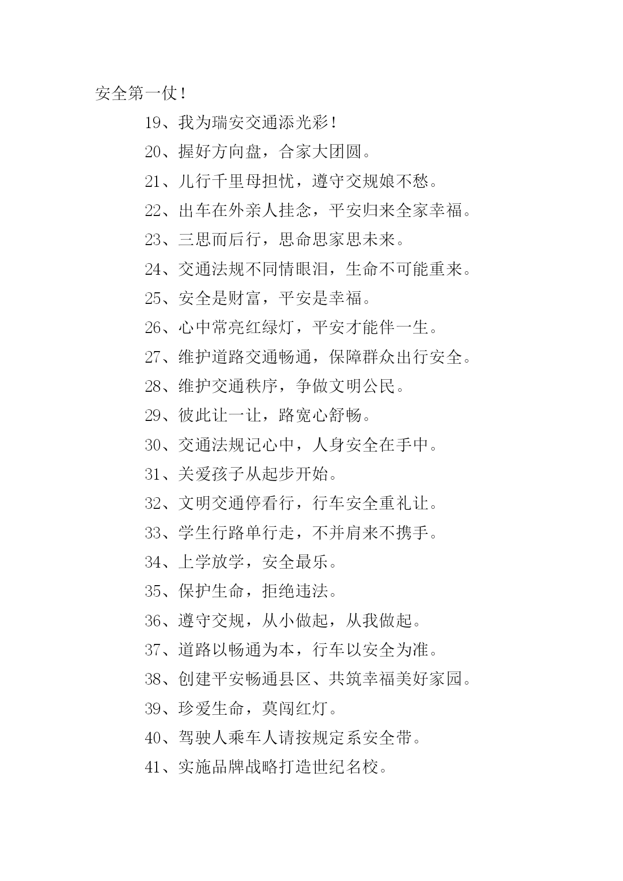有特色的交通安全口号【篇一】有特色的交通安全口号1、实施品牌战略打造世纪名校。2、实施素质教育实现全面发展。3、以特色办学以质量取胜。4、车行万里路,走好第一步。5、莫图一时快,肇事全家哀。6、酒后开车,先醉人、后坠车。7、文明上路一路和谐,平安回家一家幸福。8、酒是迷魂汤,动车必遭殃。9、生命在于运动,生命毁于超速运动。10、斑马线就是生命线,你平安才有全家欢。11、每一张脸,都是平安烟台的亮丽名片;每一辆车,都是和谐社会的美妙音符。12、创造首都良好交通环境。13、道路要畅通,秩序是保障。14、每一天,您的`家人都祈盼您平安归来。15、您是首都的主人,您是文明礼让的楷模。16、安全是的效益,平安是全家的福气。17、自觉遵守道路交通安全法规,全力确保春运交通安全有序!18、全力投入春运交通安全竞赛活动,打胜新年交通安全第一仗!19、我为瑞安交通添光彩!20、握好方向盘,合家大团圆。21、儿行千里母担忧,遵守交规娘不愁。22、出车在外亲人挂念,平安归来全家幸福。23、三思而后行,思命思家思未来。24、交通法规不同情眼泪,生命不可能重来。25、安全是财富,平安是幸福。26、心中常亮红绿灯,平安才能伴一生。27、维护道路交通畅通,保障群众出行安全。28、维护交通秩序,争做文明公民。29、彼此让一让,路宽心舒畅。30、交通法规记心中,人身安全在手中。31、关爱孩子从起步开始。32、文明交通停看行,行车安全重礼让。33、学生行路单行走,不并肩来不携手。34、上学放学,安全最乐。35、保护生命,拒绝违法。36、遵守交规,从小做起,从我做起。37、道路以畅通为本,行车以安全为准。38、创建平安畅通县区、共筑幸福美好家园。39、珍爱生命,莫闯红灯。40、驾驶人乘车人请按规定系安全带。41、实施品牌战略打造世纪名校。42、实施素质教育实现全面发展。43、以特色办学以质量取胜。44、车行万里路,走好第一步。45、莫图一时快,肇事全家哀。46、酒后开车,先醉人、后坠车。47、文明上路一路和谐,平安回家一家幸福。48、酒是迷魂汤,动车必遭殃。49、生命在于运动,生命毁于超速运动。50、斑马线就是生命线,你平安才有全家欢。【篇二】有特色的交通安全口号1、行车慎为本,开车礼当先2、铁路道口险情多,停车、了望再通过!3、让一让道路通畅,让一让安全有保障,让一让心情更舒畅4、进一步将受到谴责,退一步将得到尊重5、交通法规在心中,交通安全在手中6、人行横道车让人,各种车道人让车7、祝您一路平安!8、要遵守交规,不要乱行乱停9、恪守交规,法律为您生命护航10、要做英雄人,不开“英雄”车11、珍爱生命不要翻越护栏12、谨慎驾驶,保证安全13、多拉快跑,凶多吉少14、交通事故不长眼,你凶他就险15、出行时,切记系上交通法规这条安全带16、各行其道,安全可靠17、创造良好交通环境。18、行人过马路不能斜穿、也勿猛跑19、挣金山,挣银山,交通安全是靠山20、安全开车是大事,文明走路非小节21、骑车上路别着急,争、超、抢道不安全22、不开带病车上路23、行人一生平安,行车一路平安24、遵章守规连你我,道路畅通有保障25、交通法规是您生命之友!26、骑好车、走好路、安全伴您每一步27、遵守交通信号,遵守交通标志,遵守交通标线28、树立文明意识,搞好交通秩序29、违规是交通事故的祸根,侥幸是交通事故的隐患30、良药苦口利于病,交通规则利于行31、路好车好安全,慢行快行平安才行32、讲究交通公德,遵守交通法规33、车铃车闸齐全,维系您的安全34、遵守交规得平安,道路畅通保安全35、骑车抢行一秒,危险增加十分36、交通安全抛脑后,交通事故在前头37、您保持车况良好,车容整洁38、交通安全在我心中!39、加强综合治理,保障交通安全40、学龄前儿童上街要有成年人带领41、穿马路,跨护栏,少公德,多危险42、上有老,下有小,出了交通事故不得了43、宣传交通法规,提高交通文明意识44、的浪费是事故,的节约是安全45、行横道是您横过马路的安全带!46、人行道车莫占,车行道人莫钻47、您是河源的客人,您是遵章守规的楷模48、酒后开车,危险万分!49、行经路口要观望,拐弯示意要礼让50、勿以快慢论英雄,安全行车最光荣【篇三】有特色的交通安全口号1、道路以畅通为本,行车以