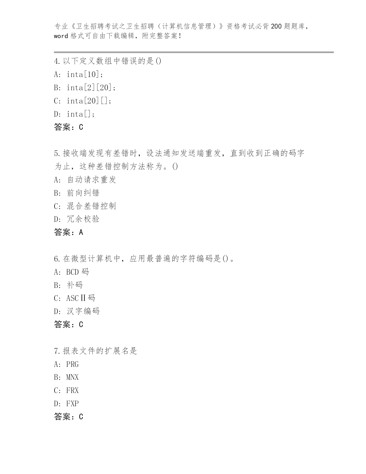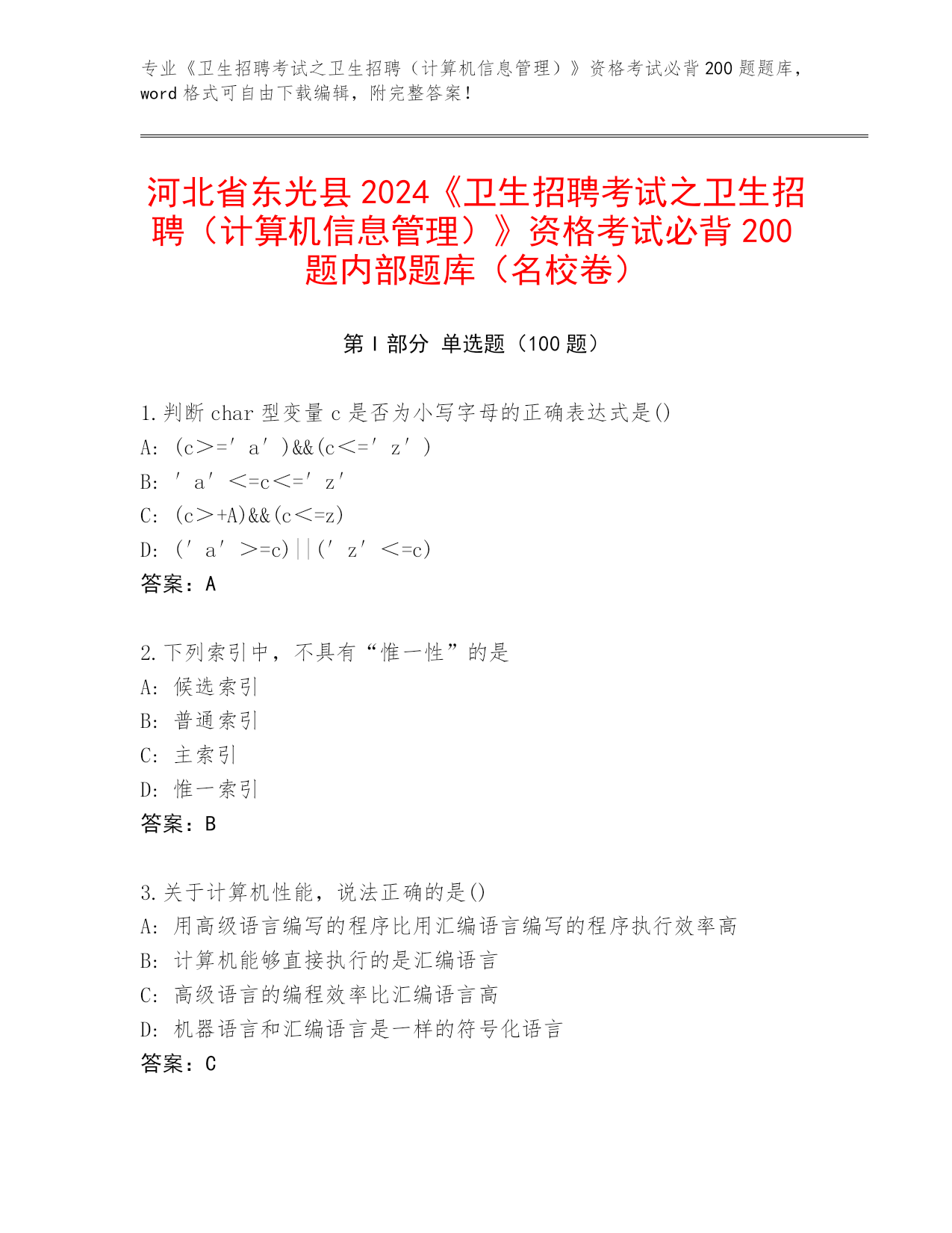 河北省东光县2024《卫生招聘考试之卫生招聘(计算机信息管理)》资格考试必背200题内部题库(名校卷)