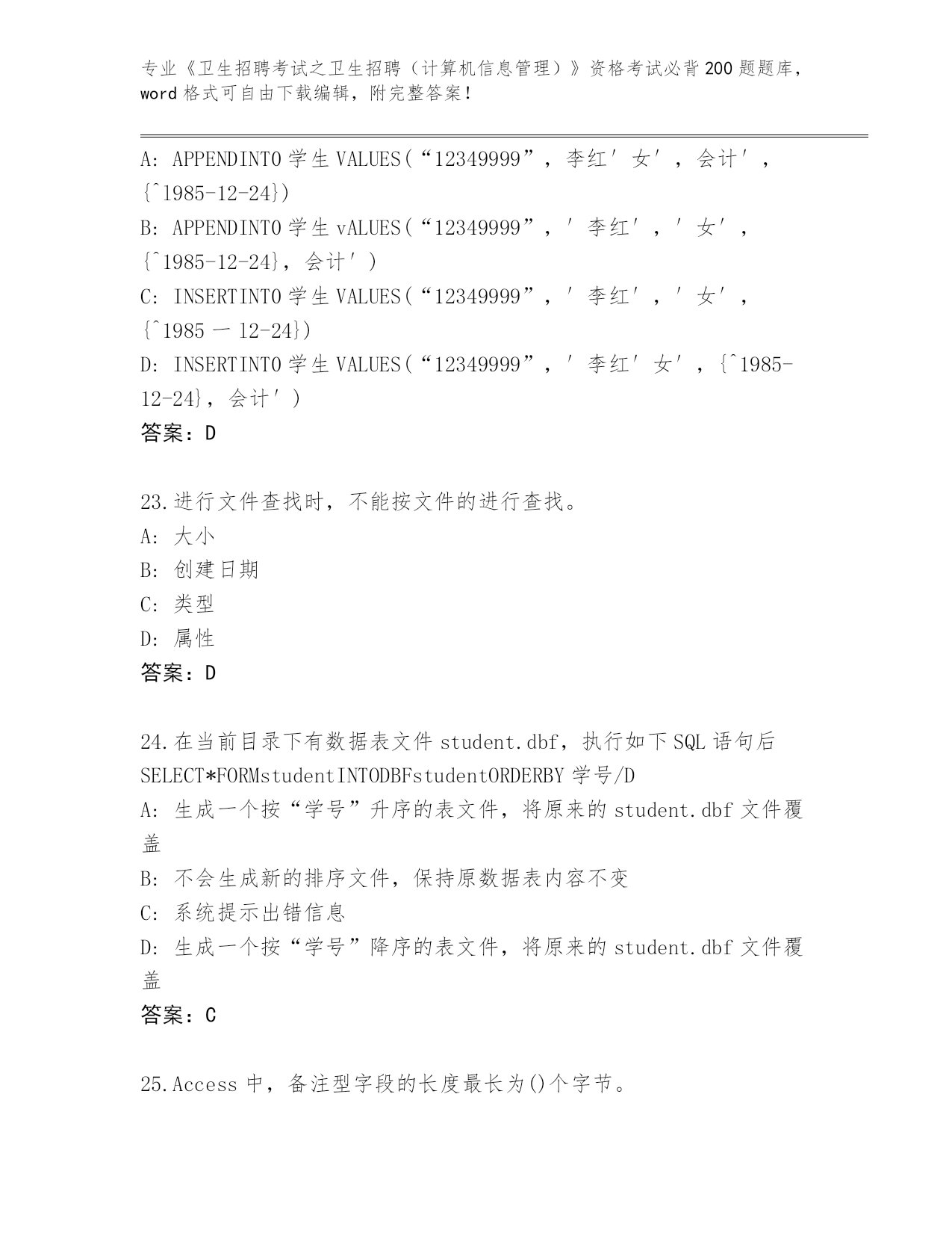 河北省故城县内部使用《卫生招聘考试之卫生招聘(计算机信息管理)》资格考试必背200题真题题库及答案(名校卷)