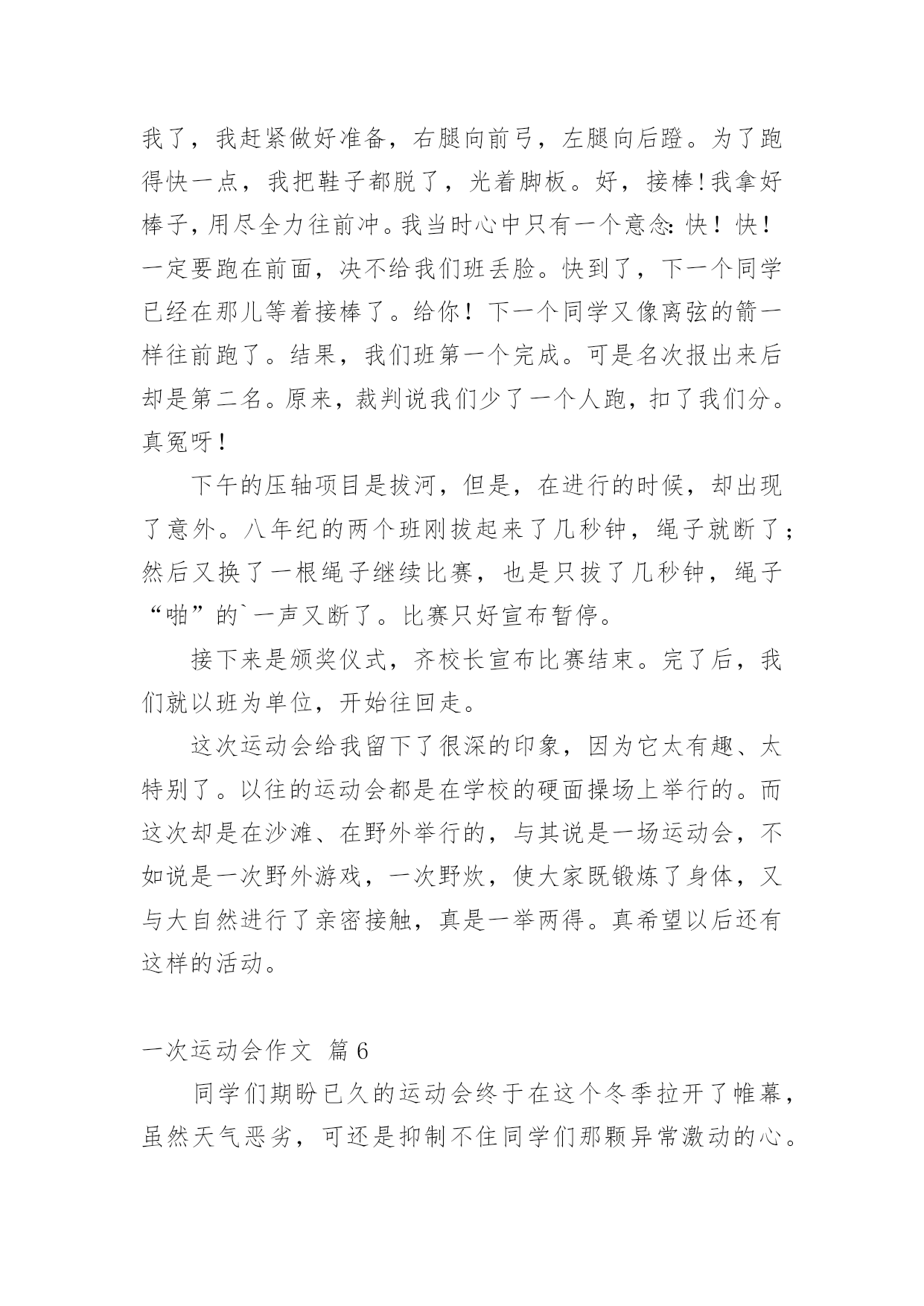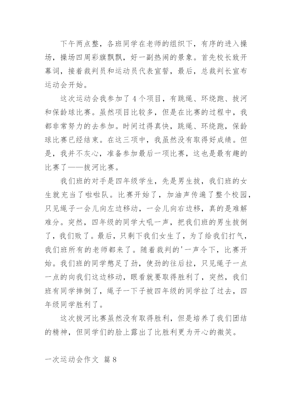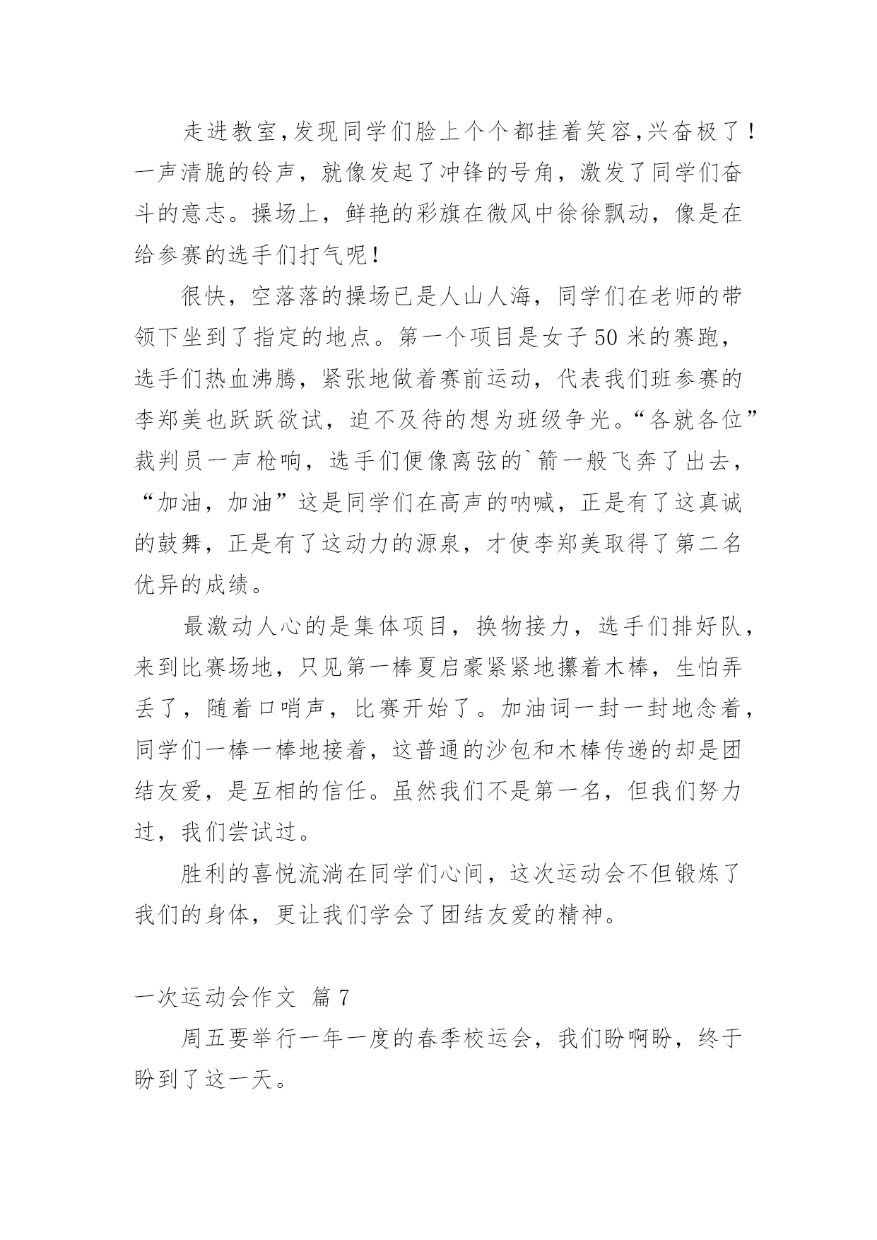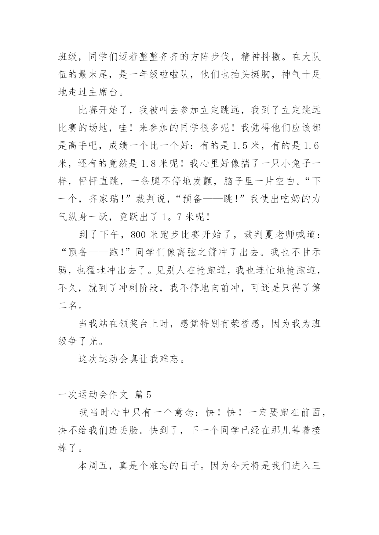 一次运动会作文一次运动会作文(合集)在平时的学习、工作或生活中,大家都尝试过写作文吧,写作文是培养人们的观察力、联想力、想象力、思考力和记忆力的重要手段。那么你有了解过作文吗?以下是小编为大家收集的一次运动会作文9篇,仅供参考,欢迎大家阅读。一次运动会作文篇1期盼已久的秋季运动会终于来到了,久违的太阳也露出了笑脸。蓝蓝的'天,白白的云,可爱的鸽子也来了。操场上,彩旗飘飘,同学们穿着各班的运动服入场了,我们喊着响亮的口号。比赛开始了,运动员们一个个生龙活虎、跃跃欲试。比赛项目可多了,有的跳绳、有的跑步、有的赶猪跑……看得我眼花缭乱,不知道该看哪个好。我最感兴趣的是拔河比赛。一声哨响,比赛开始了,我们肩并着肩,脚靠着脚,双手拉着绳子,使劲向后拉,又一声哨响,我们胜利了,我们高兴地欢呼起来。秋季运动会真精彩!一次运动会作文篇2今天,现代快报在莫愁湖公园里举行了首届家庭运动会。爸爸、妈妈早就答应带我来玩,这不,一大早,我们就兴冲冲地到了公园里。一进大门,就像进了人的海洋,赛场上人头攒动,领奖台前人们笑逐颜开。广播喇叭里,播音员正播颂着获奖家庭的名单,音乐喷泉随着优美的音乐时而升起,时而落下,时而急促,时而缓慢,真像一位优秀的指挥家,正在指挥乐队呢!比赛的项目可真多呀!有300米接力赛,脚踏船比赛,投篮比赛……我们眼睛都看花了!我们先玩了脚踏船比赛、足球射门、网球赶猪、卡丁车赛。最后,我们又向飞镖比赛和投篮比赛“进攻”。来到了飞镖比赛场上,看见人们正虎视眈眈的顶着对方,比赛相当的激烈。我见了,心里想:我能赛好吗?还是别比了吧!可我又想起了在家里,我优秀的`水平。犹豫了好半天,终于下定了决心——比赛肯定参加,赛的好坏不管,重在参与吗!轮到我们了!我心里像装了一只小兔子“砰砰”直跳,真恨不得马上下起倾盆大雨,活动停止才好呢!可惜太阳公公仿佛要看热闹,不仅没有躲进云层,反而笑眯眯地看着这儿呢!我只能硬着头皮走道场上。我结果飞镖,向靶扔去。只听“突突突”三声响过之后,我一瞅——哟!一个2环、一个8环、一个6环,唉!真差!我灰溜溜地跑下台。接着,是妈妈比。她也不好,该爸爸了。他终于现了一次神威,裁判员统计了一下分数,哇!51分。裁判员说:“有希望拿冠军!”“拿冠军?”我眼睛一亮,心想:“还能拿冠军?刚才不必那么紧张!”一会儿,裁判突然又把我们叫了回去。“怎么回事?”我们好奇地走回飞镖赛场。哦!原来李斗家庭也是51分,裁判喊我们去决赛呢!决赛?!我心里刚落地的石头又升了起来,生怕比不好,可爸爸却说:“别紧张,别紧张,放松点,想怎么做就怎么做,反正拿不到第一,拿第二没问题?”看他那么镇定,我想了想,觉得叶时,于是,也不紧张了。开始比赛了,我很自信地走到了场上,轻松的接过飞镖,不一会儿,我投好了,发挥不错,一个8环、一个9环、一个6环。爸爸妈妈也投得不错,总分是55分。好棒哦!接着,是李斗家庭投,也不只怎么搞得,他们家庭也没投好,统计分数时,只有39分,冠军一定非我们莫属啦!我们又去投篮,一开始,我已经不紧张了,很放松。嘿!我还一下子投进了两球,爸爸妈妈也各投进了一球,总共四球!说来也巧,李斗家庭也来投篮了,他们也投了四球,又要进行决赛了!这次,要争夺亚军!李斗家庭自告奋勇地说:“我们先来!”他们发挥得不太好,只投中了1球。该我们了!我的心已经提到了嗓子眼儿,又紧张起来,这一紧张,又没投好,一球也没进,妈妈还是很冷静,一下子投进二球,爸爸也进了一球。我们又夺得了投篮比赛的亚军!我们拿着奖品,兴高采烈的回到了家。一次运动会作文篇34月28日(星期三),我们学校了一次规模宏大的学生运动会。这次运动会,不同于以往的运动会,不仅参赛的同学和比赛项目多,更重要的是比赛精彩纷呈。在这众多的比赛中,我最喜欢的还是800米赛跑。参加这个项目的有8位同学,他们站在同一起跑线上,焦急而又紧张地等待着枪响,"嘟"的一声,发令枪响了,8位同学就像刚离弦的箭一样向前飞奔而去。刚开始跑的时候都看不出谁快谁慢,到了100米后,距离就渐渐拉开了。大家有的在为跑在前面的同学鼓掌,有的在为跑在后面的同学加油。我们班也有两位同学参加了这次800米比赛,徐佳麒跑在前面,我们拼命地为他喊着:"徐佳麒,加油!徐佳麒,加油!"听到同学们的'呐喊助威,徐佳麒两脚像生了风一样跑得比先前更快了。同时,我们也没忘记给我们班跑在后面的陆思渊加油,我们班啦啦队齐声高喊"一二三四五,我们盼着这个冠军盼得好辛苦"。经过紧张而又激烈的比赛,我们班的徐佳麒夺终于得了第二名,我们班的啦啦队早早地来到终点,迎接徐佳麒,迎接我们班的骄傲,800米比赛结束了,运动会结束了,可我那激动的心情一直不能平静。一次运动会作文篇4盼着,盼着,我们一年一度的秋季运动会终于开始了。运动会的开幕式在上午。一开始,向我们走来的是国旗队,他