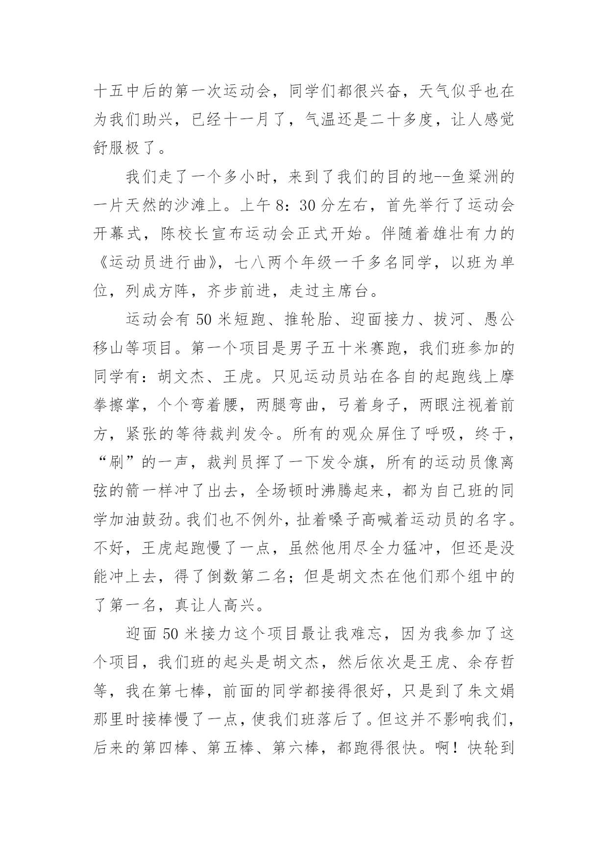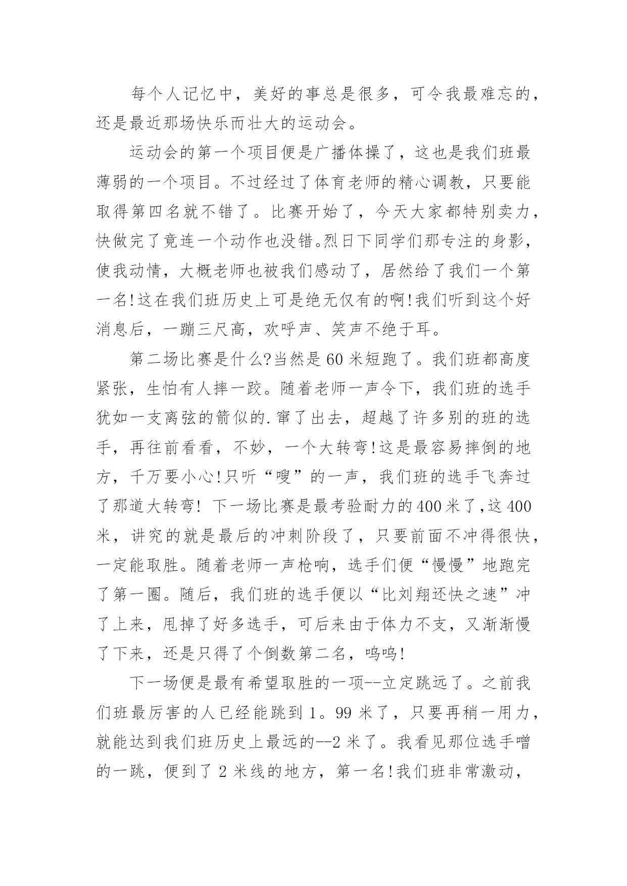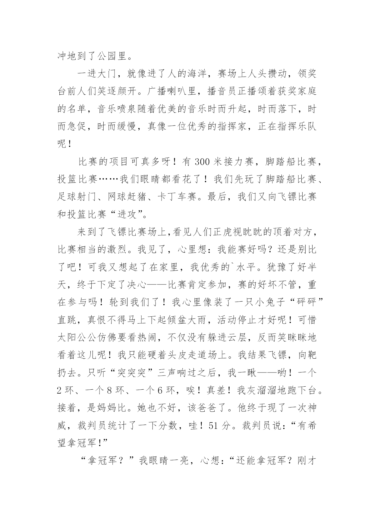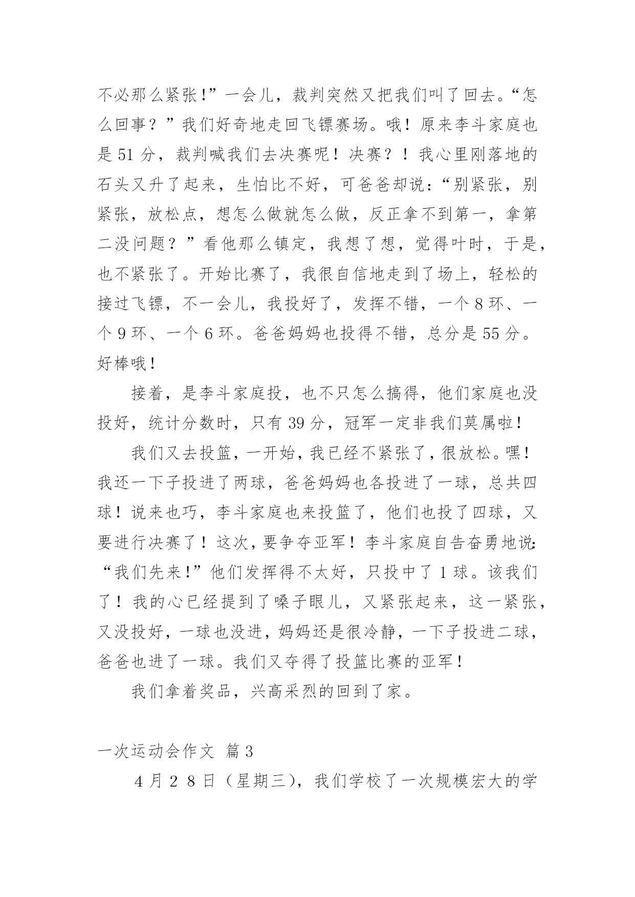 一次运动会作文一次运动会作文(合集)在平时的学习、工作或生活中,大家都尝试过写作文吧,写作文是培养人们的观察力、联想力、想象力、思考力和记忆力的重要手段。那么你有了解过作文吗?以下是小编为大家收集的一次运动会作文9篇,仅供参考,欢迎大家阅读。一次运动会作文篇1期盼已久的秋季运动会终于来到了,久违的太阳也露出了笑脸。蓝蓝的'天,白白的云,可爱的鸽子也来了。操场上,彩旗飘飘,同学们穿着各班的运动服入场了,我们喊着响亮的口号。比赛开始了,运动员们一个个生龙活虎、跃跃欲试。比赛项目可多了,有的跳绳、有的跑步、有的赶猪跑……看得我眼花缭乱,不知道该看哪个好。我最感兴趣的是拔河比赛。一声哨响,比赛开始了,我们肩并着肩,脚靠着脚,双手拉着绳子,使劲向后拉,又一声哨响,我们胜利了,我们高兴地欢呼起来。秋季运动会真精彩!一次运动会作文篇2今天,现代快报在莫愁湖公园里举行了首届家庭运动会。爸爸、妈妈早就答应带我来玩,这不,一大早,我们就兴冲冲地到了公园里。一进大门,就像进了人的海洋,赛场上人头攒动,领奖台前人们笑逐颜开。广播喇叭里,播音员正播颂着获奖家庭的名单,音乐喷泉随着优美的音乐时而升起,时而落下,时而急促,时而缓慢,真像一位优秀的指挥家,正在指挥乐队呢!比赛的项目可真多呀!有300米接力赛,脚踏船比赛,投篮比赛……我们眼睛都看花了!我们先玩了脚踏船比赛、足球射门、网球赶猪、卡丁车赛。最后,我们又向飞镖比赛和投篮比赛“进攻”。来到了飞镖比赛场上,看见人们正虎视眈眈的顶着对方,比赛相当的激烈。我见了,心里想:我能赛好吗?还是别比了吧!可我又想起了在家里,我优秀的`水平。犹豫了好半天,终于下定了决心——比赛肯定参加,赛的好坏不管,重在参与吗!轮到我们了!我心里像装了一只小兔子“砰砰”直跳,真恨不得马上下起倾盆大雨,活动停止才好呢!可惜太阳公公仿佛要看热闹,不仅没有躲进云层,反而笑眯眯地看着这儿呢!我只能硬着头皮走道场上。我结果飞镖,向靶扔去。只听“突突突”三声响过之后,我一瞅——哟!一个2环、一个8环、一个6环,唉!真差!我灰溜溜地跑下台。接着,是妈妈比。她也不好,该爸爸了。他终于现了一次神威,裁判员统计了一下分数,哇!51分。裁判员说:“有希望拿冠军!”“拿冠军?”我眼睛一亮,心想:“还能拿冠军?刚才不必那么紧张!”一会儿,裁判突然又把我们叫了回去。“怎么回事?”我们好奇地走回飞镖赛场。哦!原来李斗家庭也是51分,裁判喊我们去决赛呢!决赛?!我心里刚落地的石头又升了起来,生怕比不好,可爸爸却说:“别紧张,别紧张,放松点,想怎么做就怎么做,反正拿不到第一,拿第二没问题?”看他那么镇定,我想了想,觉得叶时,于是,也不紧张了。开始比赛了,我很自信地走到了场上,轻松的接过飞镖,不一会儿,我投好了,发挥不错,一个8环、一个9环、一个6环。爸爸妈妈也投得不错,总分是55分。好棒哦!接着,是李斗家庭投,也不只怎么搞得,他们家庭也没投好,统计分数时,只有39分,冠军一定非我们莫属啦!我们又去投篮,一开始,我已经不紧张了,很放松。嘿!我还一下子投进了两球,爸爸妈妈也各投进了一球,总共四球!说来也巧,李斗家庭也来投篮了,他们也投了四球,又要进行决赛了!这次,要争夺亚军!李斗家庭自告奋勇地说:“我们先来!”他们发挥得不太好,只投中了1球。该我们了!我的心已经提到了嗓子眼儿,又紧张起来,这一紧张,又没投好,一球也没进,妈妈还是很冷静,一下子投进二球,爸爸也进了一球。我们又夺得了投篮比赛的亚军!我们拿着奖品,兴高采烈的回到了家。一次运动会作文篇34月28日(星期三),我们学校了一次规模宏大的学生运动会。这次运动会,不同于以往的运动会,不仅参赛的同学和比赛项目多,更重要的是比赛精彩纷呈。在这众多的比赛中,我最喜欢的还是800米赛跑。参加这个项目的有8位同学,他们站在同一起跑线上,焦急而又紧张地等待着枪响,"嘟"的一声,发令枪响了,8位同学就像刚离弦的箭一样向前飞奔而去。刚开始跑的时候都看不出谁快谁慢,到了100米后,距离就渐渐拉开了。大家有的在为跑在前面的同学鼓掌,有的在为跑在后面的同学加油。我们班也有两位同学参加了这次800米比赛,徐佳麒跑在前面,我们拼命地为他喊着:"徐佳麒,加油!徐佳麒,加油!"听到同学们的'呐喊助威,徐佳麒两脚像生了风一样跑得比先前更快了。同时,我们也没忘记给我们班跑在后面的陆思渊加油,我们班啦啦队齐声高喊"一二三四五,我们盼着这个冠军盼得好辛苦"。经过紧张而又激烈的比赛,我们班的徐佳麒夺终于得了第二名,我们班的啦啦队早早地来到终点,迎接徐佳麒,迎接我们班的骄傲,800米比赛结束了,运动会结束了,可我那激动的心情一直不能平静。一次运动会作文篇4盼着,盼着,我们一年一度的秋季运动会终于开始了。运动会的开幕式在上午。一开始,向我们走来的是国旗队,他