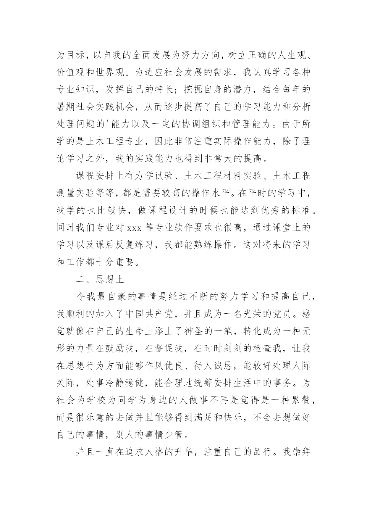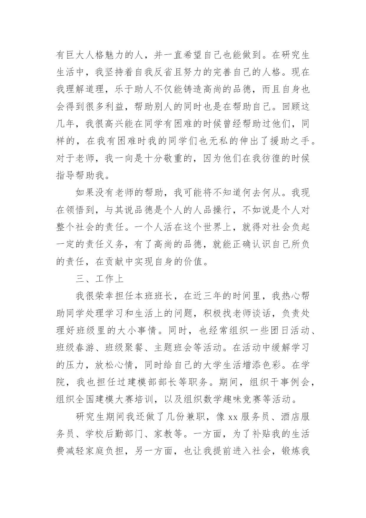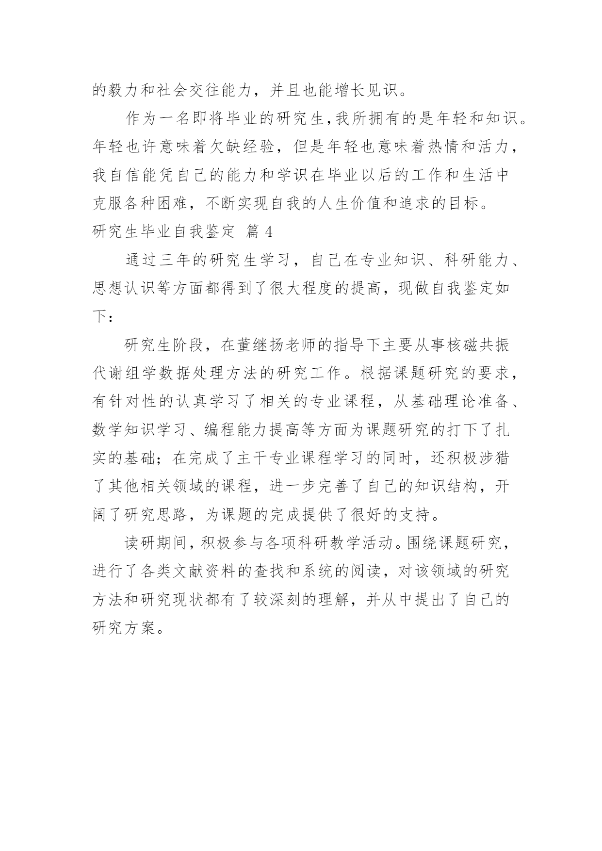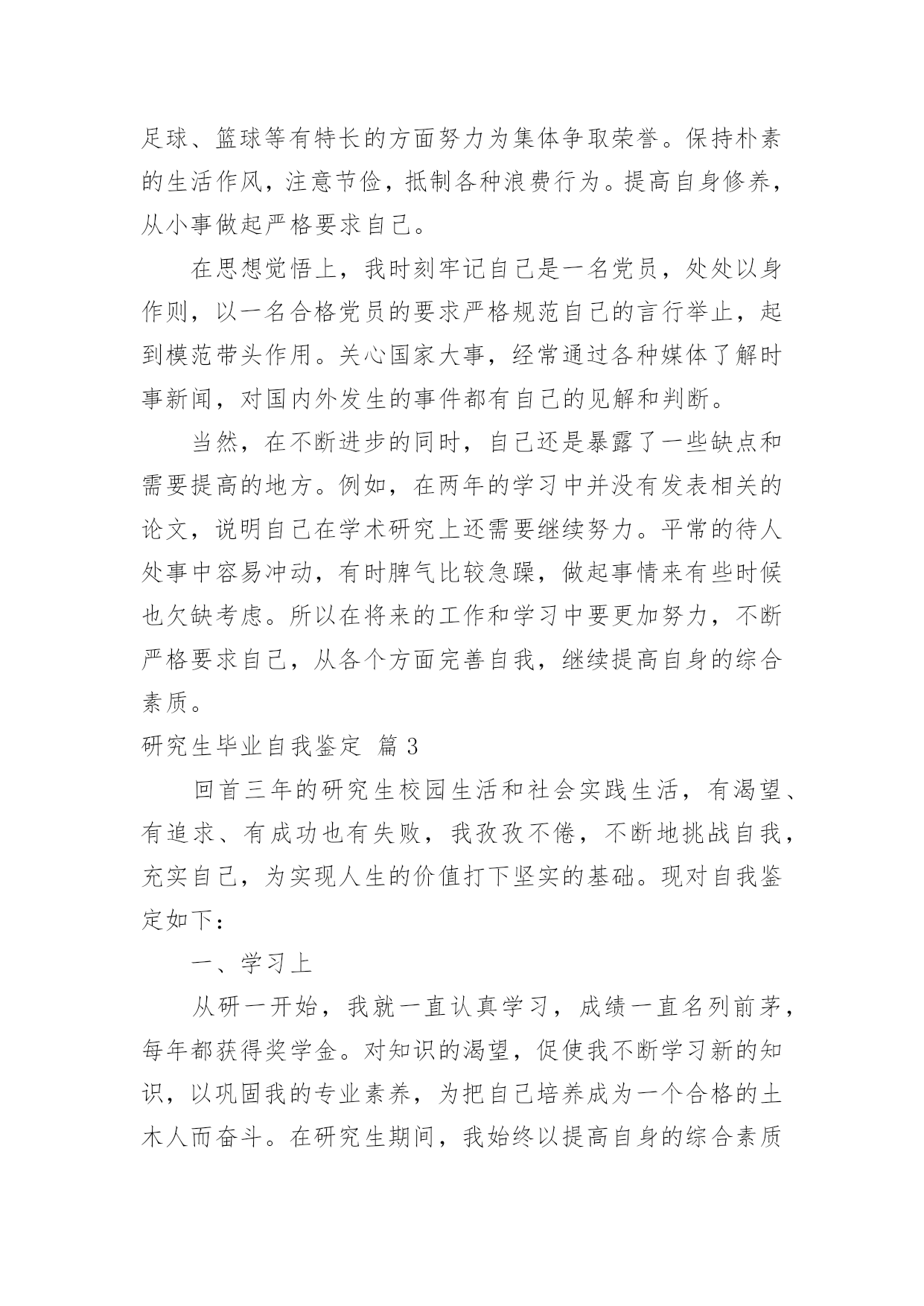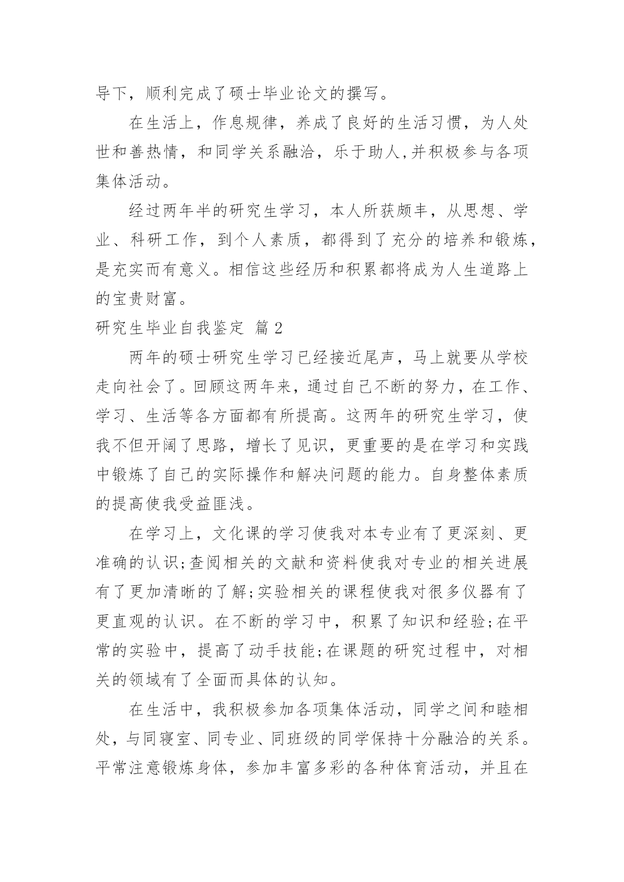 研究生毕业自我鉴定【精华】研究生毕业自我鉴定4篇自我鉴定就是把一个时间段的个人情况进行一次全面系统的总结,写自我鉴定有利于我们工作能力的提高,为此我们要做好总结,写好自我鉴定。自我鉴定一般是怎么写的呢?以下是小编为大家收集的研究生毕业自我鉴定4篇,欢迎大家分享。研究生毕业自我鉴定篇1本人思想先进,乐观积极,乐于助人,通过这三年的硕士研究生学习,在思想、学习、科研、生活等各方面都有所提高,受益匪浅,现汇报如下。在思想上,一直保持较高的思想觉悟,积极主动向党组织靠拢,认真研读马列主义、毛泽东思想、邓小平理论等重要思想,提高自身修养和思想水平,并且撰写心得体会、思想汇报和思想小结,时刻以党员的标准严格要求自己,并于xx年12月光荣的成为一名中国共产党党员。在学习和科研上,对于专业课程的学习刻苦努力,善于思考,对理论知识有了系统深刻的认识,打下了坚实的理论基础,完成了申请硕士学位所要求的全部课程,取得了优异成绩,在研究生一年期期间获得优秀课程奖。科研动手能力较强,参与了国家自然科学基金科研项目的研究,态度严谨,工作认真努力,在“XXXX”期刊发表论文1篇,并在导师指导下,顺利完成了硕士毕业论文的撰写。在生活上,作息规律,养成了良好的生活习惯,为人处世和善热情,和同学关系融洽,乐于助人,并积极参与各项集体活动。经过两年半的研究生学习,本人所获颇丰,从思想、学业、科研工作,到个人素质,都得到了充分的培养和锻炼,是充实而有意义。相信这些经历和积累都将成为人生道路上的宝贵财富。研究生毕业自我鉴定篇2两年的硕士研究生学习已经接近尾声,马上就要从学校走向社会了。回顾这两年来,通过自己不断的努力,在工作、学习、生活等各方面都有所提高。这两年的研究生学习,使我不但开阔了思路,增长了见识,更重要的是在学习和实践中锻炼了自己的实际操作和解决问题的能力。自身整体素质的提高使我受益匪浅。在学习上,文化课的学习使我对本专业有了更深刻、更准确的认识;查阅相关的文献和资料使我对专业的相关进展有了更加清晰的了解;实验相关的课程使我对很多仪器有了更直观的认识。在不断的学习中,积累了知识和经验;在平常的实验中,提高了动手技能;在课题的研究过程中,对相关的领域有了全面而具体的认知。在生活中,我积极参加各项集体活动,同学之间和睦相处,与同寝室、同专业、同班级的同学保持十分融洽的关系。平常注意锻炼身体,参加丰富多彩的各种体育活动,并且在足球、篮球等有特长的方面努力为集体争取荣誉。保持朴素的生活作风,注意节俭,抵制各种浪费行为。提高自身修养,从小事做起严格要求自己。在思想觉悟上,我时刻牢记自己是一名党员,处处以身作则,以一名合格党员的要求严格规范自己的言行举止,起到模范带头作用。关心国家大事,经常通过各种媒体了解时事新闻,对国内外发生的事件都有自己的见解和判断。当然,在不断进步的同时,自己还是暴露了一些缺点和需要提高的地方。例如,在两年的学习中并没有发表相关的论文,说明自己在学术研究上还需要继续努力。平常的待人处事中容易冲动,有时脾气比较急躁,做起事情来有些时候也欠缺考虑。所以在将来的工作和学习中要更加努力,不断严格要求自己,从各个方面完善自我,继续提高自身的综合素质。研究生毕业自我鉴定篇3回首三年的研究生校园生活和社会实践生活,有渴望、有追求、有成功也有失败,我孜孜不倦,不断地挑战自我,充实自己,为实现人生的价值打下坚实的基础。现对自我鉴定如下:一、学习上从研一开始,我就一直认真学习,成绩一直名列前茅,每年都获得奖学金。对知识的渴望,促使我不断学习新的知识,以巩固我的专业素养,为把自己培养成为一个合格的土木人而奋斗。在研究生期间,我始终以提高自身的综合素质为目标,以自我的全面发展为努力方向,树立正确的人生观、价值观和世界观。为适应社会发展的需求,我认真学习各种专业知识,发挥自己的特长;挖掘自身的潜力,结合每年的暑期社会实践机会,从而逐步提高了自己的学习能力和分析处理问题的'能力以及一定的协调组织和管理能力。由于所学的是土木工程专业,因此非常注重实际操作能力,除了理论学习之外,我的实践能力也得到非常大的提高。课程安排上有力学试验、土木工程材料实验、土木工程测量实验等等,都是需要较高的操作水平。在平时的学习中,我学的也比较快,做课程设计的时候也能达到优秀的标准。同时我们专业对xxx等专业软件要求也很高,通过课堂上的学习以及课后反复练习,我都能熟练操作。这对将来的学习和工作都十分重要。二、思想上令我最自豪的事情是经过不断的努力学习和提高自己,我顺利的加入了中国共产党,并且成为一名光荣的党员。感觉就像在自己的生命上添上了神圣的一笔,转化成为一种无形的力量在鼓励我,在督促我,在时时刻刻的检查我,让我在思想行为方面能够作风优良、待人诚恳,能较好处理人际关际,处事冷静稳健,能合理地统筹