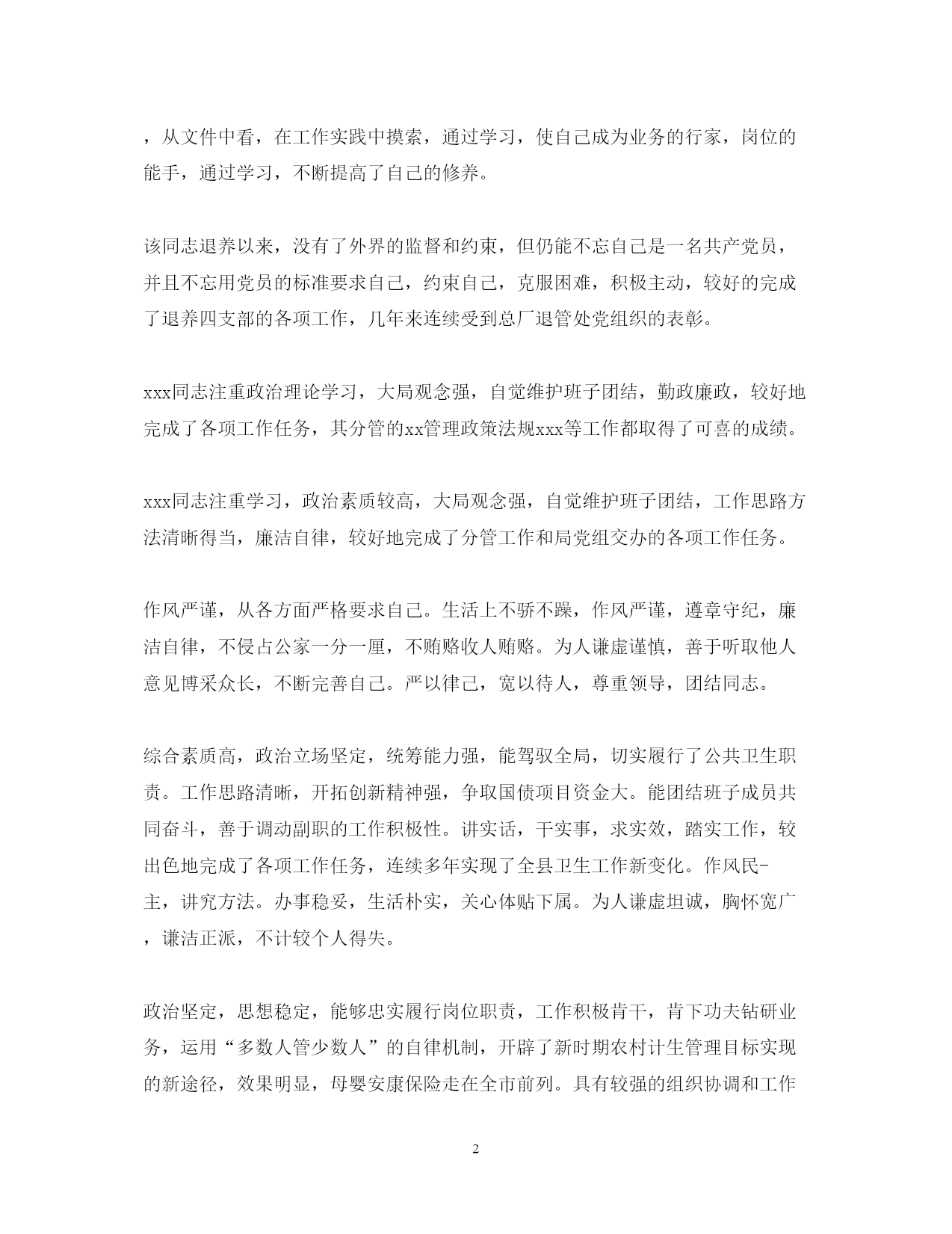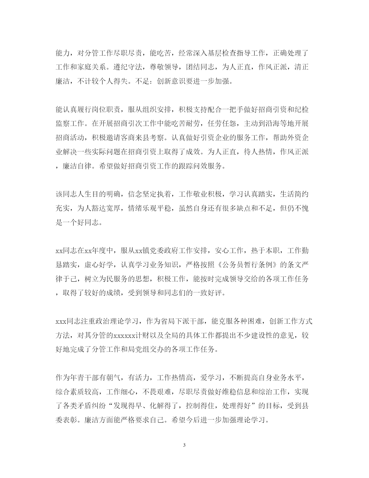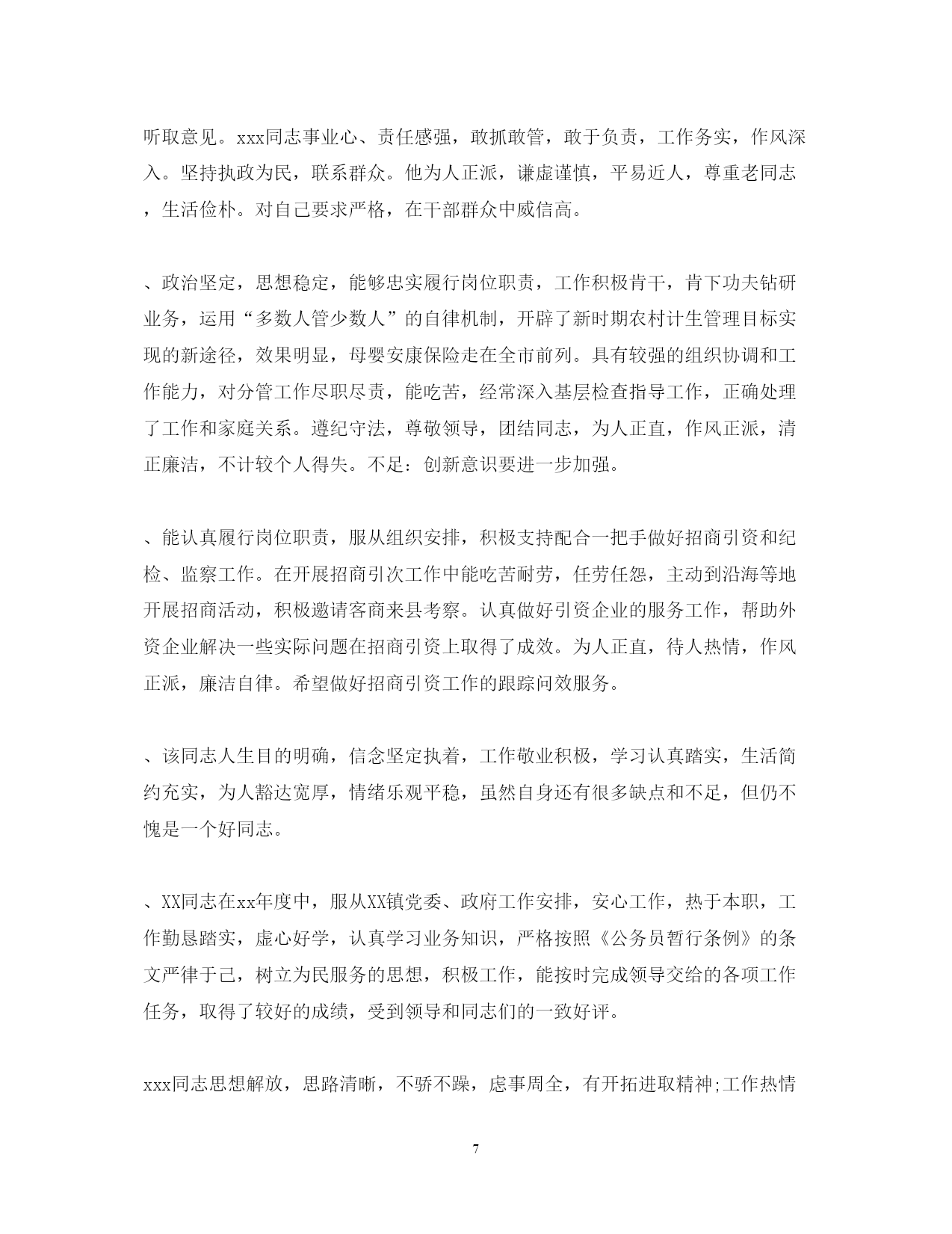 此资料由网络收集而来,如有侵权请告知上传者立即删除。资料共分享,我们负责传递知识。PAGEPAGE920XX年度公务员考核评语xx认真学习党的路线方针政策及法律法规知识,努力提高自己的业务工作能力,严格要求自己,勤于工作,团结同志,遵章守纪。该同志虽然年过半百,却对于自然科学和社会科学有着浓厚的兴趣,学而不厌。经常利用各种机会和渠道学习政治理论科学文化和生活技能,从而使自己的主观思想与客观的社会现实相适应,努力实现与时俱进。个人素质较高,头脑灵活,成熟稳重,维护班子团结,服从组织安排。工作严谨认真,事业心强,能够开拓创新,忠实履行岗位职责,经常深入基层解决实际困难,敢于承担急难险重工作,处理问题较圆满。精通业务,善于学习,勤抓分管工作,思路清晰,见解独特,能够想点子,出措施,较出色地抓好了民生工程建设和疾病预防控制工作。为人本份,待人真诚,乐于助人,作风正派,廉洁守纪。希望在今后工作中更大胆些。xxx同志注重学习,政治理论水平较高,能以大局为重,服从组织安排,勤政廉政,较好地完成了局党组交办的各项工作任务,其分管的xx和xxx等工作呈现出不少新的亮点。认真学习,提高修养。一方面注重加强政治理论学习,全面系统掌握马列主义毛泽东思想,正确学习领会邓小平理论和“三个代表”重要思想精髓,做到理论联系实际,理论指导实践。另一方面注重加强文化知识学习,平时十分注重阅读报纸杂志,从中吸取知识,年就自费参加了华中师范大学中文系的函授学习,目前还买了电脑上了网,刻苦钻研电脑知识,努力从各方面夯实自己的文化功底,积极迎接WTO的挑战本文来自小草范文网。第三,注重加强业务学习,做到书本上学,从文件中看,在工作实践中摸索,通过学习,使自己成为业务的行家,岗位的能手,通过学习,不断提高了自己的修养。该同志退养以来,没有了外界的监督和约束,但仍能不忘自己是一名共产党员,并且不忘用党员的标准要求自己,约束自己,克服困难,积极主动,较好的完成了退养四支部的各项工作,几年来连续受到总厂退管处党组织的表彰。xxx同志注重政治理论学习,大局观念强,自觉维护班子团结,勤政廉政,较好地完成了各项工作任务,其分管的xx管理政策法规xxx等工作都取得了可喜的成绩。xxx同志注重学习,政治素质较高,大局观念强,自觉维护班子团结,工作思路方法清晰得当,廉洁自律,较好地完成了分管工作和局党组交办的各项工作任务。作风严谨,从各方面严格要求自己。生活上不骄不躁,作风严谨,遵章守纪,廉洁自律,不侵占公家一分一厘,不贿赂收人贿赂。为人谦虚谨慎,善于听取他人意见博采众长,不断完善自己。严以律己,宽以待人,尊重领导,团结同志。综合素质高,政治立场坚定,统筹能力强,能驾驭全局,切实履行了公共卫生职责。工作思路清晰,开拓创新精神强,争取国债项目资金大。能团结班子成员共同奋斗,善于调动副职的工作积极性。讲实话,干实事,求实效,踏实工作,较出色地完成了各项工作任务,连续多年实现了全县卫生工作新变化。作风民-主,讲究方法。办事稳妥,生活朴实,关心体贴下属。为人谦虚坦诚,胸怀宽广,谦洁正派,不计较个人得失。政治坚定,思想稳定,能够忠实履行岗位职责,工作积极肯干,肯下功夫钻研业务,运用“多数人管少数人”的自律机制,开辟了新时期农村计生管理目标实现的新途径,效果明显,母婴安康保险走在全市前列。具有较强的组织协调和工作能力,对分管工作尽职尽责,能吃苦,经常深入基层检查指导工作,正确处理了工作和家庭关系。遵纪守法,尊敬领导,团结同志,为人正直,作风正派,清正廉洁,不计较个人得失。不足:创新意识要进一步加强。能认真履行岗位职责,服从组织安排,积极支持配合一把手做好招商引资和纪检监察工作。在开展招商引次工作中能吃苦耐劳,任劳任怨,主动到沿海等地开展招商活动,积极邀请客商来县考察。认真做好引资企业的服务工作,帮助外资企业解决一些实际问题在招商引资上取得了成效。为人正直,待人热情,作风正派,廉洁自律。希望做好招商引资工作的跟踪问效服务。该同志人生目的明确,信念坚定执着,工作敬业积极,学习认真踏实,生活简约充实,为人豁达宽厚,情绪乐观平稳,虽然自身还有很多缺点和不足,但仍不愧是一个好同志。xx同志在xx年度中,服从xx镇党委政府工作安排,安心工作,热于本职,工作勤恳踏实,虚心好学,认真学习业务知识,严格按照《公务员暂行条例》的条文严律于己,树立为民服务的思想,积极工作,能按时完成领导交给的各项工作任务,取得了较好的成绩,受到领导和同志们的一致好评。xxx同志注重政治理论学习,作为省局下派干部,能克服各种困难,创新工作方式方法,对其分管的xxxxxx计财以及全局的具体工作都提出不少建设性的意见,较好地完成了分管工作和局党组交办的各项工作任务。作为年青干部有朝气,有活力