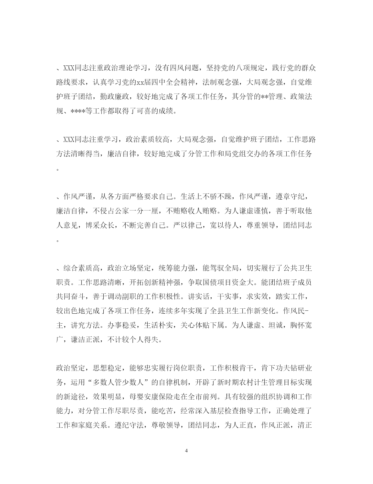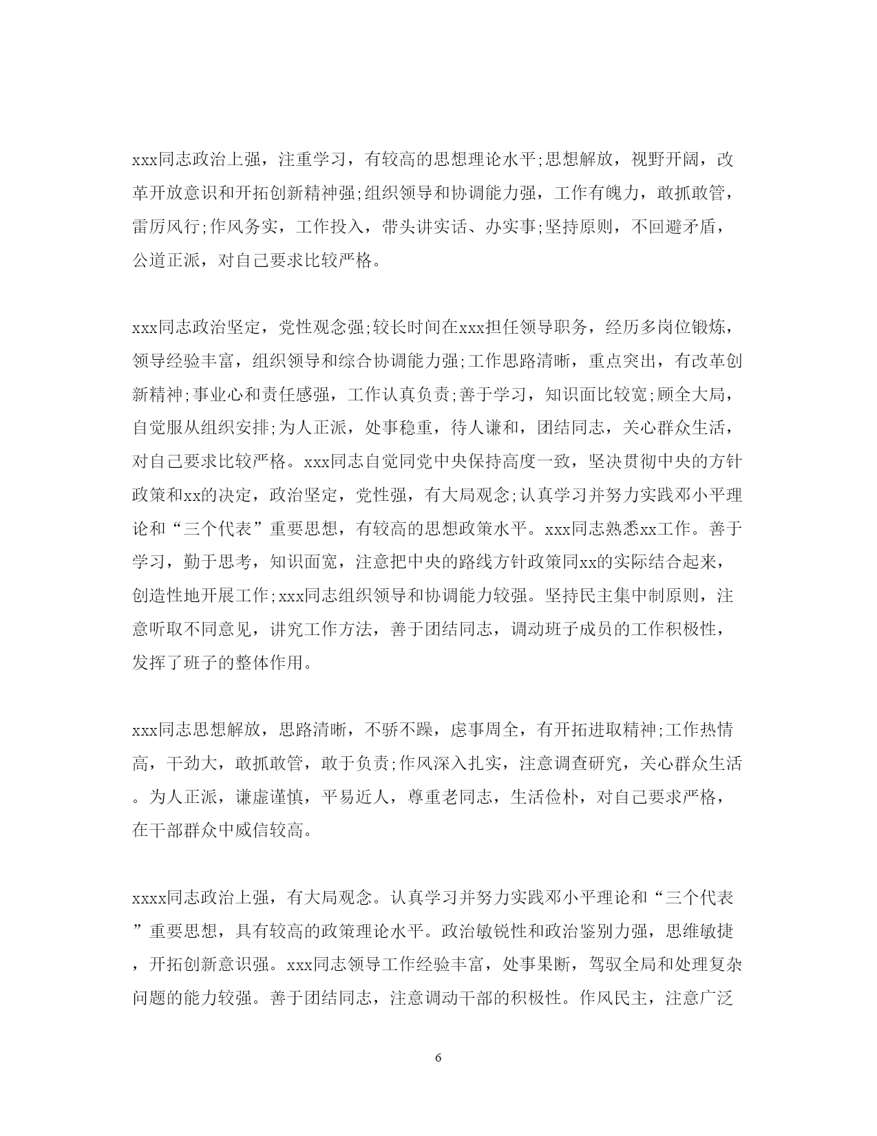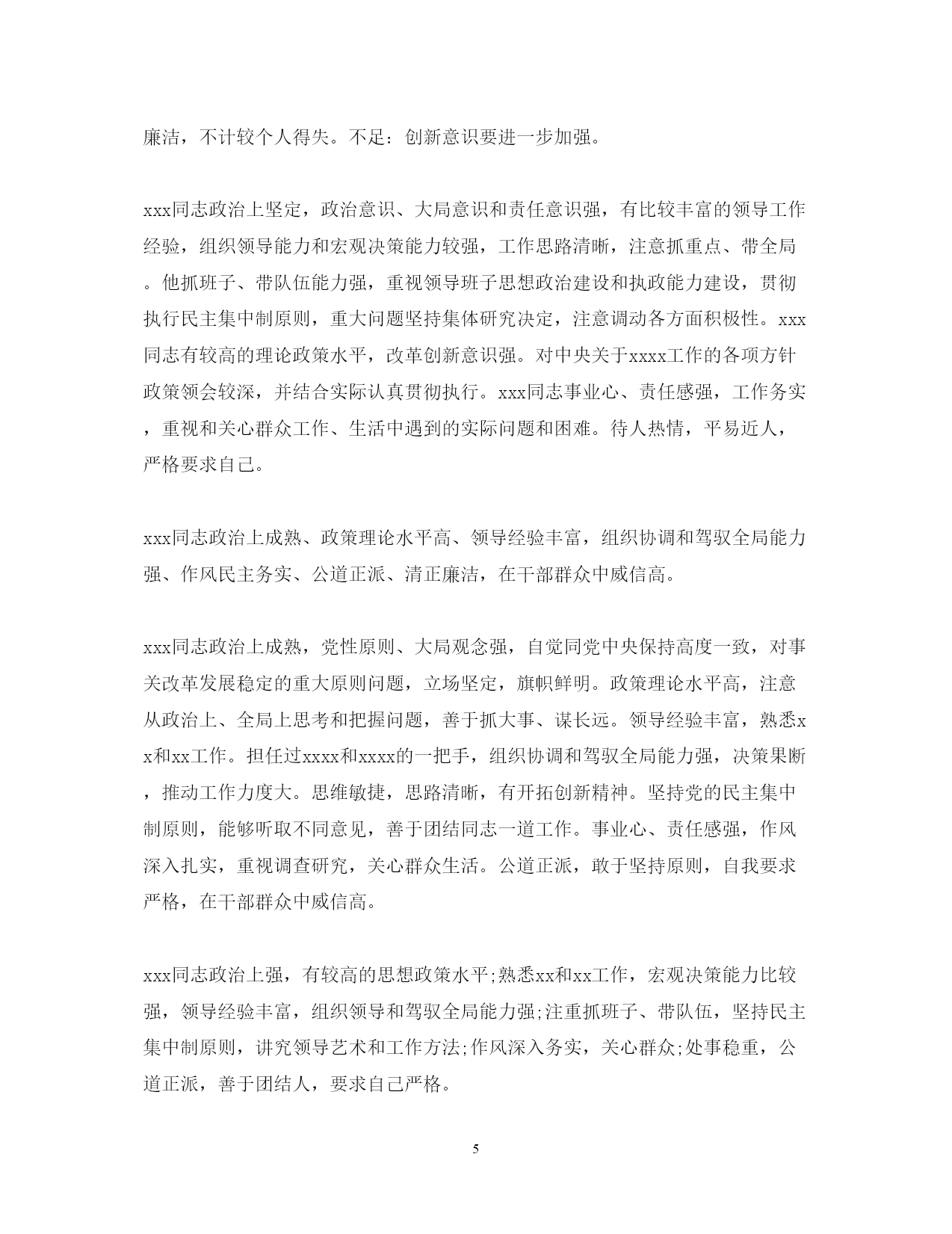 此资料由网络收集而来,如有侵权请告知上传者立即删除。资料共分享,我们负责传递知识。PAGEPAGE920XX年度公务员考核评语xx认真学习党的路线方针政策及法律法规知识,努力提高自己的业务工作能力,严格要求自己,勤于工作,团结同志,遵章守纪。该同志虽然年过半百,却对于自然科学和社会科学有着浓厚的兴趣,学而不厌。经常利用各种机会和渠道学习政治理论科学文化和生活技能,从而使自己的主观思想与客观的社会现实相适应,努力实现与时俱进。个人素质较高,头脑灵活,成熟稳重,维护班子团结,服从组织安排。工作严谨认真,事业心强,能够开拓创新,忠实履行岗位职责,经常深入基层解决实际困难,敢于承担急难险重工作,处理问题较圆满。精通业务,善于学习,勤抓分管工作,思路清晰,见解独特,能够想点子,出措施,较出色地抓好了民生工程建设和疾病预防控制工作。为人本份,待人真诚,乐于助人,作风正派,廉洁守纪。希望在今后工作中更大胆些。xxx同志注重学习,政治理论水平较高,能以大局为重,服从组织安排,勤政廉政,较好地完成了局党组交办的各项工作任务,其分管的xx和xxx等工作呈现出不少新的亮点。认真学习,提高修养。一方面注重加强政治理论学习,全面系统掌握马列主义毛泽东思想,正确学习领会邓小平理论和“三个代表”重要思想精髓,做到理论联系实际,理论指导实践。另一方面注重加强文化知识学习,平时十分注重阅读报纸杂志,从中吸取知识,年就自费参加了华中师范大学中文系的函授学习,目前还买了电脑上了网,刻苦钻研电脑知识,努力从各方面夯实自己的文化功底,积极迎接WTO的挑战本文来自小草范文网。第三,注重加强业务学习,做到书本上学,从文件中看,在工作实践中摸索,通过学习,使自己成为业务的行家,岗位的能手,通过学习,不断提高了自己的修养。该同志退养以来,没有了外界的监督和约束,但仍能不忘自己是一名共产党员,并且不忘用党员的标准要求自己,约束自己,克服困难,积极主动,较好的完成了退养四支部的各项工作,几年来连续受到总厂退管处党组织的表彰。xxx同志注重政治理论学习,大局观念强,自觉维护班子团结,勤政廉政,较好地完成了各项工作任务,其分管的xx管理政策法规xxx等工作都取得了可喜的成绩。xxx同志注重学习,政治素质较高,大局观念强,自觉维护班子团结,工作思路方法清晰得当,廉洁自律,较好地完成了分管工作和局党组交办的各项工作任务。作风严谨,从各方面严格要求自己。生活上不骄不躁,作风严谨,遵章守纪,廉洁自律,不侵占公家一分一厘,不贿赂收人贿赂。为人谦虚谨慎,善于听取他人意见博采众长,不断完善自己。严以律己,宽以待人,尊重领导,团结同志。综合素质高,政治立场坚定,统筹能力强,能驾驭全局,切实履行了公共卫生职责。工作思路清晰,开拓创新精神强,争取国债项目资金大。能团结班子成员共同奋斗,善于调动副职的工作积极性。讲实话,干实事,求实效,踏实工作,较出色地完成了各项工作任务,连续多年实现了全县卫生工作新变化。作风民-主,讲究方法。办事稳妥,生活朴实,关心体贴下属。为人谦虚坦诚,胸怀宽广,谦洁正派,不计较个人得失。政治坚定,思想稳定,能够忠实履行岗位职责,工作积极肯干,肯下功夫钻研业务,运用“多数人管少数人”的自律机制,开辟了新时期农村计生管理目标实现的新途径,效果明显,母婴安康保险走在全市前列。具有较强的组织协调和工作能力,对分管工作尽职尽责,能吃苦,经常深入基层检查指导工作,正确处理了工作和家庭关系。遵纪守法,尊敬领导,团结同志,为人正直,作风正派,清正廉洁,不计较个人得失。不足:创新意识要进一步加强。能认真履行岗位职责,服从组织安排,积极支持配合一把手做好招商引资和纪检监察工作。在开展招商引次工作中能吃苦耐劳,任劳任怨,主动到沿海等地开展招商活动,积极邀请客商来县考察。认真做好引资企业的服务工作,帮助外资企业解决一些实际问题在招商引资上取得了成效。为人正直,待人热情,作风正派,廉洁自律。希望做好招商引资工作的跟踪问效服务。该同志人生目的明确,信念坚定执着,工作敬业积极,学习认真踏实,生活简约充实,为人豁达宽厚,情绪乐观平稳,虽然自身还有很多缺点和不足,但仍不愧是一个好同志。xx同志在xx年度中,服从xx镇党委政府工作安排,安心工作,热于本职,工作勤恳踏实,虚心好学,认真学习业务知识,严格按照《公务员暂行条例》的条文严律于己,树立为民服务的思想,积极工作,能按时完成领导交给的各项工作任务,取得了较好的成绩,受到领导和同志们的一致好评。xxx同志注重政治理论学习,作为省局下派干部,能克服各种困难,创新工作方式方法,对其分管的xxxxxx计财以及全局的具体工作都提出不少建设性的意见,较好地完成了分管工作和局党组交办的各项工作任务。作为年青干部有朝气,有活力