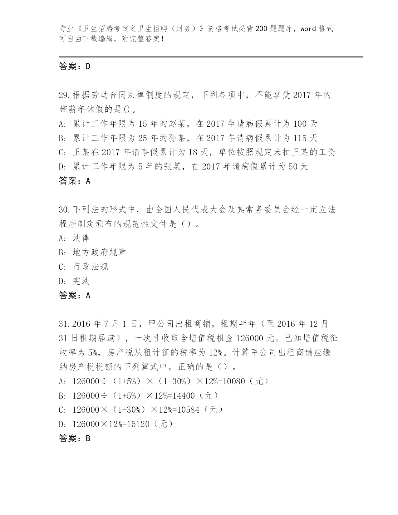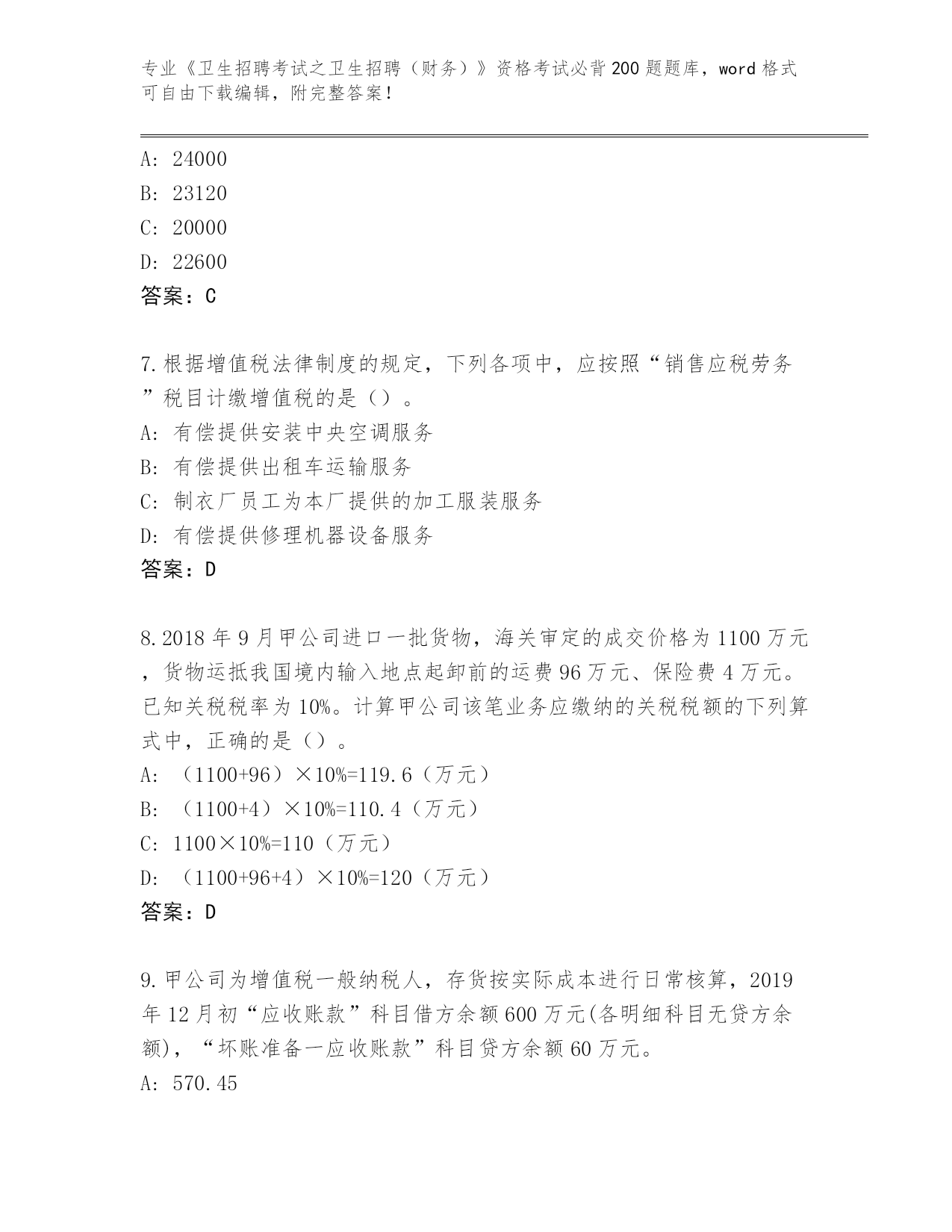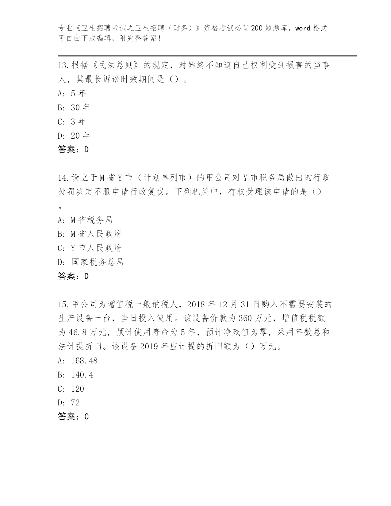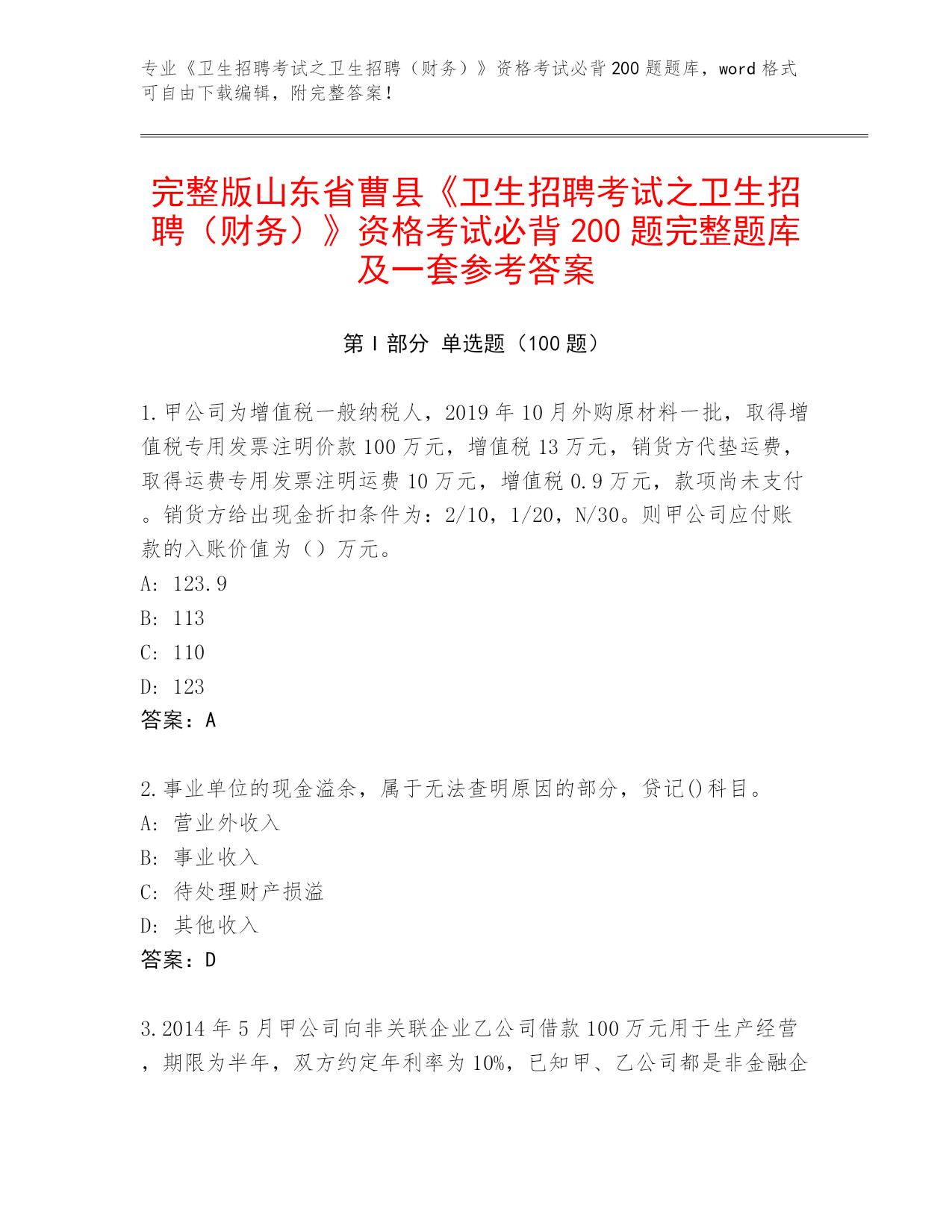 完整版山东省曹县《卫生招聘考试之卫生招聘(财务)》资格考试必背200题完整题库及一套参考答案