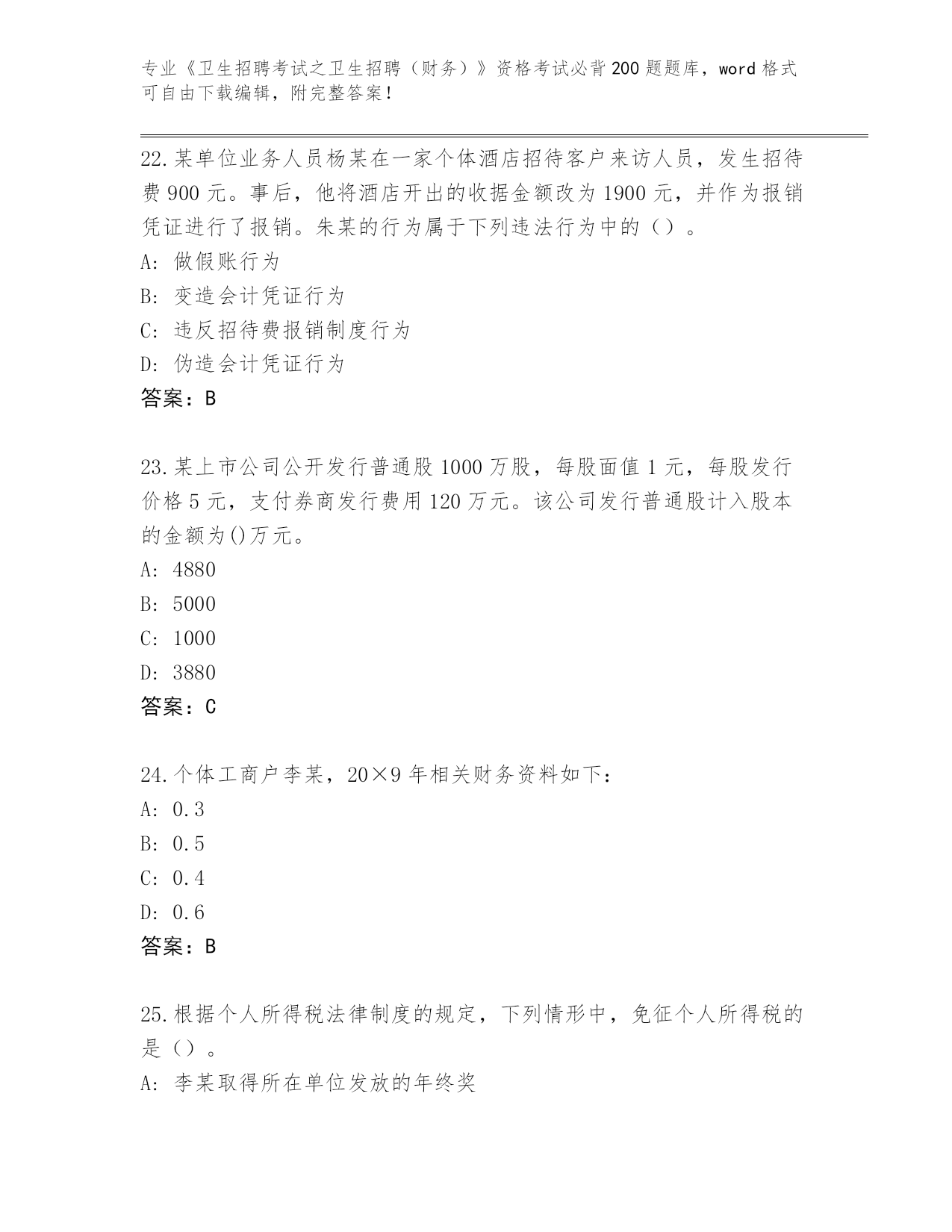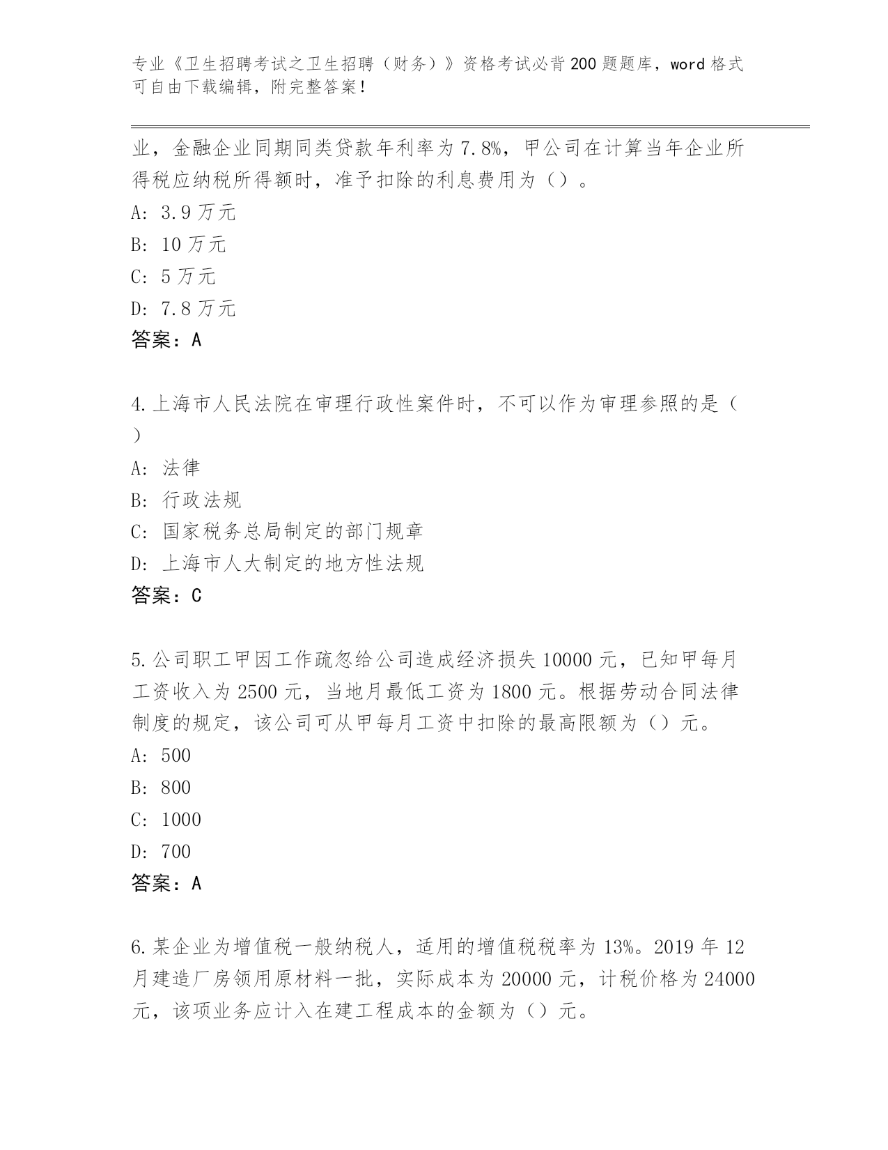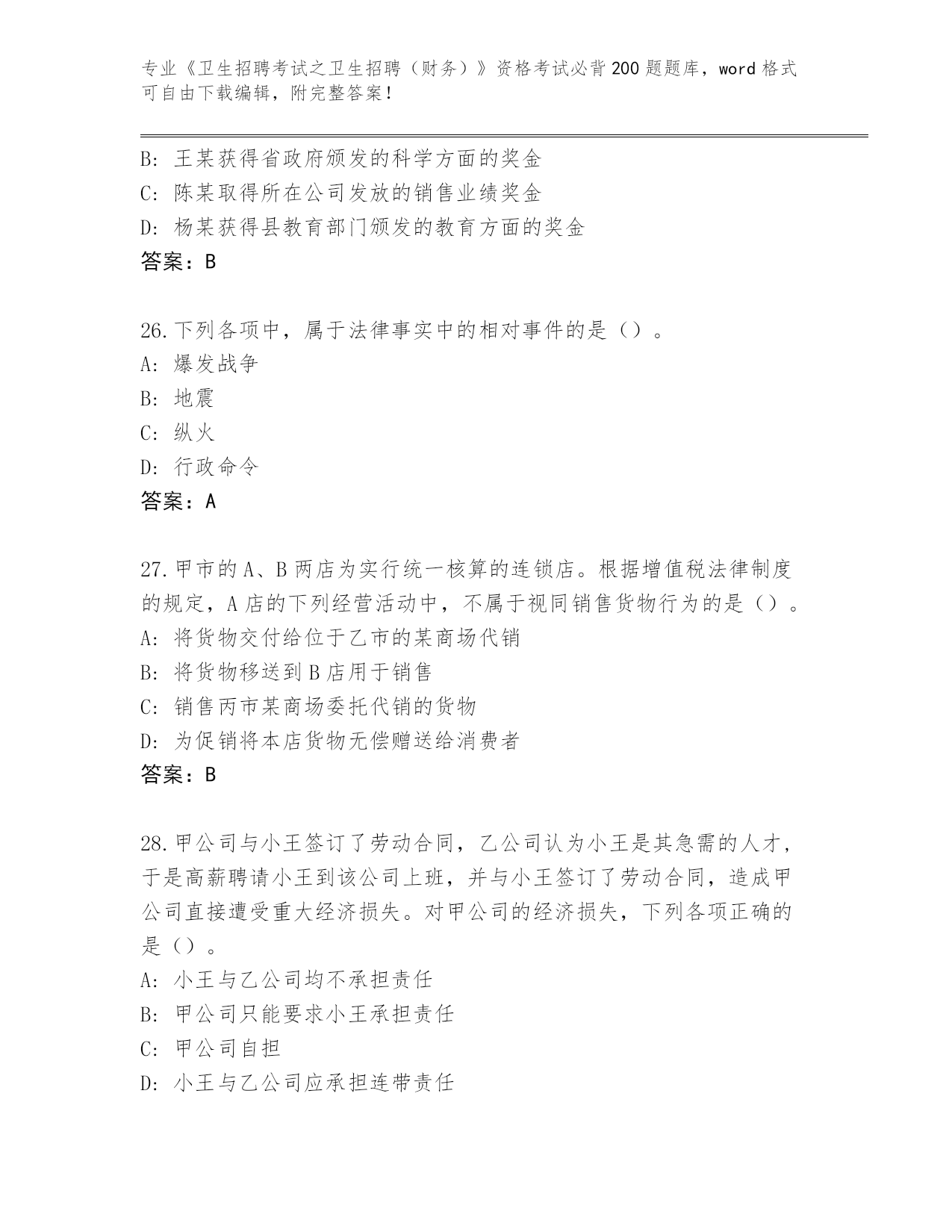山东省曹县整理《卫生招聘考试之卫生招聘(财务)》考试必背200题完整题库及参考答案(名师推荐)