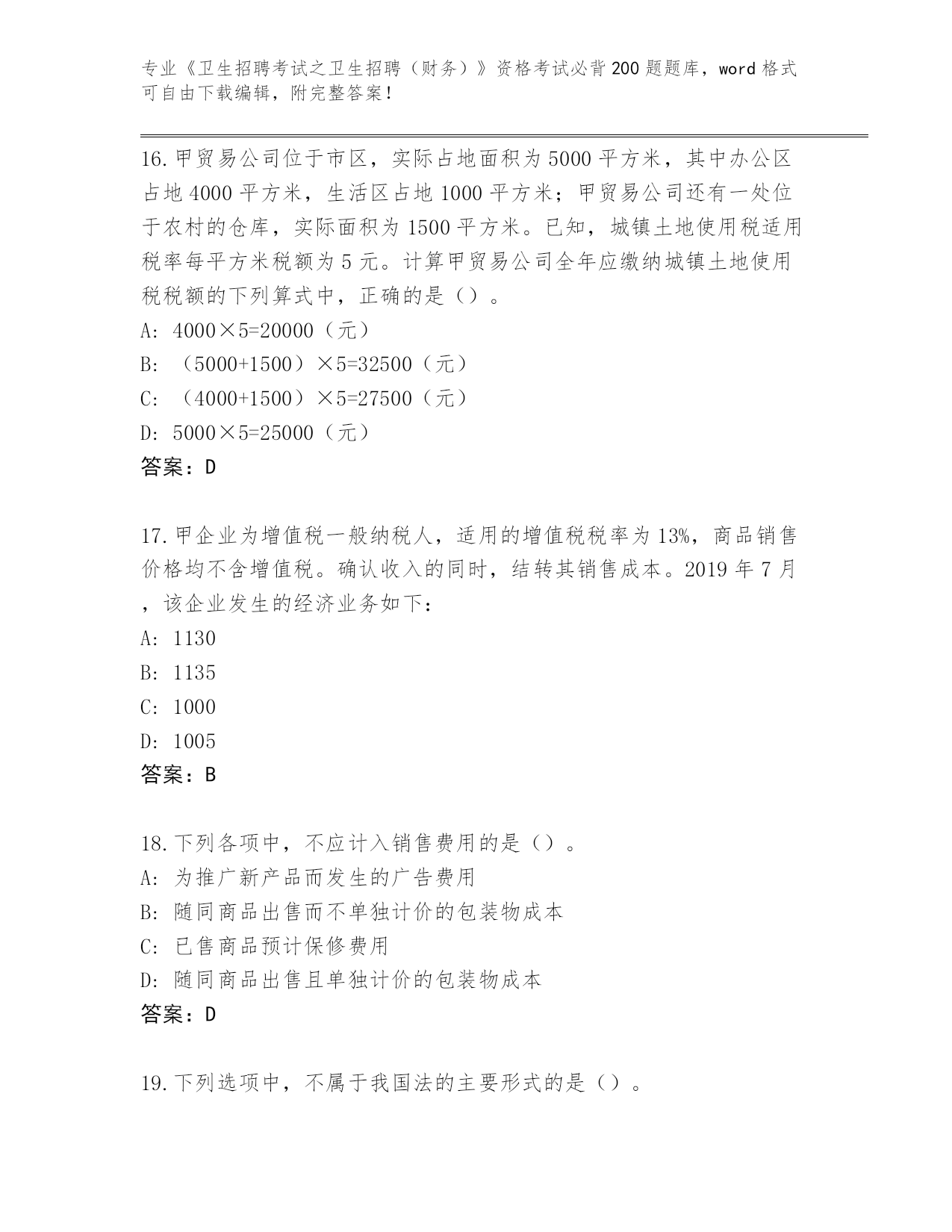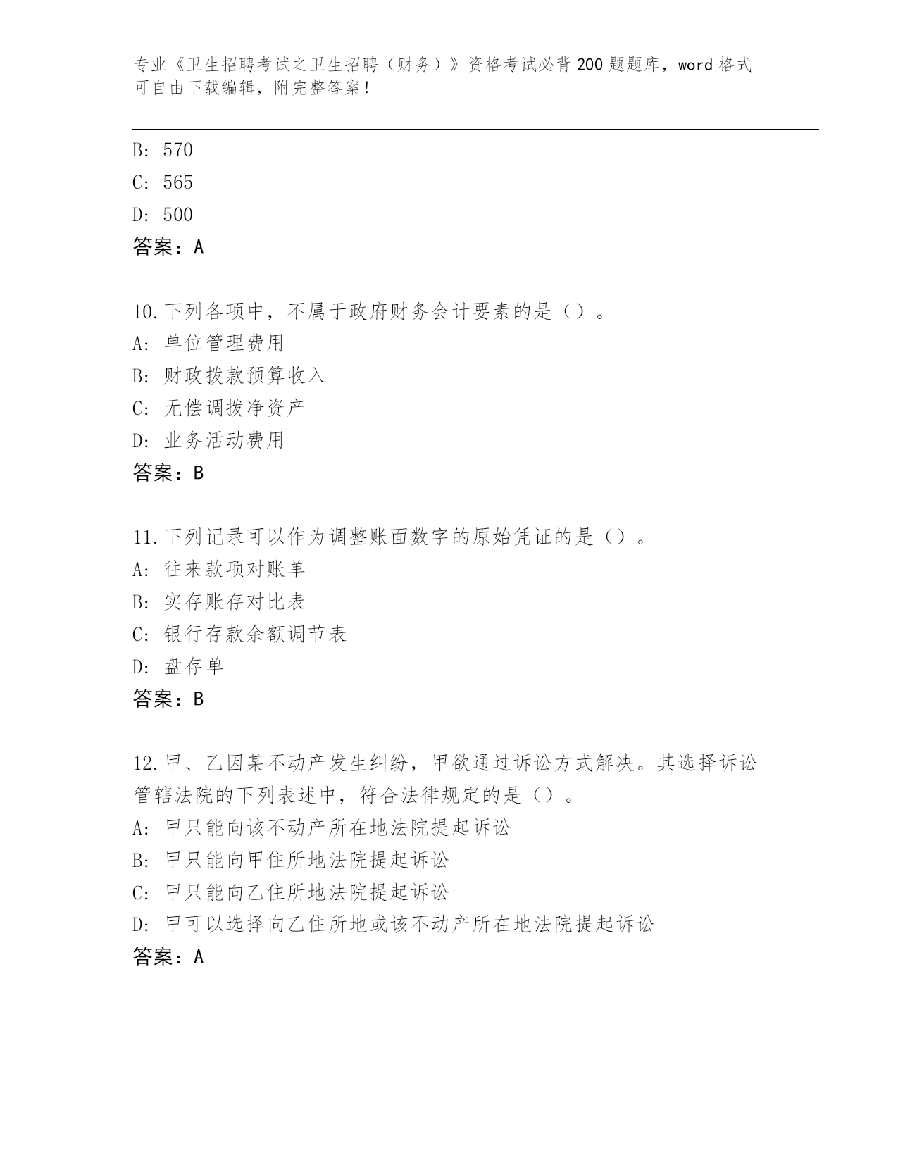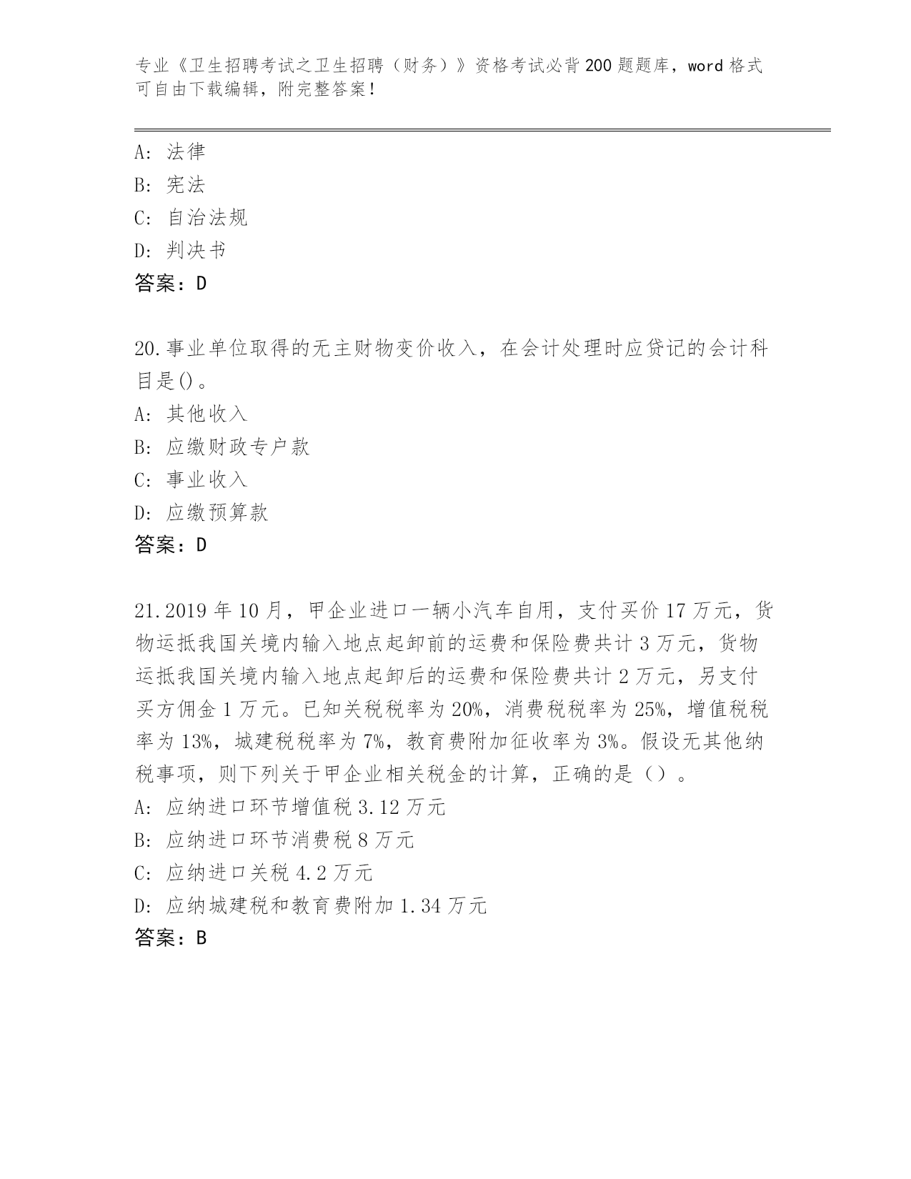 山东省曹县整理《卫生招聘考试之卫生招聘(财务)》考试必背200题完整题库及参考答案(名师推荐)