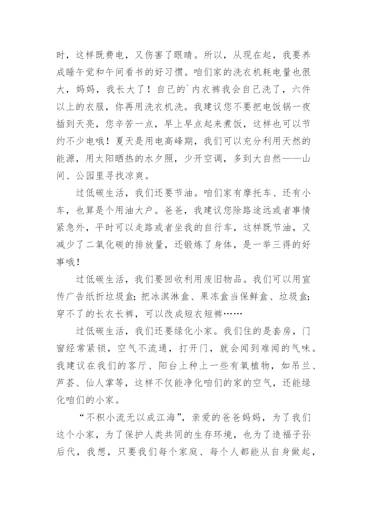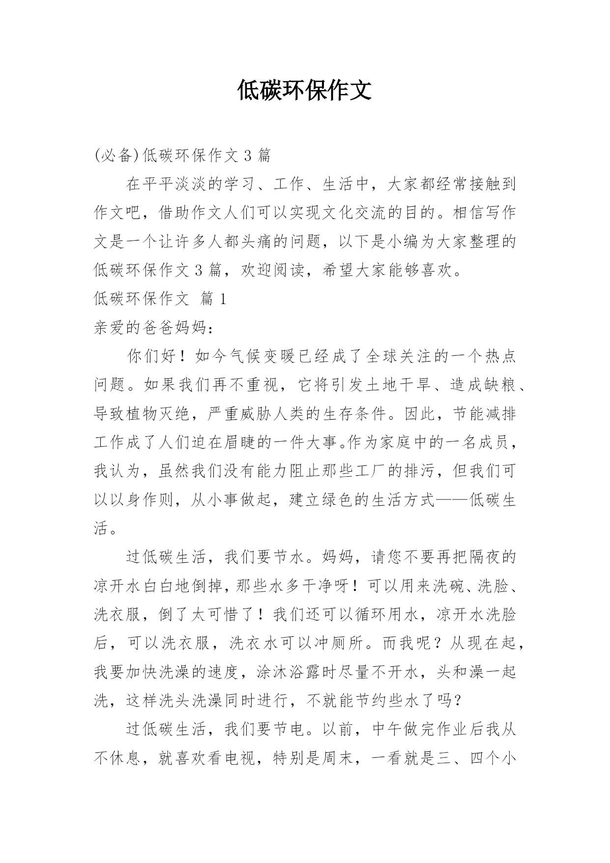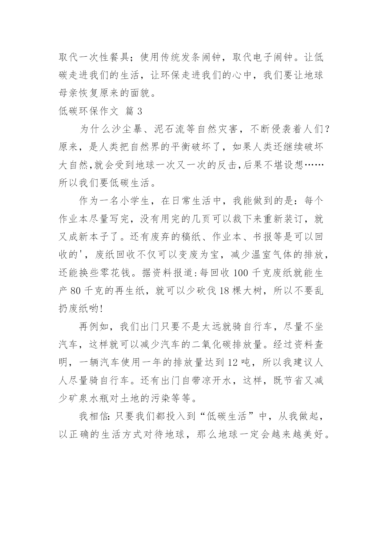 低碳环保作文(必备)低碳环保作文3篇在平平淡淡的学习、工作、生活中,大家都经常接触到作文吧,借助作文人们可以实现文化交流的目的。相信写作文是一个让许多人都头痛的问题,以下是小编为大家整理的低碳环保作文3篇,欢迎阅读,希望大家能够喜欢。低碳环保作文篇1亲爱的爸爸妈妈:你们好!如今气候变暖已经成了全球关注的一个热点问题。如果我们再不重视,它将引发土地干旱、造成缺粮、导致植物灭绝,严重威胁人类的生存条件。因此,节能减排工作成了人们迫在眉睫的一件大事。作为家庭中的一名成员,我认为,虽然我们没有能力阻止那些工厂的排污,但我们可以以身作则,从小事做起,建立绿色的生活方式——低碳生活。过低碳生活,我们要节水。妈妈,请您不要再把隔夜的凉开水白白地倒掉,那些水多干净呀!可以用来洗碗、洗脸、洗衣服,倒了太可惜了!我们还可以循环用水,凉开水洗脸后,可以洗衣服,洗衣水可以冲厕所。而我呢?从现在起,我要加快洗澡的速度,涂沐浴露时尽量不开水,头和澡一起洗,这样洗头洗澡同时进行,不就能节约些水了吗?过低碳生活,我们要节电。以前,中午做完作业后我从不休息,就喜欢看电视,特别是周末,一看就是三、四个小时,这样既费电,又伤害了眼睛。所以,从现在起,我要养成睡午觉和午间看书的好习惯。咱们家的洗衣机耗电量也很大,妈妈,我长大了!自己的`内衣裤我会自己洗了,六件以上的衣服,你再用洗衣机洗。我建议您不要把电饭锅一夜插到天亮,您辛苦一点,早上早点起来煮饭,这样也可以节约不少电哦!夏天是用电高峰期,我们可以充分利用天然的能源,用太阳晒热的水夕照,少开空调,多到大自然——山间、公园里寻找凉爽。过低碳生活,我们还要节油。咱们家有摩托车、还有小车,也算是个用油大户。爸爸,我建议您除路途远或者事情紧急外,平时可以走路或者坐我的自行车,这样既节油,又减少了二氧化碳的排放量,还锻炼了身体,是一举三得的好事哦!过低碳生活,我们要回收利用废旧物品。我们可以用宣传广告纸折垃圾盒;把冰淇淋盒、果冻盒当保鲜盒、垃圾盒;穿不了的长衣长裤,可以改成短衣短裤……过低碳生活,我们还要绿化小家。我们住的是套房,门窗经常紧锁,空气不流通,打开门,就会闻到难闻的气味。我建议在我们的客厅、阳台上种上一些有氧植物,如吊兰、芦荟、仙人掌等,这样不仅能净化咱们的家的空气,还能绿化咱们的小家。“不积小流无以成江海”,亲爱的爸爸妈妈,为了我们这个小家,为了保护人类共同的生存环境,也为了造福子孙后代,我想,只要我们每个家庭、每个人都能从自身做起,从身边小事做起,努力创建绿色生活方式——过低碳生活,一定能为我们的小家、为祖国、为全球创造和谐美好的未来!让我们为此共同努力吧!你们的女儿20xx年11月5日低碳环保作文篇2文明谁都该知道,来读读这篇文章,理解文明真正要做到什么吧!位于新疆塔里木盆地的楼兰古国,在我国汉代时是一个水草丰美、经济繁荣的文明之邦,也是丝绸之路上商贾云集的一颗璀璨明珠。但是,随着塔里木河上、中游人口的'增多,区域开发活动的加强,楼兰人赖以生存的塔里木河水量急剧减少,甚至经常出现断流,结果导致楼兰地区的生态环境不断恶化,最终被沙漠所吞噬而亡国。如今,人们只能在漫漫黄沙中探寻古楼兰的文明残迹。含氟利昂电冰箱的滥用导致南极臭氧空洞,是因为过去氟利昂用量过多,排放到空气中造成的,会有大量紫外线照射地球,地球温度升高,皮肤癌等发率升高,我们应该重视低碳生活,而所谓的“低碳”就是减少二氧化碳。要想做到低碳生活首先我们要多骑车,少开车,汽车的尾气的排放造成了环境污染,严重影响了人们的健康。其次我们还要多植树,原因是树木可以理沙化耕地,控制水土流失,防风固沙,增加土壤蓄水能力,可以大大改善生态环境。其次还要少开空调。最后,我们还应该以环保购物袋替代塑料袋;以节能灯代替白炽灯;用永久性筷子、饭盒,取代一次性餐具;使用传统发条闹钟,取代电子闹钟。让低碳走进我们的生活,让环保走进我们的心中,我们要让地球母亲恢复原来的面貌。低碳环保作文篇3为什么沙尘暴、泥石流等自然灾害,不断侵袭着人们?原来,是人类把自然界的平衡破坏了,如果人类还继续破坏大自然,就会受到地球一次又一次的反击,后果不堪设想……所以我们要低碳生活。作为一名小学生,在日常生活中,我能做到的是:每个作业本尽量写完,没有用完的几页可以裁下来重新装订,就又成新本子了。还有废弃的稿纸、作业本、书报等是可以回收的',废纸回收不仅可以变废为宝,减少温室气体的排放,还能换些零花钱。据资料报道:每回收100千克废纸就能生产80千克的再生纸,就可以少砍伐18棵大树,所以不要乱扔废纸哟!再例如,我们出门只要不是太远就骑自行车,尽量不坐汽车,这样就可以减少汽车的二氧化碳排放量。经过资料查明,一辆汽车使用一年的排放量达到12吨,所以我建议人人尽量骑自行车。还有出门自带凉开水,这样,既节省