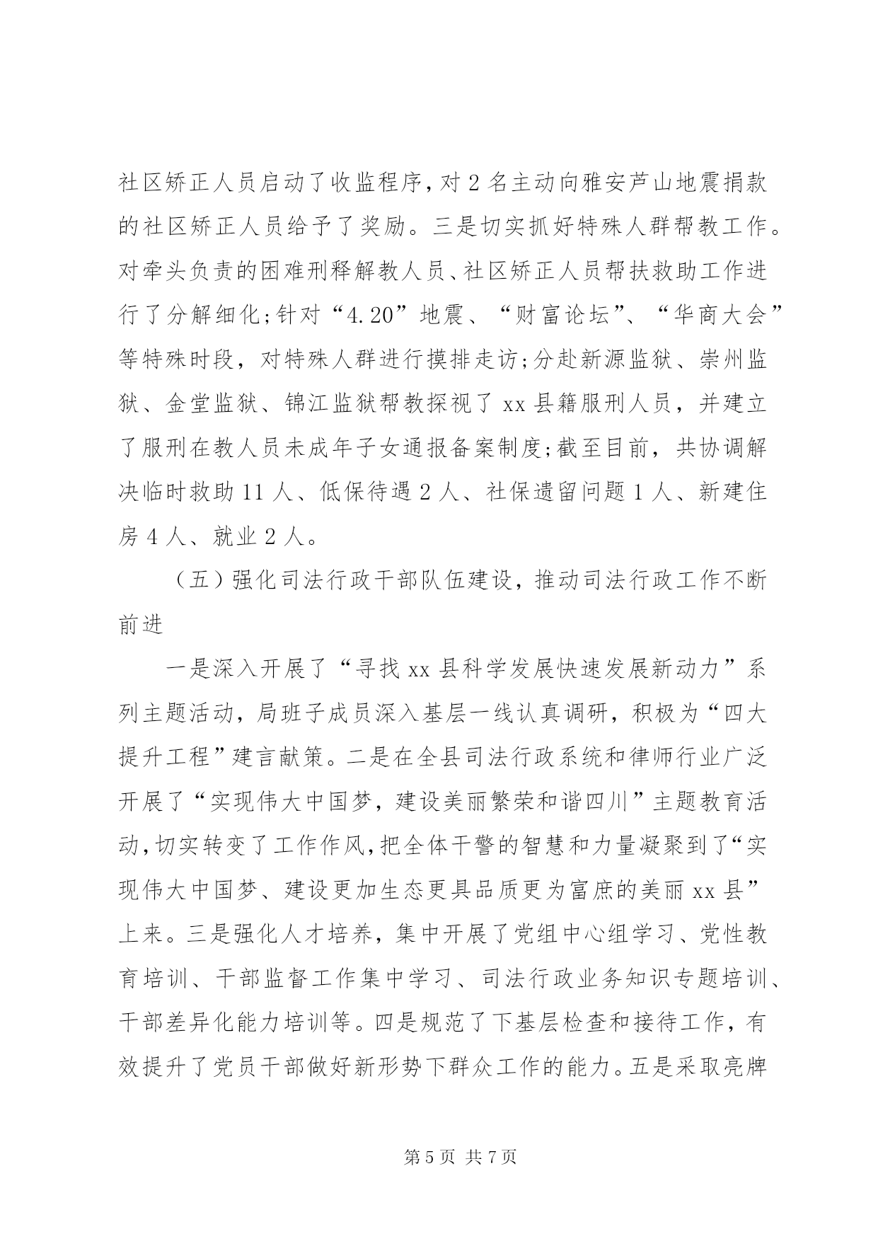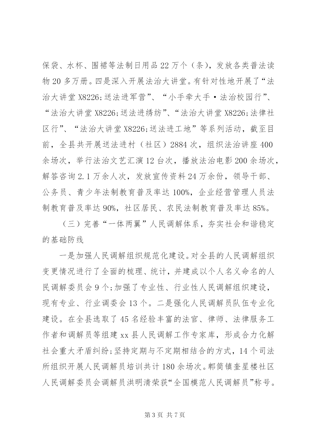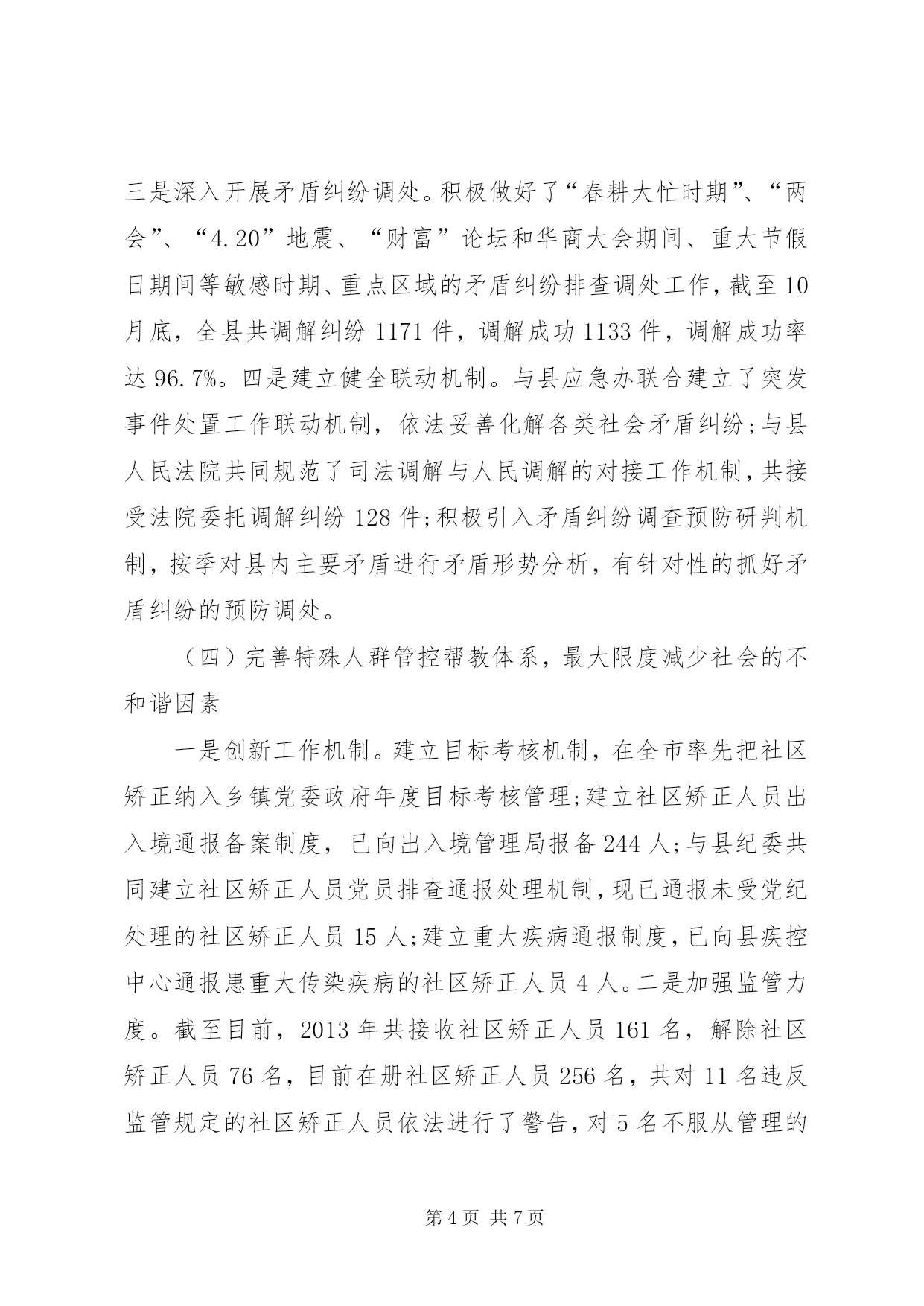 第PAGE\*Arabic\*MERGEFORMAT7页共NUMPAGES\*MERGEFORMAT7页乡镇司法局工作总结2013年,xx县司法局认真落实县委、县政府的总体要求和上级司法行政机关的工作部署,切实加强和创新社会管理,为建设更加生态更具品质更为富庶的美丽xx县提供了优质高效的法律服务和法律保障。一、2013年工作总结(一)完善法律服务体系,大力推进社会管理法治化一是公证工作积极服务县委政府重点工作。为德源镇、三道堰镇、犀浦镇等安置房抽签分配工作进行了全程监督公证,确保了1万余户农户如期入住新居,为沱江河旧城改造等重点项目的阳光推进提供公证服务50余次,截至目前,公证处共完成办证11447件,其中涉外公证228件,接待群众法律咨询2.5万余人次。二是深化法律服务信息网络建设。开通了“xx县律师服务热线”——028-69512098,该热线已为群众提供法律咨询200余件;对xx县司法局官方微博、xx县法律援助中心微博和法治宣传微博进行了严格规范管理。三是大力推进城乡公共法律服务工作。在推进法律服务工作室全覆盖的基础上,完成了新建60个规范化村(社区)法律服务工作室的民生工程目标;落实了“一村(社区)一律师”制度,指导驻村(社区)法律顾问接待法律咨询500余人次;积极开展法律援助“双延伸”活动,排查走访困难群体500余户,建立了xx县法律援助潜在援助对象服务数据库。四是扎实推进法律援助民生工程。在德源新城新建了县级规范化法律援助接待受理大厅并已试运行;在犀浦镇新建了乡镇规范化法律援助工作站并已投入使用;截至目前,共为困难群众提供法律援助服务3627人次,受理法律援助案件256件,援助率达100%。(二)完善法治城市创建工作体系,使法治理念内化为干部群众的行为指南一是全面实施“六五”普法,大力推进法治城市创建工作。积极动员和组织各镇各部门参与“法律六进”工作,深入推进我县法制宣传工作和法治城市创建工作;2013年3月,xx县荣获“全国法治城市法治县(市区)创建活动先进单位”殊荣;我县5个集体、9名个人荣获2006—2010年xx市法制宣传教育先进集体和先进个人表彰。今年10月,“六五”普法中期工作代表xx市接受了全国普法办、司法部检查,受到好评。二是拓宽法治宣传渠道,创新普法载体。构建了公众信息网、政务微博、手机短彩信等相结合的普法宣传立体网络,开设了县内刊社“法治xx县”专栏xx县电视台“蜀都访谈”法制节目,利用各类led显示屏设置了“法治之窗”,年内共发送法治公益短信10.8万条,法治公益彩信12万条。三是法治宣传更加亲民便民。在三道堰镇打造了大型法治文化基础设施“xx县水乡尚法大道”,在县域内安装了46个固定法治建设宣传灯箱,免费向群众发放法制宣传环保袋、水杯、围裙等法制日用品22万个(条),发放各类普法读物20多万册。四是深入开展法治大讲堂。有针对性地开展了“法治大讲堂X8226;送法进军营”、“小手牵大手·法治校园行”、“法治大讲堂X8226;送法进绣纺”、“法治大讲堂X8226;法律社区行”、“法治大讲堂X8226;送法进工地”等系列活动,截至目前,全县共开展送法进村(社区)2884次,组织法治讲座400余场次,举行法治文艺汇演12台次,播放法治电影200余场次,解答咨询2.1万余人次,发放宣传资料24万余份,领导干部、公务员、青少年法制教育普及率达100%,企业经营管理人员法制教育普及率达90%,社区居民、农民法制教育普及率达85%。(三)完善“一体两翼”人民调解体系,夯实社会和谐稳定的基础防线一是加强人民调解组织规范化建设。对全县的人民调解组织变更情况进行了全面的梳理、统计,并建成以个人名义命名的人民调解委员会9个;加强了专业性、行业性人民调解组织建设,现有专业、行业调委会13个。二是强化人民调解员队伍专业化建设。在全县选取了45名经验丰富的法官、律师、法律服务工作者和调解员等组建xx县人民调解工作专家库,形成合力化解社会重大矛盾纠纷;坚持定期与不定期相结合的方式,14个司法所组织开展人民调解员培训共计180余场次。郫筒镇奎星楼社区人民调解委员会调解员洪明清荣获“全国模范人民调解员”称号。三是深入开展矛盾纠纷调处。积极做好了“春耕大忙时期”、“两会”、“4.20”地震、“财富”论坛和华商大会期间、重大节假日期间等敏感时期、重点区域的矛盾纠纷排查调处工作,截至10月底,全县共调解纠纷1171件,调解成功1133件,调解成功率达96.7%。四是建立健全联动机制。与县应急办联合建立了突发事件处置工作联动机制,依法妥善化解各类社会矛盾纠纷;与县人民法院共同规范了司法调解与人民调解的对接工作机制,共接受法院委托调解纠纷128件;积极引入矛盾纠纷调查预防研判机制,按季对县内主要矛盾进行矛盾形势