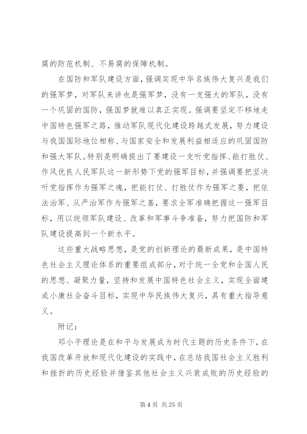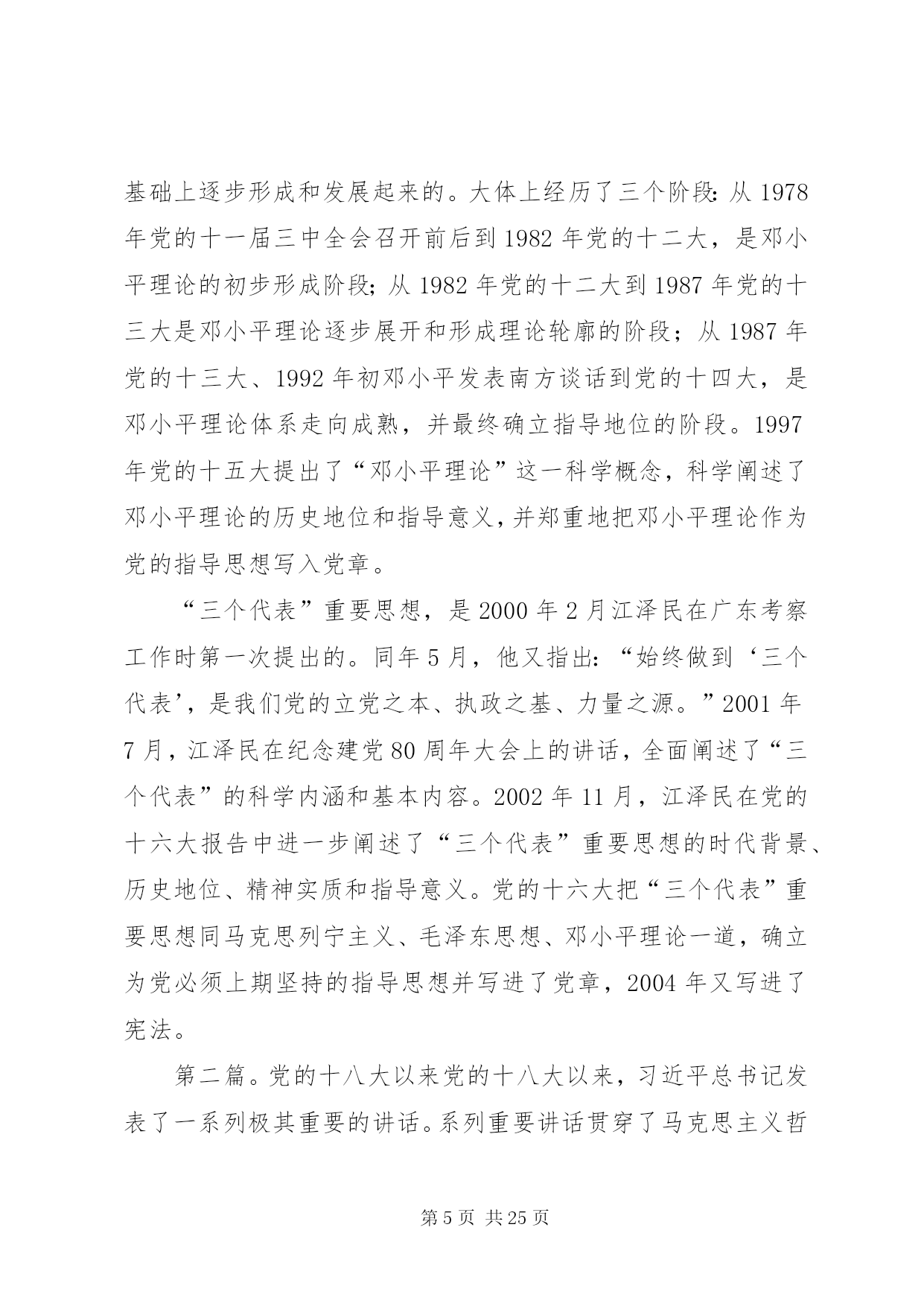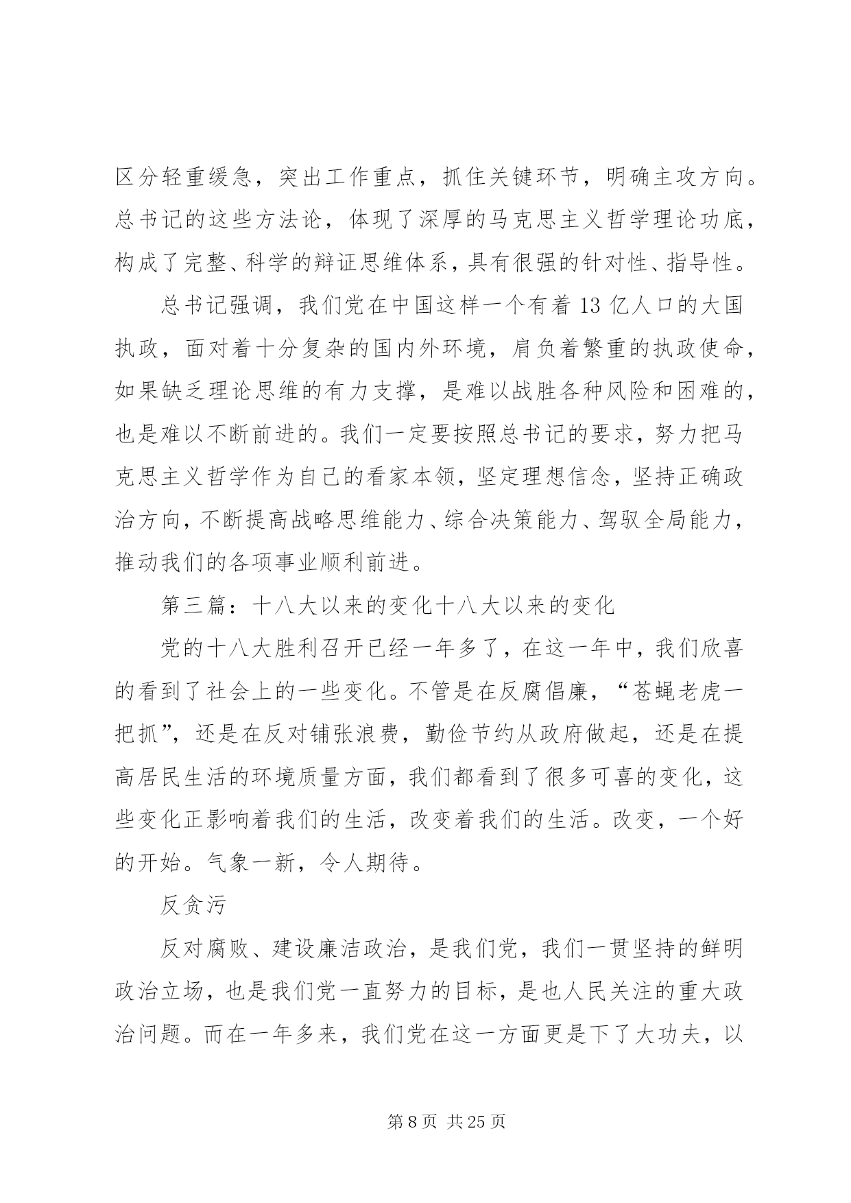 第PAGE\*Arabic\*MERGEFORMAT25页共NUMPAGES\*MERGEFORMAT25页十八大以来的理论创新5篇范文第一篇:十八大以来的理论创新十八大以来的理论创新党的十八大以来,以习近平为总书记的党中央,围绕坚持和发展中国特色社会主义,全面推进社会主义经济建设、政治建设、文化建设、社会建设、生态文明建设,推进党的建设新的伟大工程,提出了一系列重大战略思想,丰富和发展了中国特色社会主义理论体系。在经济建设方面,提出以经济建设为中心是兴国之要,发展仍是解决我国所有问题的关键,要坚持以科学发展为主题,以加快转变经济发展方式为主线,以提高经济增长质量和效益为中心,加大经济结构战略性调整力度,实现经济持续健康发展。强调改革开放是当代中国发展进步的活力之源,是坚持和发展中国特色社会主义的必由之路,解决我国进一步发展面临的一系列突出矛盾和挑战,必须继续推进改革开放,坚定不移走改革开放的强国之路,做到改革不停顿、开放不止步。强调收入分配制度是经济社会发展中带有根本性、基础性的制度安排,是社会主义市场经济体制的重要基石,要继续深化收入分配制度改革,维护劳动收入的主体地位,提高公共资源配置效率,缩小收入分配差距。强调行政体制改革是推动上层建筑适应经济基础的必然要求,提出要深入推进政企分开、政资分开、政事分开、政社分开,稳步推进机构改革,健全部门职责体系,建设职能科学、结构优化、廉洁高效、人民满意的服务型政府。在政治建设方面,围绕实现中华民族伟大复兴,提出“中国梦”的理念,着力增强广大干部群众中国特色社会主义的道路自信、理论自信、制度自信,增强民族自豪感和自信心,增强为国家富强、民族振兴贡献力量的责任感和使命感。要坚持党的领导,人民当家作主、依法治国有机统一,坚持人民主体地位,扩大人民民主,推进依法治国,坚持和完善人民代表大会制度的根本政治制度,中国共产党领导的多党合作和政治协商制度、民族区域自治制度以及基层群众自治制度等基本政治制度,建设服务政府、责任政府、法治政府、廉洁政府,充分调动人民积极性。在社会建设方面,强调要随时随刻倾听人民呼声、回应人民期待,保证人民平等参与、平等发展权利,维护社会公平正义,在学有所教、劳有所得、病有所医、老有所养、住有所居上持续取得新进展,不断实现好、维护好、发展好最广大人民根本利益,使发展成果更多更公平惠及全体人民,在经济社会不断发展的基础上,朝着共同富裕方向稳步前进。强调对涉及群众切身利益的重大决策,认真进行社会稳定风险评估,充分听取群众意见和建议,充分考虑群众承受能力,把可能影响群众利益和社会稳定的问题和矛盾解决在决策之前;强调对群众反映强烈的突出问题,要通过强化责任、健全制度、落实到人,推动有关方面形成合力,妥善加以解决。强调推进执法规范化建设,解决执法不严、裁判不公和诉讼难、执行难等人民群众关注的公平正义问题。在党的建设方面,突出了坚持党要管党、从严治党,增强自我净化、自我完善、自我革新、自我提高能力。强调广大党员、干部特别是领导干部要自觉学习党章、遵守党章、贯彻党章、维护党章,自觉加强党性修养,做到为党分忧、为国尽责、为民奉献。强调全党要坚定理想信念,坚守共产党人精神追求,深入学习实践中国特色社会主义理论体系特别是科学发展观,矢志不渝为实现中国特色社会主义共同理想而奋斗。强调要把加强作风建设摆在更加突出的位置,以作风建设的新成效凝聚起推动事业发展的强大力量。中央政治局制定关于改进工作作风、密切联系群众的八项规定,以身作则,保持和发扬党的光荣传统和优良作风,保持同人民群众的血肉联系。在全党开展以“为民务实清廉”为主要内容的党的群众路线教育实践活动,坚持反对形式主义、官僚主义、享乐主义和奢靡之风,着力解决人民群众反映强烈的突出问题。明确提出,要牢牢把握以纠治“四风”为主要任务,认真贯彻“照镜子、正衣冠、洗洗澡、治治病”的总要求,以整风精神开展批评和自我批评,坚持领导带头,注重建立长效机制,深入扎实抓党的群众路线教育活动。强调要着力严明党的纪律特别是政治纪律、转变领导机关和领导干部工作作风、解决反腐倡廉中的突出问题,坚决查办违纪违法案件,反对特权思想、特权现象,把权力关进制度的笼子里,形成不敢腐的惩戒机制、不能腐的防范机制、不易腐的保障机制。在国防和军队建设方面,强调实现中华名族伟大复兴是我们的强军梦,对军队来讲也是强军梦,没有一支强大的军队,没有一个巩固的国防,强国梦就难以真正实现。强调要坚定不移地走中国特色强军之路,推动军队现代化建设跨越式发展,努力建设与我国国际地位相称、与国家安全和发展利益相适应的巩固国防和强大军队。特别是明确提出了要建设一支听党指挥、能打胜仗、作风优良人民军队这一新形势下党的强军目标,并强调要把坚决听党指挥作为强军之魂,把能打仗、打胜仗作
