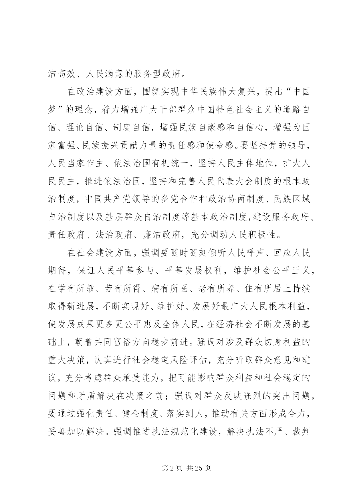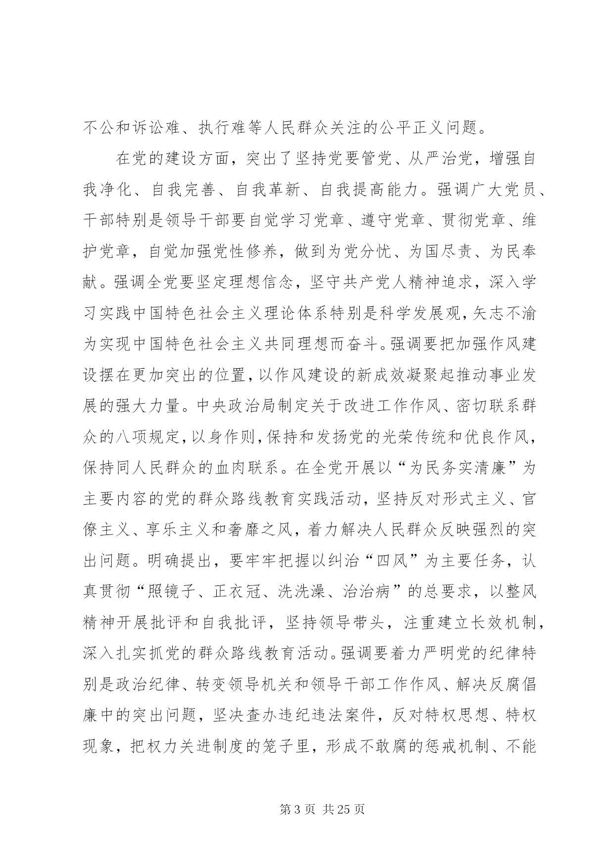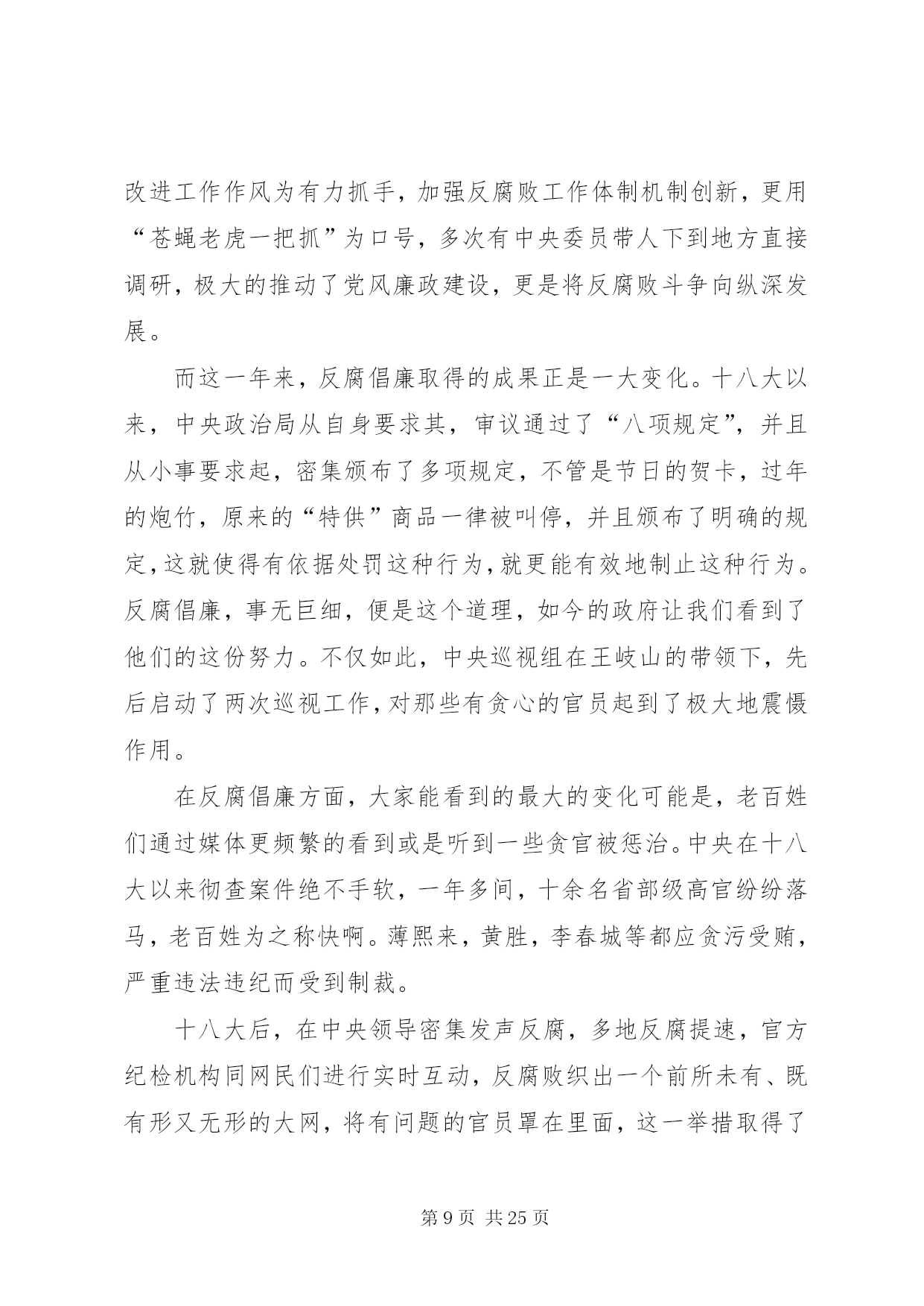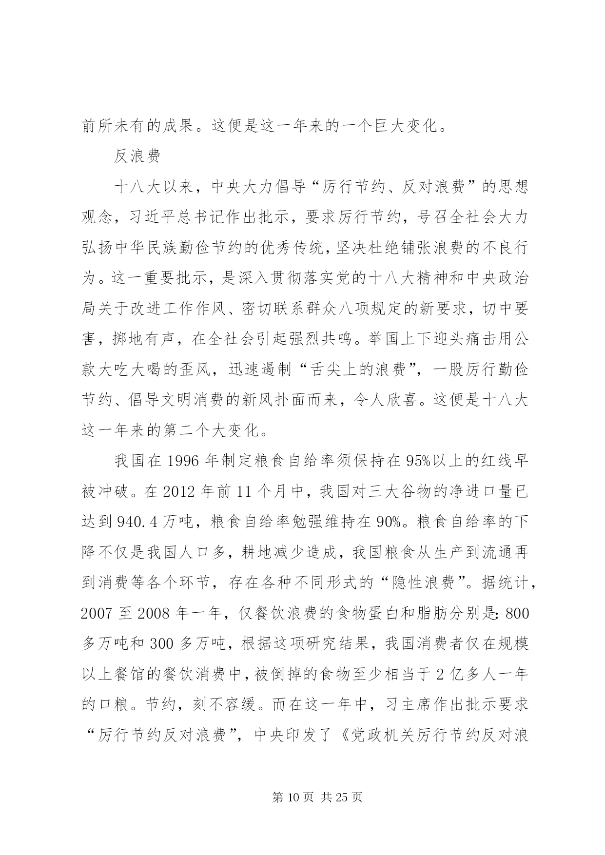 第PAGE\*Arabic\*MERGEFORMAT25页共NUMPAGES\*MERGEFORMAT25页十八大以来的理论创新5篇范文第一篇:十八大以来的理论创新十八大以来的理论创新党的十八大以来,以习近平为总书记的党中央,围绕坚持和发展中国特色社会主义,全面推进社会主义经济建设、政治建设、文化建设、社会建设、生态文明建设,推进党的建设新的伟大工程,提出了一系列重大战略思想,丰富和发展了中国特色社会主义理论体系。在经济建设方面,提出以经济建设为中心是兴国之要,发展仍是解决我国所有问题的关键,要坚持以科学发展为主题,以加快转变经济发展方式为主线,以提高经济增长质量和效益为中心,加大经济结构战略性调整力度,实现经济持续健康发展。强调改革开放是当代中国发展进步的活力之源,是坚持和发展中国特色社会主义的必由之路,解决我国进一步发展面临的一系列突出矛盾和挑战,必须继续推进改革开放,坚定不移走改革开放的强国之路,做到改革不停顿、开放不止步。强调收入分配制度是经济社会发展中带有根本性、基础性的制度安排,是社会主义市场经济体制的重要基石,要继续深化收入分配制度改革,维护劳动收入的主体地位,提高公共资源配置效率,缩小收入分配差距。强调行政体制改革是推动上层建筑适应经济基础的必然要求,提出要深入推进政企分开、政资分开、政事分开、政社分开,稳步推进机构改革,健全部门职责体系,建设职能科学、结构优化、廉洁高效、人民满意的服务型政府。在政治建设方面,围绕实现中华民族伟大复兴,提出“中国梦”的理念,着力增强广大干部群众中国特色社会主义的道路自信、理论自信、制度自信,增强民族自豪感和自信心,增强为国家富强、民族振兴贡献力量的责任感和使命感。要坚持党的领导,人民当家作主、依法治国有机统一,坚持人民主体地位,扩大人民民主,推进依法治国,坚持和完善人民代表大会制度的根本政治制度,中国共产党领导的多党合作和政治协商制度、民族区域自治制度以及基层群众自治制度等基本政治制度,建设服务政府、责任政府、法治政府、廉洁政府,充分调动人民积极性。在社会建设方面,强调要随时随刻倾听人民呼声、回应人民期待,保证人民平等参与、平等发展权利,维护社会公平正义,在学有所教、劳有所得、病有所医、老有所养、住有所居上持续取得新进展,不断实现好、维护好、发展好最广大人民根本利益,使发展成果更多更公平惠及全体人民,在经济社会不断发展的基础上,朝着共同富裕方向稳步前进。强调对涉及群众切身利益的重大决策,认真进行社会稳定风险评估,充分听取群众意见和建议,充分考虑群众承受能力,把可能影响群众利益和社会稳定的问题和矛盾解决在决策之前;强调对群众反映强烈的突出问题,要通过强化责任、健全制度、落实到人,推动有关方面形成合力,妥善加以解决。强调推进执法规范化建设,解决执法不严、裁判不公和诉讼难、执行难等人民群众关注的公平正义问题。在党的建设方面,突出了坚持党要管党、从严治党,增强自我净化、自我完善、自我革新、自我提高能力。强调广大党员、干部特别是领导干部要自觉学习党章、遵守党章、贯彻党章、维护党章,自觉加强党性修养,做到为党分忧、为国尽责、为民奉献。强调全党要坚定理想信念,坚守共产党人精神追求,深入学习实践中国特色社会主义理论体系特别是科学发展观,矢志不渝为实现中国特色社会主义共同理想而奋斗。强调要把加强作风建设摆在更加突出的位置,以作风建设的新成效凝聚起推动事业发展的强大力量。中央政治局制定关于改进工作作风、密切联系群众的八项规定,以身作则,保持和发扬党的光荣传统和优良作风,保持同人民群众的血肉联系。在全党开展以“为民务实清廉”为主要内容的党的群众路线教育实践活动,坚持反对形式主义、官僚主义、享乐主义和奢靡之风,着力解决人民群众反映强烈的突出问题。明确提出,要牢牢把握以纠治“四风”为主要任务,认真贯彻“照镜子、正衣冠、洗洗澡、治治病”的总要求,以整风精神开展批评和自我批评,坚持领导带头,注重建立长效机制,深入扎实抓党的群众路线教育活动。强调要着力严明党的纪律特别是政治纪律、转变领导机关和领导干部工作作风、解决反腐倡廉中的突出问题,坚决查办违纪违法案件,反对特权思想、特权现象,把权力关进制度的笼子里,形成不敢腐的惩戒机制、不能腐的防范机制、不易腐的保障机制。在国防和军队建设方面,强调实现中华名族伟大复兴是我们的强军梦,对军队来讲也是强军梦,没有一支强大的军队,没有一个巩固的国防,强国梦就难以真正实现。强调要坚定不移地走中国特色强军之路,推动军队现代化建设跨越式发展,努力建设与我国国际地位相称、与国家安全和发展利益相适应的巩固国防和强大军队。特别是明确提出了要建设一支听党指挥、能打胜仗、作风优良人民军队这一新形势下党的强军目标,并强调要把坚决听党指挥作为强军之魂,把能打仗、打胜仗作