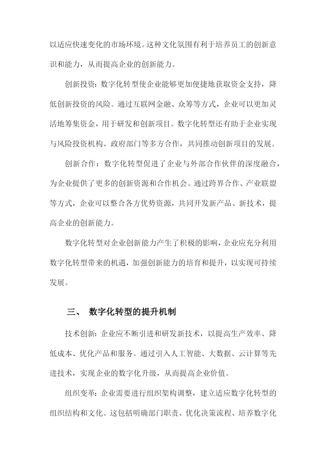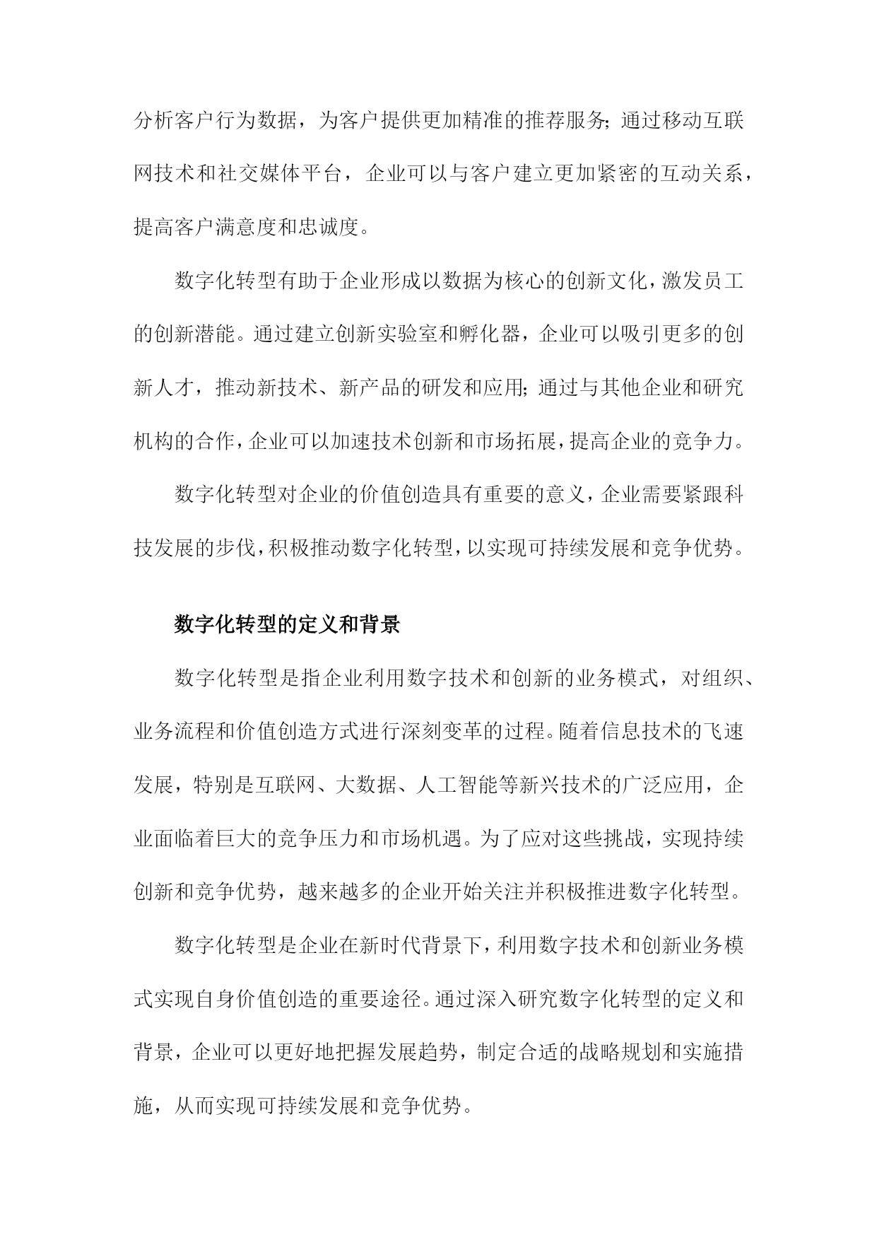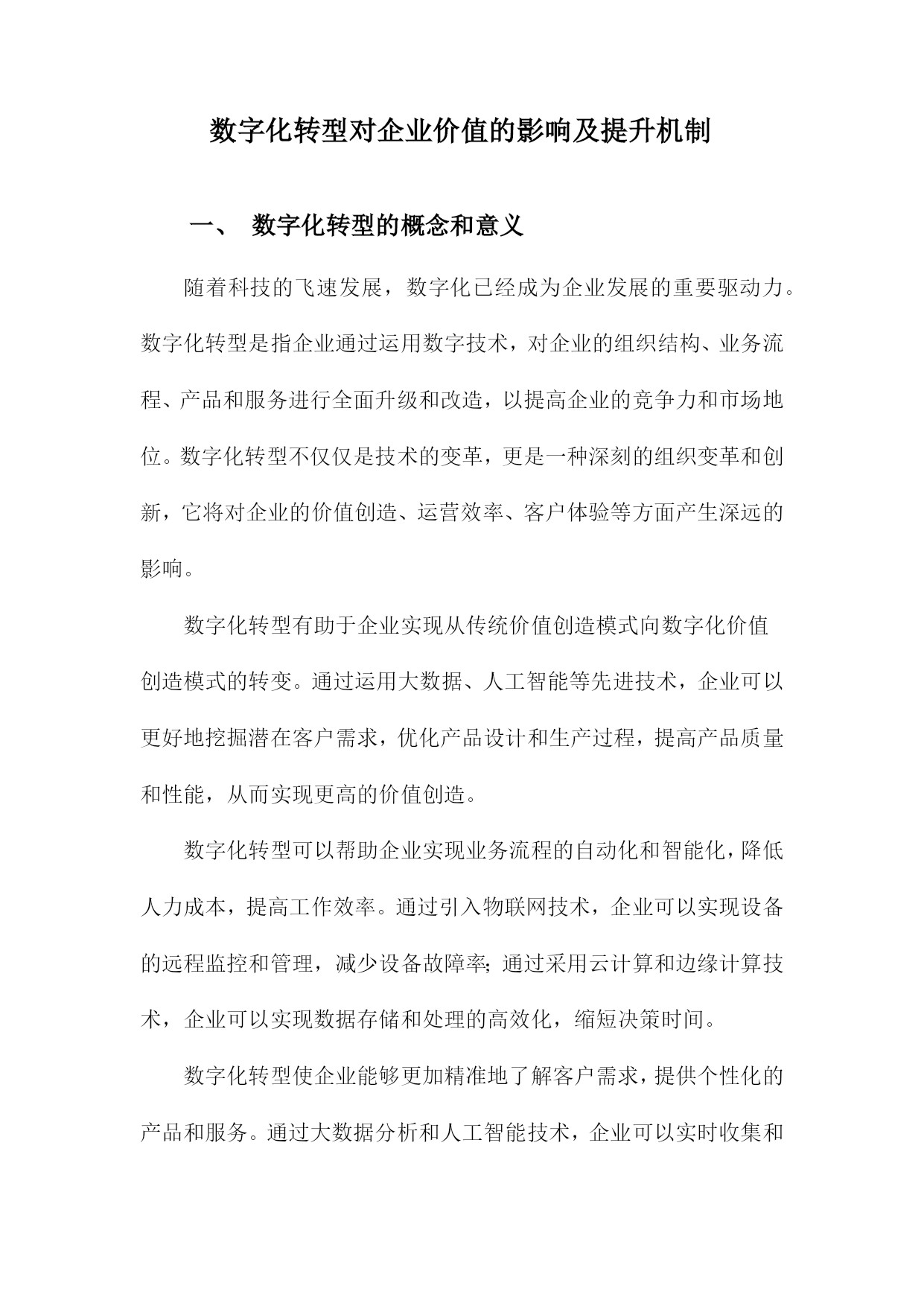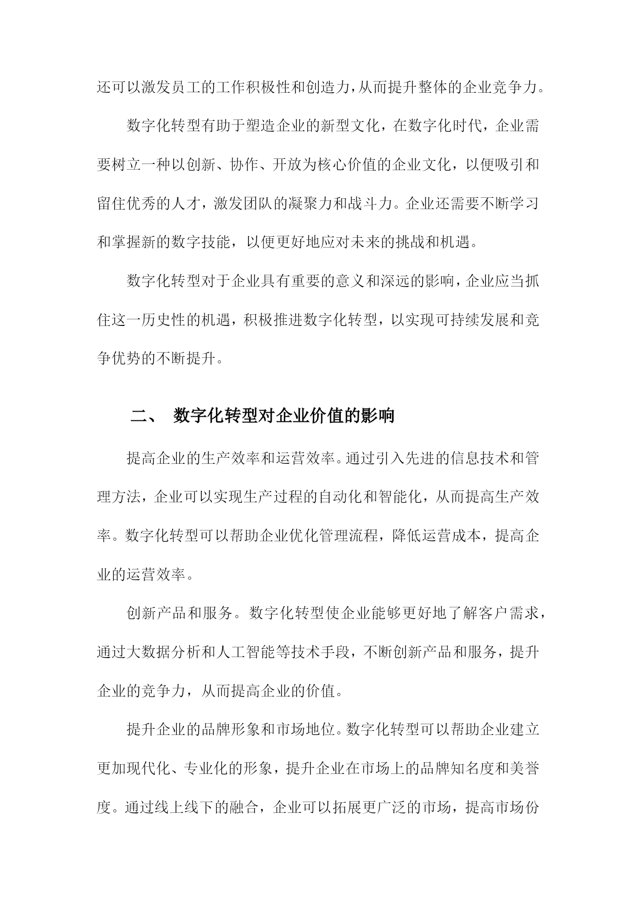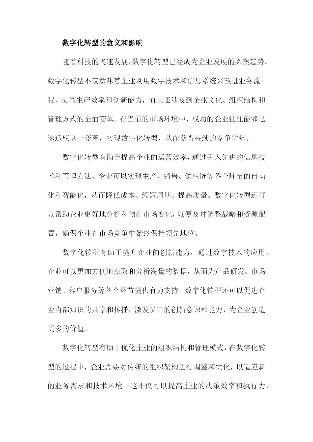 数字化转型对企业价值的影响及提升机制一、数字化转型的概念和意义随着科技的飞速发展,数字化已经成为企业发展的重要驱动力。数字化转型是指企业通过运用数字技术,对企业的组织结构、业务流程、产品和服务进行全面升级和改造,以提高企业的竞争力和市场地位。数字化转型不仅仅是技术的变革,更是一种深刻的组织变革和创新,它将对企业的价值创造、运营效率、客户体验等方面产生深远的影响。数字化转型有助于企业实现从传统价值创造模式向数字化价值创造模式的转变。通过运用大数据、人工智能等先进技术,企业可以更好地挖掘潜在客户需求,优化产品设计和生产过程,提高产品质量和性能,从而实现更高的价值创造。数字化转型可以帮助企业实现业务流程的自动化和智能化,降低人力成本,提高工作效率。通过引入物联网技术,企业可以实现设备的远程监控和管理,减少设备故障率;通过采用云计算和边缘计算技术,企业可以实现数据存储和处理的高效化,缩短决策时间。数字化转型使企业能够更加精准地了解客户需求,提供个性化的产品和服务。通过大数据分析和人工智能技术,企业可以实时收集和分析客户行为数据,为客户提供更加精准的推荐服务;通过移动互联网技术和社交媒体平台,企业可以与客户建立更加紧密的互动关系,提高客户满意度和忠诚度。数字化转型有助于企业形成以数据为核心的创新文化,激发员工的创新潜能。通过建立创新实验室和孵化器,企业可以吸引更多的创新人才,推动新技术、新产品的研发和应用;通过与其他企业和研究机构的合作,企业可以加速技术创新和市场拓展,提高企业的竞争力。数字化转型对企业的价值创造具有重要的意义,企业需要紧跟科技发展的步伐,积极推动数字化转型,以实现可持续发展和竞争优势。数字化转型的定义和背景数字化转型是指企业利用数字技术和创新的业务模式,对组织、业务流程和价值创造方式进行深刻变革的过程。随着信息技术的飞速发展,特别是互联网、大数据、人工智能等新兴技术的广泛应用,企业面临着巨大的竞争压力和市场机遇。为了应对这些挑战,实现持续创新和竞争优势,越来越多的企业开始关注并积极推进数字化转型。数字化转型是企业在新时代背景下,利用数字技术和创新业务模式实现自身价值创造的重要途径。通过深入研究数字化转型的定义和背景,企业可以更好地把握发展趋势,制定合适的战略规划和实施措施,从而实现可持续发展和竞争优势。数字化转型的意义和影响随着科技的飞速发展,数字化转型已经成为企业发展的必然趋势。数字化转型不仅意味着企业利用数字技术和信息系统来改进业务流程、提高生产效率和创新能力,而且还涉及到企业文化、组织结构和管理方式的全面变革。在当前的市场环境中,成功的企业往往能够迅速适应这一变革,实现数字化转型,从而获得持续的竞争优势。数字化转型有助于提高企业的运营效率,通过引入先进的信息技术和管理方法,企业可以实现生产、销售、供应链等各个环节的自动化和智能化,从而降低成本、缩短周期、提高质量。数字化转型还可以帮助企业更好地分析和预测市场变化,以便及时调整战略和资源配置,确保企业在市场竞争中始终保持领先地位。数字化转型有助于提升企业的创新能力,通过数字技术的应用,企业可以更加方便地获取和分析海量的数据,从而为产品研发、市场营销、客户服务等各个环节提供有力支持。数字化转型还可以促进企业内部知识的共享和传播,激发员工的创新意识和能力,为企业创造更多的价值。数字化转型有助于优化企业的组织结构和管理模式,在数字化转型的过程中,企业需要对传统的组织架构进行调整和优化,以适应新的业务需求和技术环境。这不仅可以提高企业的决策效率和执行力,还可以激发员工的工作积极性和创造力,从而提升整体的企业竞争力。数字化转型有助于塑造企业的新型文化,在数字化时代,企业需要树立一种以创新、协作、开放为核心价值的企业文化,以便吸引和留住优秀的人才,激发团队的凝聚力和战斗力。企业还需要不断学习和掌握新的数字技能,以便更好地应对未来的挑战和机遇。数字化转型对于企业具有重要的意义和深远的影响,企业应当抓住这一历史性的机遇,积极推进数字化转型,以实现可持续发展和竞争优势的不断提升。二、数字化转型对企业价值的影响提高企业的生产效率和运营效率。通过引入先进的信息技术和管理方法,企业可以实现生产过程的自动化和智能化,从而提高生产效率。数字化转型可以帮助企业优化管理流程,降低运营成本,提高企业的运营效率。创新产品和服务。数字化转型使企业能够更好地了解客户需求,通过大数据分析和人工智能等技术手段,不断创新产品和服务,提升企业的竞争力,从而提高企业的价值。提升企业的品牌形象和市场地位。数字化转型可以帮助企业建立更加现代化、专业化的形象,提升企业在市场上的品牌知名度和美誉度。通过线上线下的融合,企业可以拓展更广泛的市场,提高市场份额,进一步提升企业的价值。